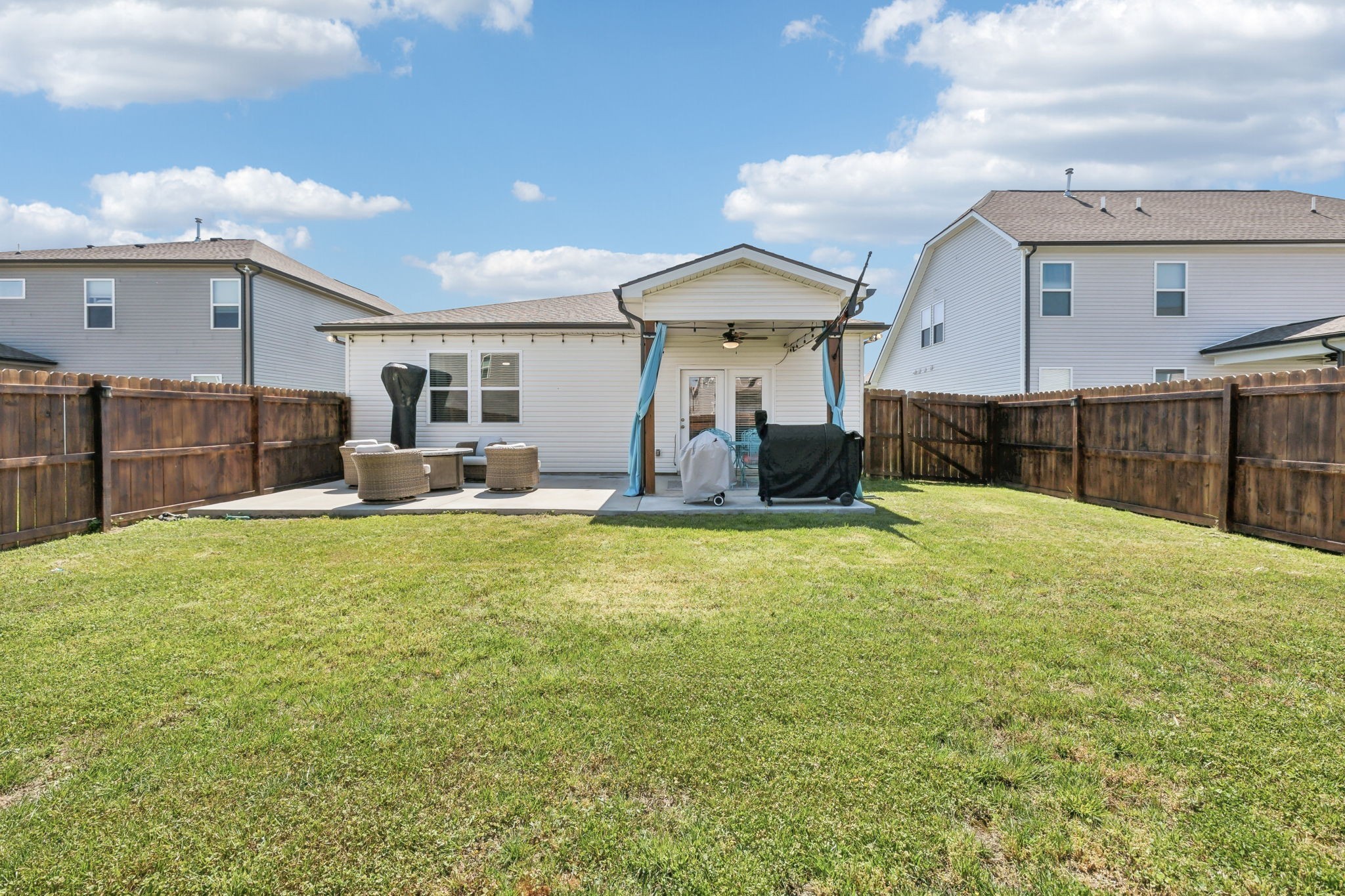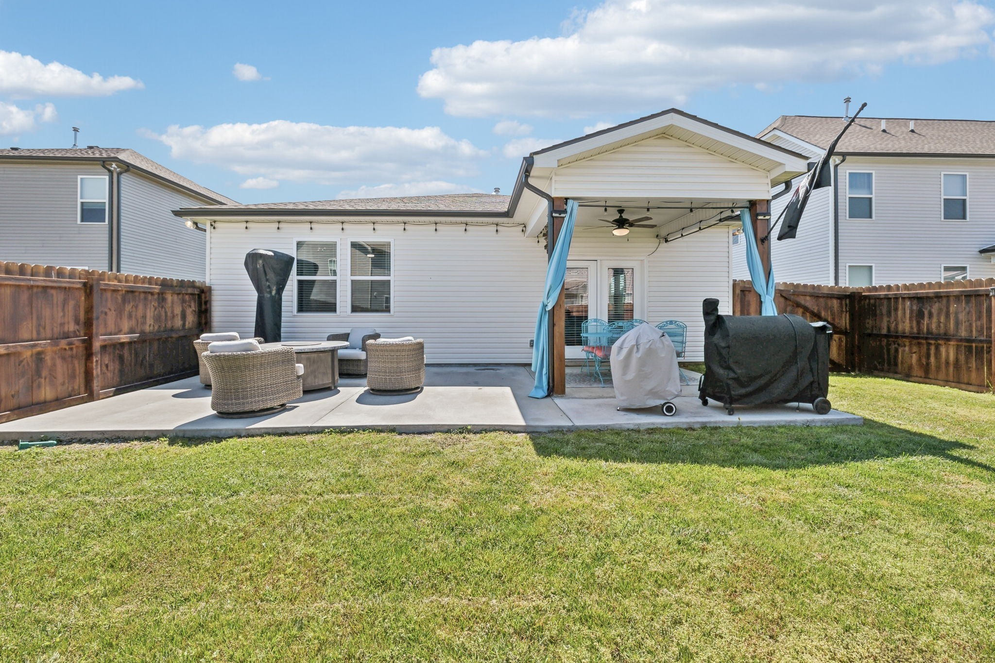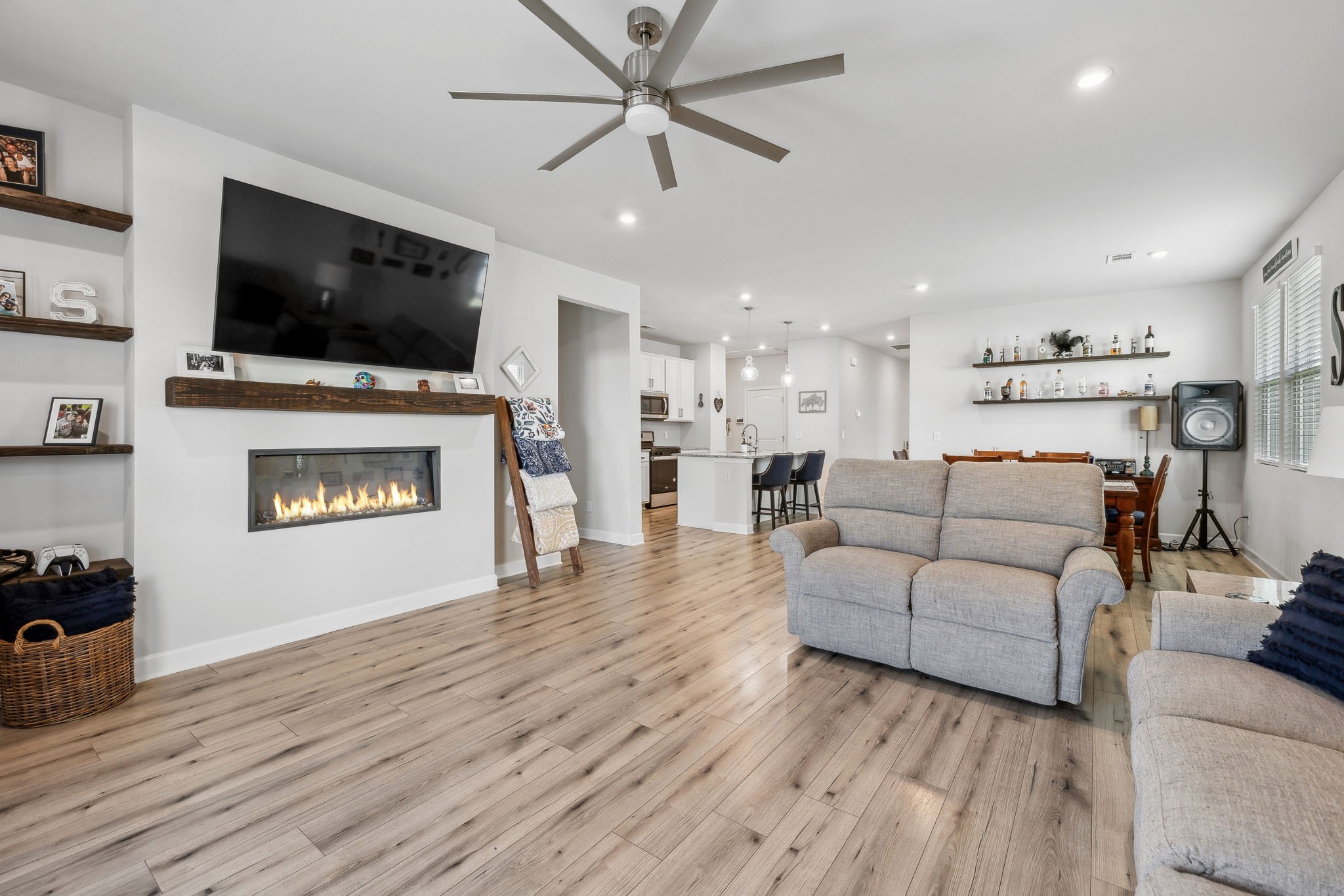 The kitchen is a true centerpiece—complete with a large island that flows effortlessly into the living area with custom built-ins and a cozy fireplace. Outside, enjoy a fully fenced backyard with an extended patio—ideal for morning coffee, evening dinners, or playtime with pets and kids.