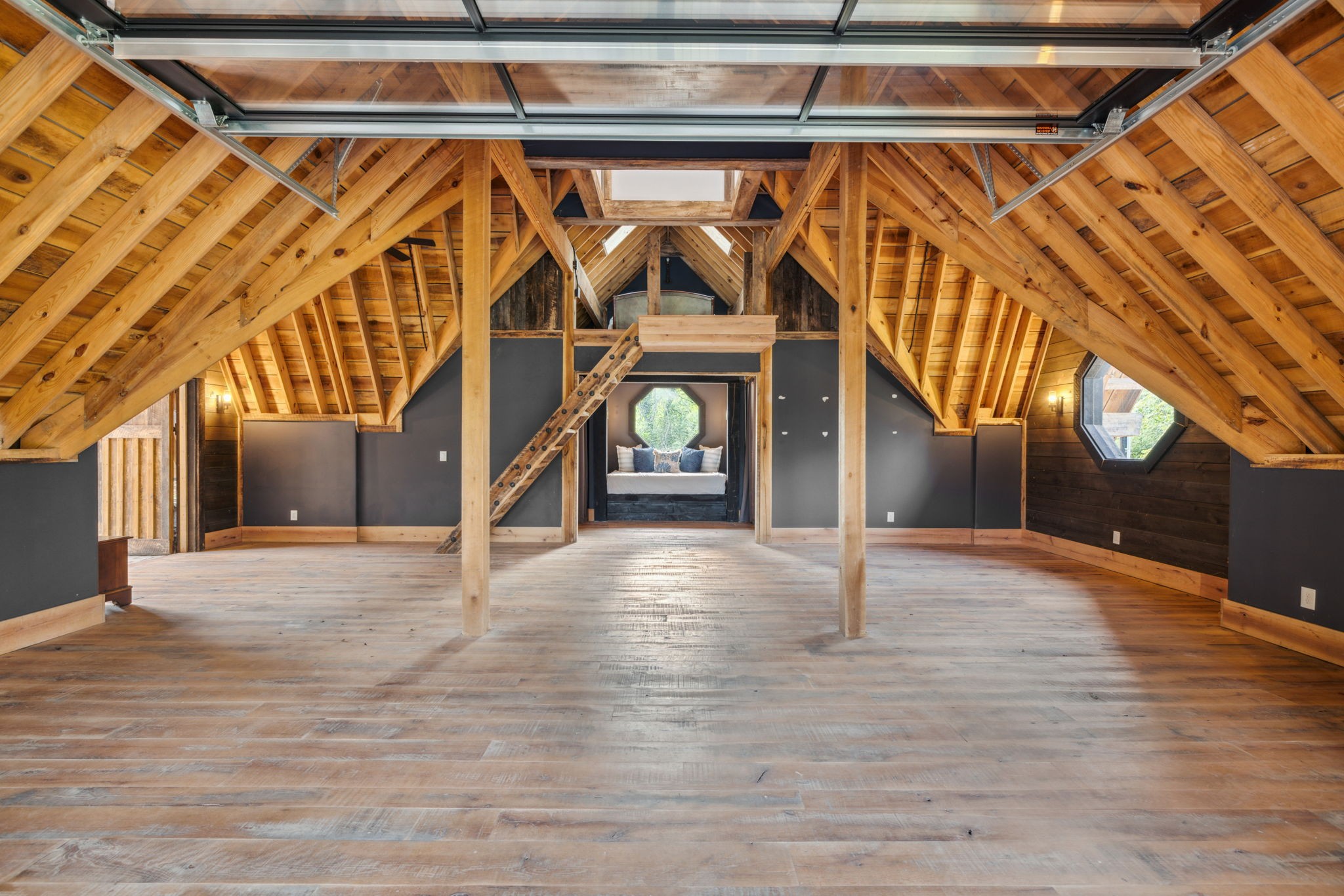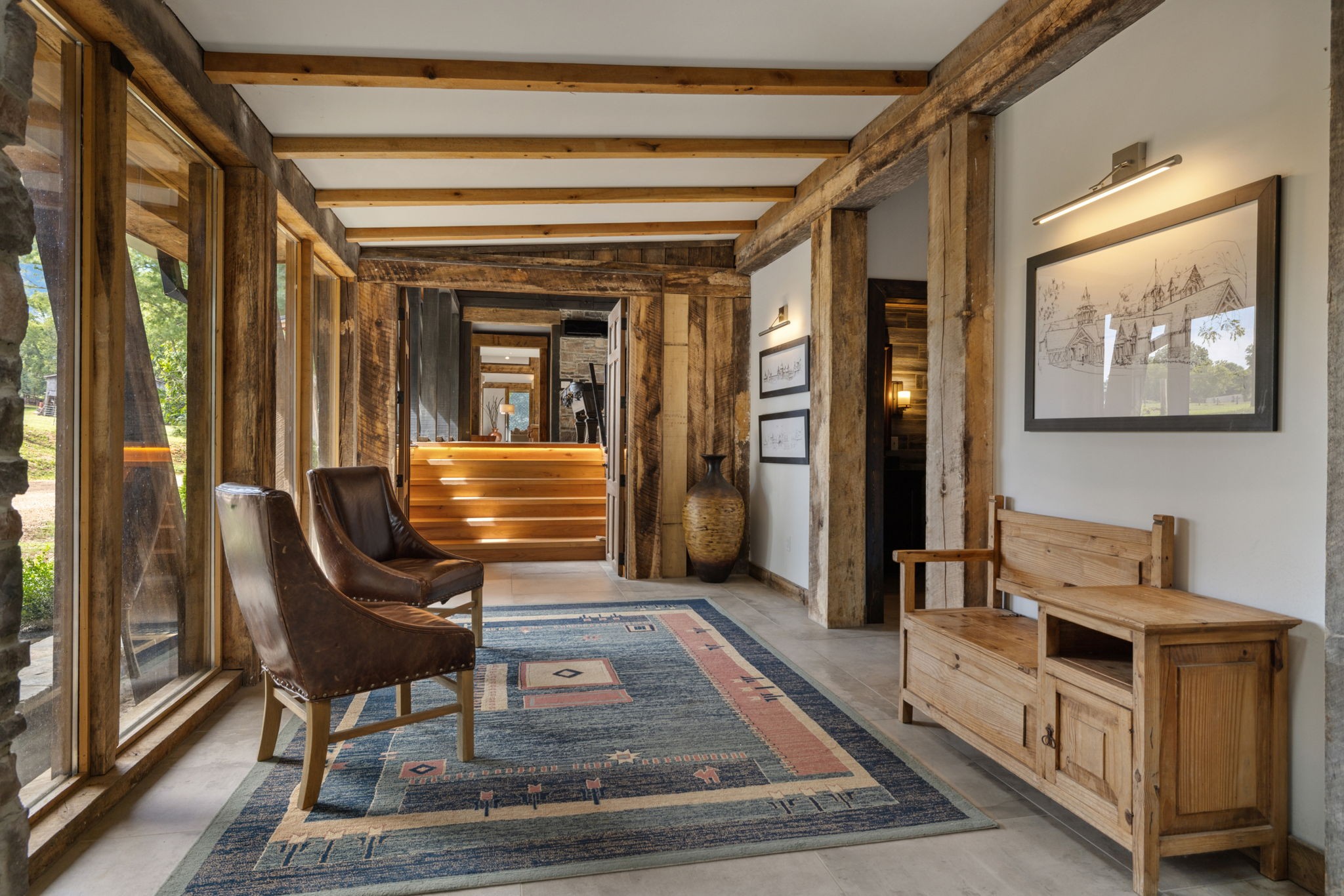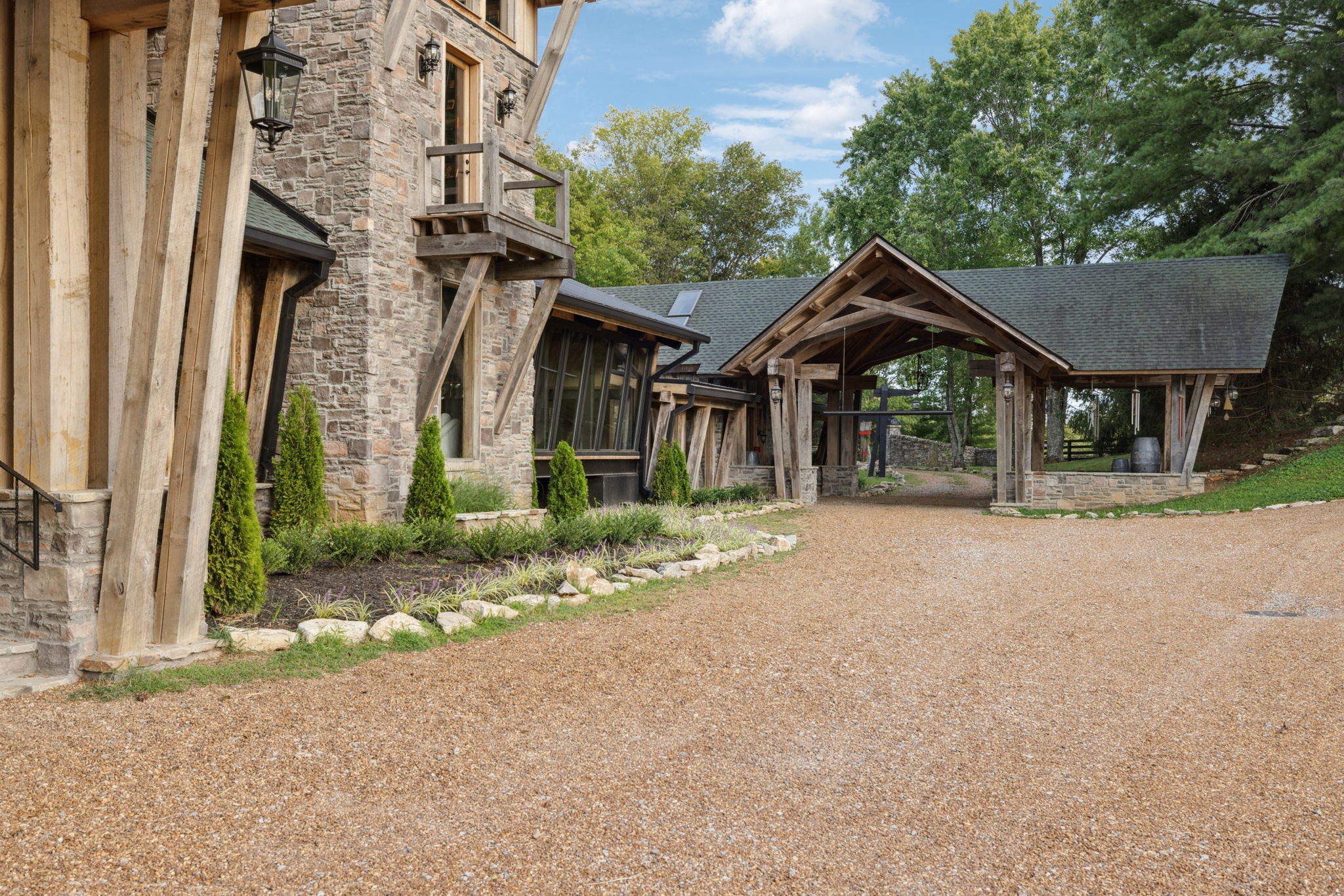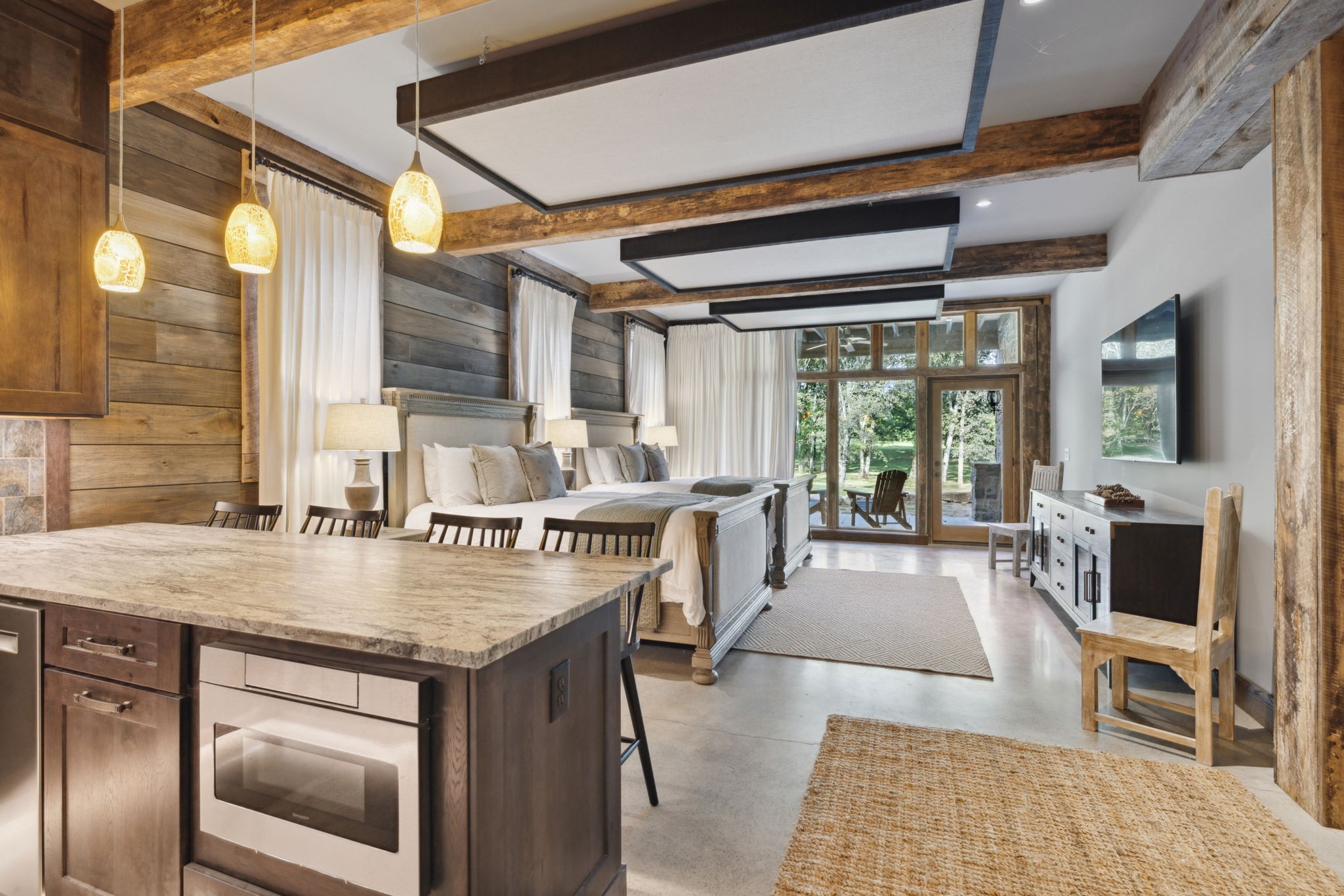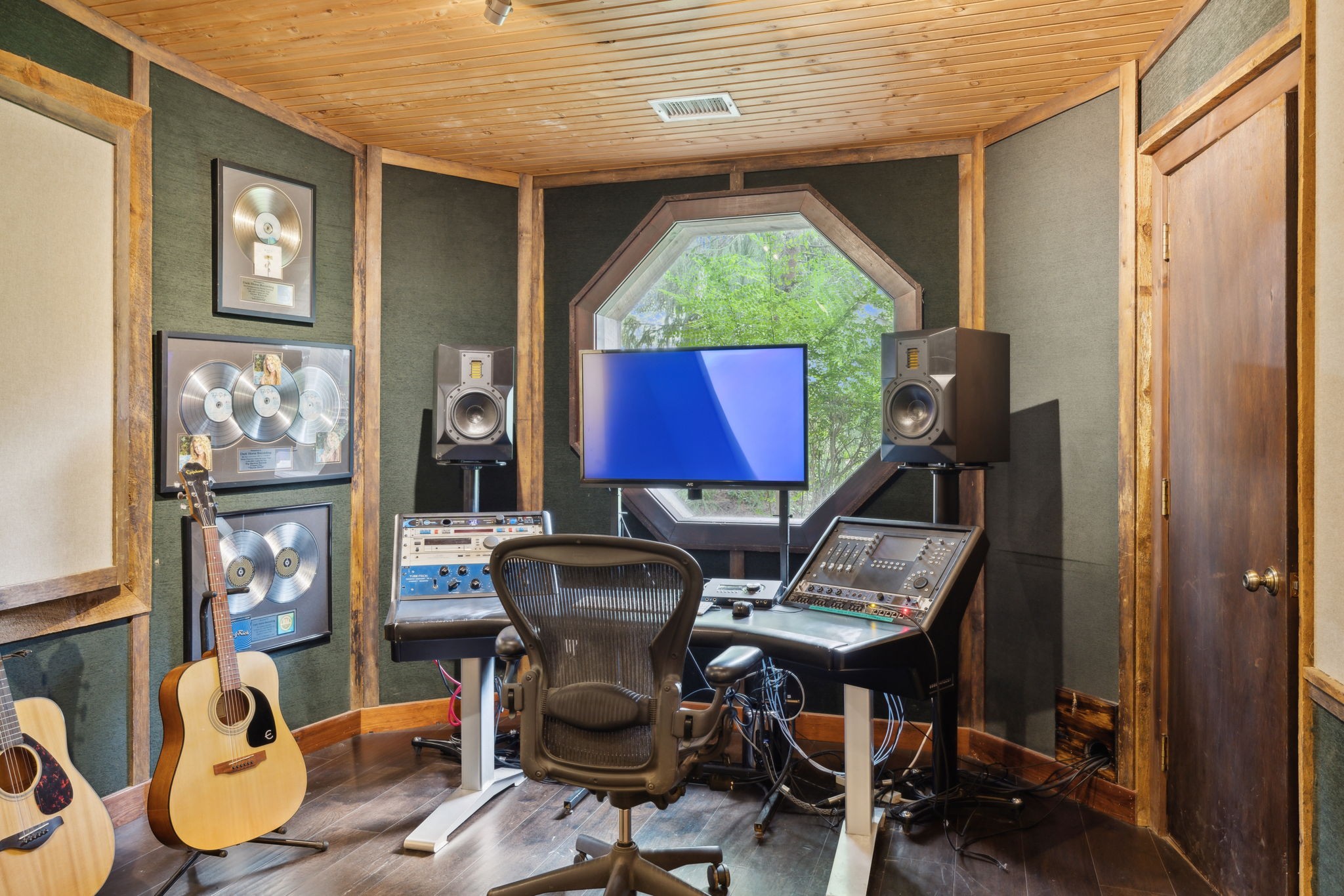 DARK HORSE STUDIO: Built in 1998, and is world-renowned as a destination for A-list recording artists from all around the world. Like The Manor Estate, this approximately 8900 square-foot building is a combination of heavy post and beam construction but with a more rustic feel, creating a unique and immersive environment for artists. For decades, this space has fostered creativity and focus, allowing artists to escape the hustle and bustle of everyday life and find inspiration in a serene, nature-filled setting. This unique building consists of public areas, studios, and two separate sleeping quarters, along with multiple porches and patios.