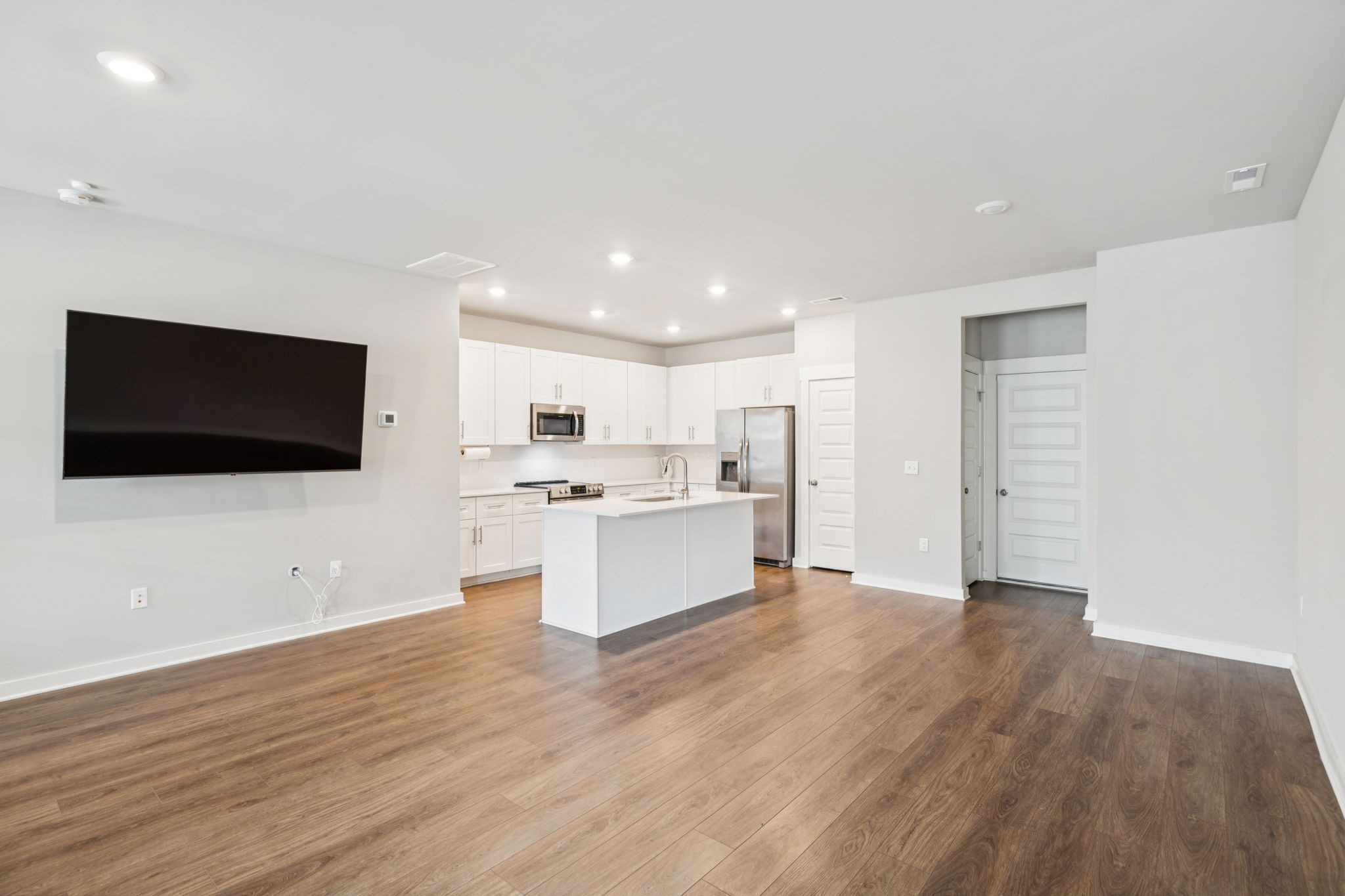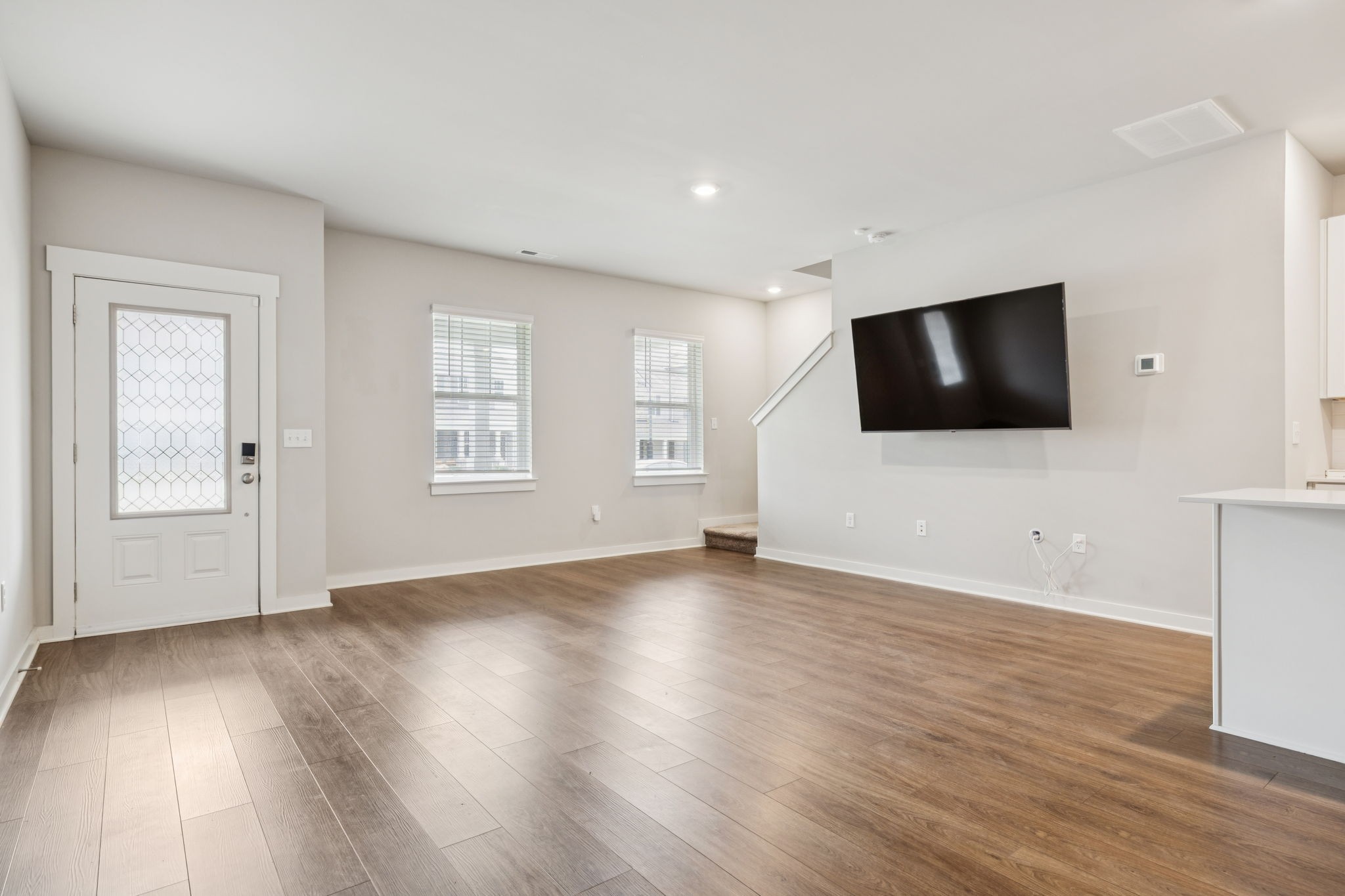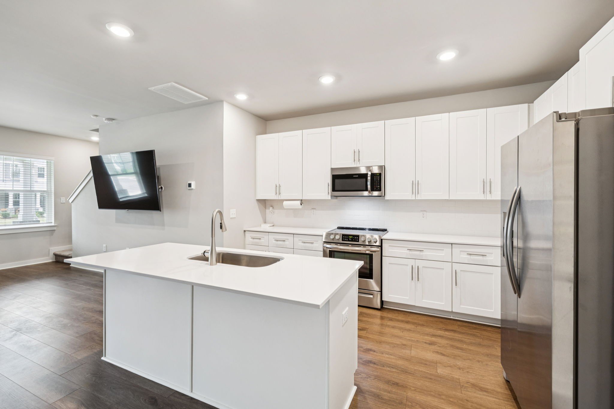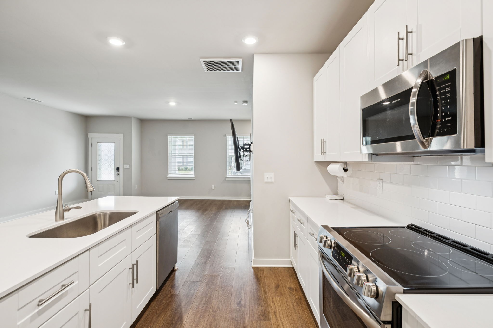 Enjoy relaxing on the oversized covered front porch of this 3-bedroom, 2.5 bath townhome. Offering a bright, open-concept layout where the living, dining, and kitchen areas flow seamlessly perfect for both entertaining and everyday comfort. The kitchen features 42" white shaker cabinets, quartz countertops, subway tile backsplash, stainless steel appliances (all included), and under-cabinet lighting.