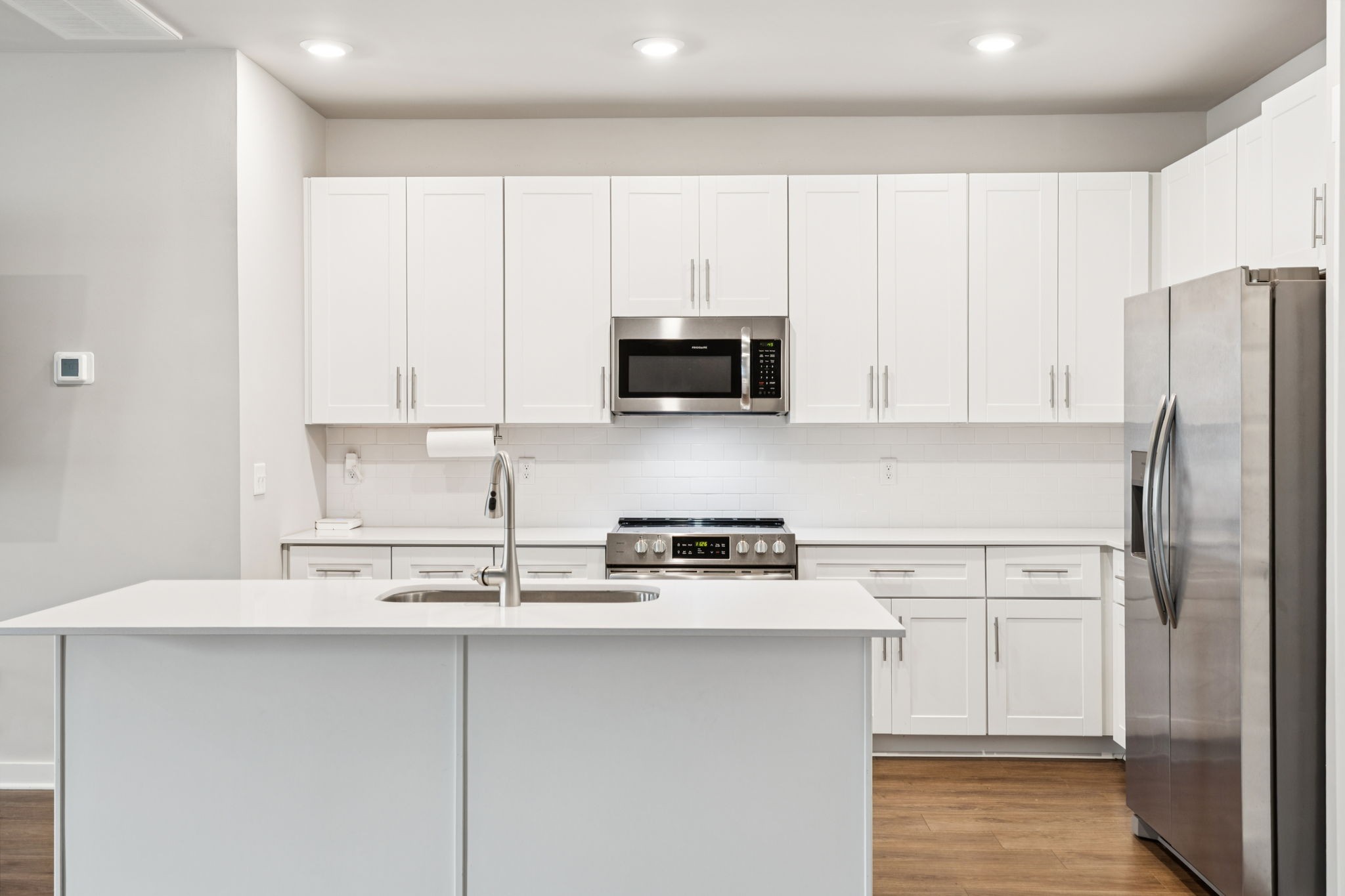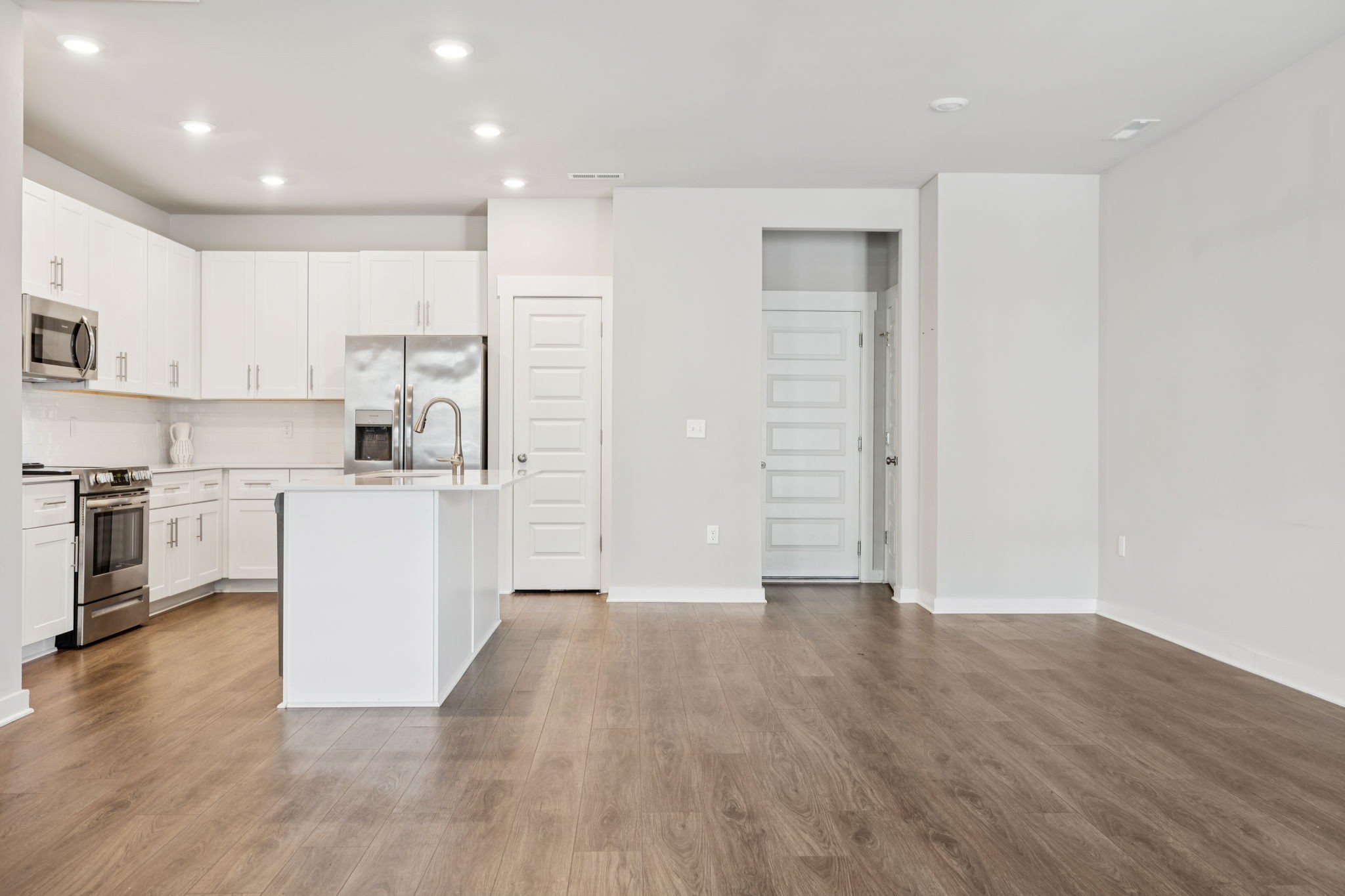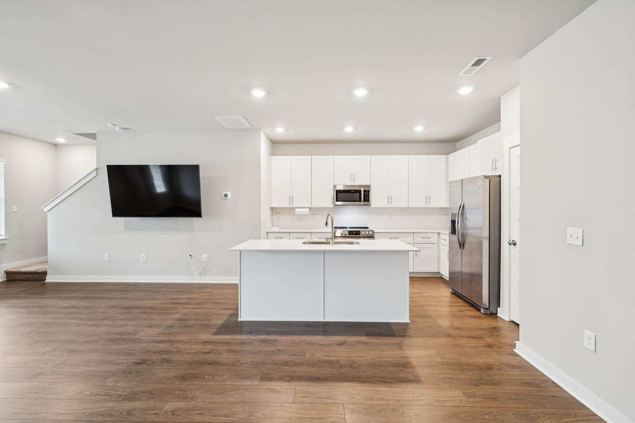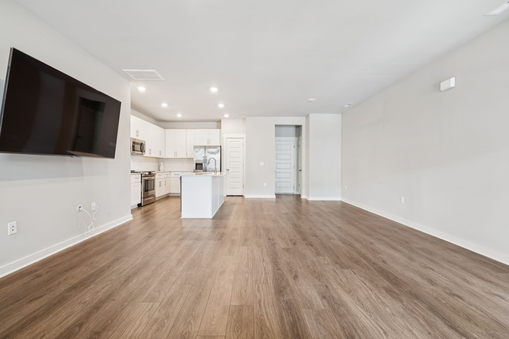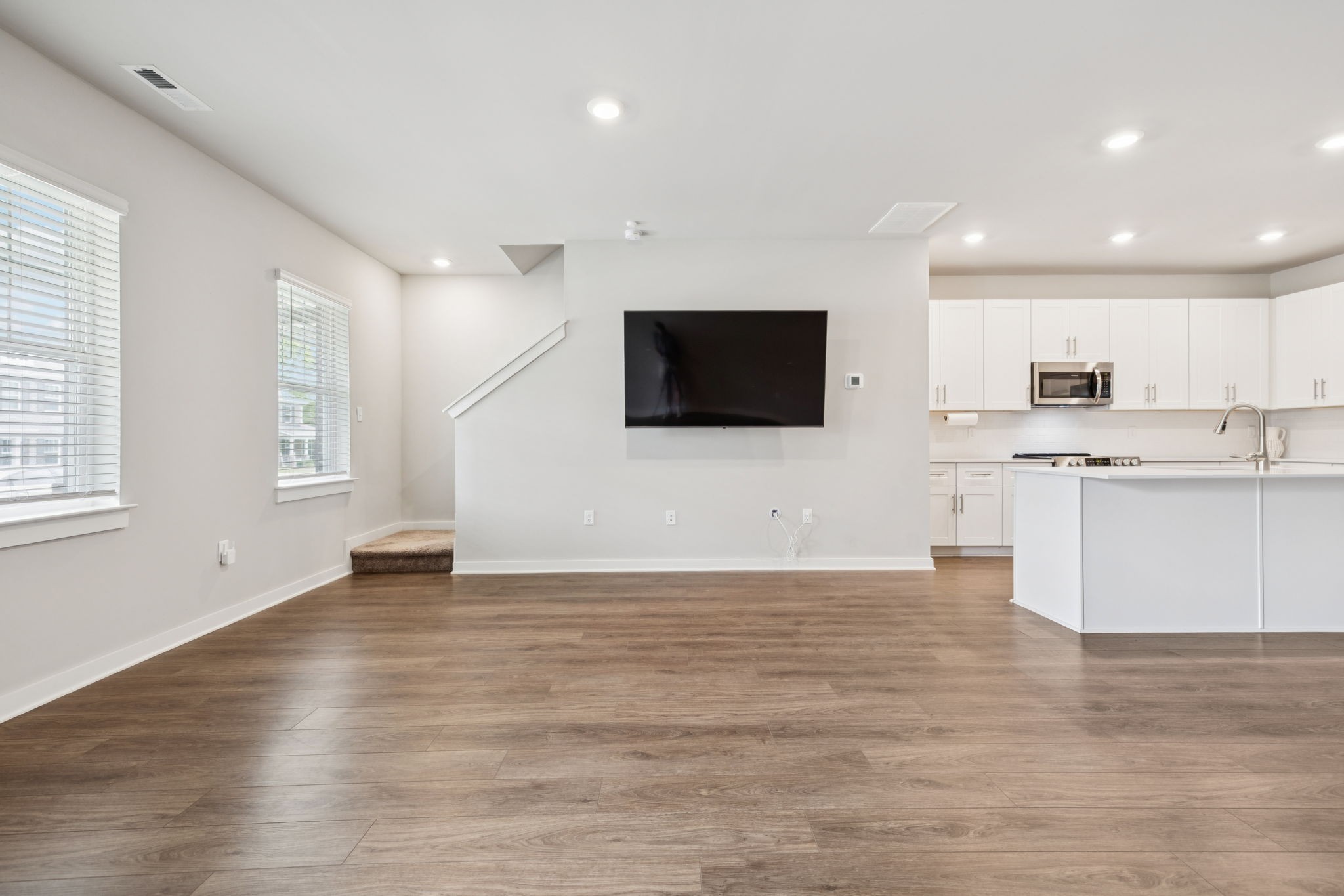 Enjoy relaxing on the oversized covered front porch of this 3-bedroom, 2.5 bath townhome. Offering a bright, open-concept layout where the living, dining, and kitchen areas flow seamlessly perfect for both entertaining and everyday comfort. The kitchen features 42" white shaker cabinets, quartz countertops, subway tile backsplash, stainless steel appliances (all included), and under-cabinet lighting.