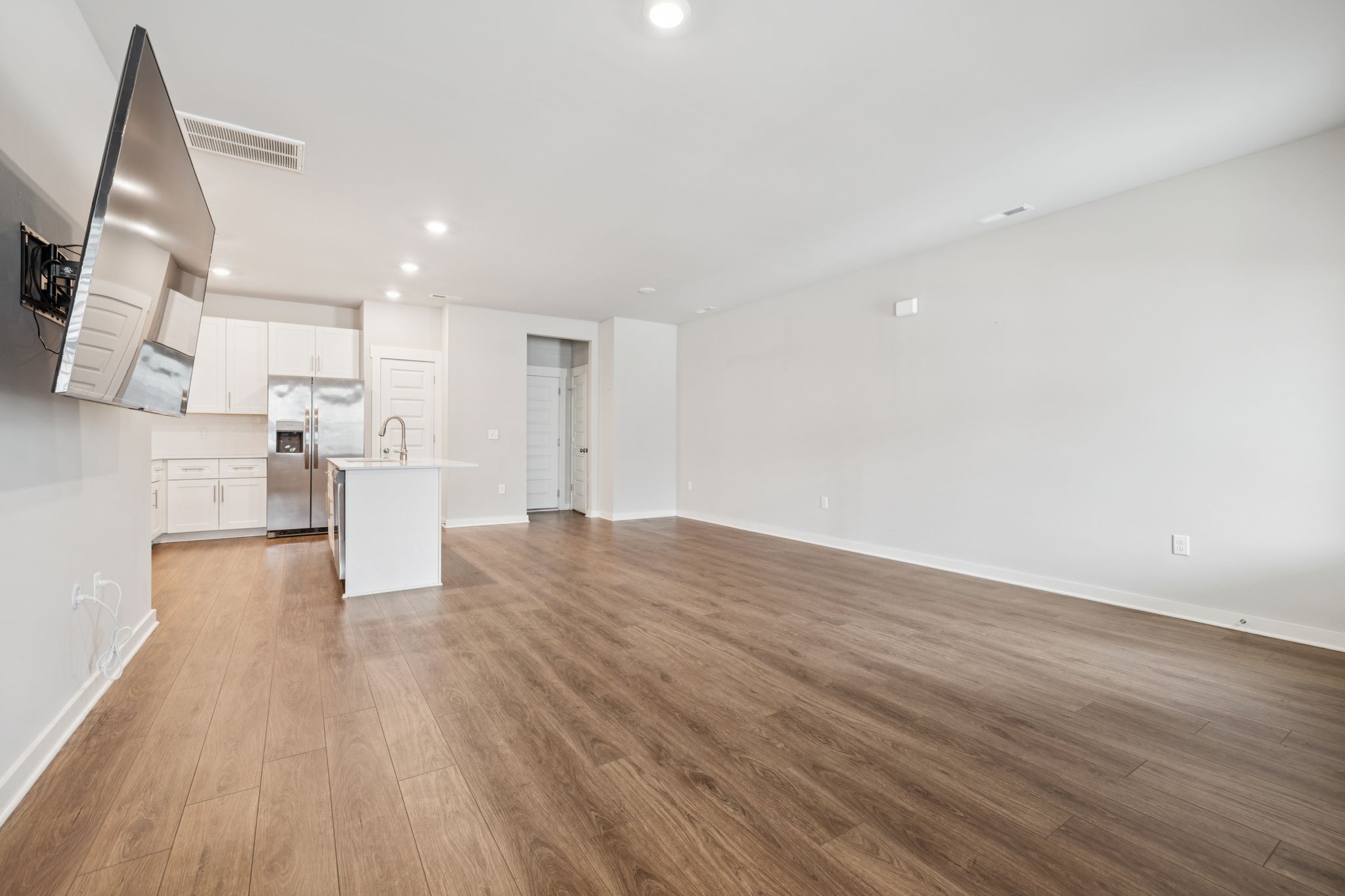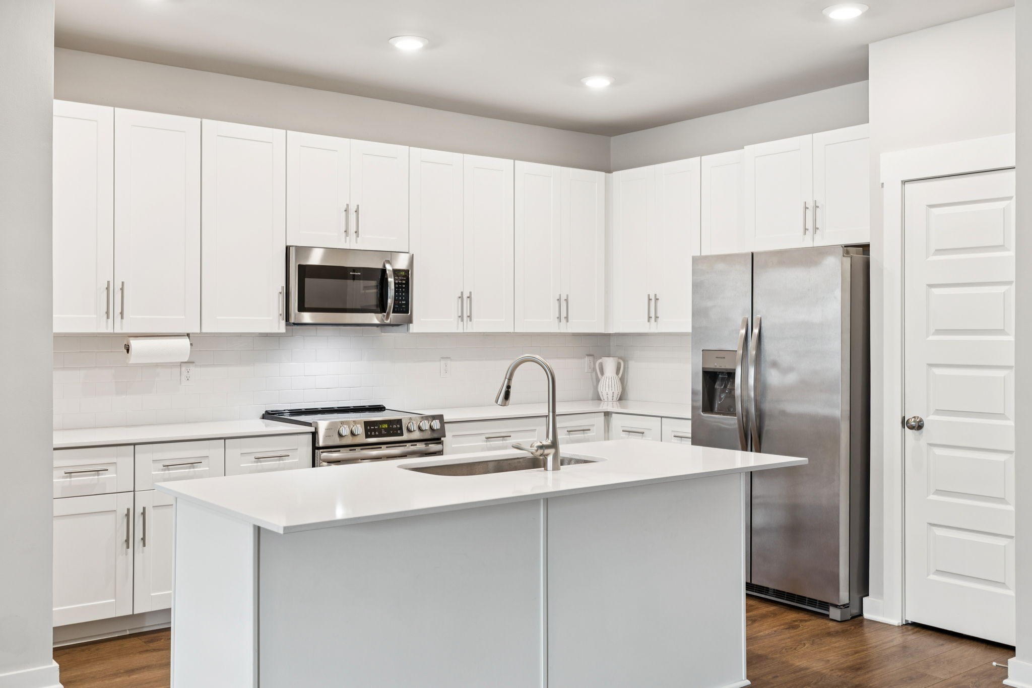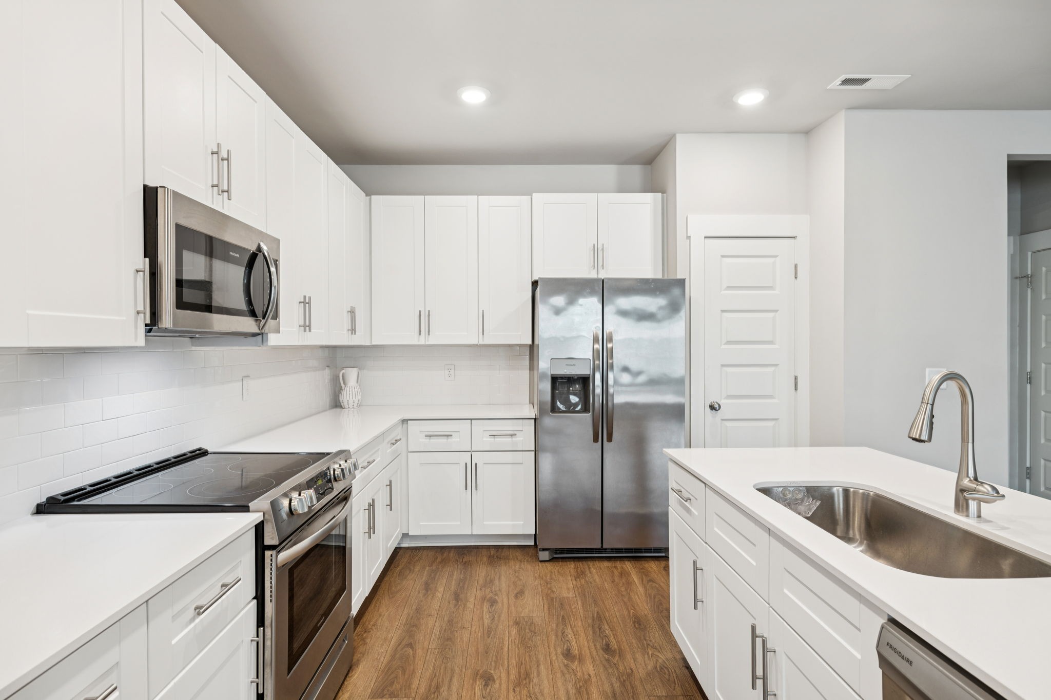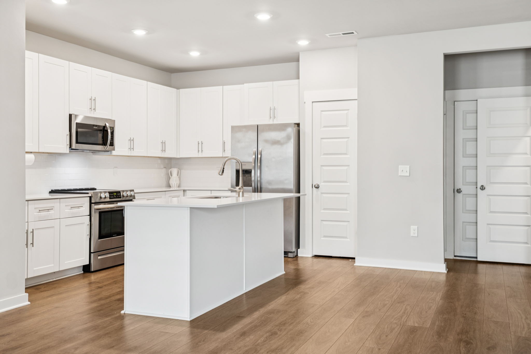 Enjoy relaxing on the oversized covered front porch of this 3-bedroom, 2.5 bath townhome. Offering a bright, open-concept layout where the living, dining, and kitchen areas flow seamlessly perfect for both entertaining and everyday comfort. The kitchen features 42" white shaker cabinets, quartz countertops, subway tile backsplash, stainless steel appliances (all included), and under-cabinet lighting.