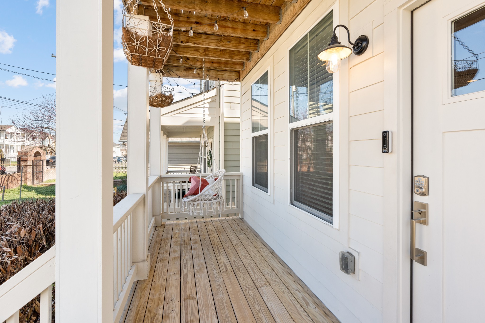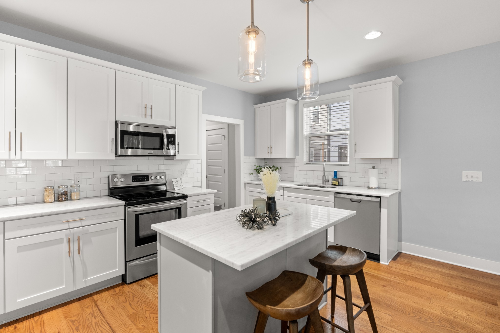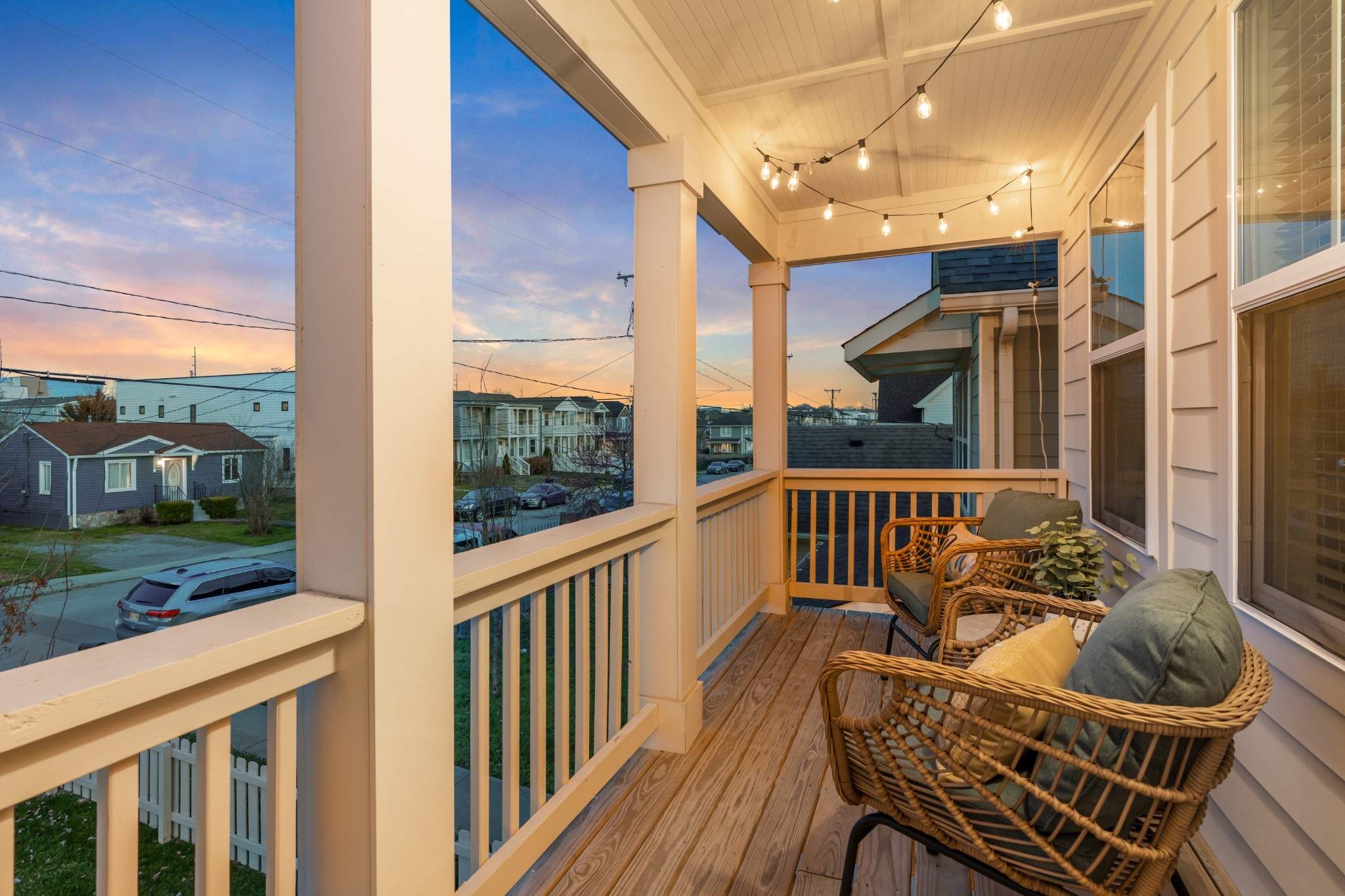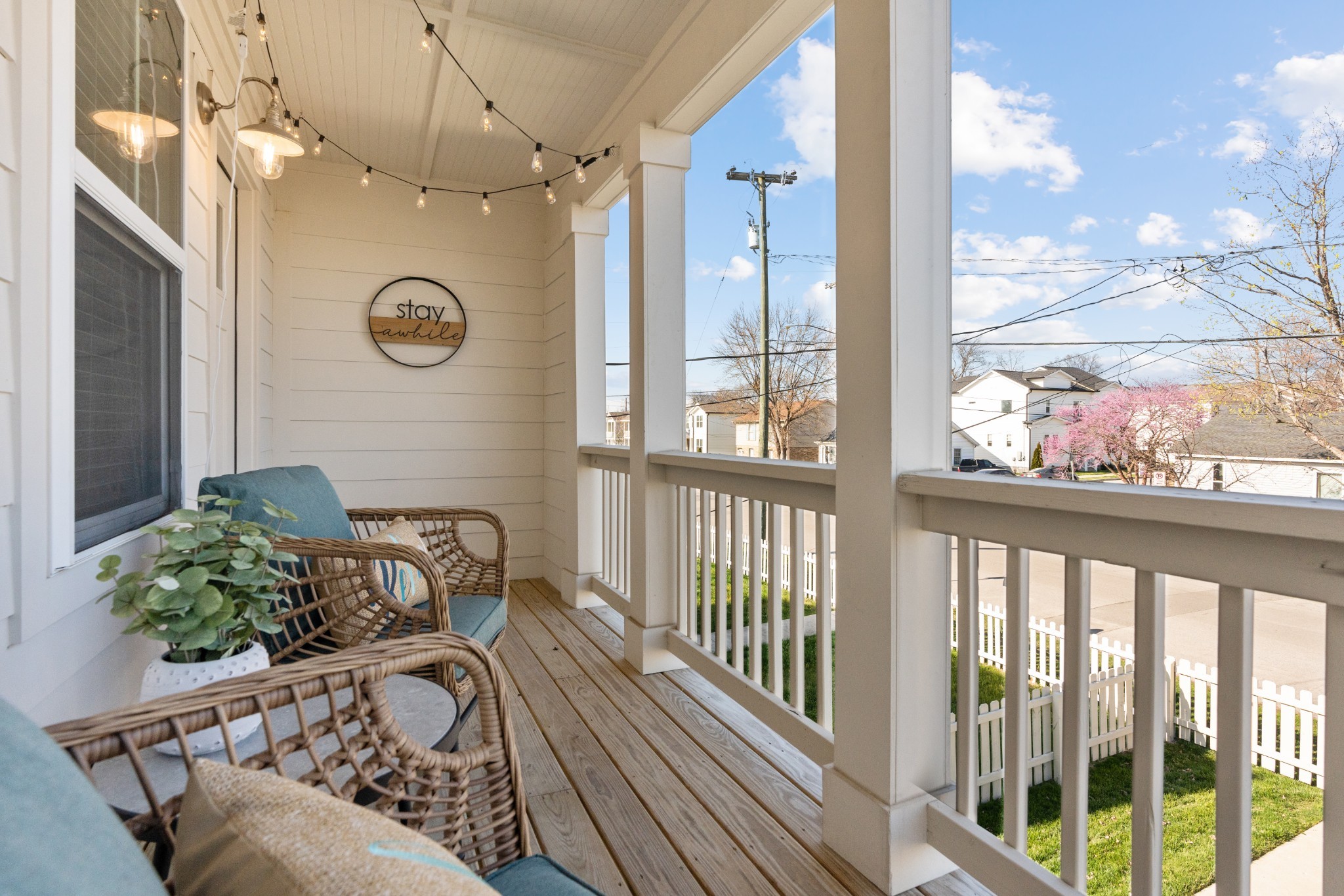 Modern charm meets walkable city living in the heart of The Nations. This 4-bedroom, 3-bath home offers a flexible layout with two living areas, hardwood floors, marble countertops, and natural light throughout. A main-level bedroom functions perfectly as a guest suite, office, or second living space. The vaulted primary suite upstairs features a spa-like bath with double vanities, a walk-in shower, marble tile, and a soaking tub. Enjoy three covered porches, a white picket fence, and a freshly updated lawn with new mulch, aeration, and reseeding. Two-car carport with alley access. Located just minutes from Nashville’s best restaurants, coffee shops, and downtown.