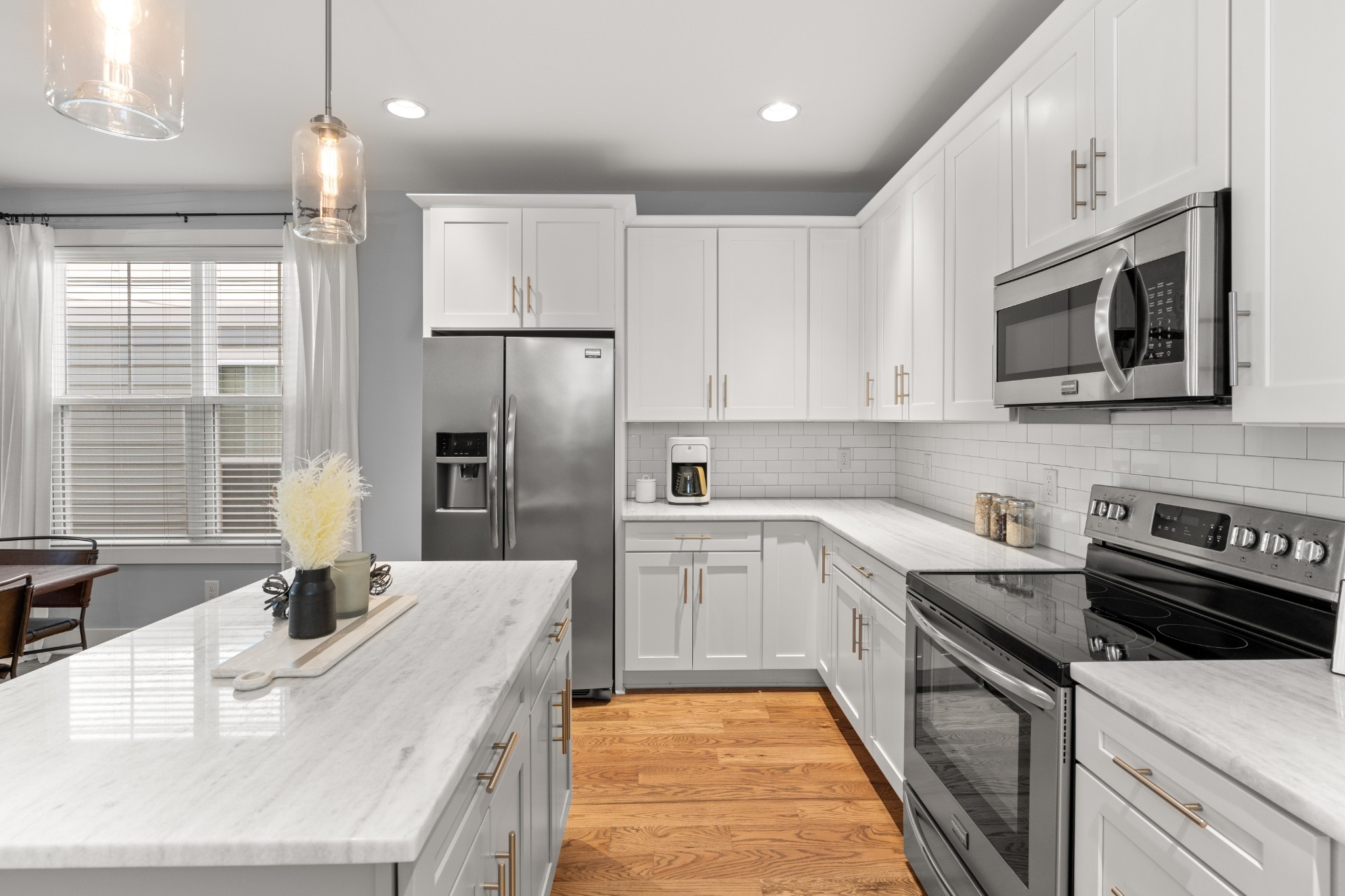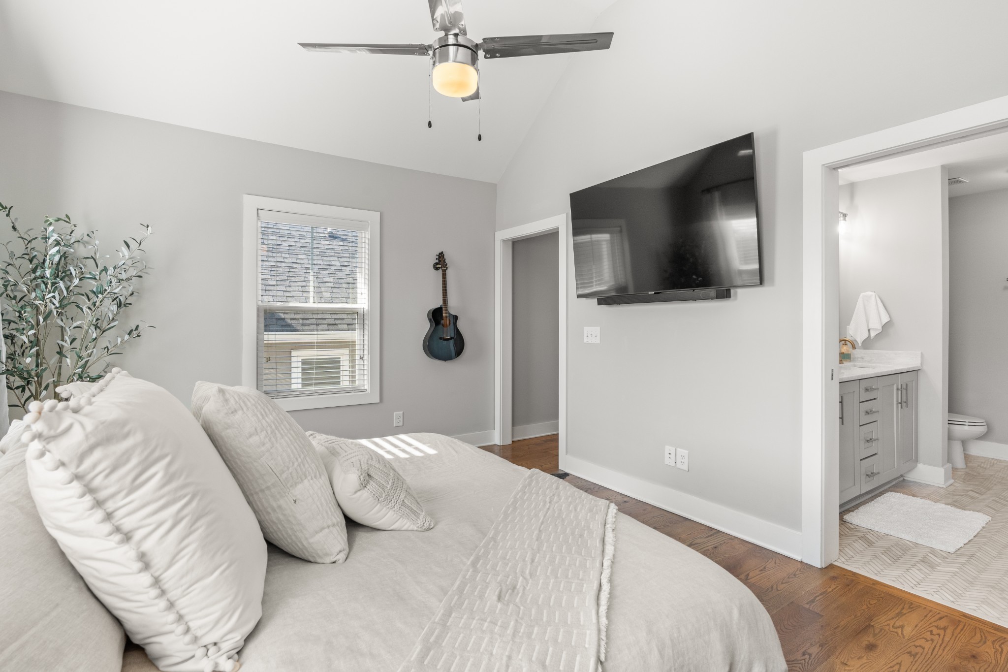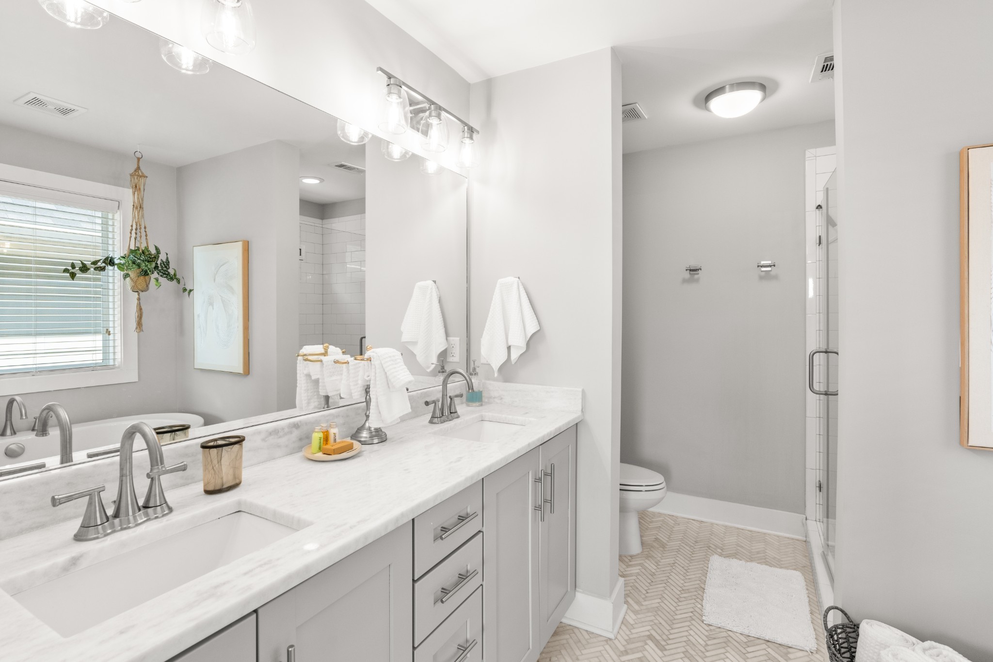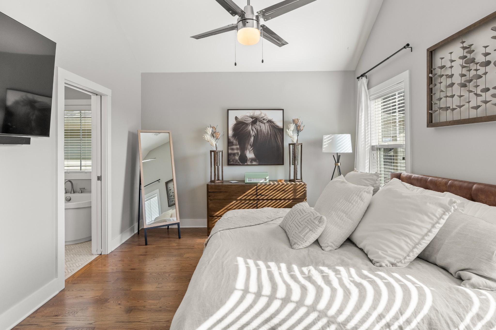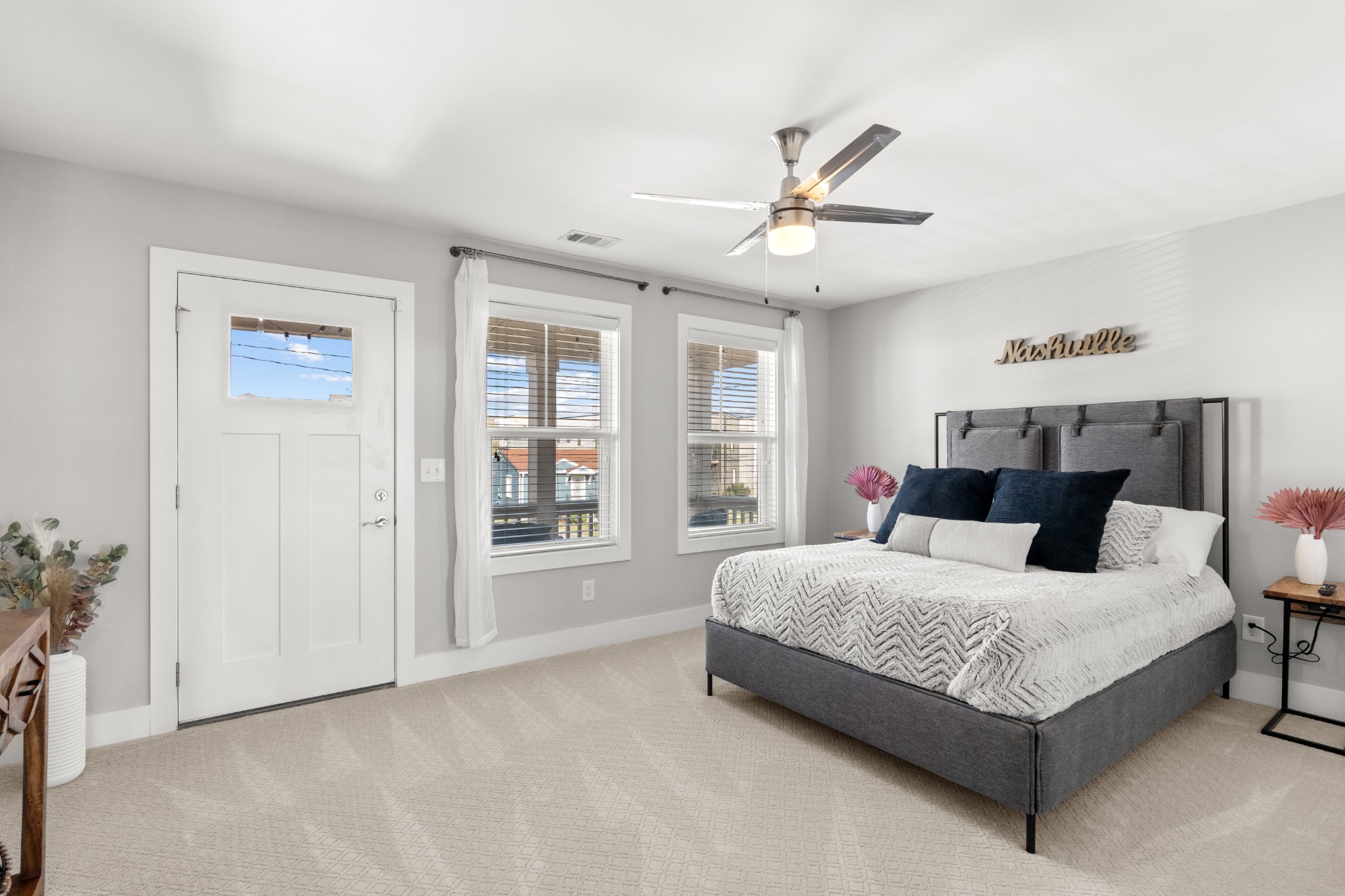 Modern charm meets walkable city living in the heart of The Nations. This 4-bedroom, 3-bath home offers a flexible layout with two living areas, hardwood floors, marble countertops, and natural light throughout. A main-level bedroom functions perfectly as a guest suite, office, or second living space. The vaulted primary suite upstairs features a spa-like bath with double vanities, a walk-in shower, marble tile, and a soaking tub. Enjoy three covered porches, a white picket fence, and a freshly updated lawn with new mulch, aeration, and reseeding. Two-car carport with alley access. Located just minutes from Nashville’s best restaurants, coffee shops, and downtown.