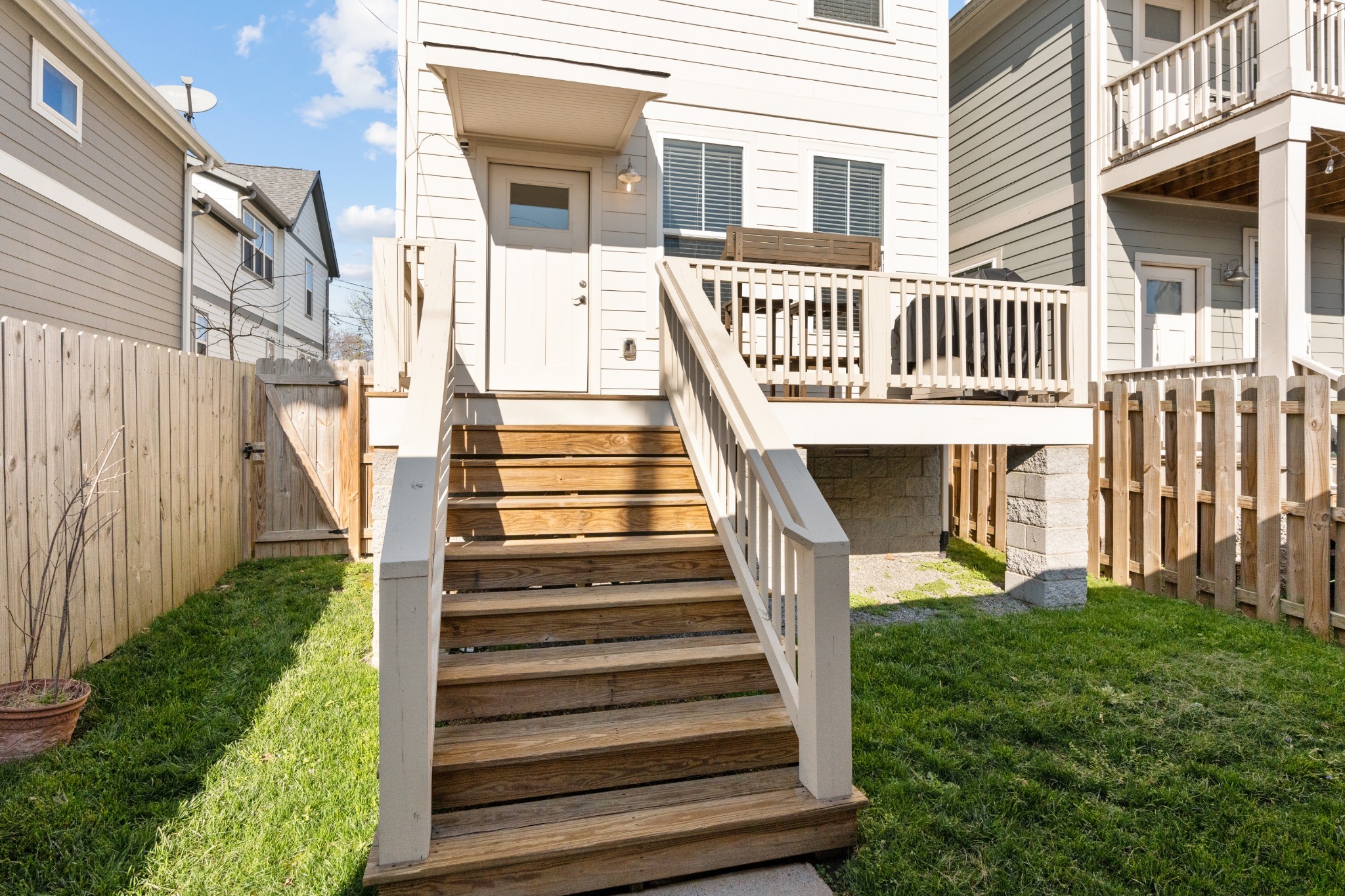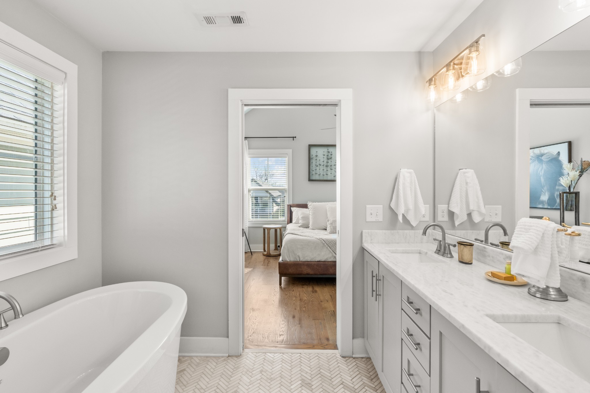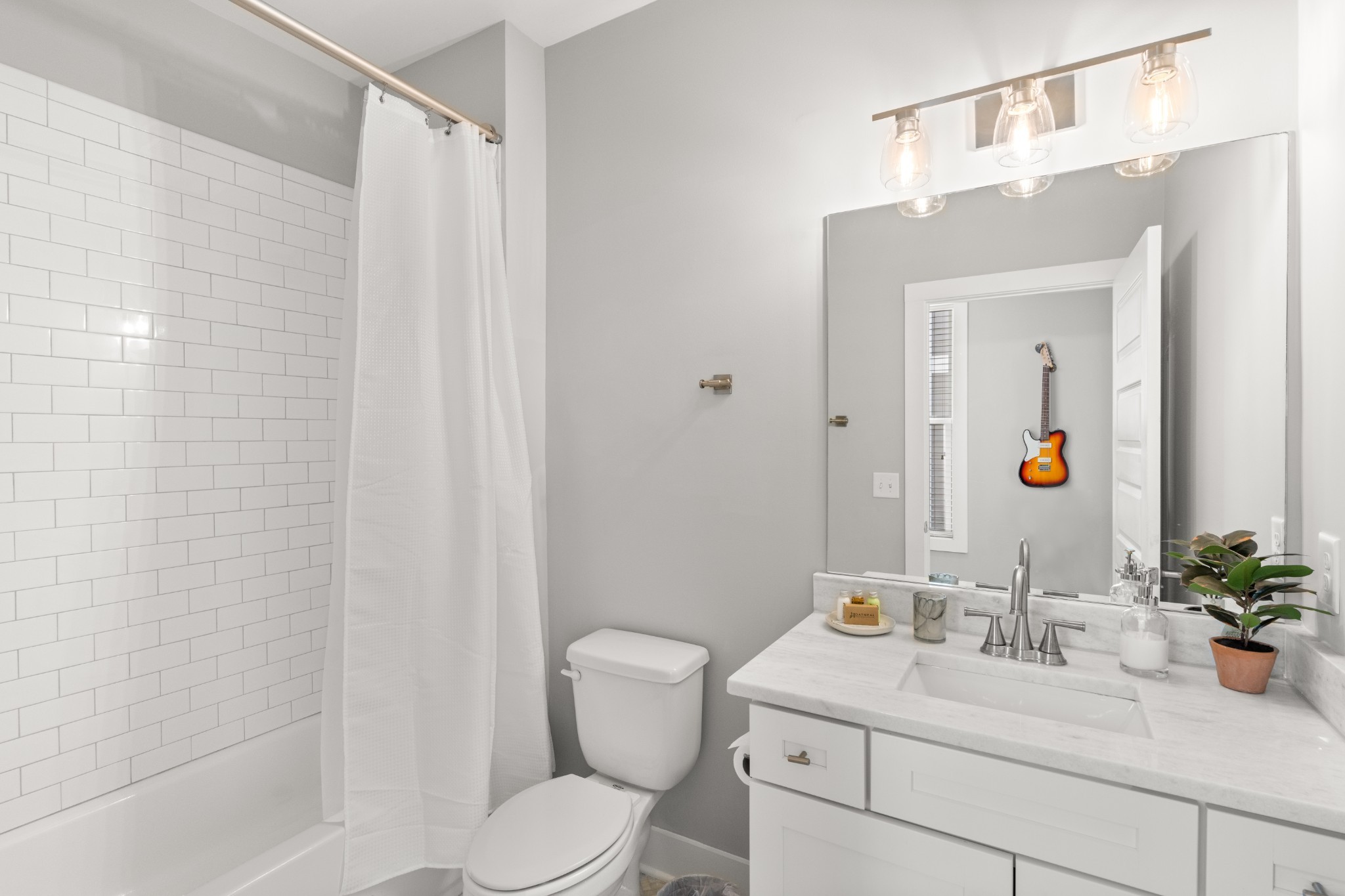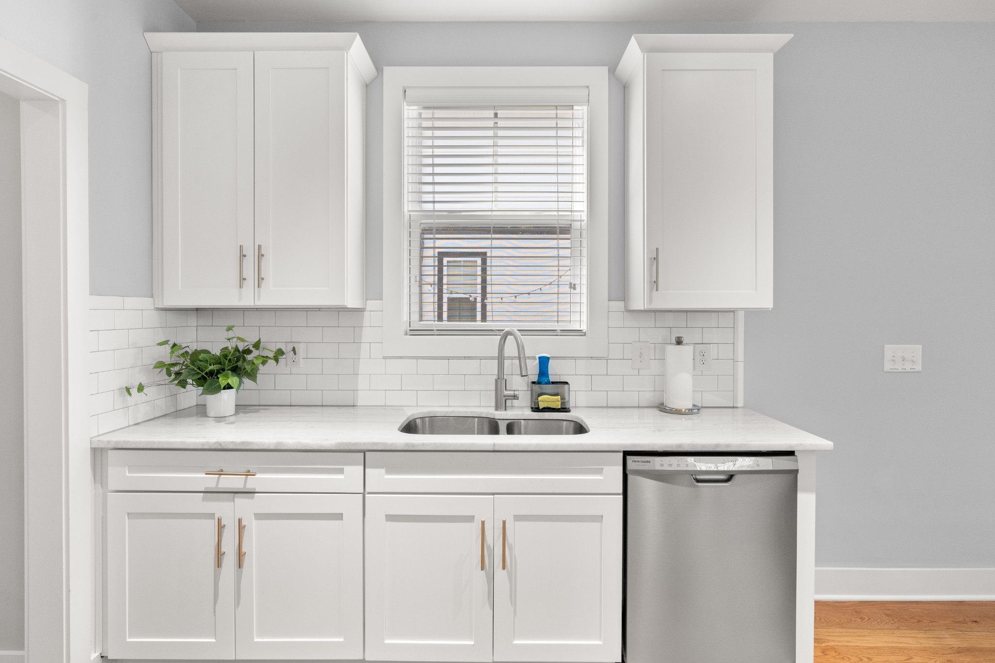 Modern charm meets walkable city living in the heart of The Nations. This 4-bedroom, 3-bath home offers a flexible layout with two living areas, hardwood floors, marble countertops, and natural light throughout. A main-level bedroom functions perfectly as a guest suite, office, or second living space. The vaulted primary suite upstairs features a spa-like bath with double vanities, a walk-in shower, marble tile, and a soaking tub. Enjoy three covered porches, a white picket fence, and a freshly updated lawn with new mulch, aeration, and reseeding. Two-car carport with alley access. Located just minutes from Nashville’s best restaurants, coffee shops, and downtown.