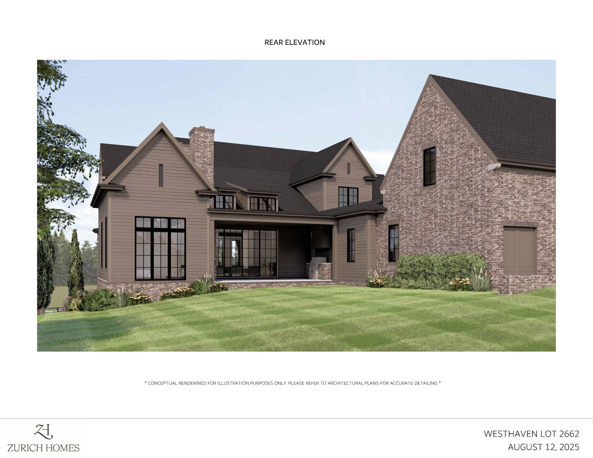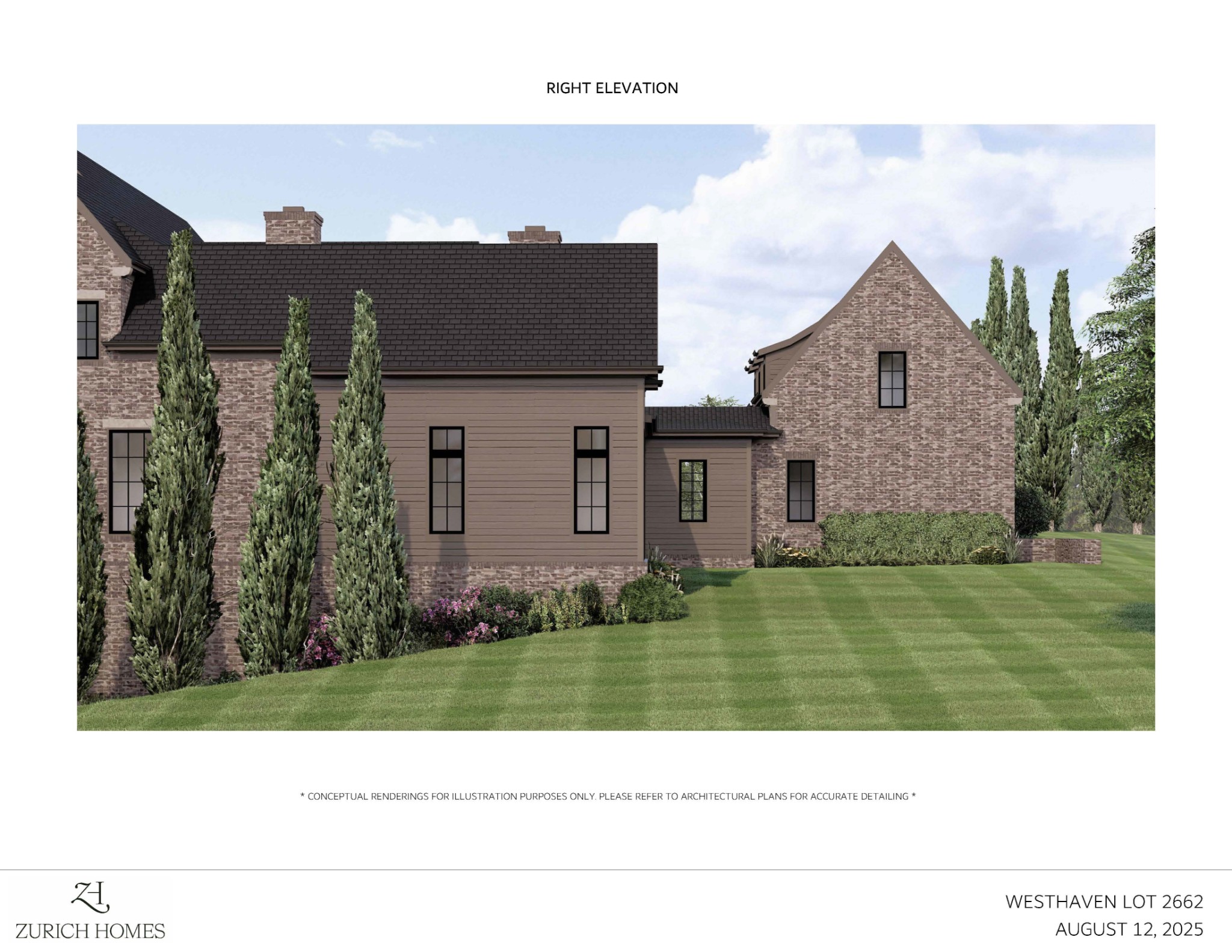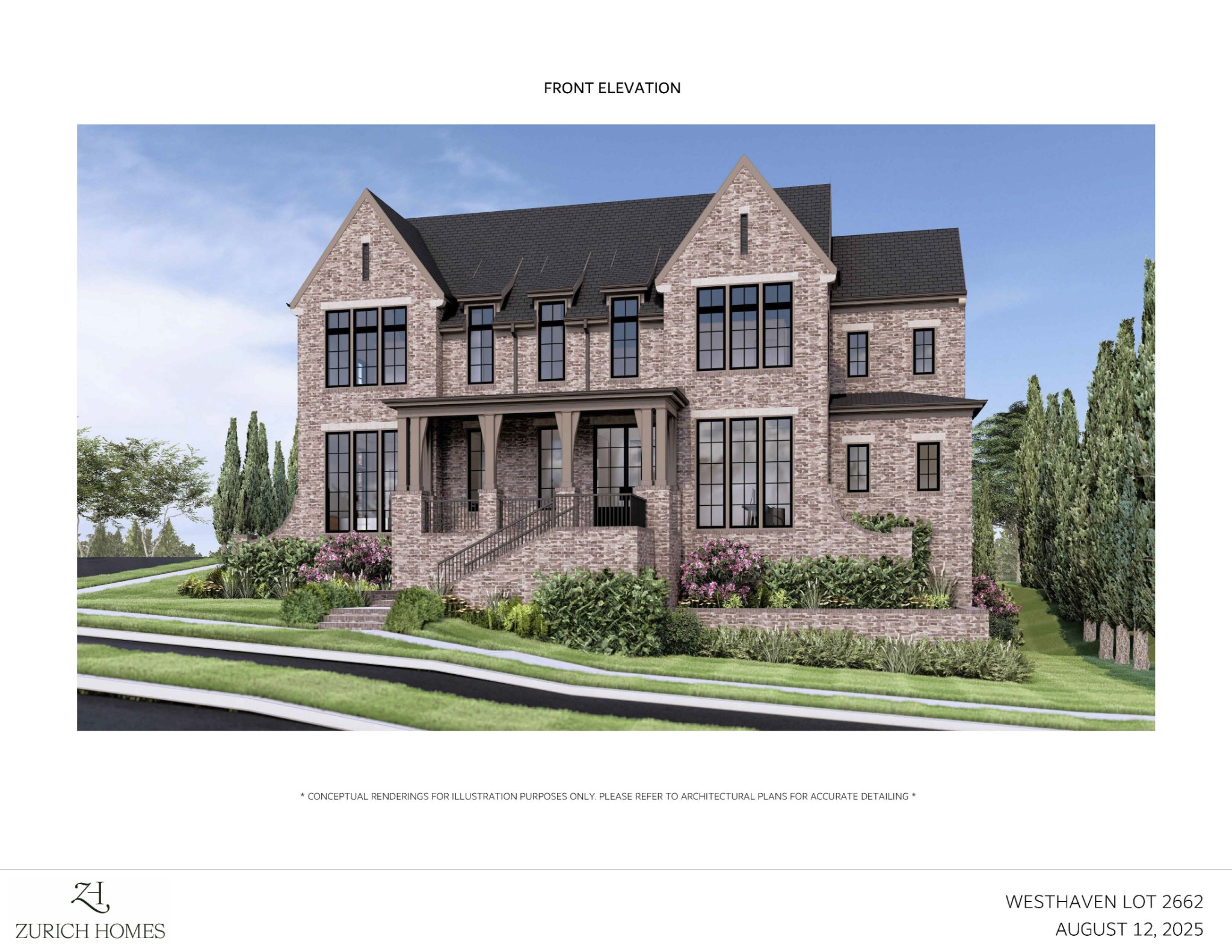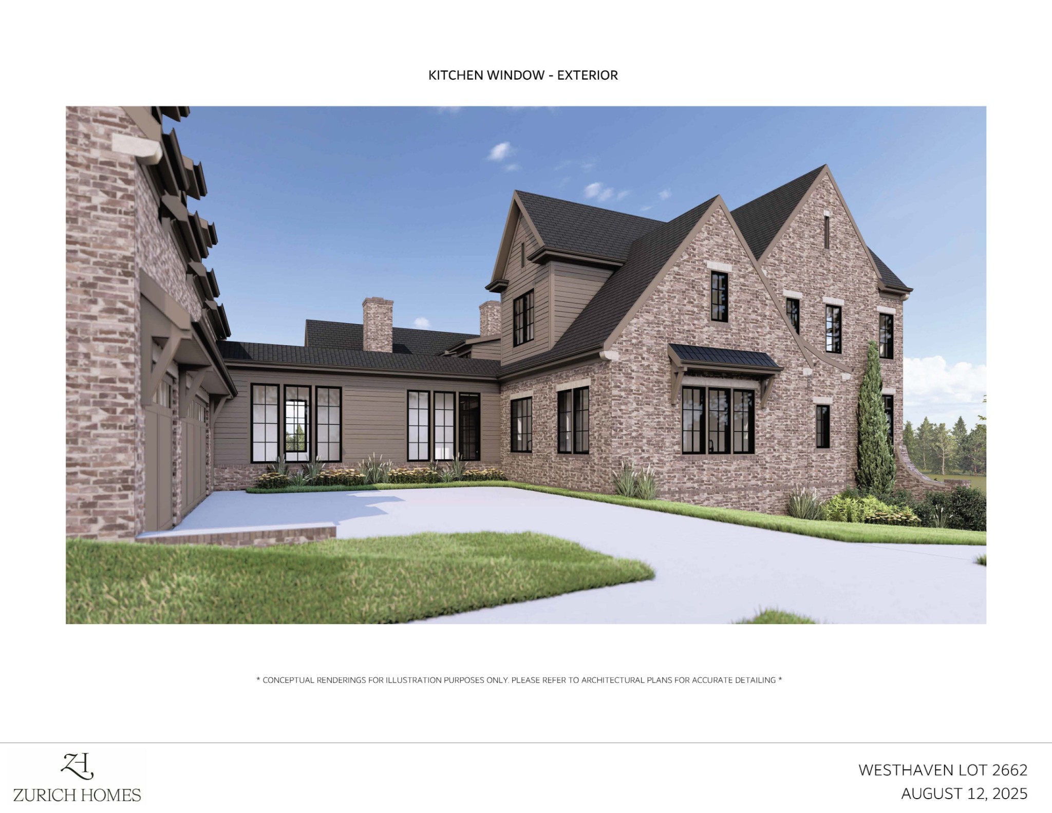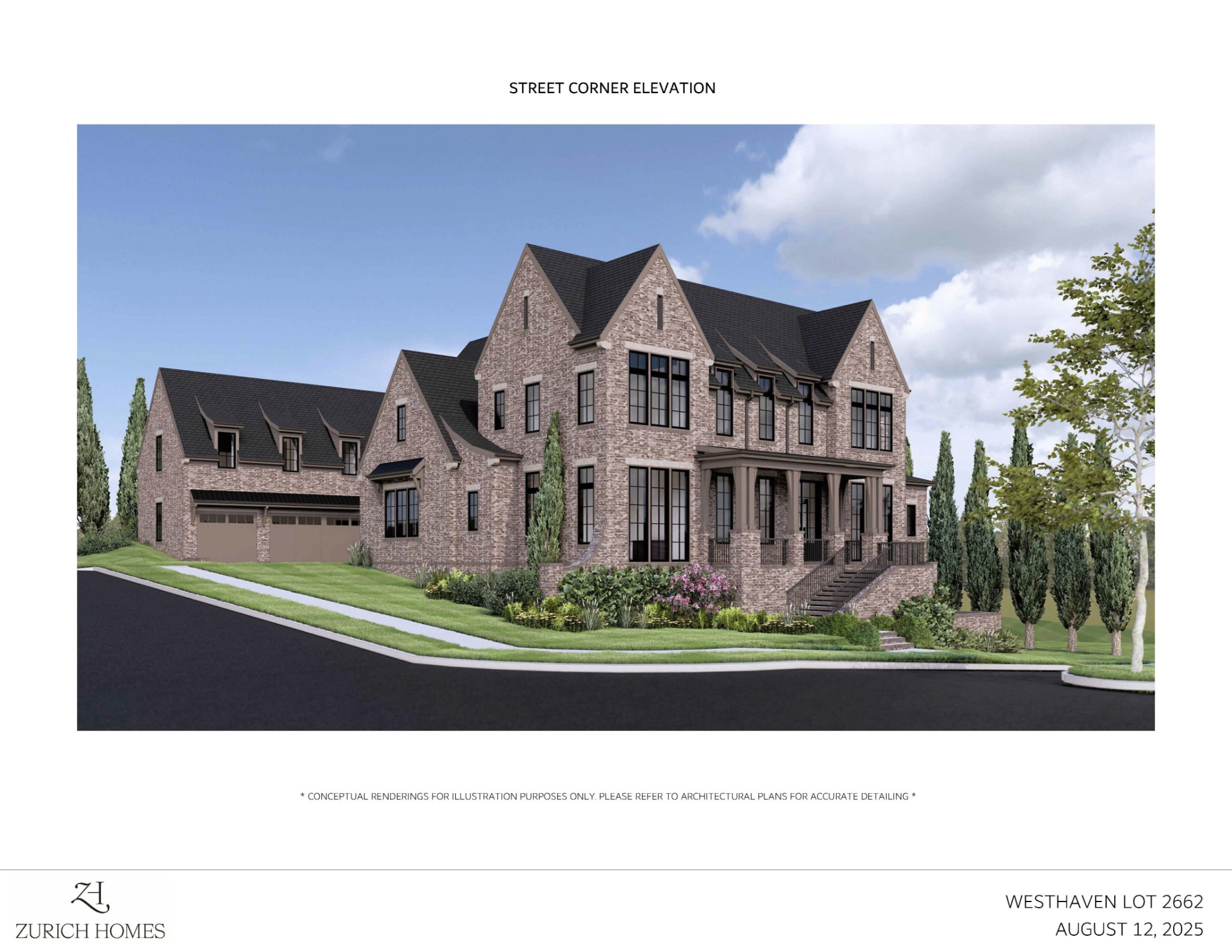Zurich Homes Group, Custom-designed Modern Tudor elevation featuring designer brick on a corner homesite~5 Beds, 6 Full Baths, 1 Half Baths~11’ ceilings on main floor and Bonus Room; 9’ ceilings on second floor~ Designed with natural light and views in mind - lots of full-height windows and transoms~ Kitchen features premium stainless-steel Wolf 48” Slide-In Gas Range, Custom cabinet paneled Miele 24” Dishwasher, cabinet-paneled built-in Sub-Zero 30” Refrigerator and built-in Sub-Zero 30” Freezer~ Amazing Prep Kitchen featuring an second Mile dishwasher, 24” Wolf microwave drawer and additional Frigidaire 33” stainless steel refrigerator column and 33” stainless steel freezer column – an entertainer’s dream~ Master Bath features freestanding tub with floor-mounted tub filler, quartz countertops and custom tile details~ Beautiful trim details throughout including oak details and beams~ Designer selection preview listed under *DOCUMENTS*