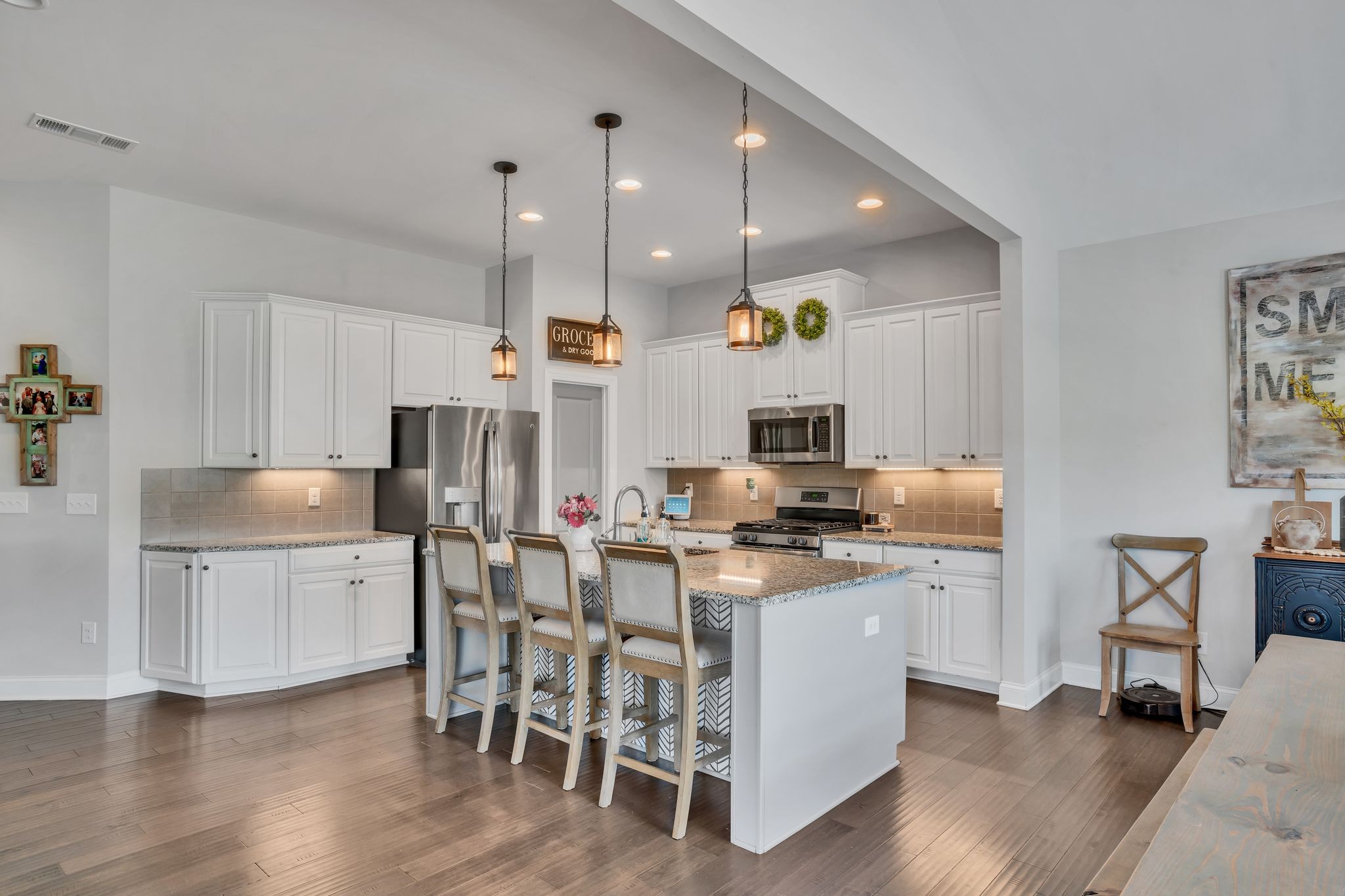 Home also features open floorplan with hardwood throughout living areas, two story foyer, walk-in pantry, and in-ground basketball goal, tankless water heater. New roof installed in March 2025 with 50 yr GAF shingles. Community swimming pool and park access onsite.