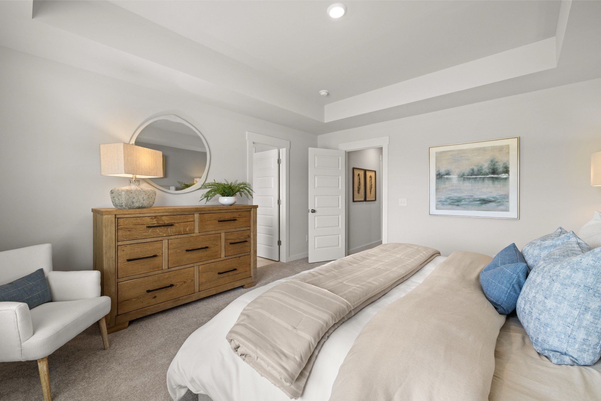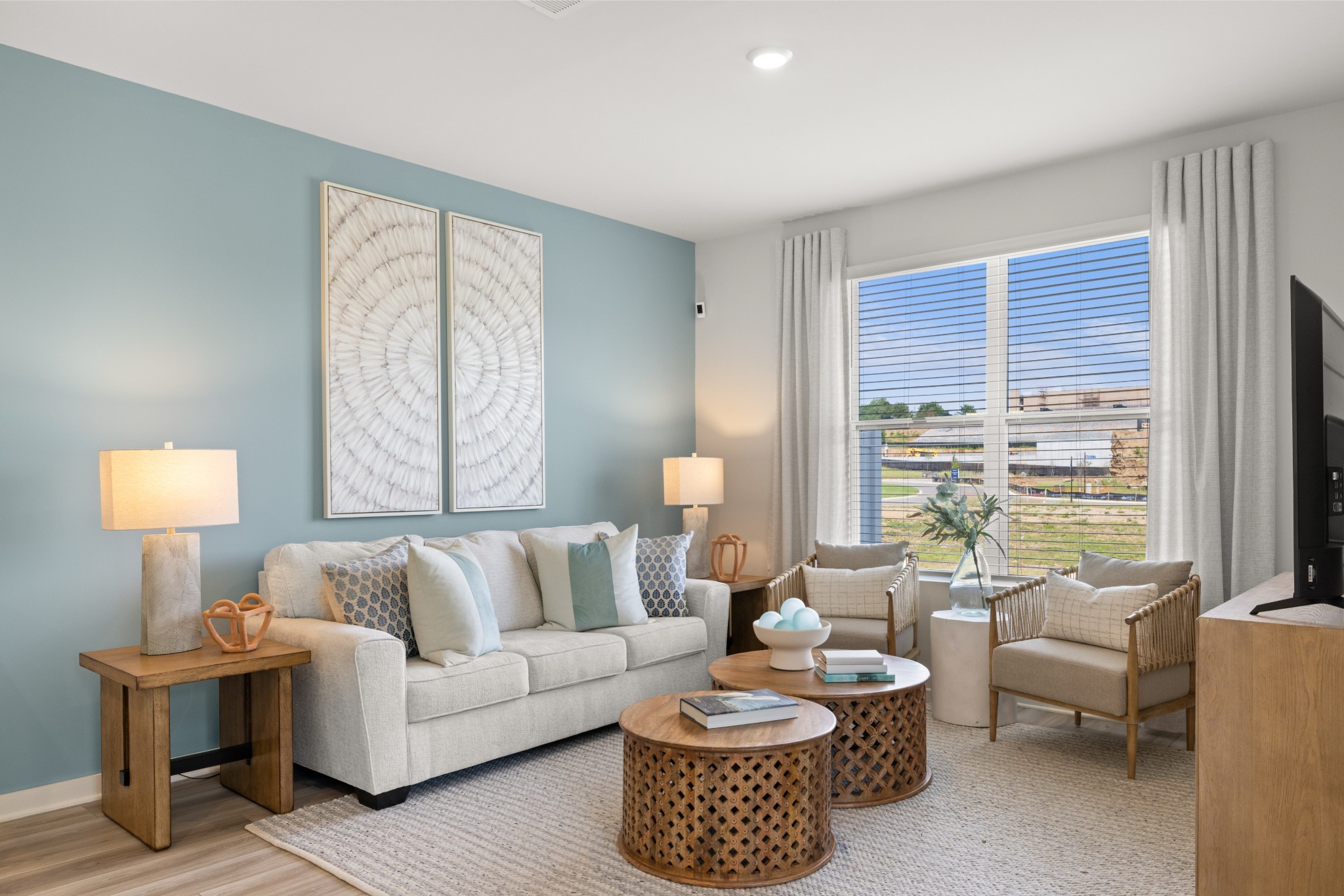 LOT 157 - Harper Floorplan. This new two-story townhome design combines comfort and style. The first floor features an open-concept layout connecting a living room for shared moments, a dining room for memorable meals and a kitchen for inspired cooks. Nearby sliding glass doors provide access to a covered patio for outdoor enjoyment. On the second floor, two secondary bedrooms and a spacious owner’s suite with a luxe bathroom and large walk-in closet provide restful retreats for family members and overnight guests. *Images from a furnished model of this home. Actual configuration and features may vary.
