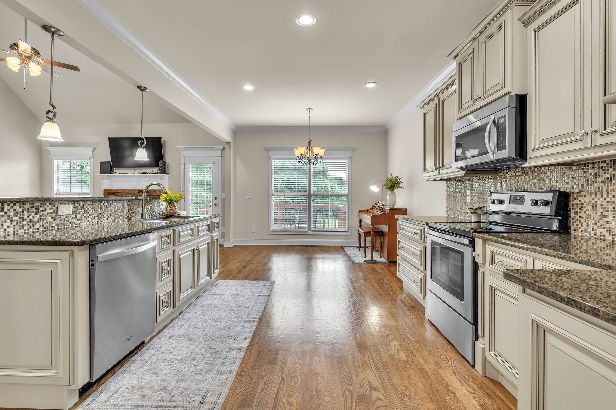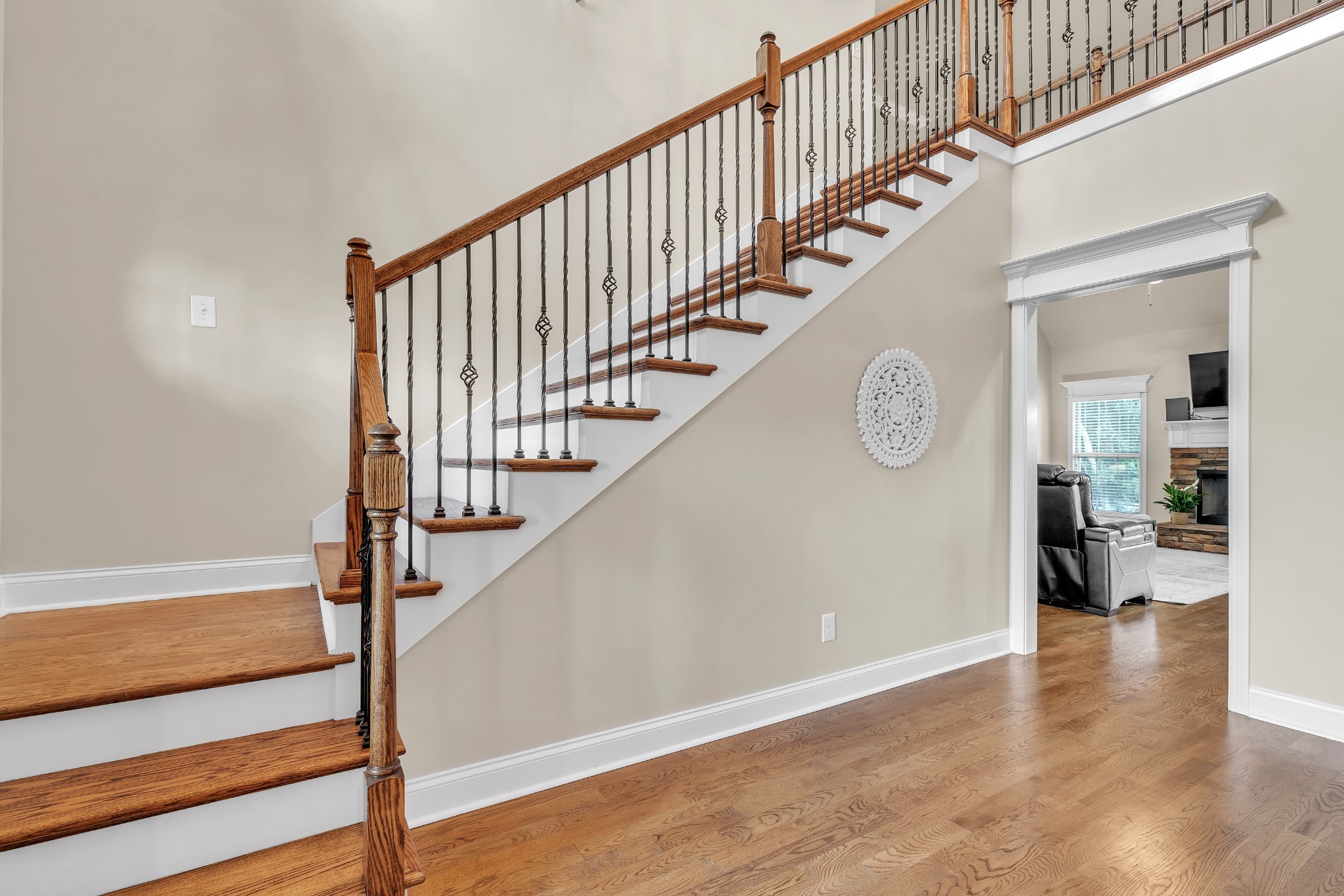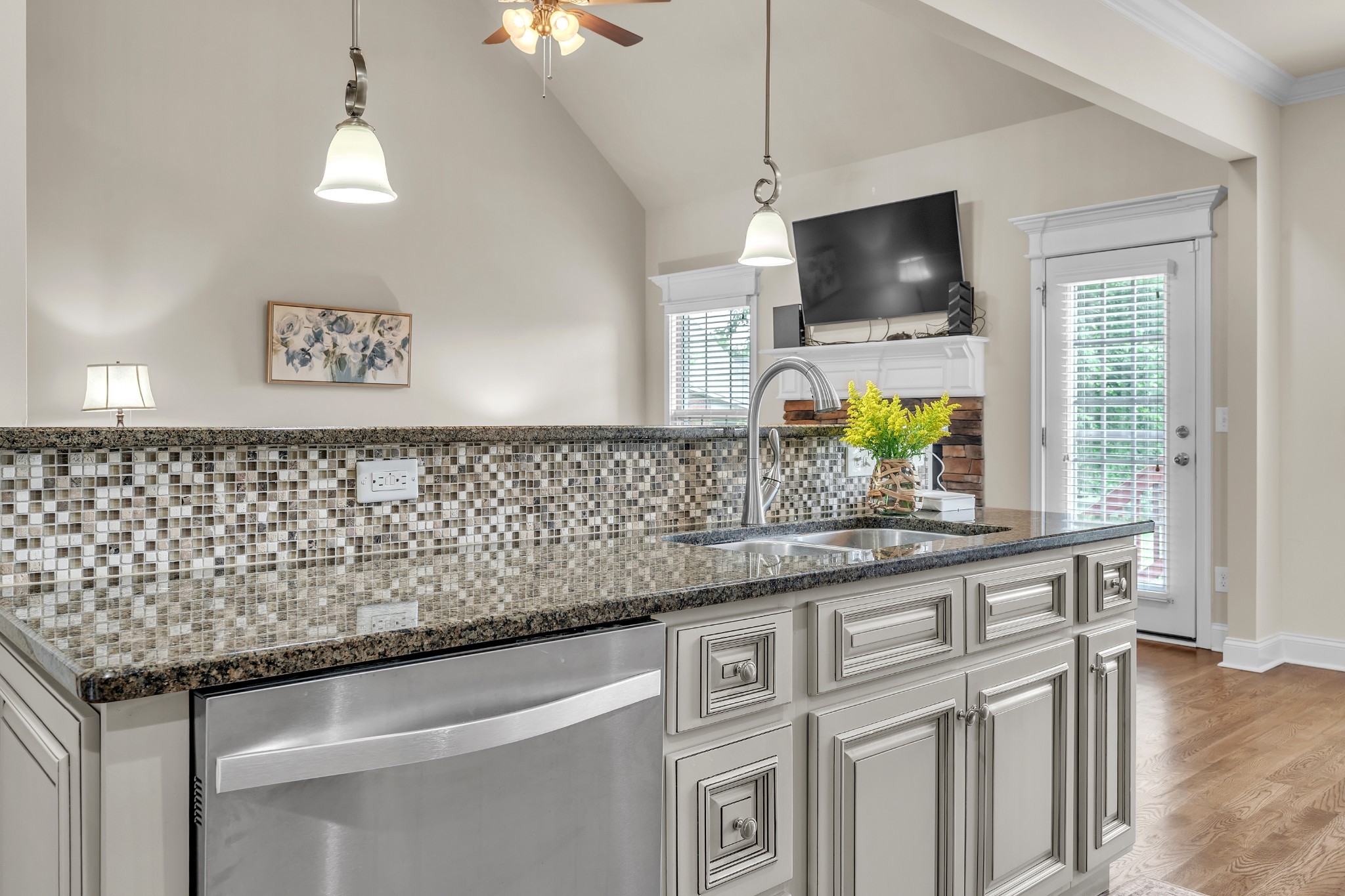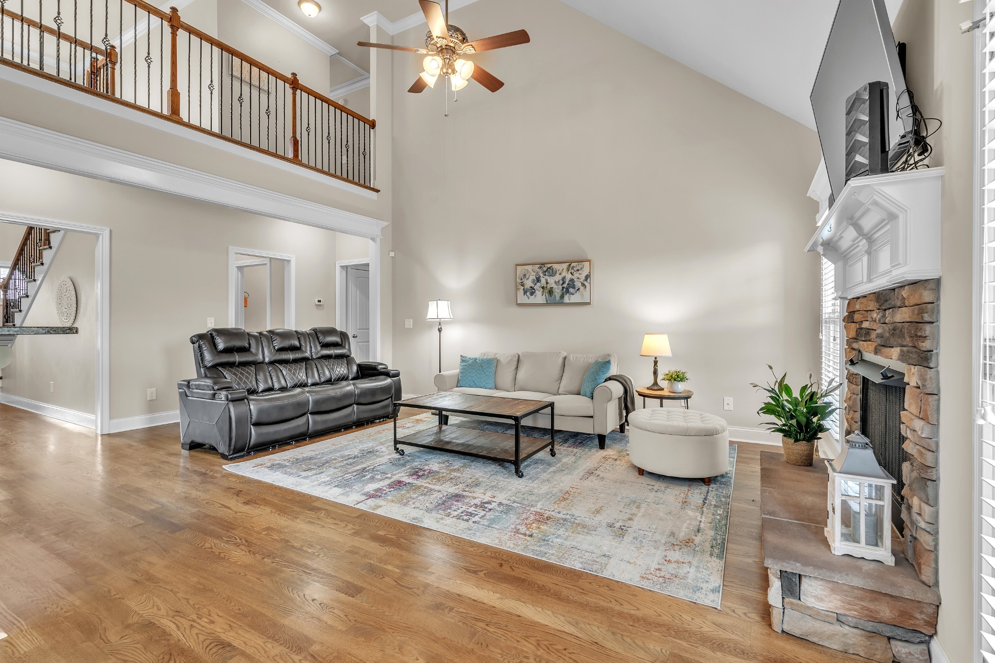 You'll love entertaining in the open-concept living room with its cozy fireplace, modern white mantel, and catwalk above. The chef’s kitchen boasts abundant cabinetry, a large bar for gathering, and an oversized pantry. The formal dining room comfortably seats eight.