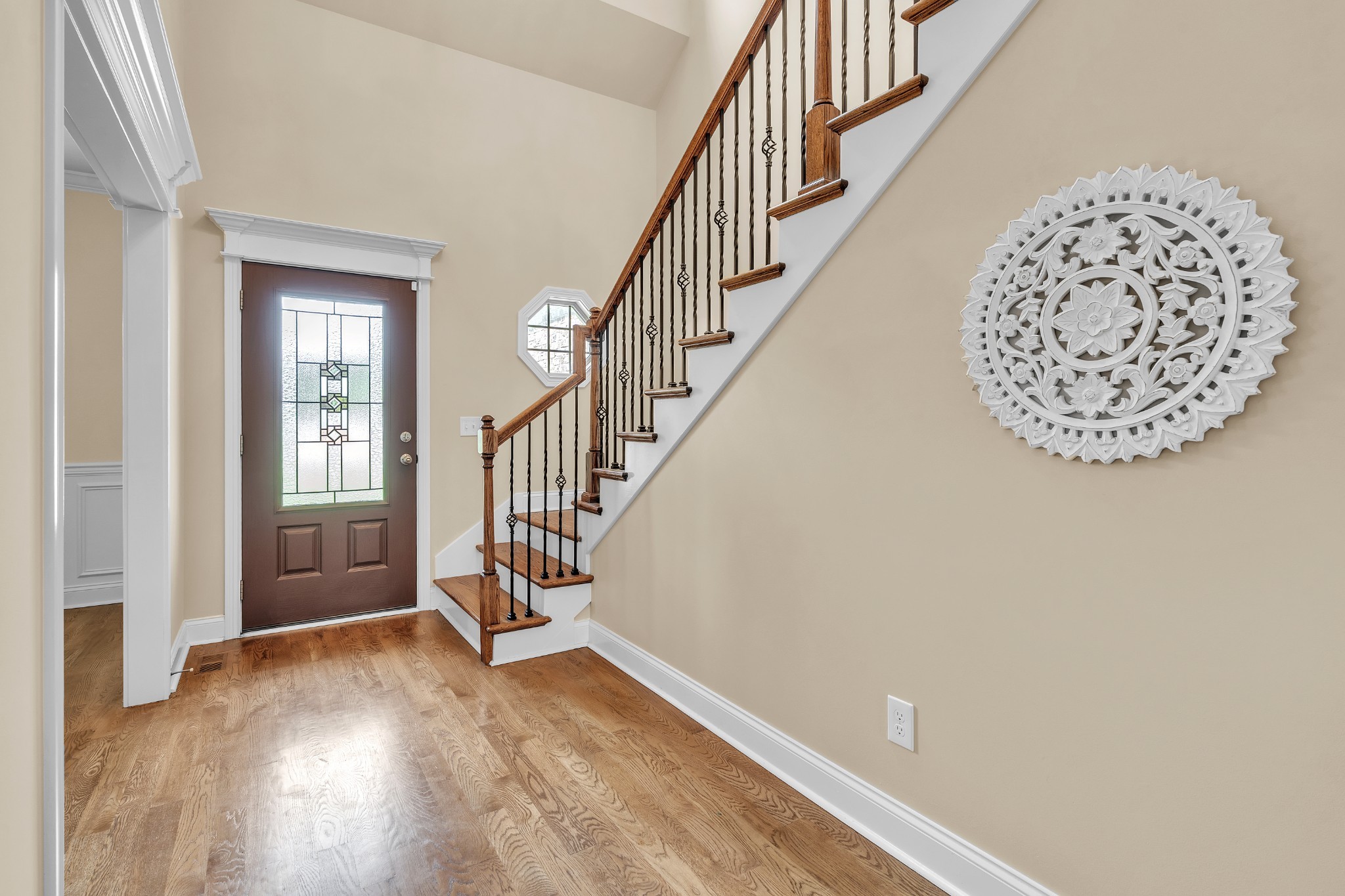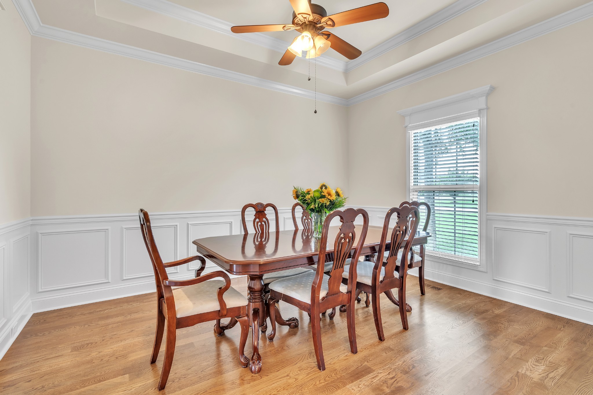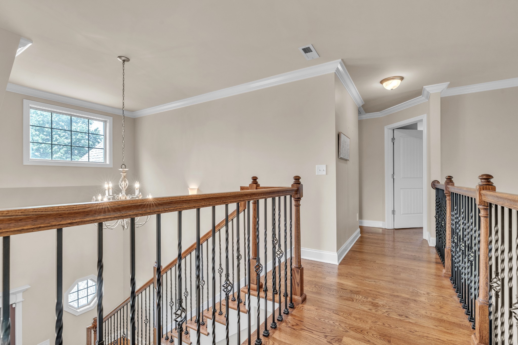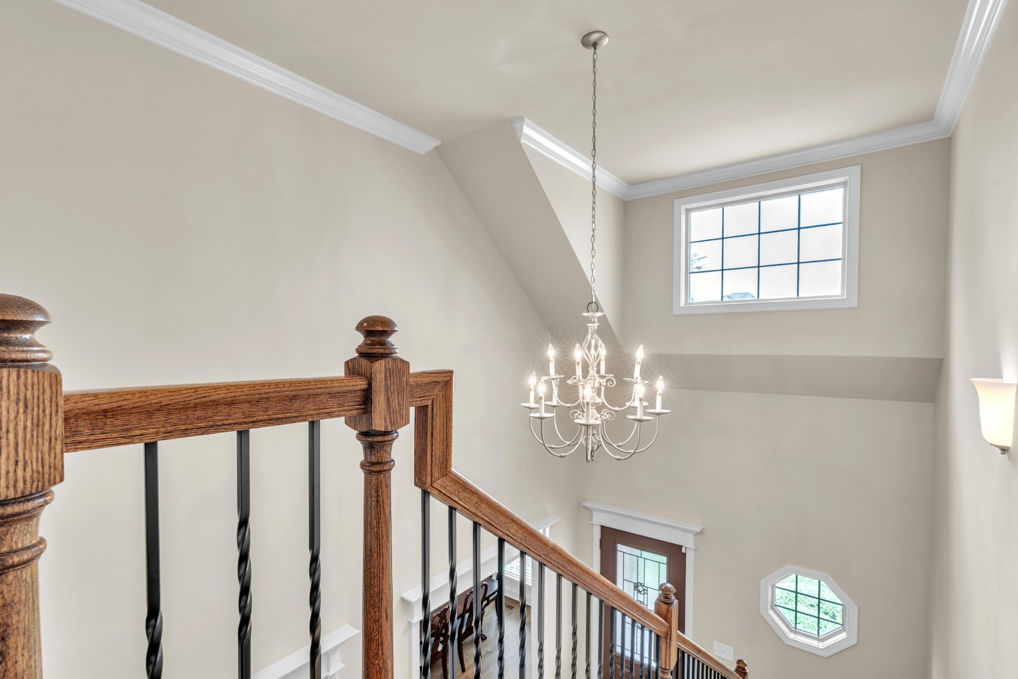 You'll love entertaining in the open-concept living room with its cozy fireplace, modern white mantel, and catwalk above. The chef’s kitchen boasts abundant cabinetry, a large bar for gathering, and an oversized pantry. The formal dining room comfortably seats eight.
