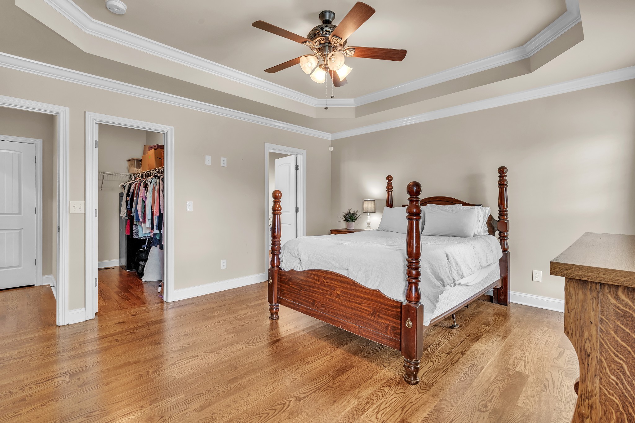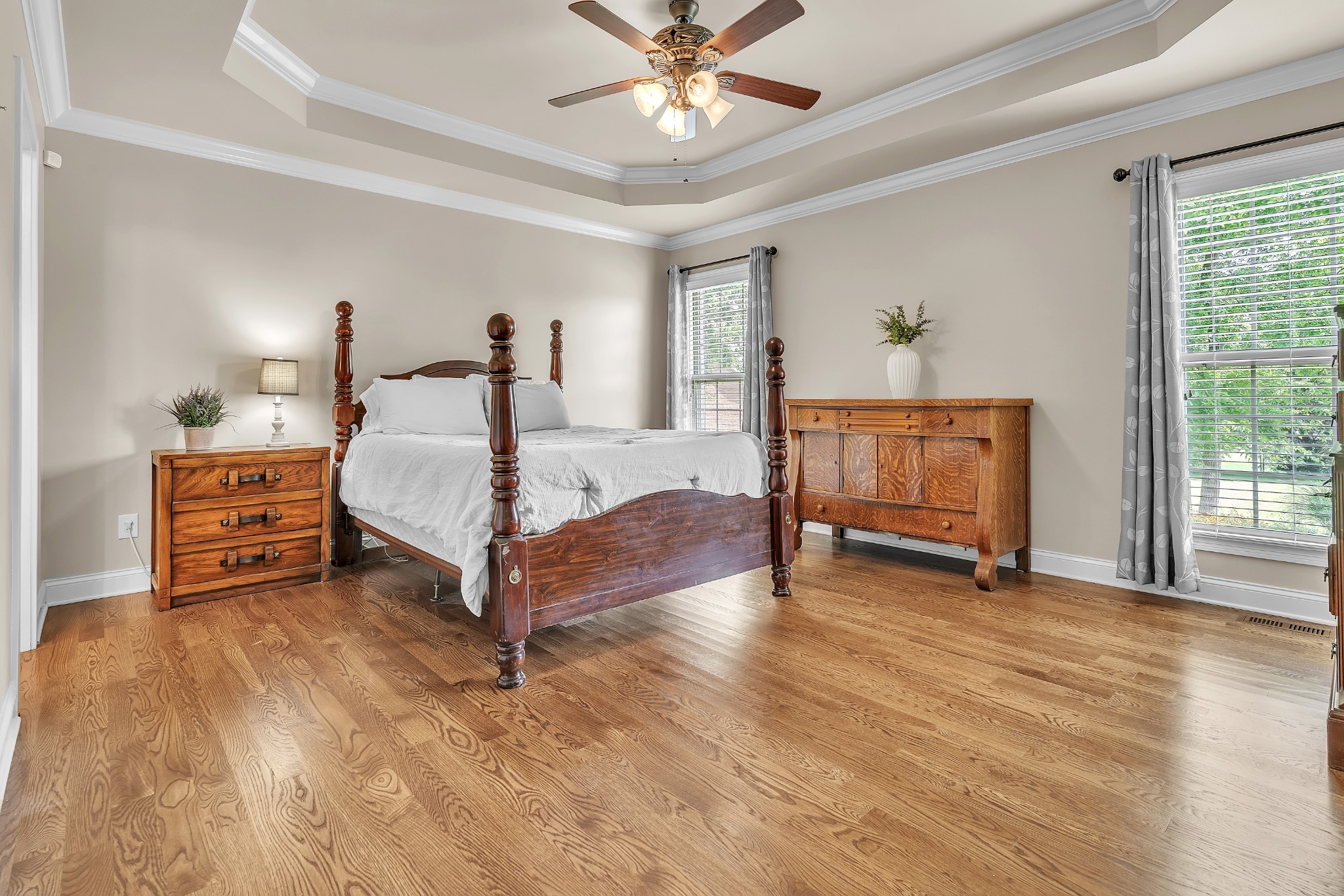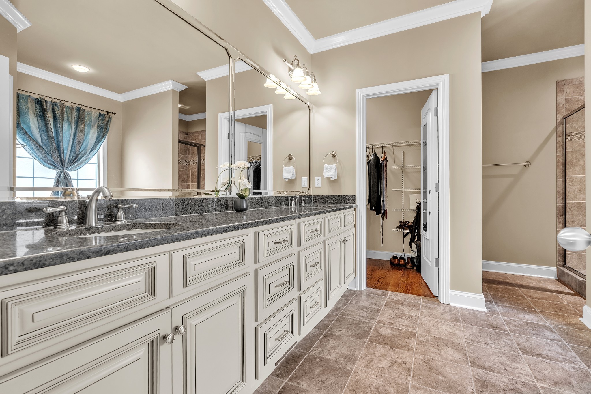 The spacious primary suite on main level offers a tray ceiling, granite double vanities, a relaxing garden tub, a stunning tiled shower, and two huge walk-in closets.