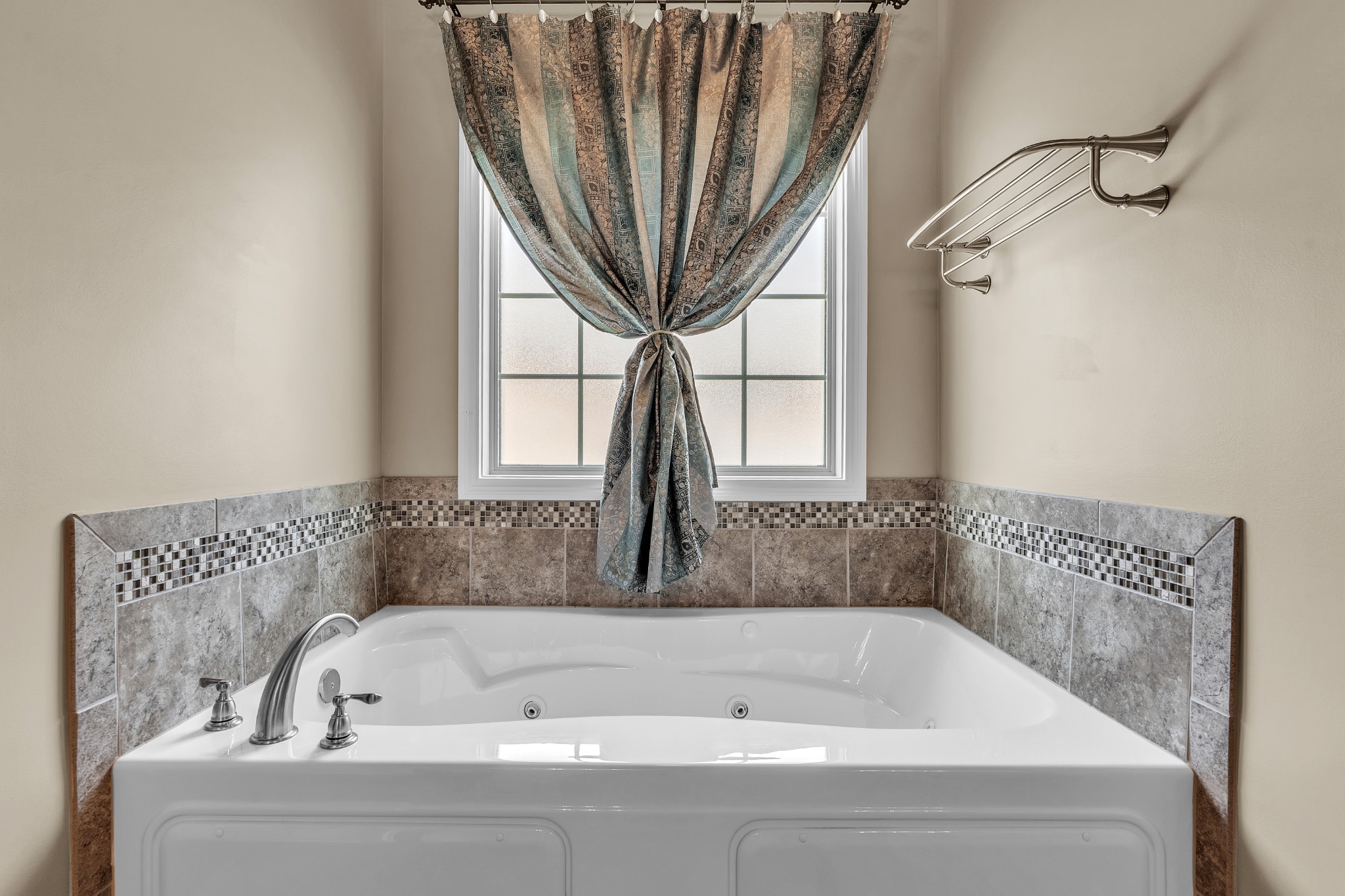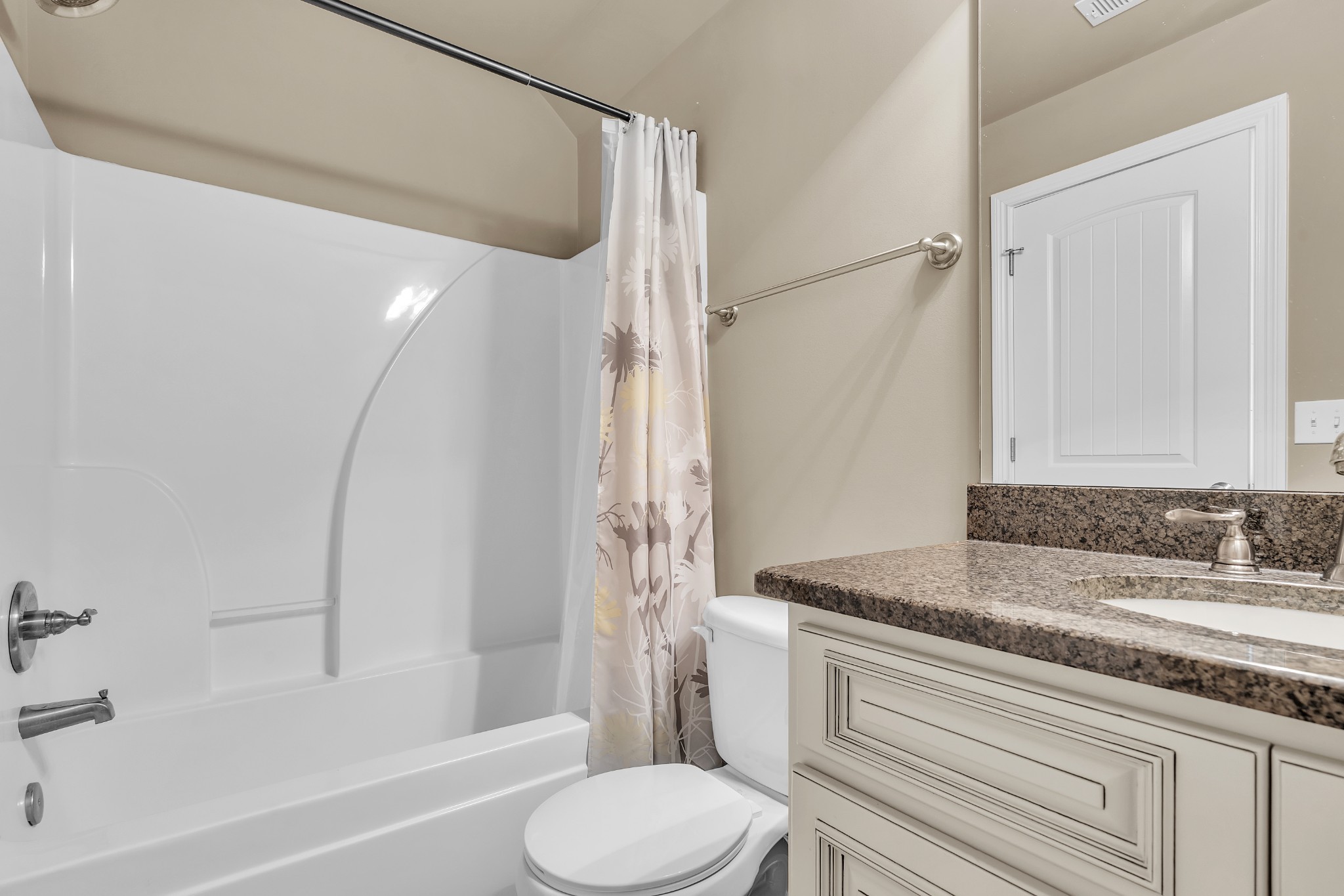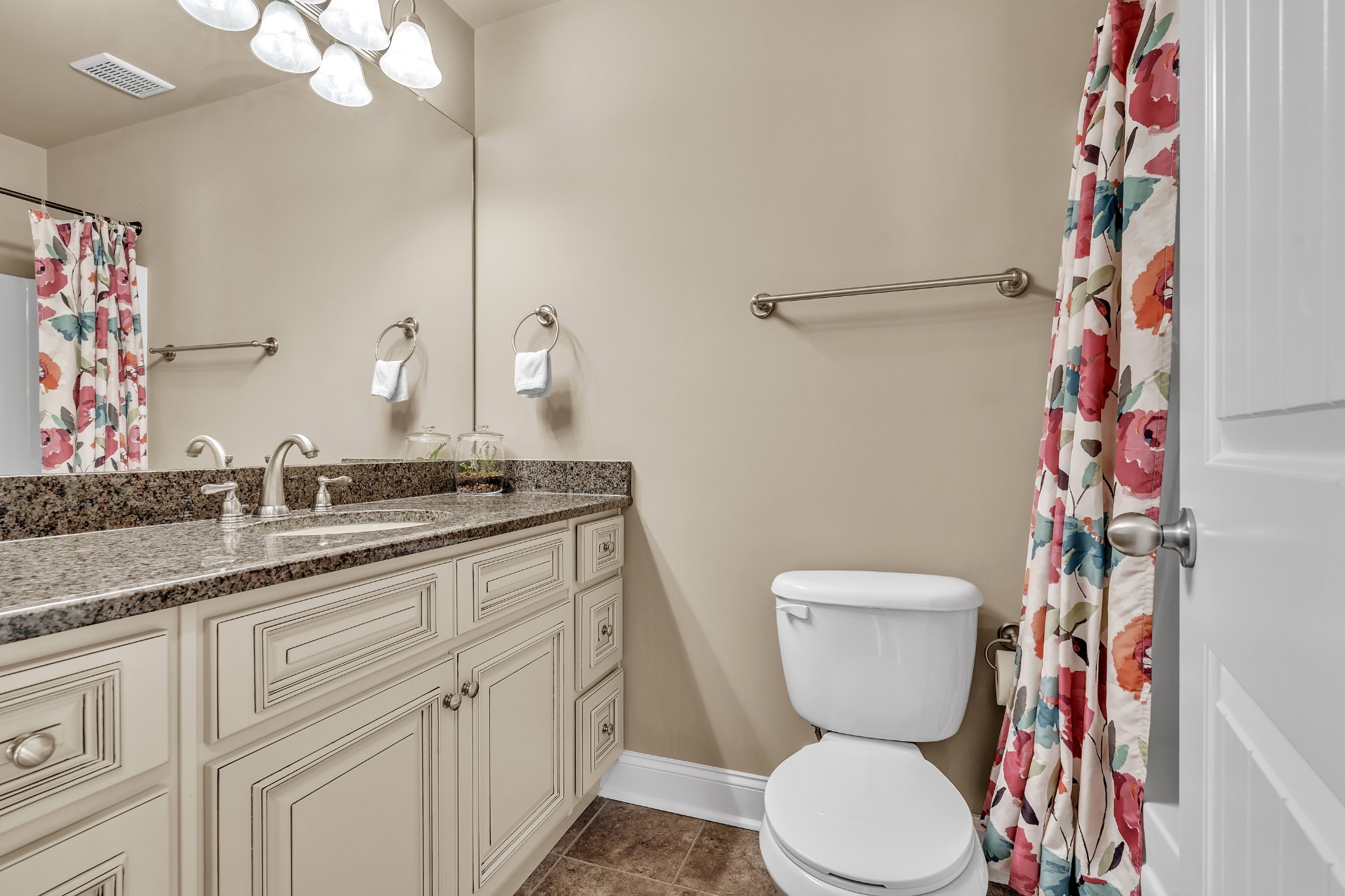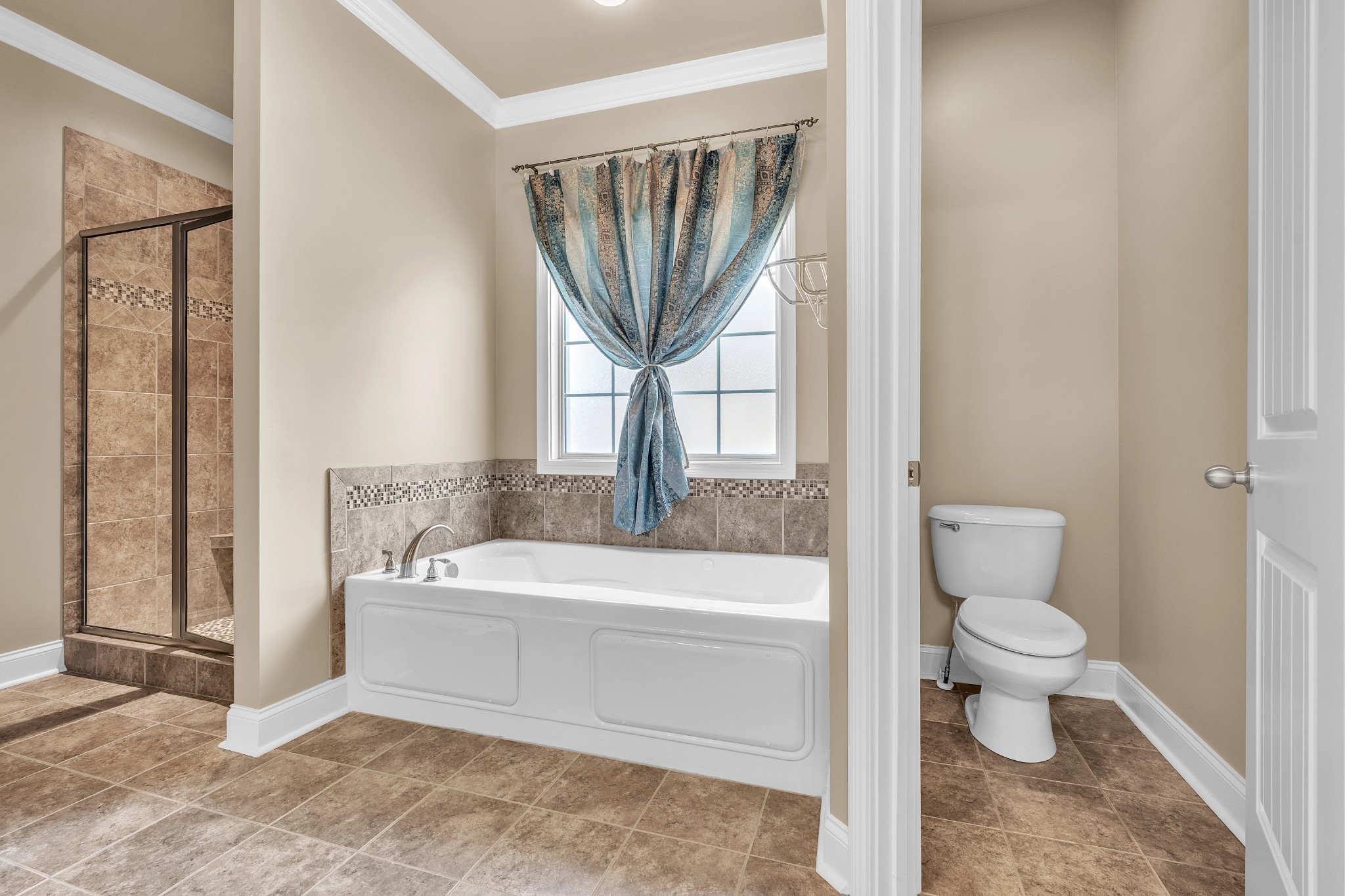 The spacious primary suite on main level offers a tray ceiling, granite double vanities, a relaxing garden tub, a stunning tiled shower, and two huge walk-in closets.