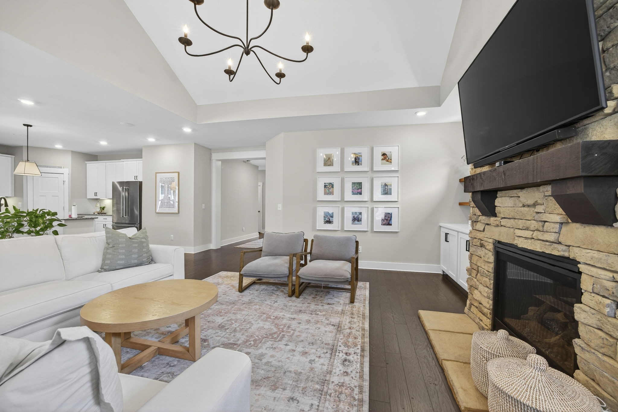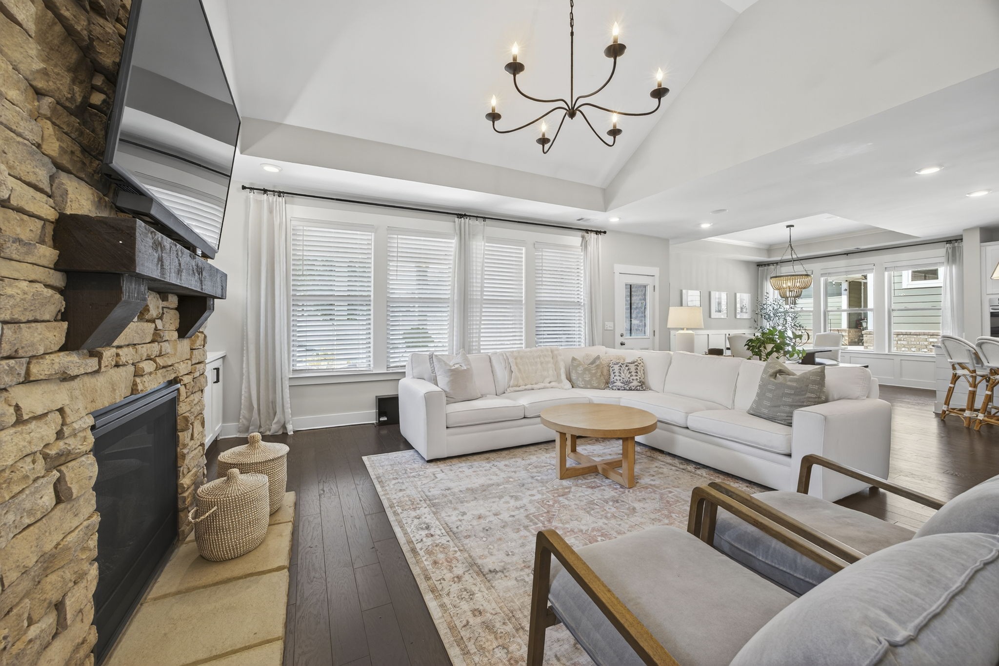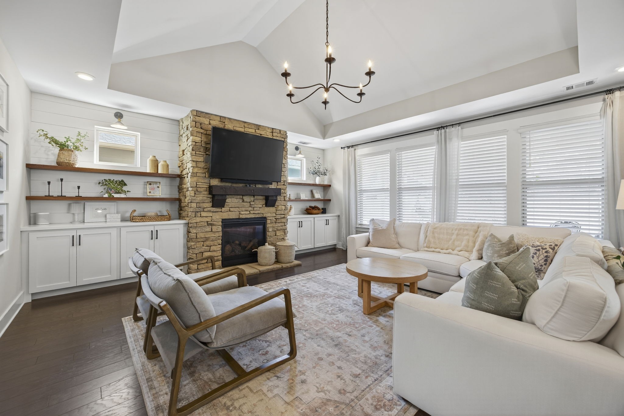 The living room brings serious cozy vibes with a floor-to-ceiling stone fireplace-perfect for marshmallow roasting or dramatic holiday card photos. Built-in shelving and cabinets offer storage for everything from bestsellers to board games (or just decorative baskets you never actually use).