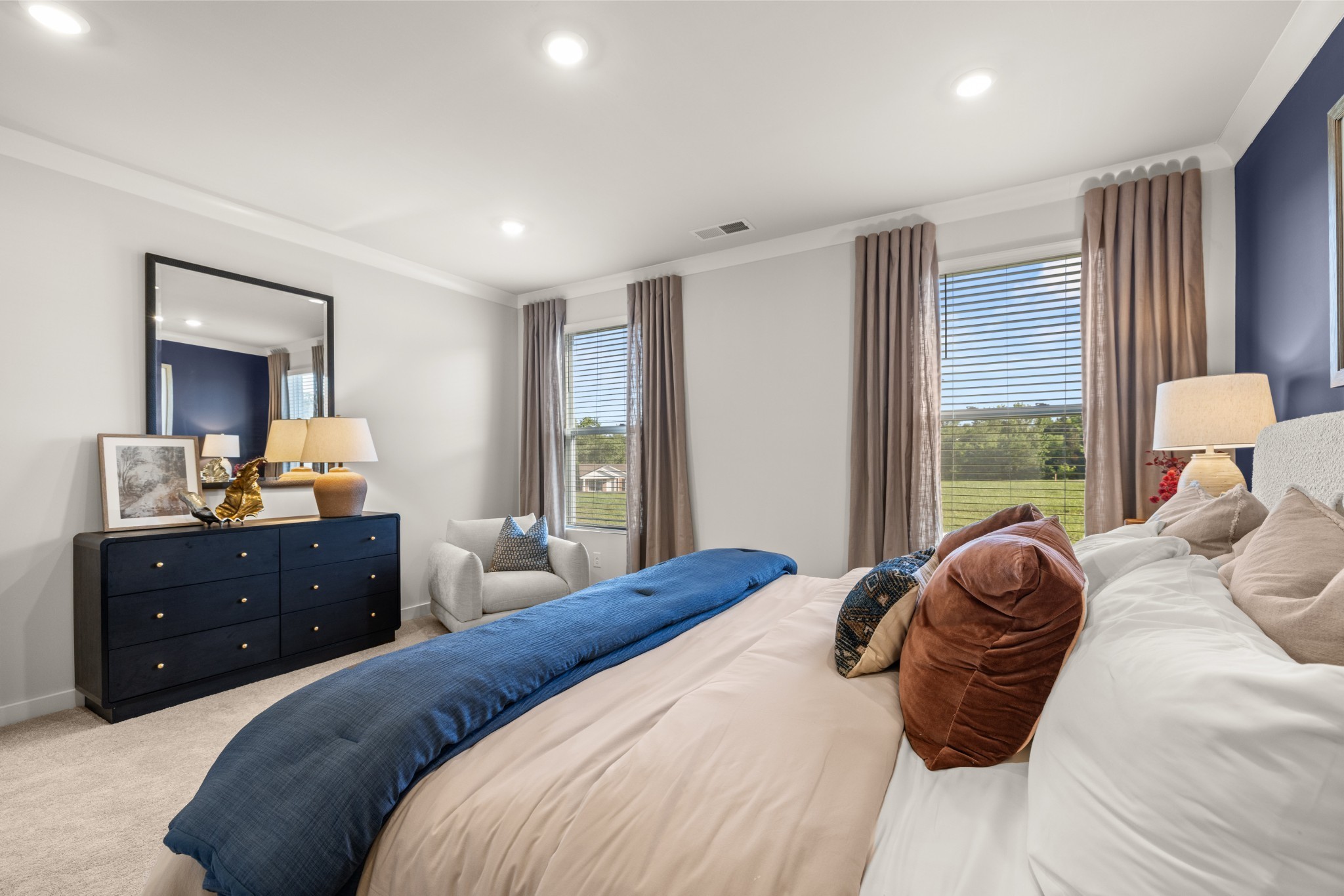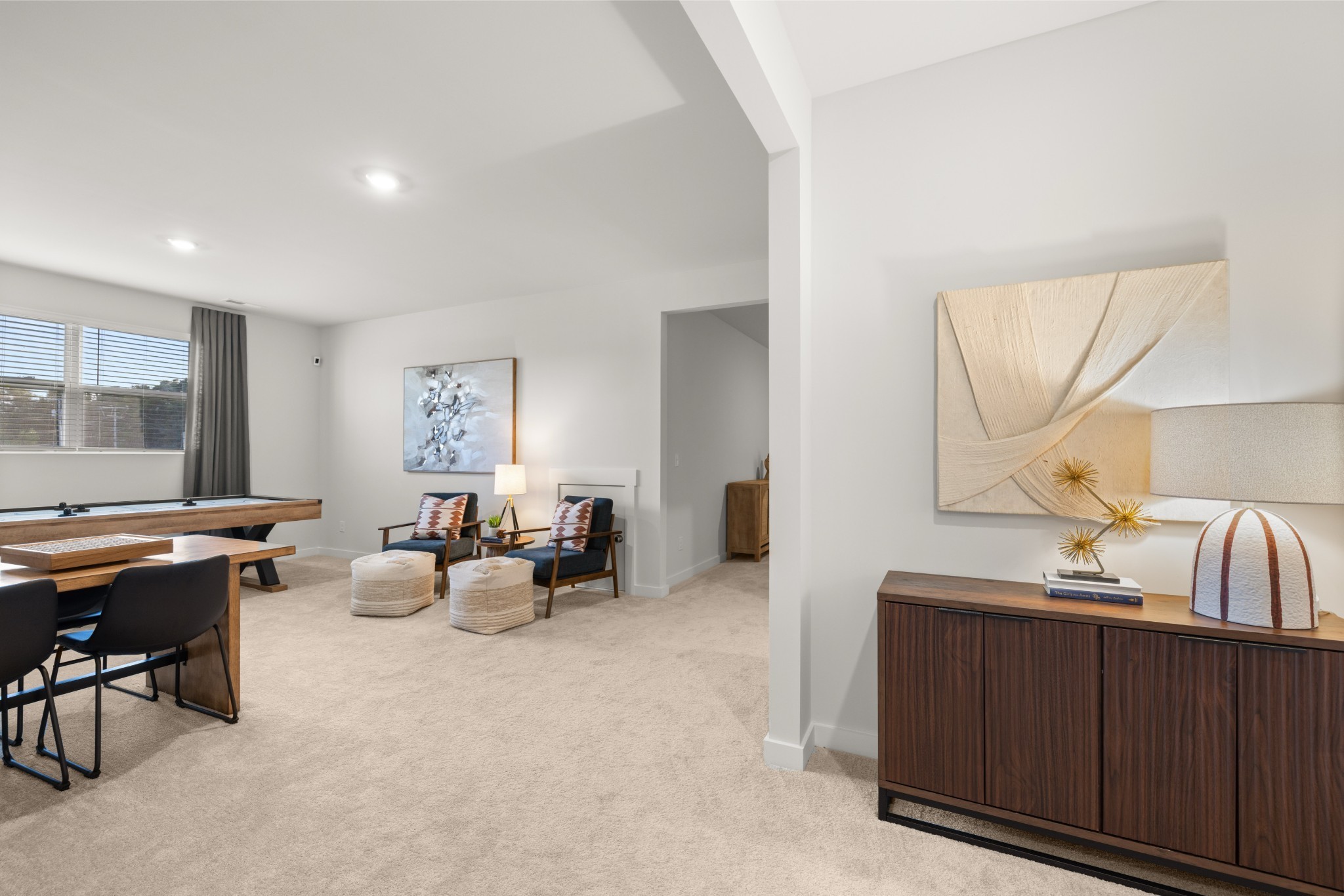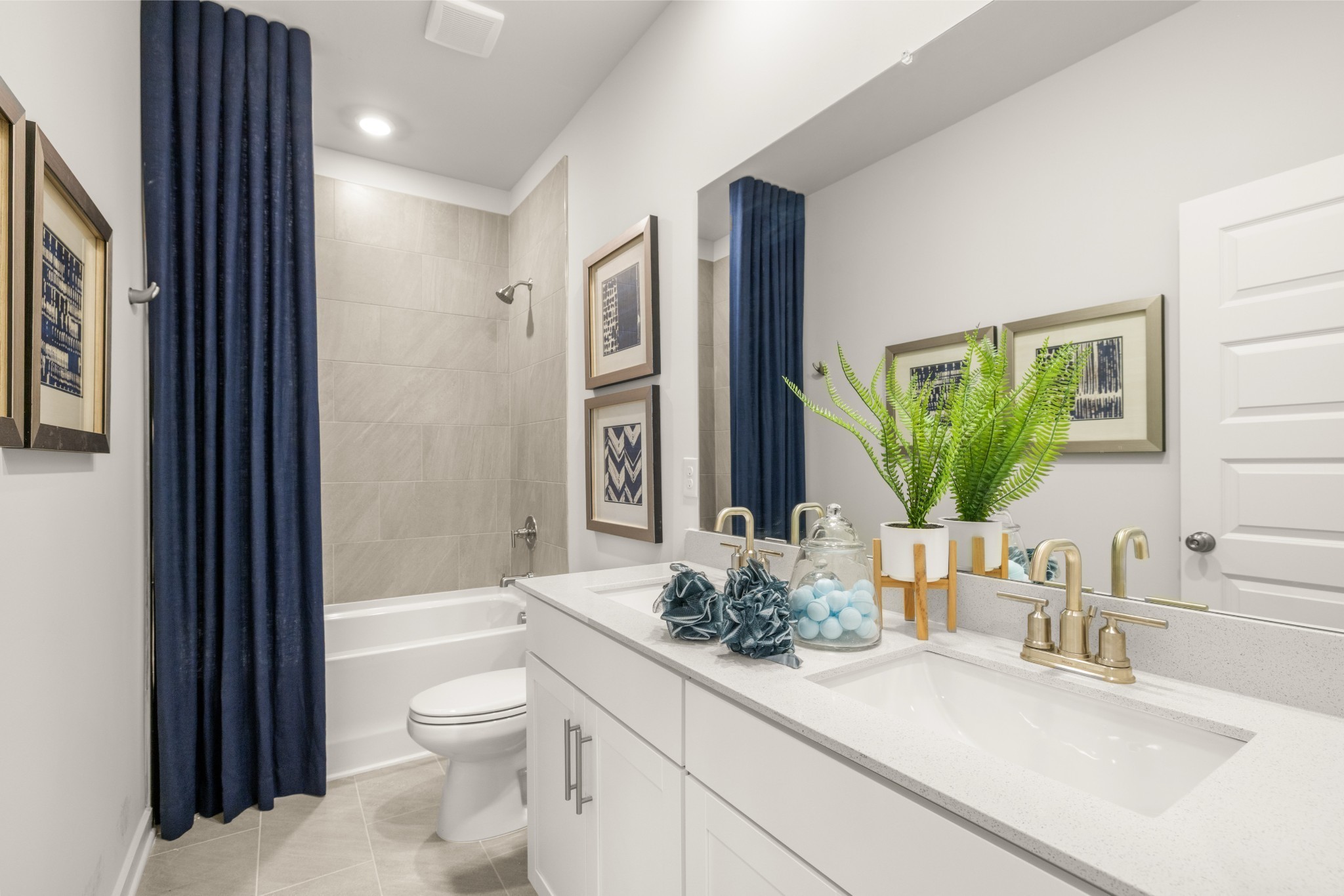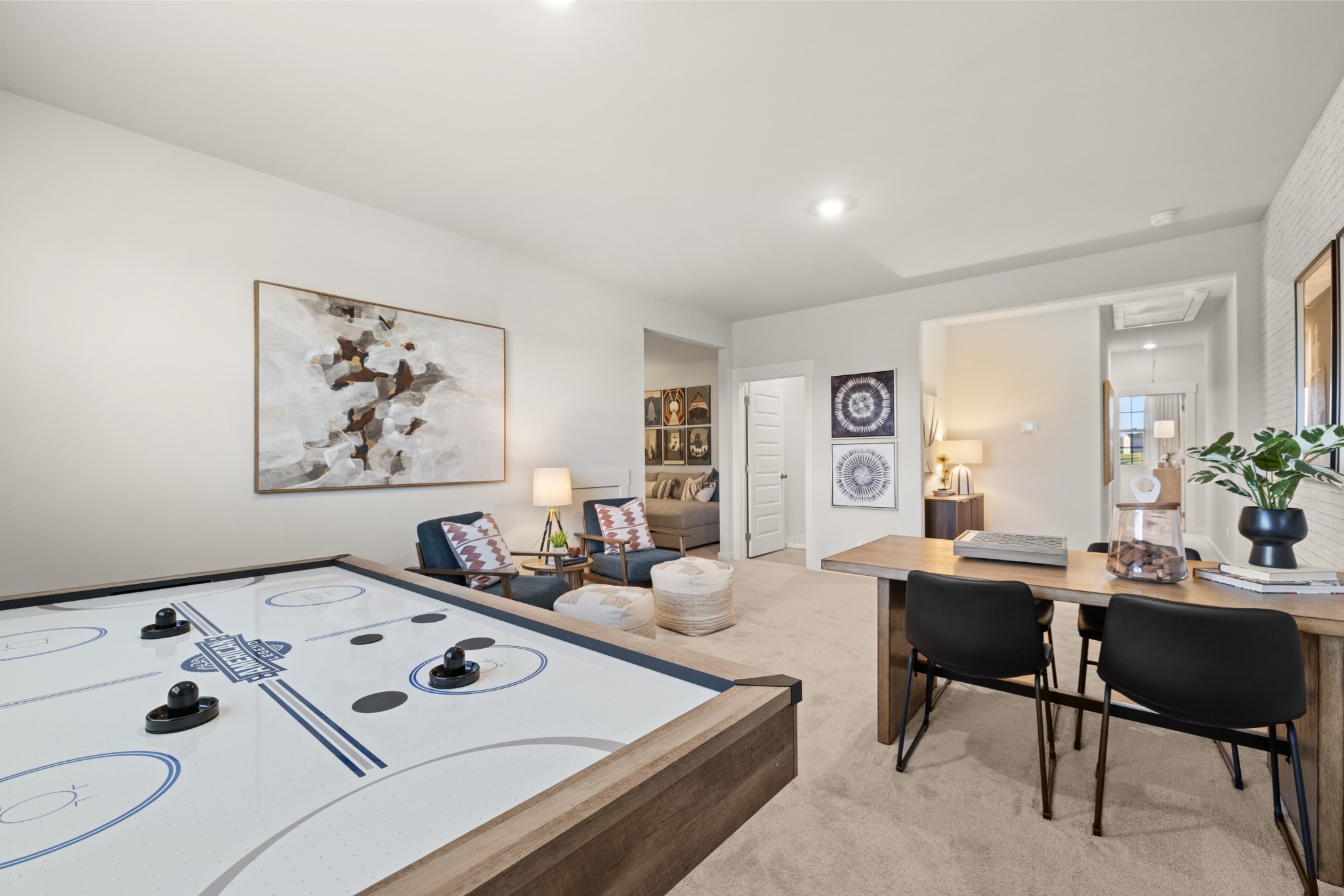 LOT #141 - Alpine Floorplan. The first floor of this two-story home shares an open layout between the kitchen, nook and family room for easy entertaining and access to the patio for outdoor lounging. A more formal dining room is at the front of the home for dinner parties and a study to work from home. Two bedrooms are on the first floor, including a luxe owner's suite and a secondary bedroom, ideal for overnight guests. Upstairs are three secondary bedrooms, a versatile game room and a media room for added living space. *Images from a furnished model of this home. Actual configuration and features may vary.