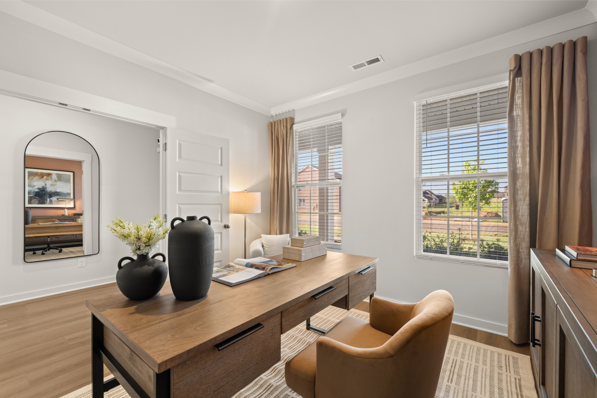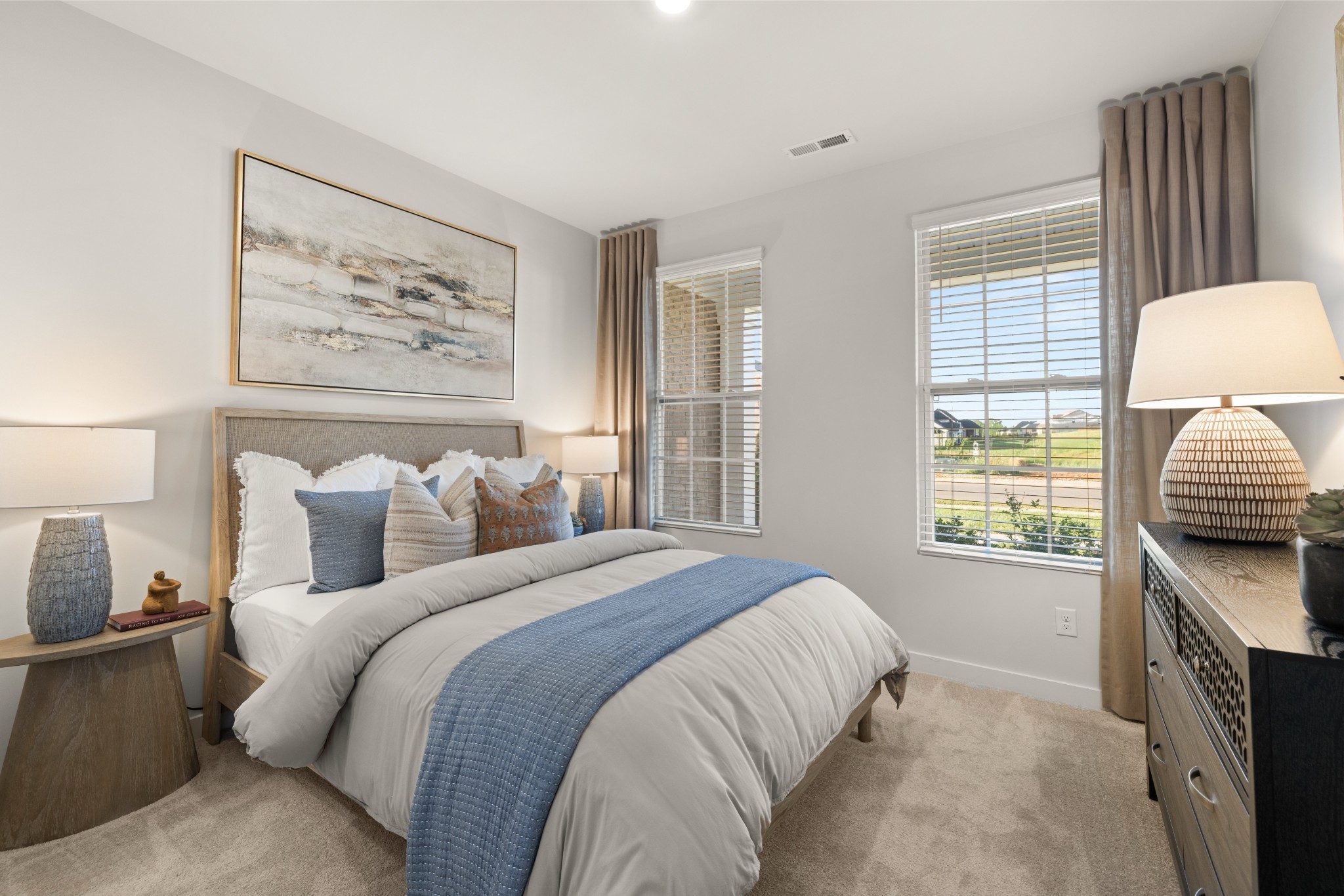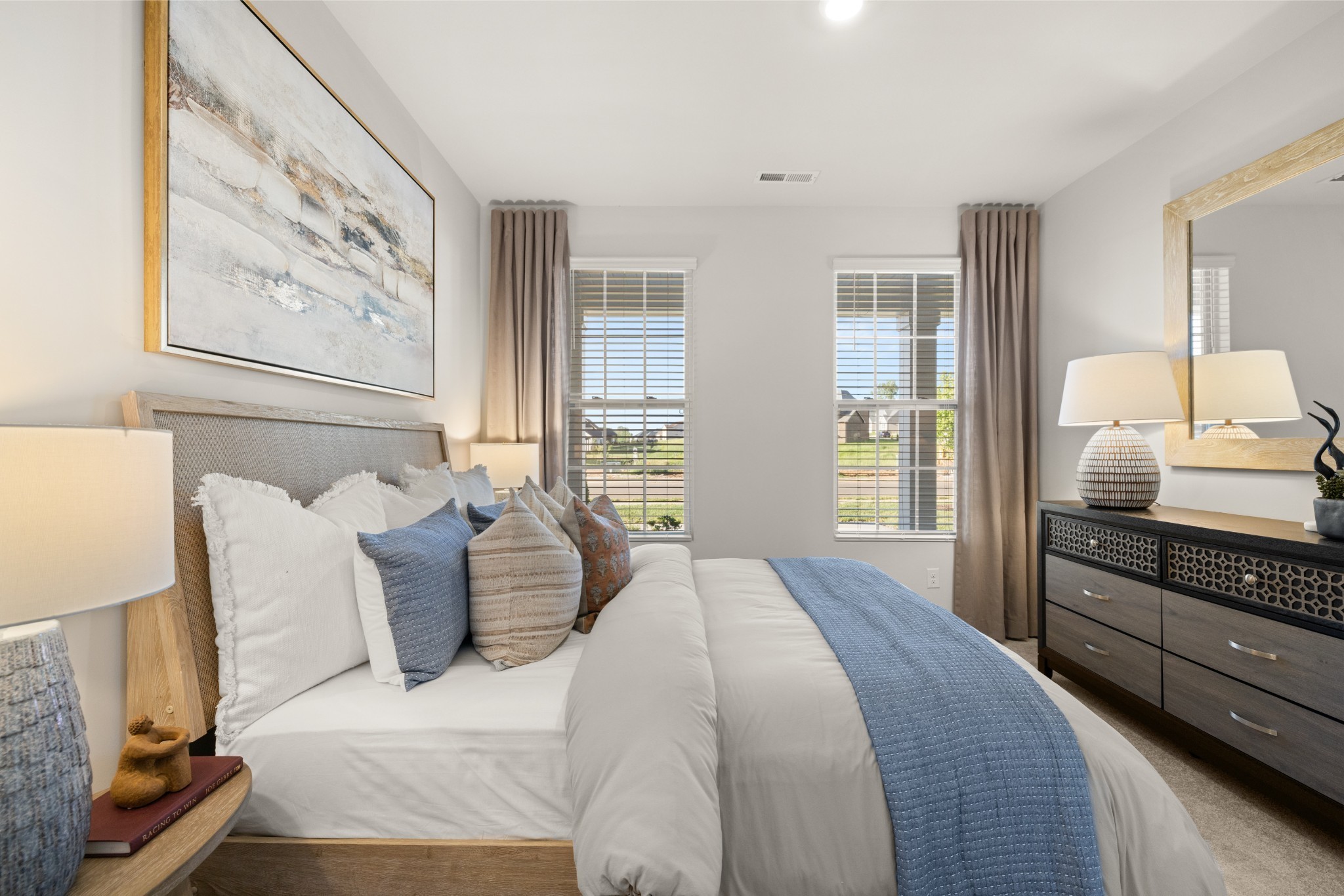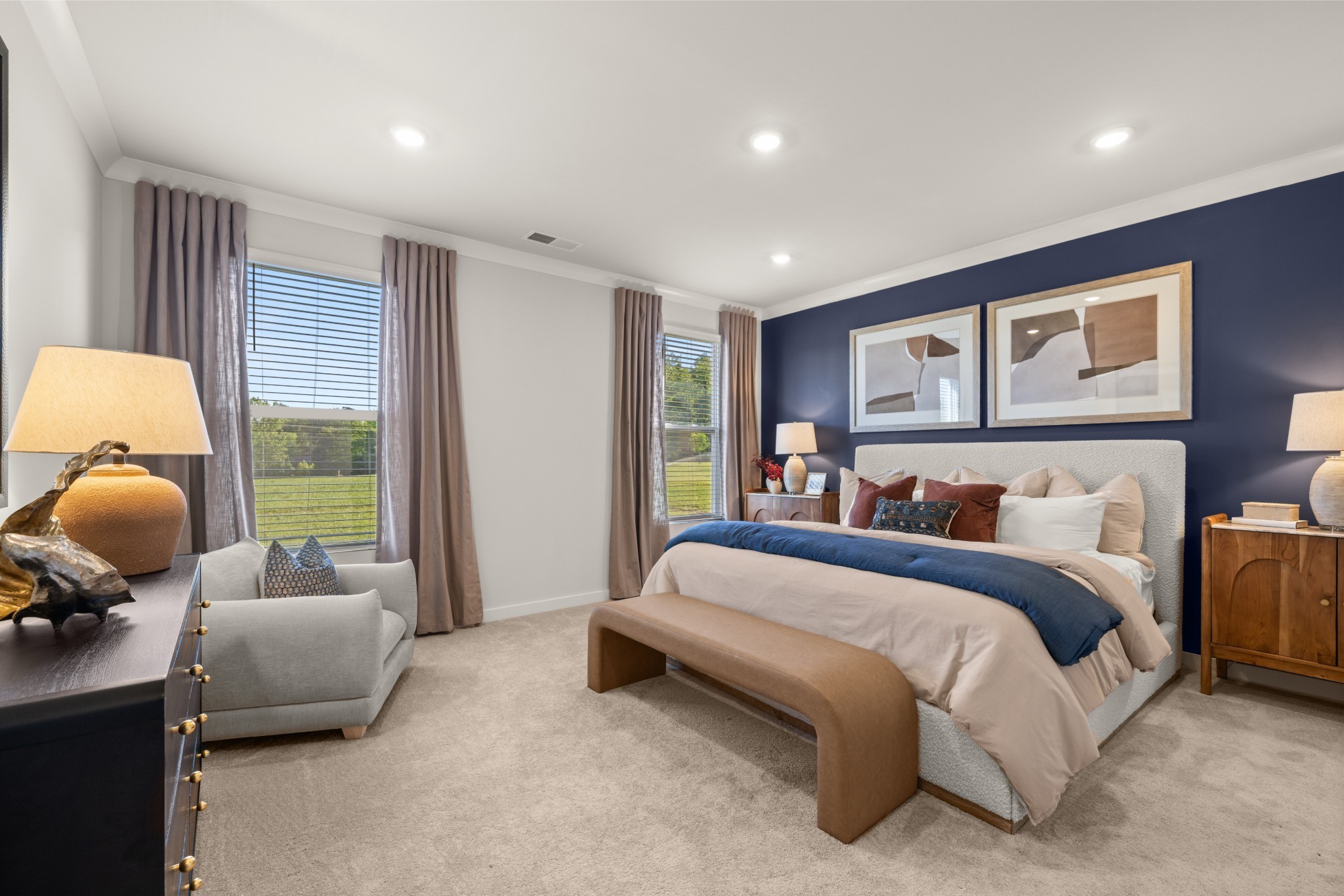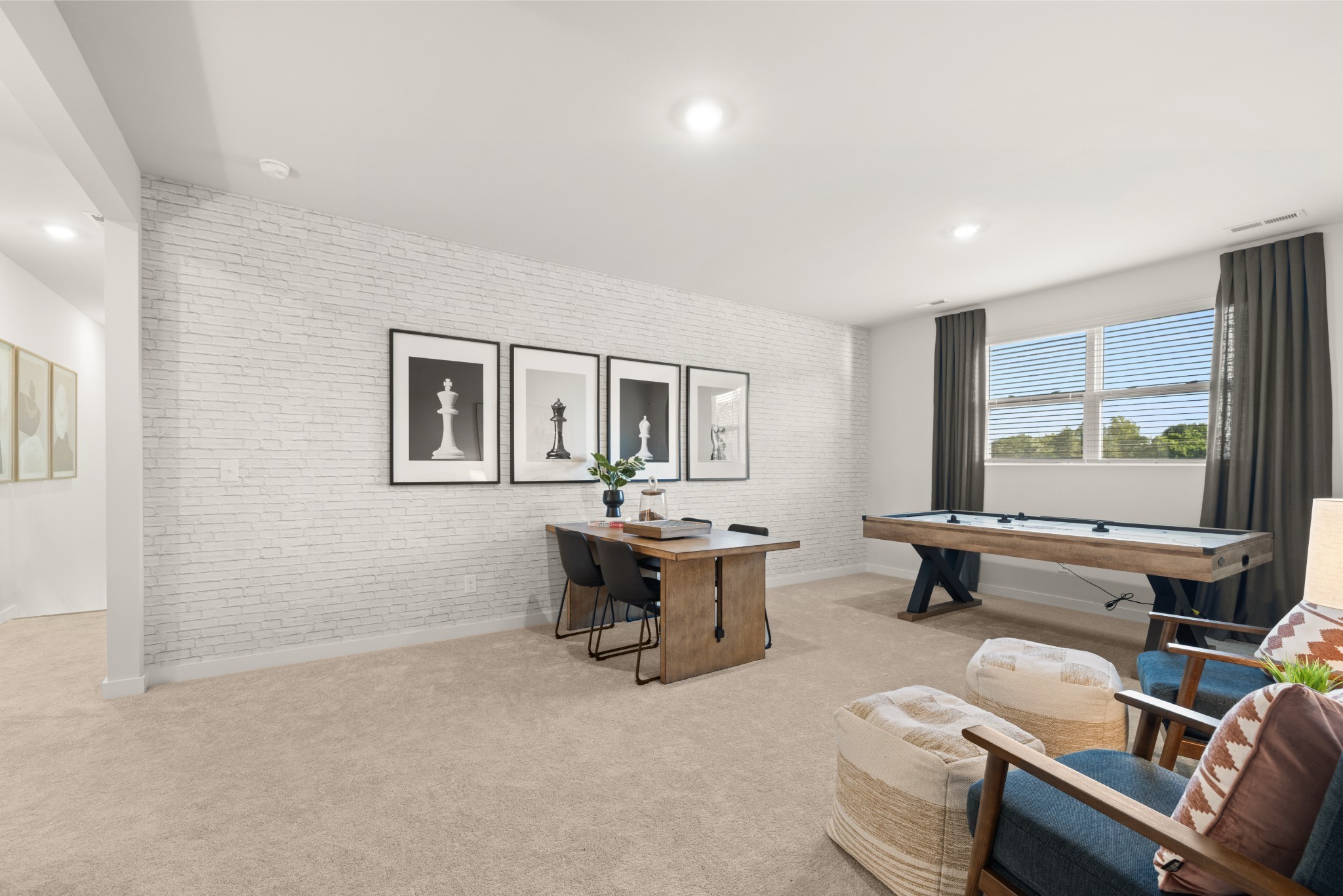 LOT #141 - Alpine Floorplan. The first floor of this two-story home shares an open layout between the kitchen, nook and family room for easy entertaining and access to the patio for outdoor lounging. A more formal dining room is at the front of the home for dinner parties and a study to work from home. Two bedrooms are on the first floor, including a luxe owner's suite and a secondary bedroom, ideal for overnight guests. Upstairs are three secondary bedrooms, a versatile game room and a media room for added living space. *Images from a furnished model of this home. Actual configuration and features may vary.