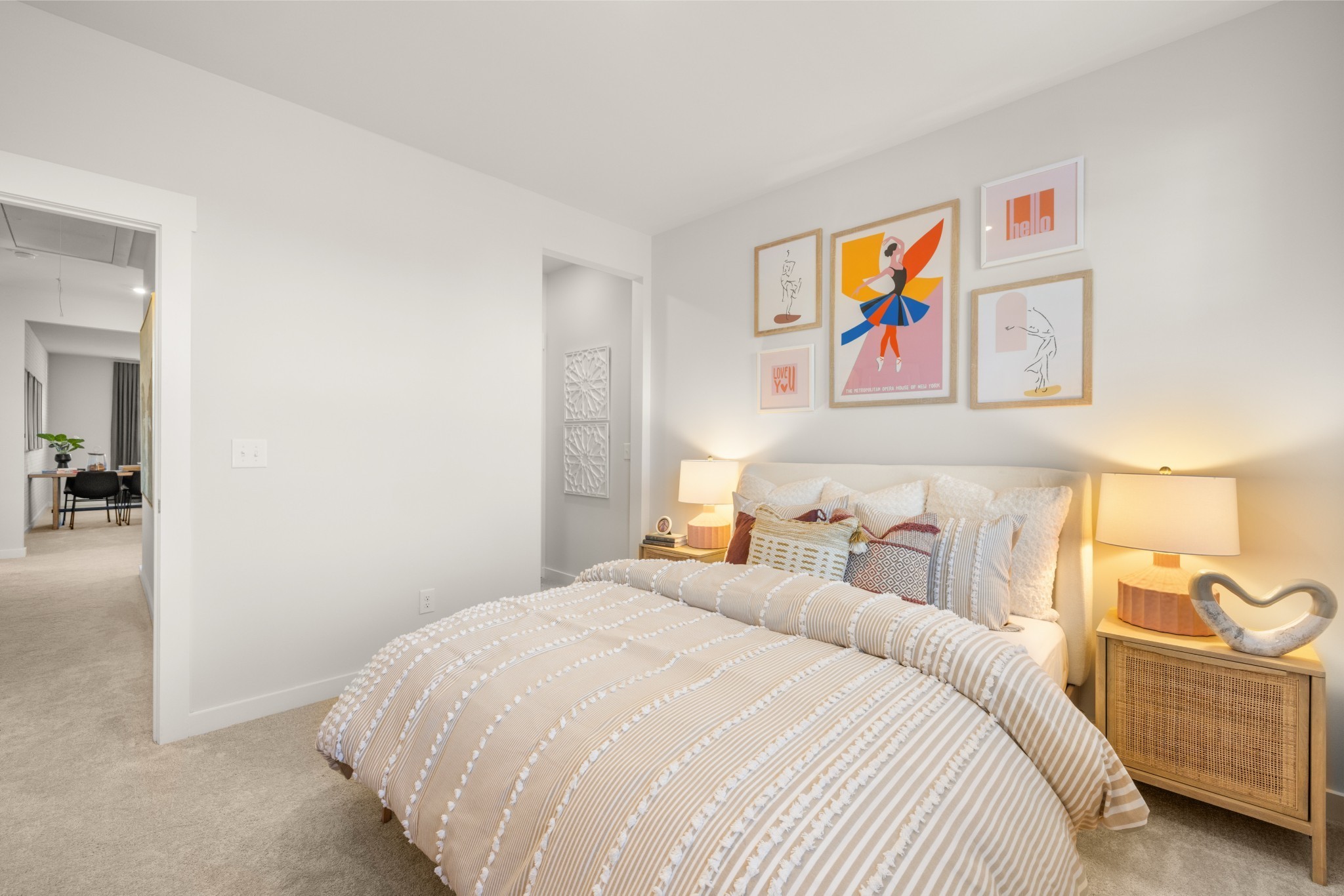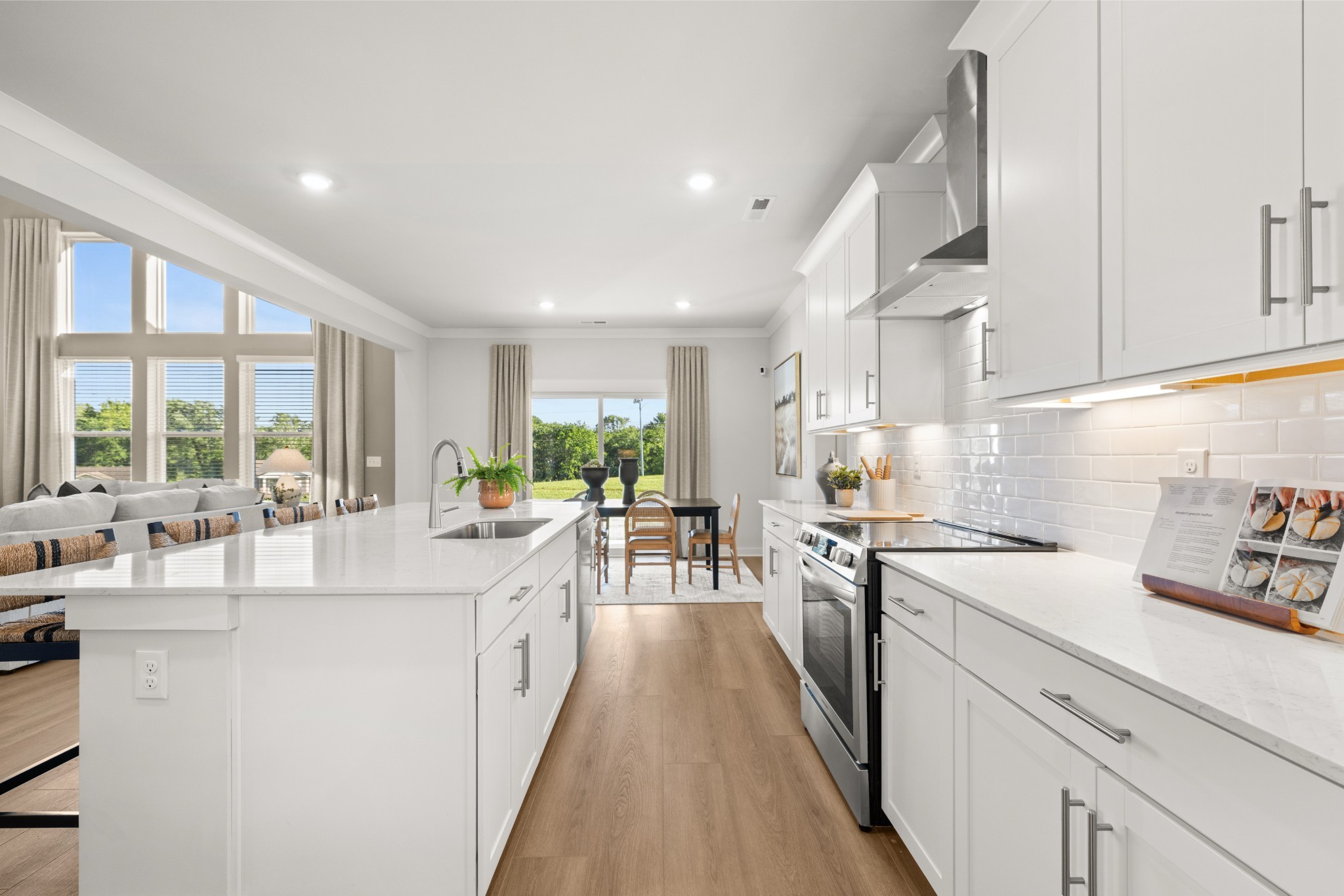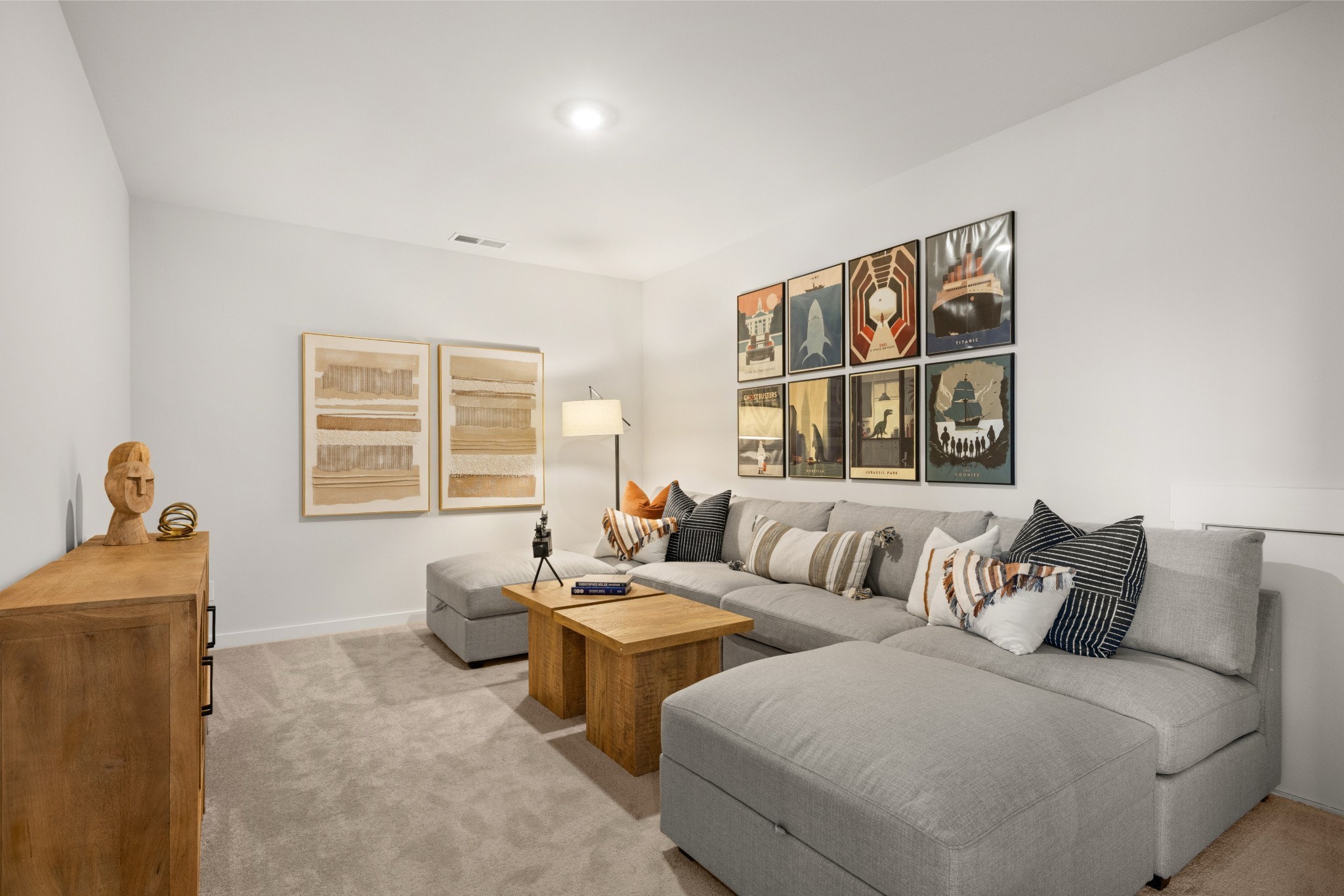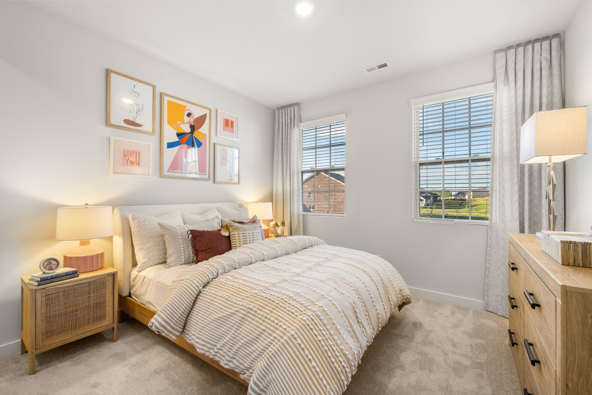 LOT #141 - Alpine Floorplan. The first floor of this two-story home shares an open layout between the kitchen, nook and family room for easy entertaining and access to the patio for outdoor lounging. A more formal dining room is at the front of the home for dinner parties and a study to work from home. Two bedrooms are on the first floor, including a luxe owner's suite and a secondary bedroom, ideal for overnight guests. Upstairs are three secondary bedrooms, a versatile game room and a media room for added living space. *Images from a furnished model of this home. Actual configuration and features may vary.