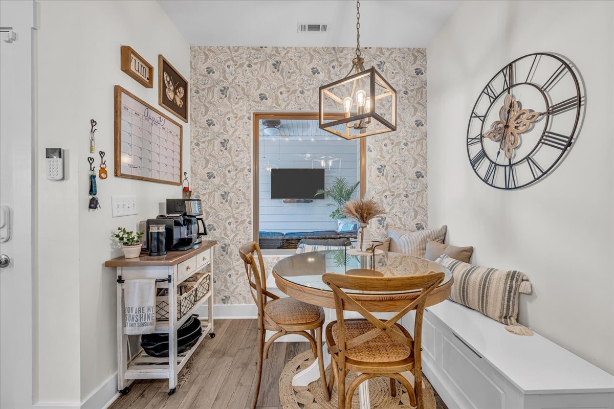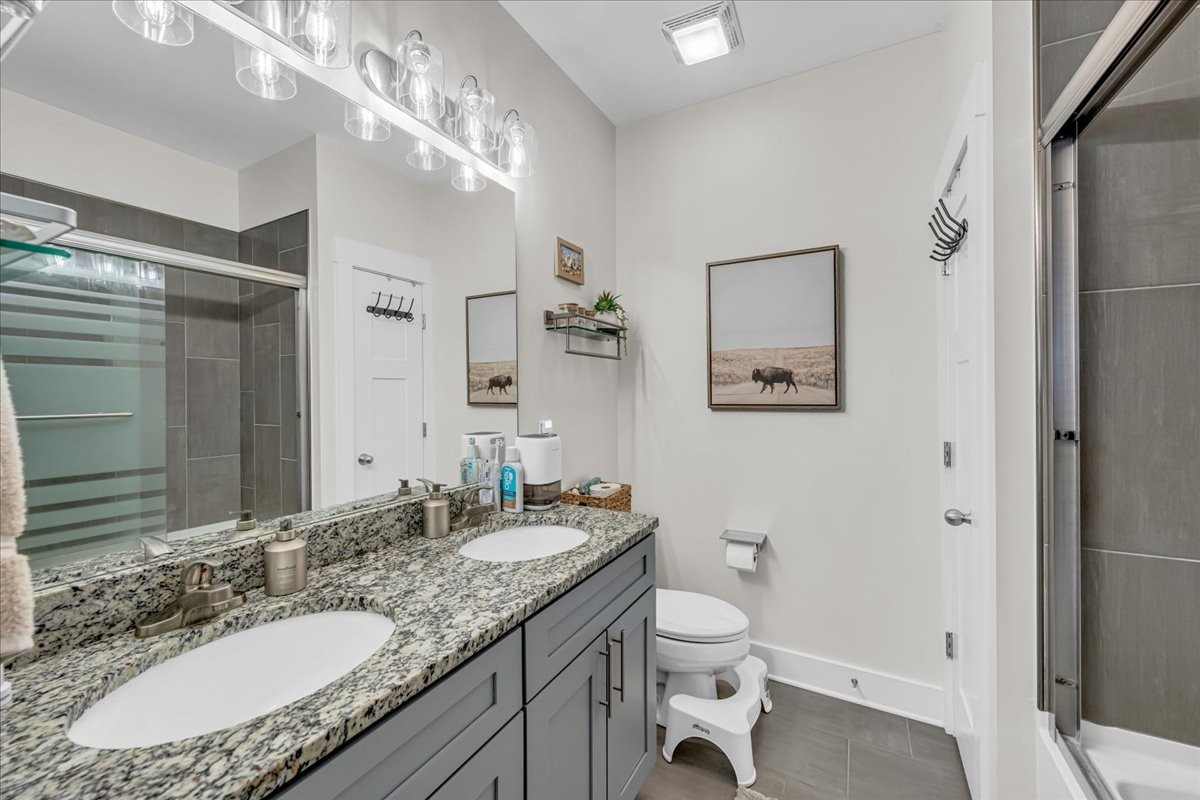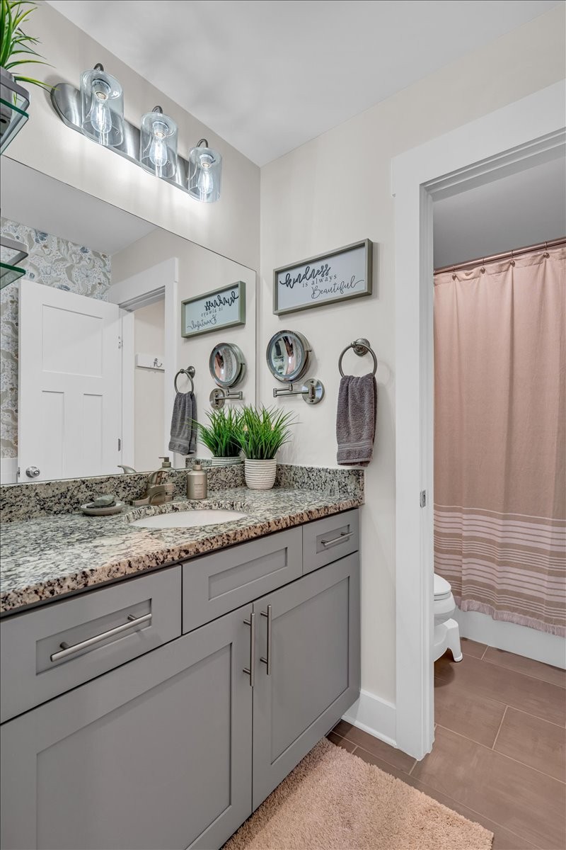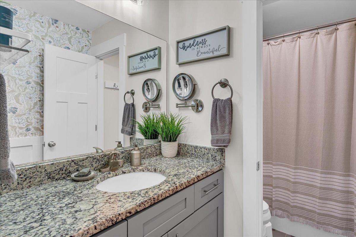 The bathrooms have been beautifully updated with new vanities, fixtures, wainscoting, paneling, and wallpaper, while both the guest and upstairs bathrooms feature stylish barn doors for added character.