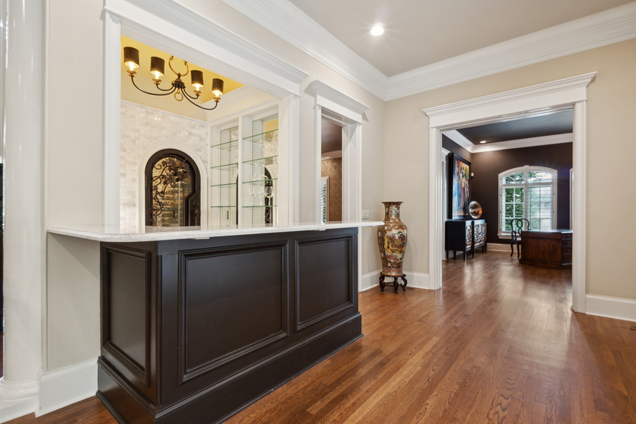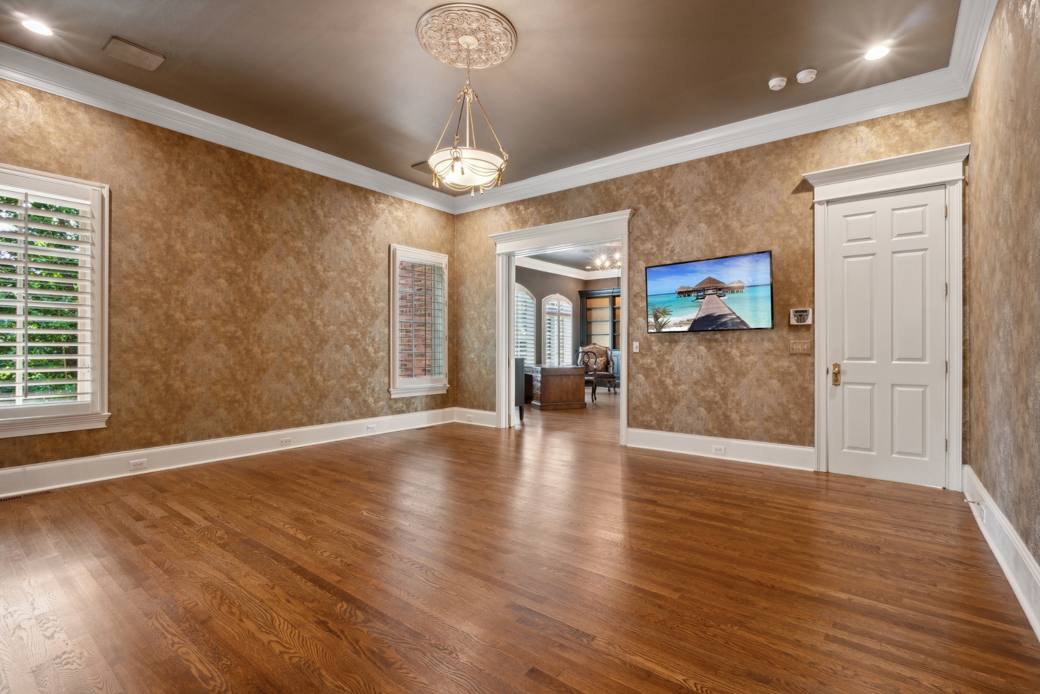 Inside, you’ll find a spacious media room, a large study off the primary suite, a stylish bar with a serving area, and a stunning wine room—perfect for entertaining. The three-car garage includes custom built-ins for added convenience.