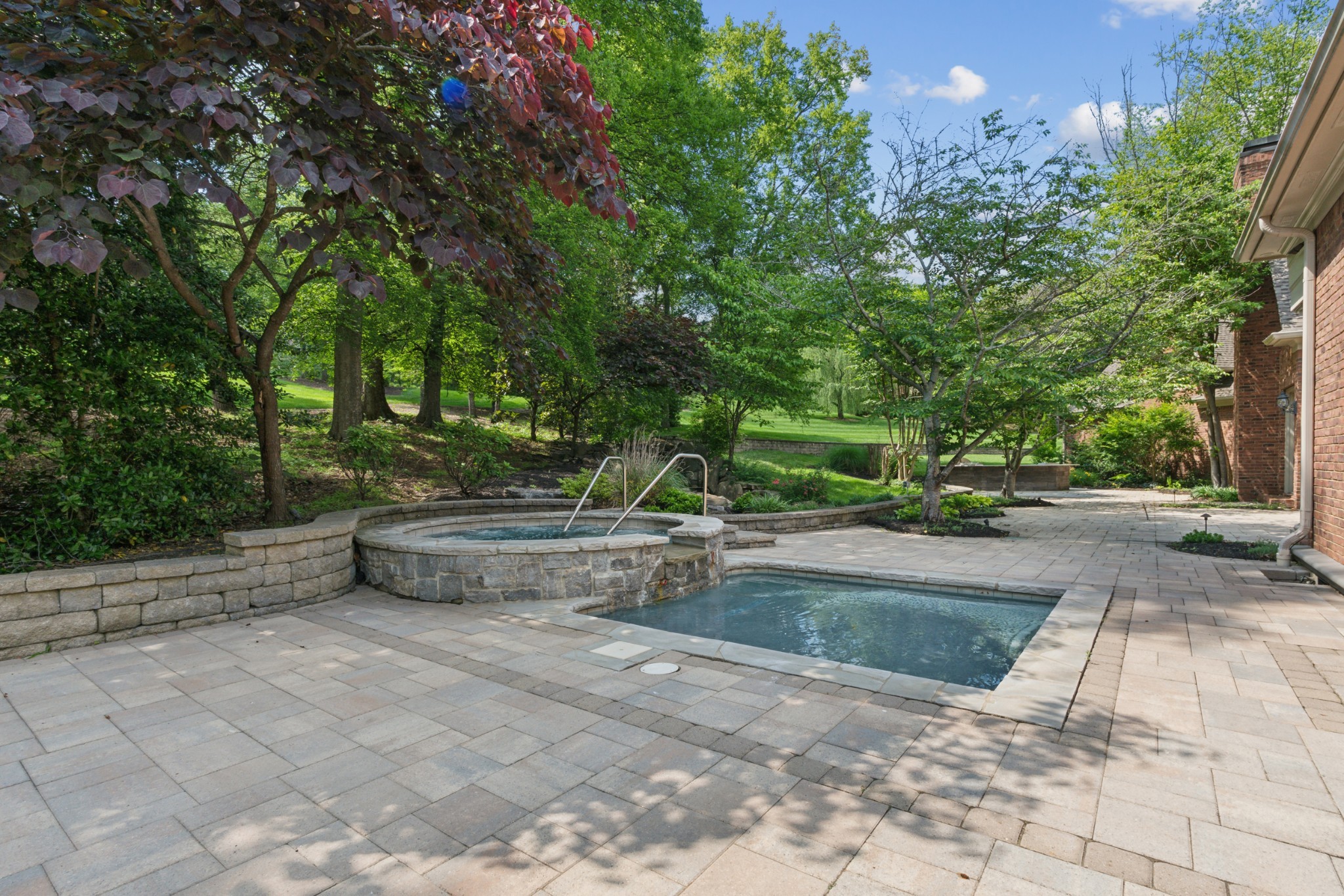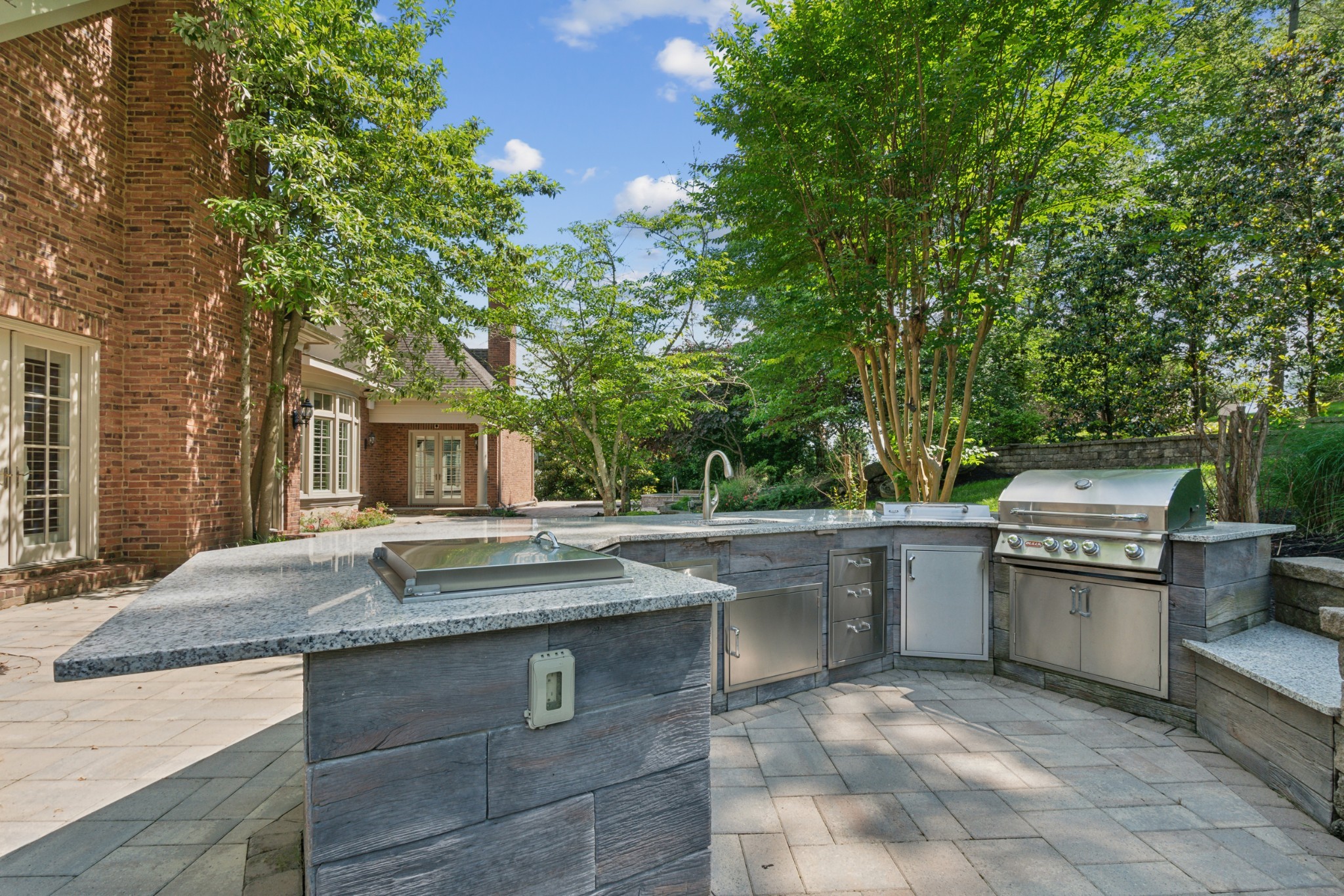 The main-level primary suite offers a private retreat, while three additional bedroom suites upstairs provide ample space for family and guests. A grand two-story entry with a quartz fireplace frames breathtaking views of the backyard oasis, complete with lush trees, a beautiful patio, a hot tub/spa, and a generously equipped outdoor kitchen.