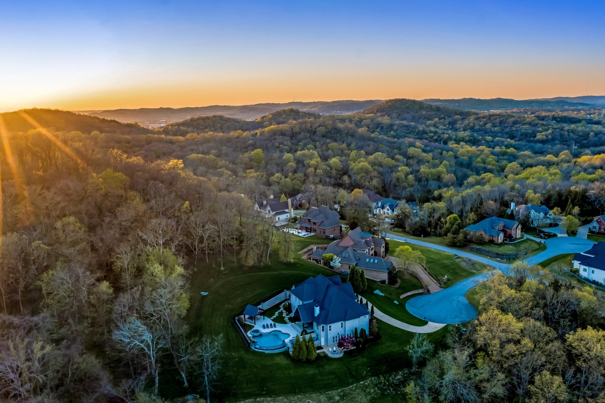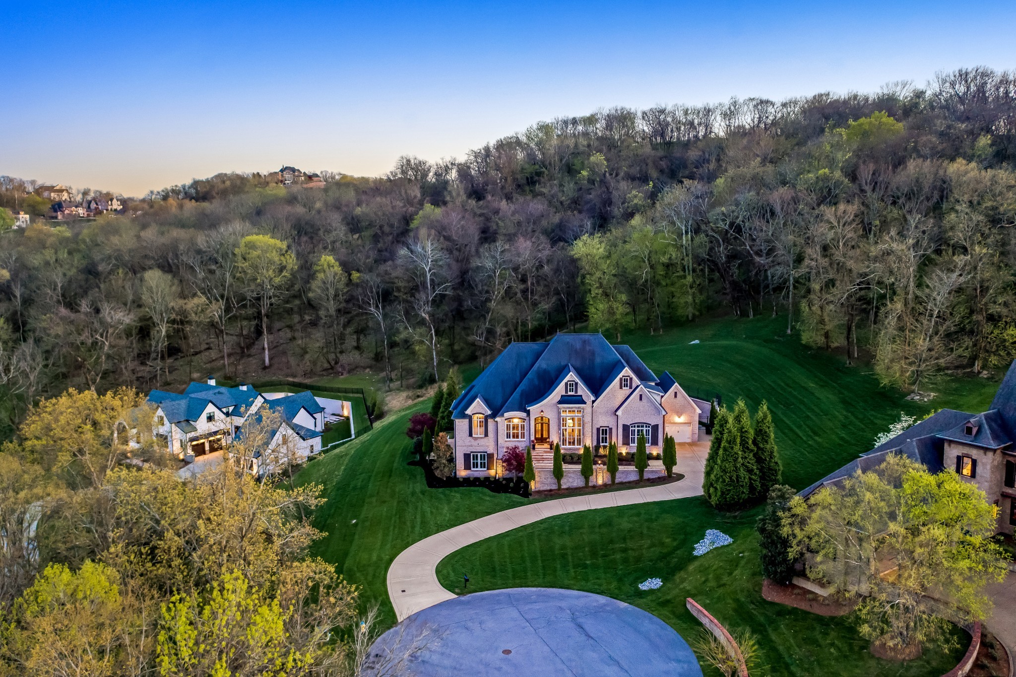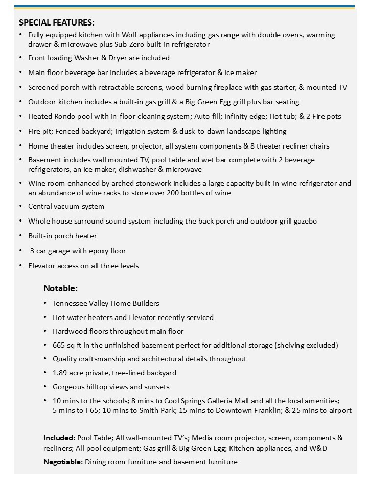 Luxury living at its finest! Welcome to this magnificent 6BR/5.3BA home perched atop a hill in the exclusive gated community of Avalon | Nestled at the end of a 1.89 acre cul-de-sac lot w b/reathtaking views of the TN hills and backing up to a private wooded area, this home affords an abundance of privacy | This thoughtfully curated home truly has it all from an open concept floorplan w/ spacious room sizes, to a secluded resort-style pool & outdoor living vista to a walk-out lower level that includes a media room, FR w/ full wet bar & wine room | Upon entering, the office features a coffered ceiling & a wall of built-in shelving | DR is enhanced by quality mill work & a wall of windows w/ hill views | The expansive GR is highlighted by a flr-to-clg stone gas frplc surrounded by built-ins & accented w/ a wood inlay coffered ceiling | You'll love hosting family & friends in the culinary dream kitchen boasting a huge island w/ farmhouse sink, Wolf appliances including double ovens, gas cooktop, warming drawer & m/w plus a Sub-Zero Frig + a beverage bar & large pantry | Get lost in luxury in the Owner's Suite featuring a sitting room overlooking the pool & hills, and a spa-like bathroom w/ soaking tub, extended separate vanities & two walk-in closets | Main flr en-suite bedroom has direct access to the pool area | Upstairs find en-suite 3BR & 4BR-5BR sharing a jack-n-jill bath plus a large bonus room & loft area | Finished lower level features a family room w/ gas frplc, game room with full wet bar & doors to the fire pit patio, a fully equipped Home Theater, an en-suite 6BR/exercise room, and a wine room with 200+ bottle capacity | The resort-style living continues as you enter the backyard vista featuring a heated Rondo infinity pool & hot tub, outdoor kitchen with gas grill,