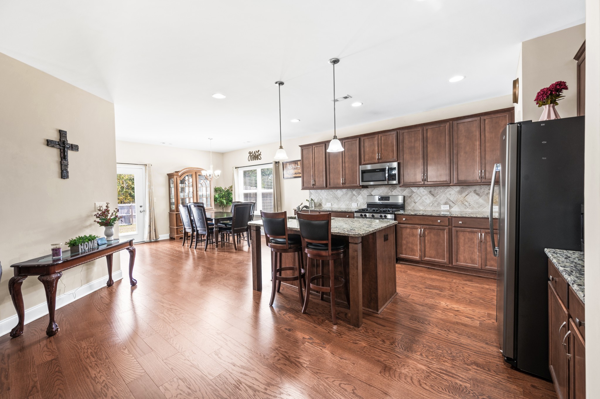 Welcome to 591 Oakvale Ln in Mount Juliet’s desirable Oakvale community! Built in 2020, this home offers nearly 2,400 sq. ft. with 4 bedrooms and 3 baths, including two bedrooms on the main level. The open floor plan features hardwood flooring in formal areas, a gourmet kitchen with granite countertops, a tile backsplash, stainless steel appliances, and a walk-in pantry. The spacious primary suite includes a spa-like bath with dual vanities and a walk-in closet. Enjoy an open patio, fenced backyard, and private wooded views with no rear neighbors. Additional highlights include a 2-car garage, energy-efficient systems, low HOA fees, and neighborhood playground—all within minutes of schools, shopping, and dining.