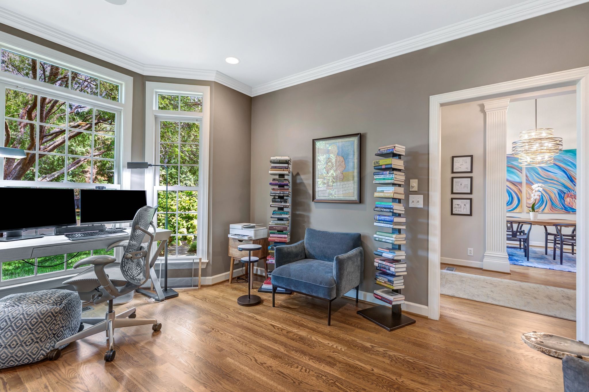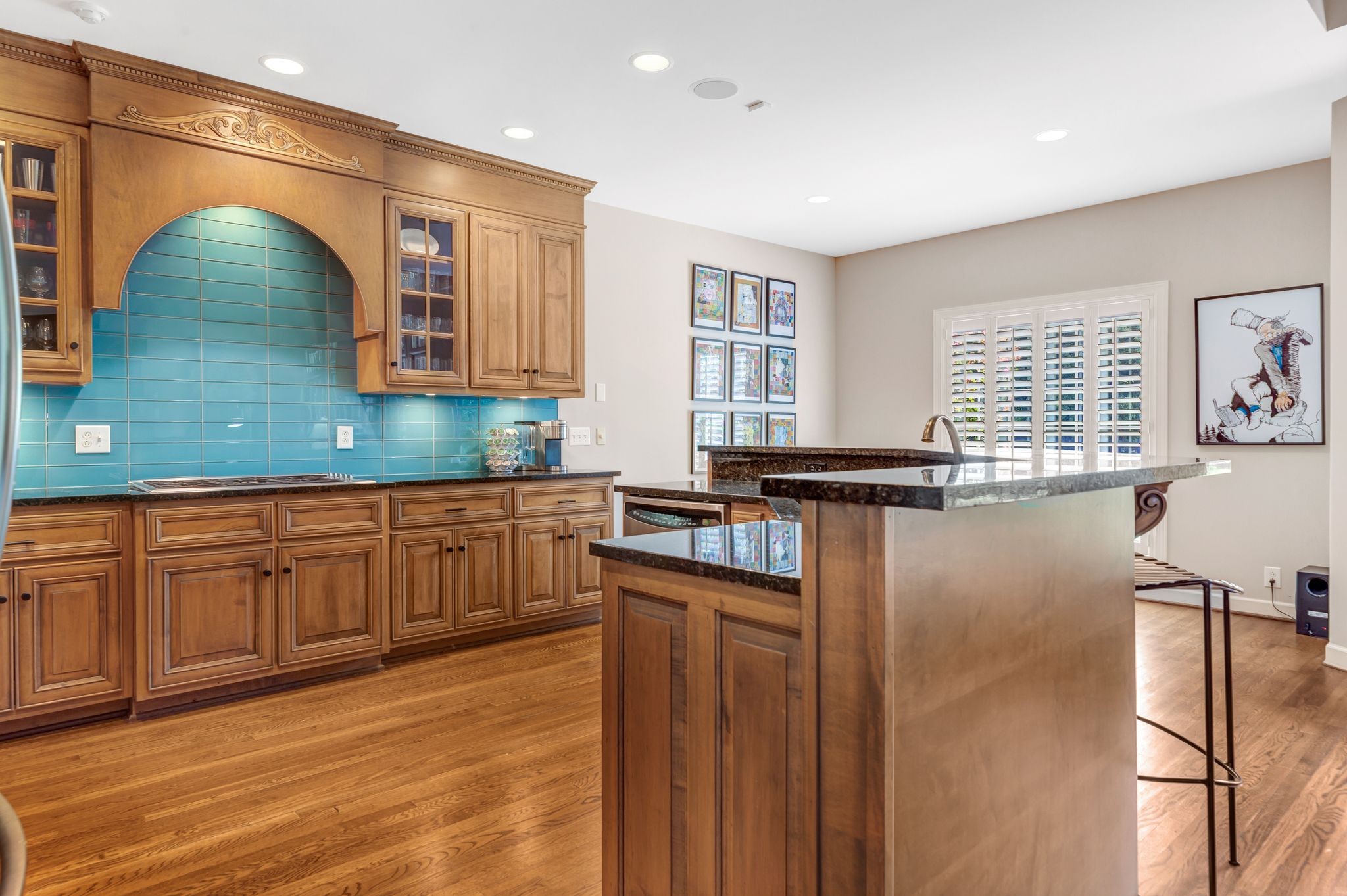 Timeless Charm Meets Modern Luxury. Welcome to this stunning executive home nestled in the highly sought-after Northwoods West neighborhood. From the moment you arrive, you'll be captivated by its classic hand-cast brick and cultured stone entry, setting the tone for timeless elegance throughout. This beautifully designed home features 3 spacious bedrooms on the main level, along with an open-concept living space highlighted by gleaming hardwood floors, a cozy fireplace, and a dedicated home office with custom built-in bookcases—and a 2nd fireplace perfect for work or study. The kitchen is great for any level of cook complete with a gas cooktop, under cabinet lighting, built in oven, ample counter space in a gorgeous black granite and a large pantry—ideal for those who love to cook and entertain. Retreat to the luxurious primary suite, featuring a huge walk-in California closet, air jet soaking tub, separate tile shower, and double vanity—a true spa-like experience.