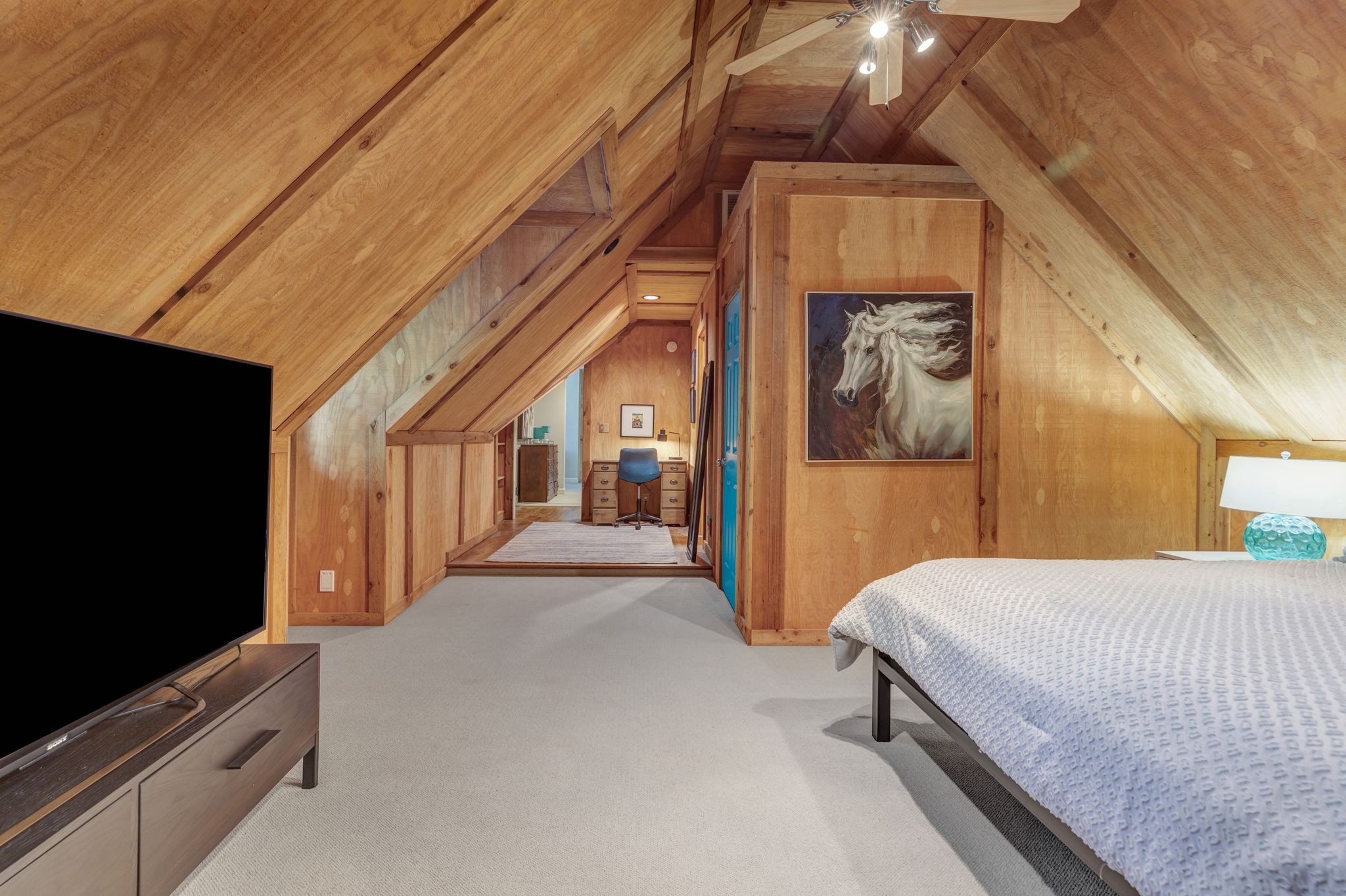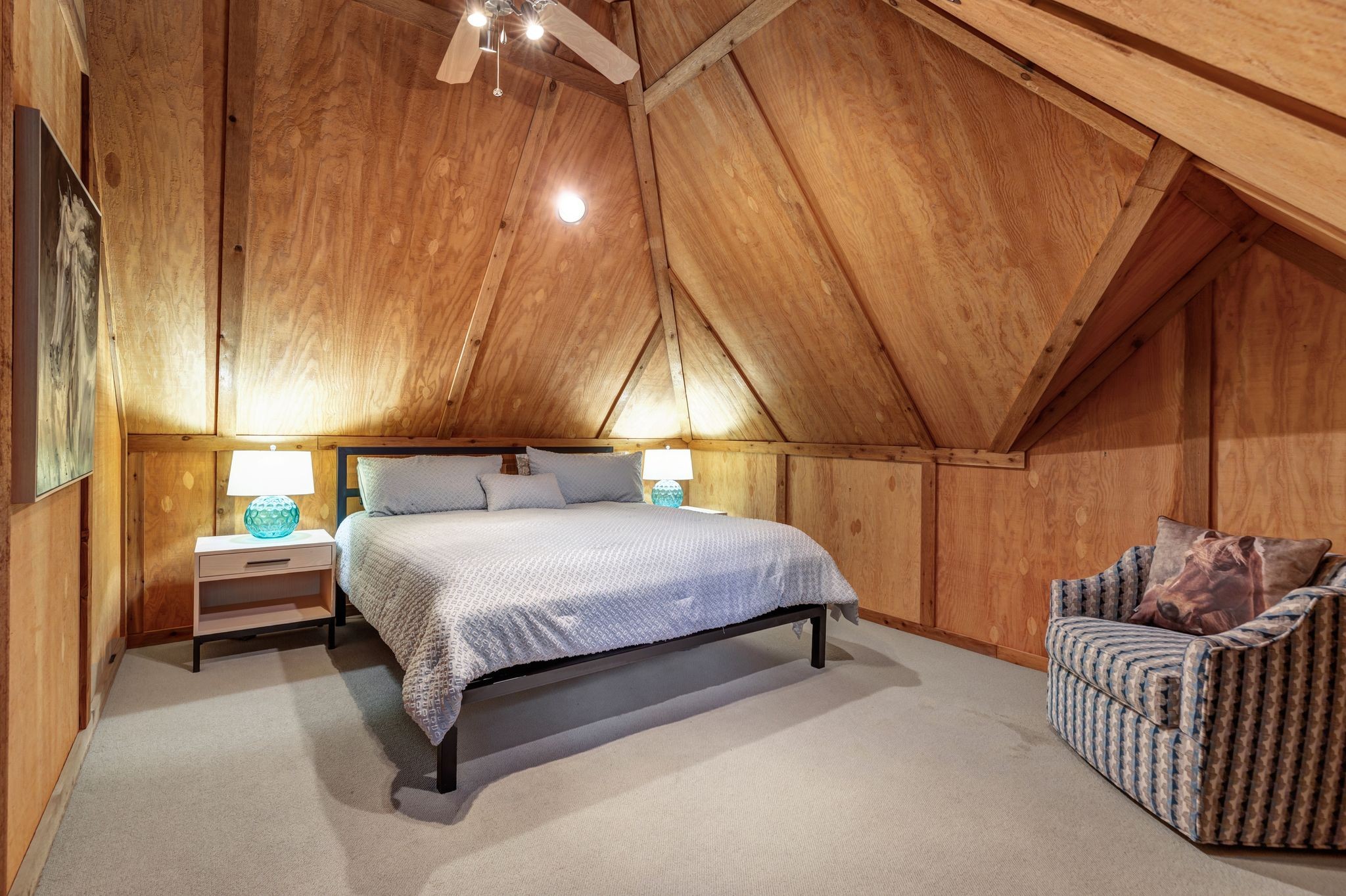 Upstairs, you'll find a charming fourth bedroom that feels like a private cabin getaway, with cedar walls, built-ins, and custom details perfect for guests or any horse lover’s dream retreat. A bonus room offering plenty of space for whatever flex space you need!
