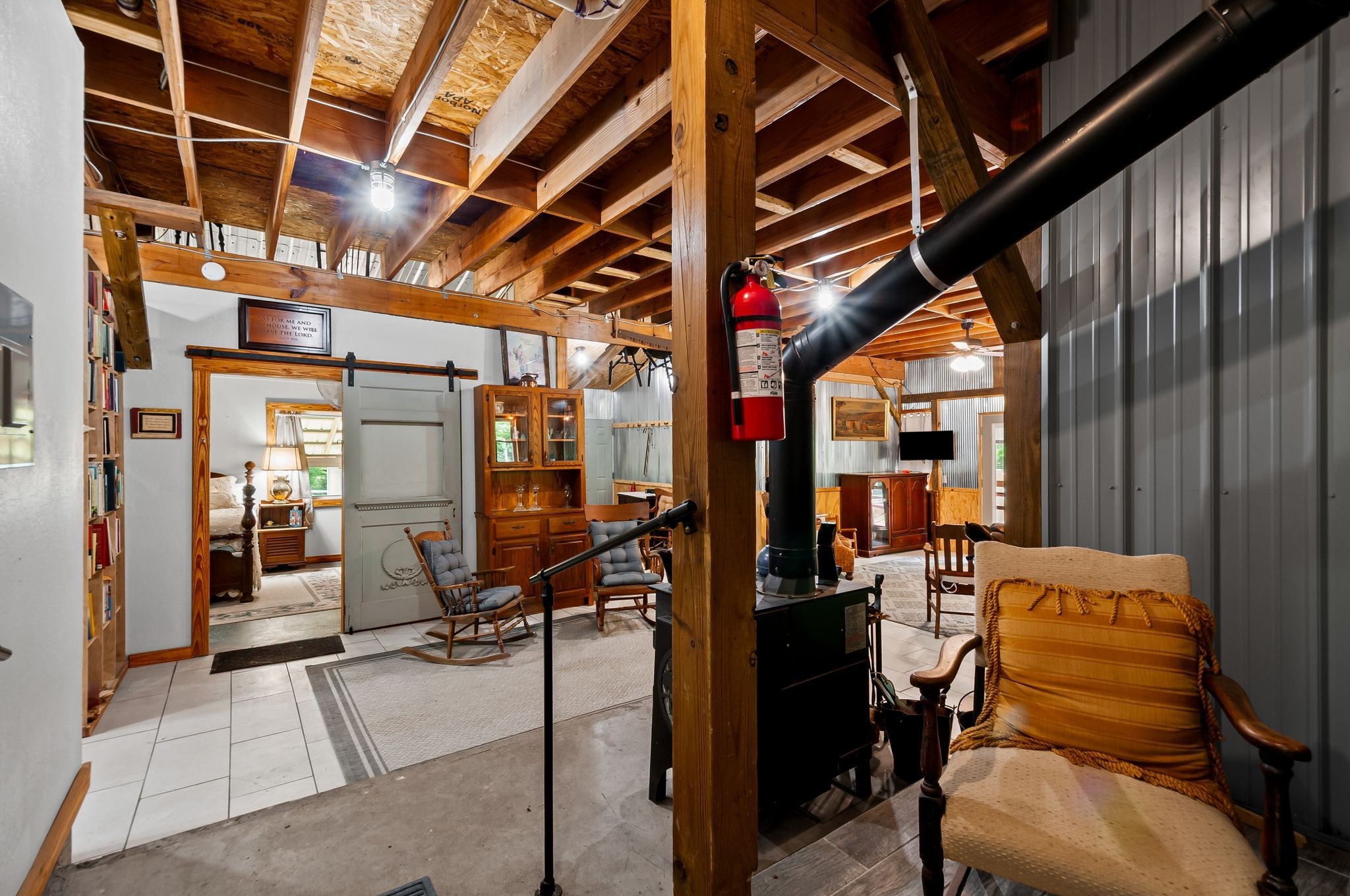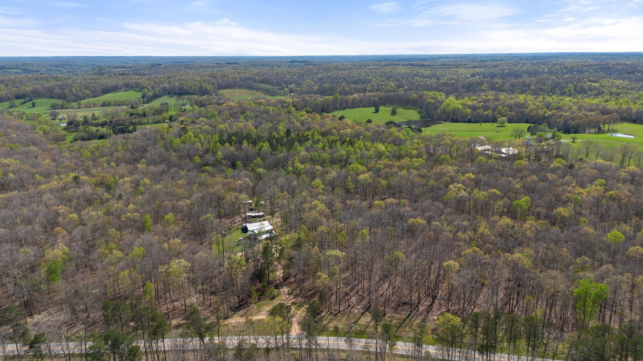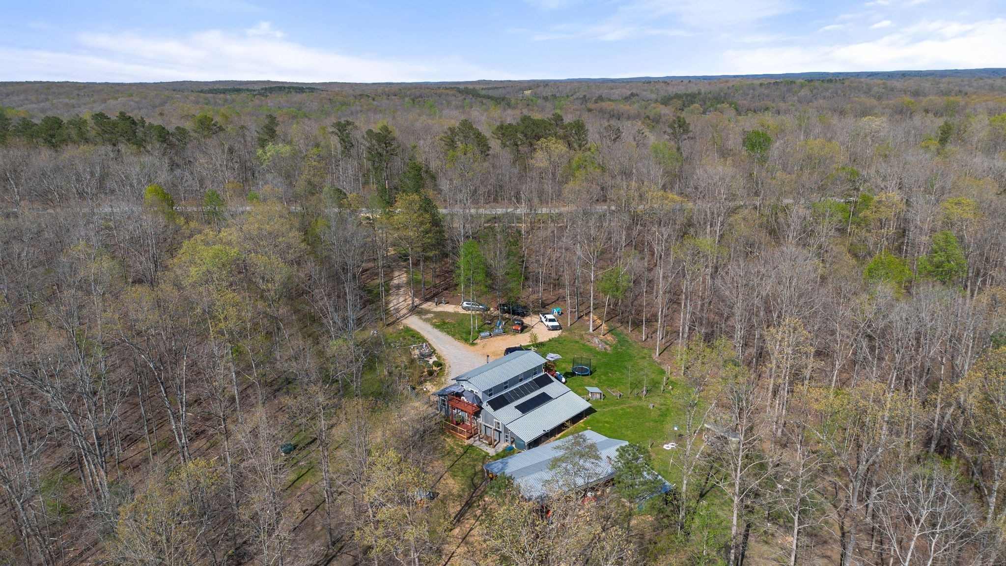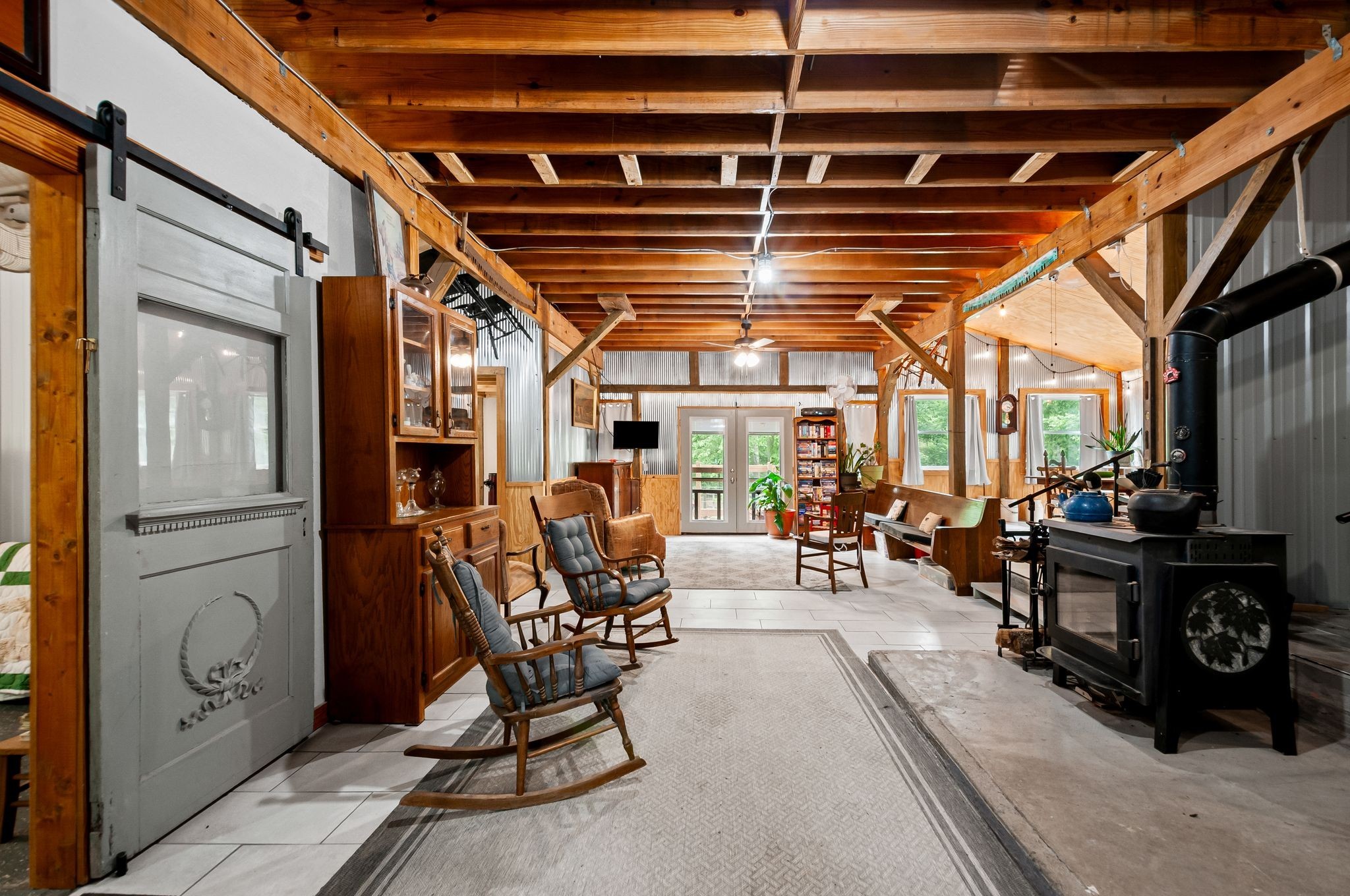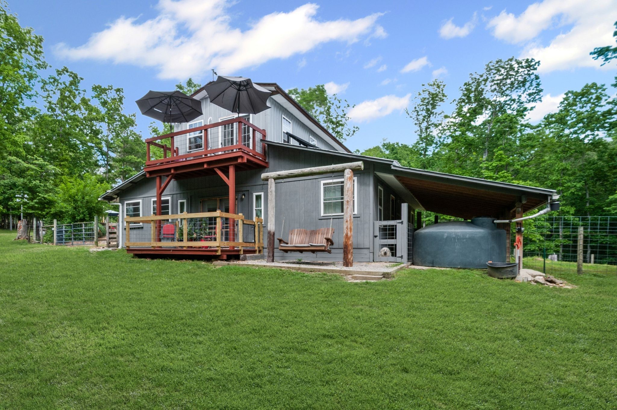 Unwind on your own 12+/- acre homestead in the rolling forest of Southwestern Middle Tennessee, just an hour from Franklin and Nashville on State Hwy 230 providing easy access to I-40. This delightful 2-bedroom, 2-bath modern barn seamlessly blends off-grid living with contemporary comforts. Embrace sustainability with solar power (with easy ability to tie into the power grid) and a 1,500-gallon rainwater collection system, allowing you to choose between city water and rainwater for you and your livestock. A gorgeous 1/3-acre pond sits in the valley below the home, providing additional opportunities for livestock and wildlife watering. Inside, the home boasts a soapstone wood-burning stove on the main floor, creating heat for both the first and second. Fully fenced and cross fenced with woven wire, ideal for privacy and livestock control.