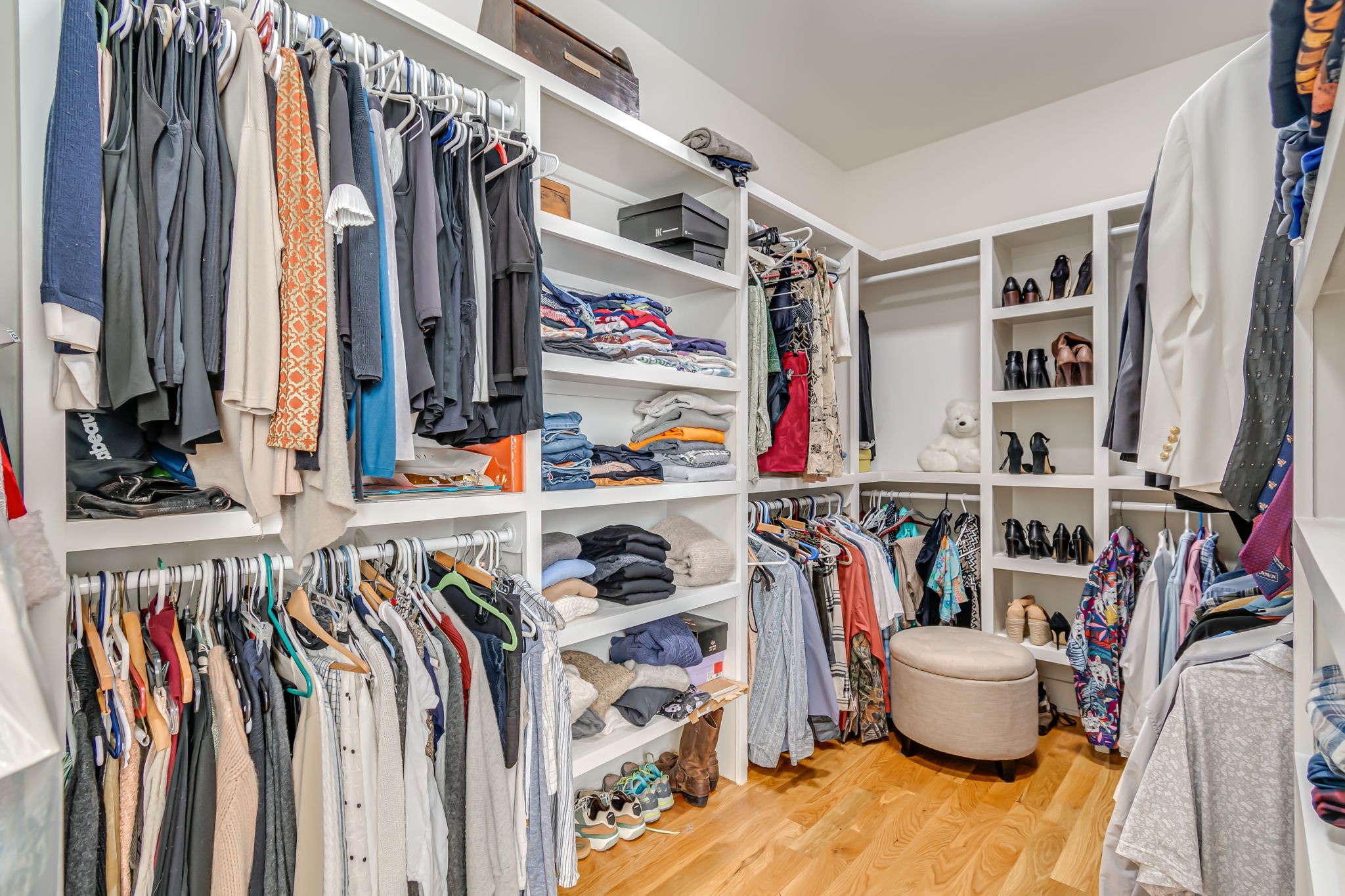 spa-shower with multiple faucets. The Primary Closet is set up for organization with multiple shelves, and multiple hanging options.