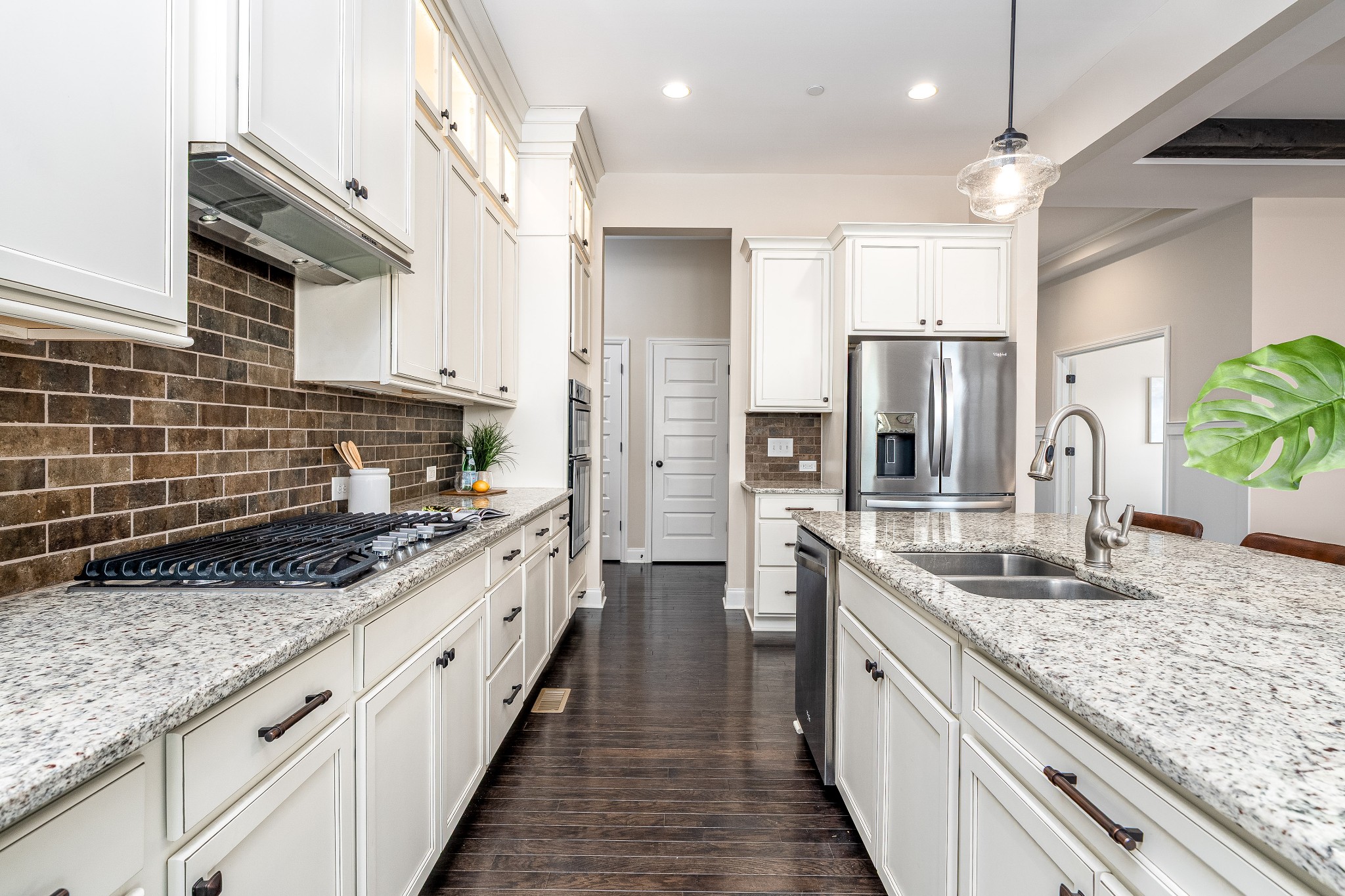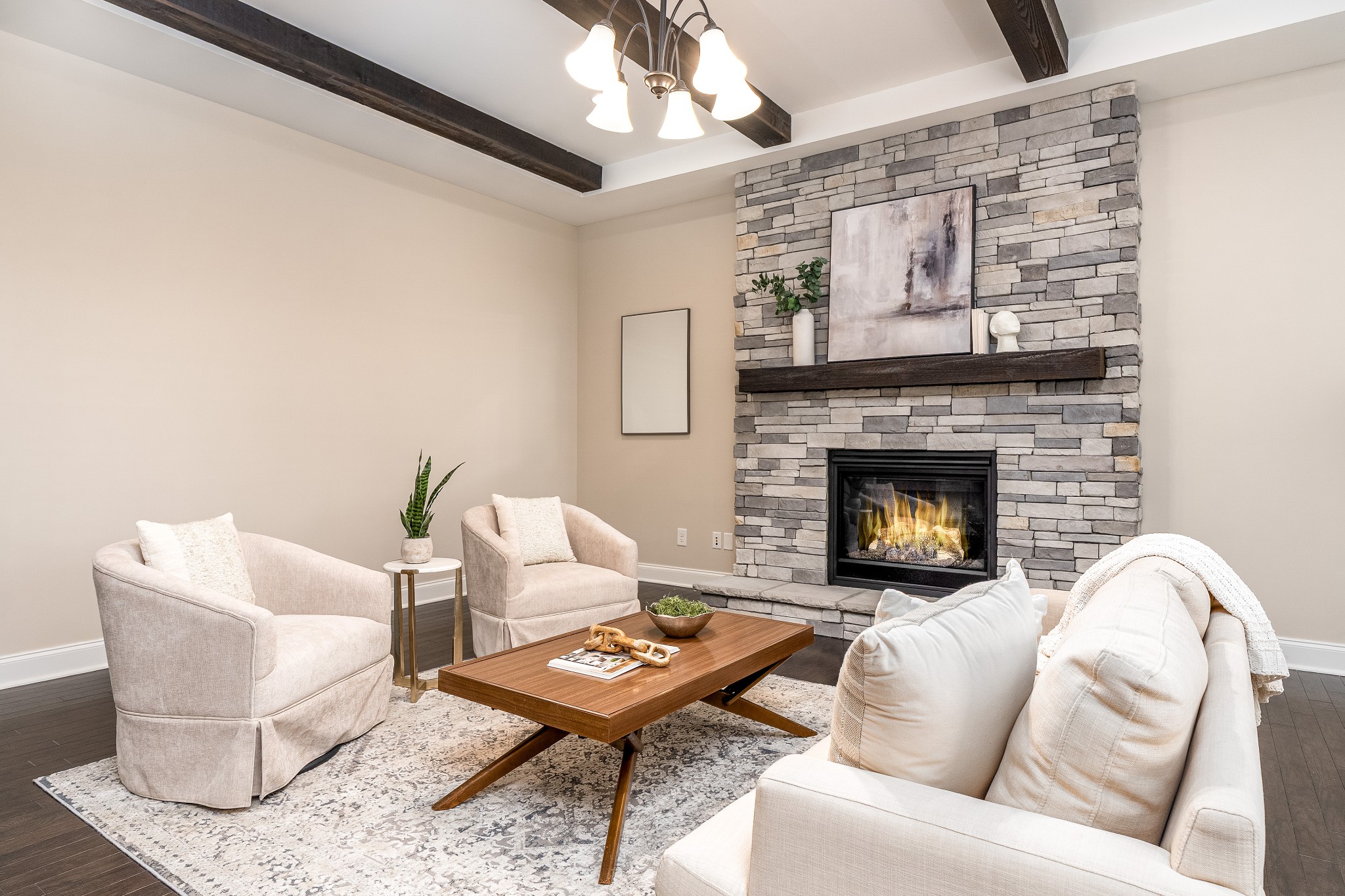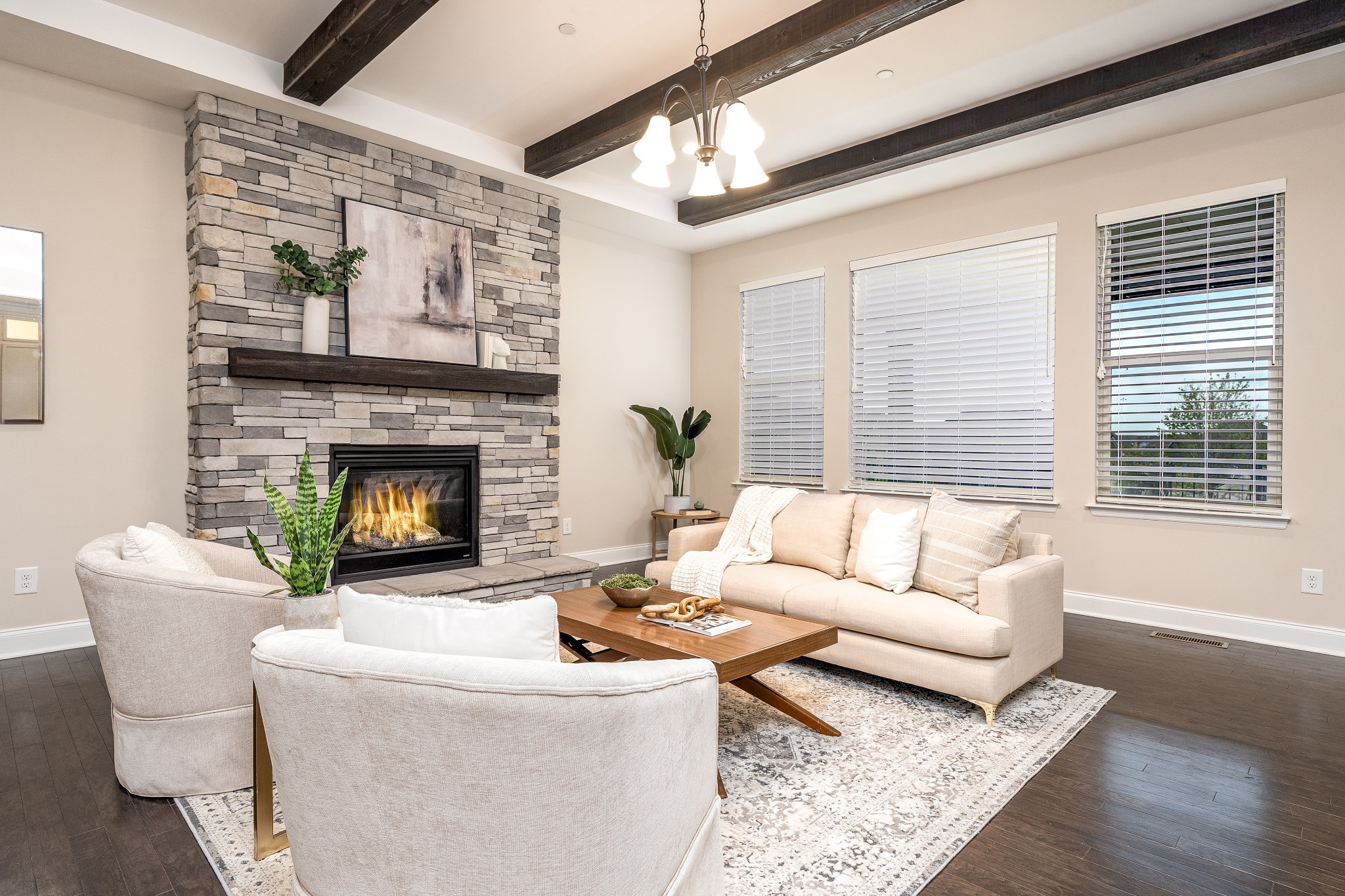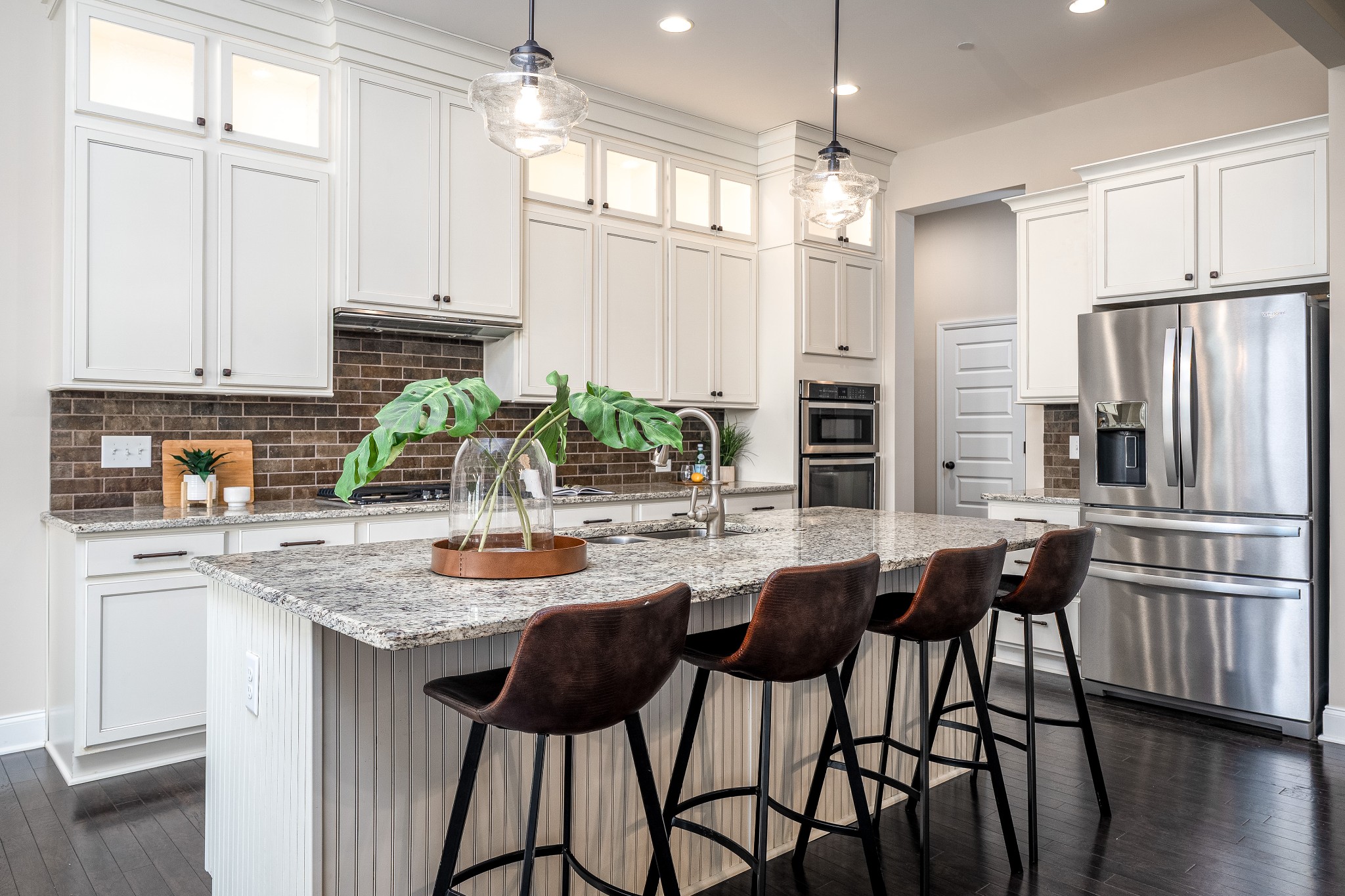 The open living room, anchored by a stone gas fireplace, connects seamlessly to the kitchen and dining area. Design details include accent walls, ceiling beams, and custom pantry shelving. The chef’s kitchen offers granite countertops, a large island with barstool seating, glass-front ceiling-height display cabinets, and stainless steel appliances—including a built-in oven, microwave, gas cooktop, and refrigerator. The main level features a private primary suite with a spa-like bath, a secondary bedroom with ensuite, and a dedicated study framed by French doors. Upstairs offers a spacious bonus room, a versatile media/play/flex area with attached climate-controlled storage, plus two additional bedrooms, one with a private bath and the other with access to a separate full bath.