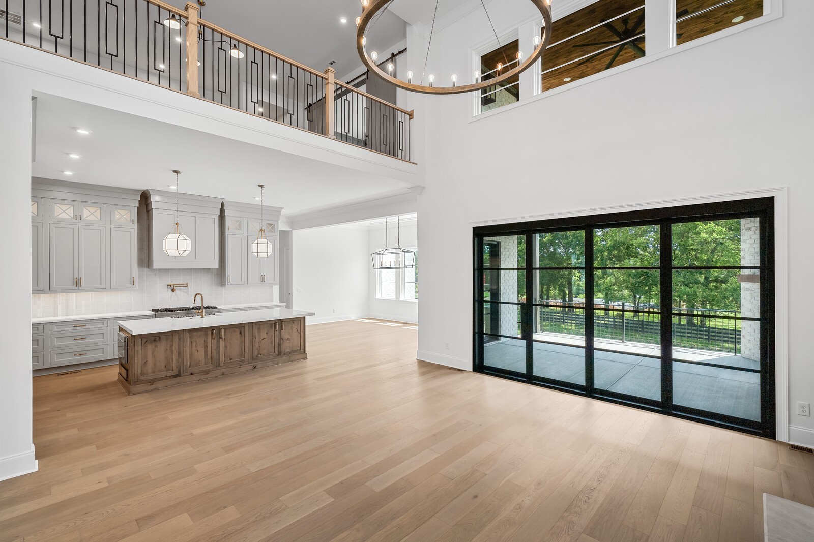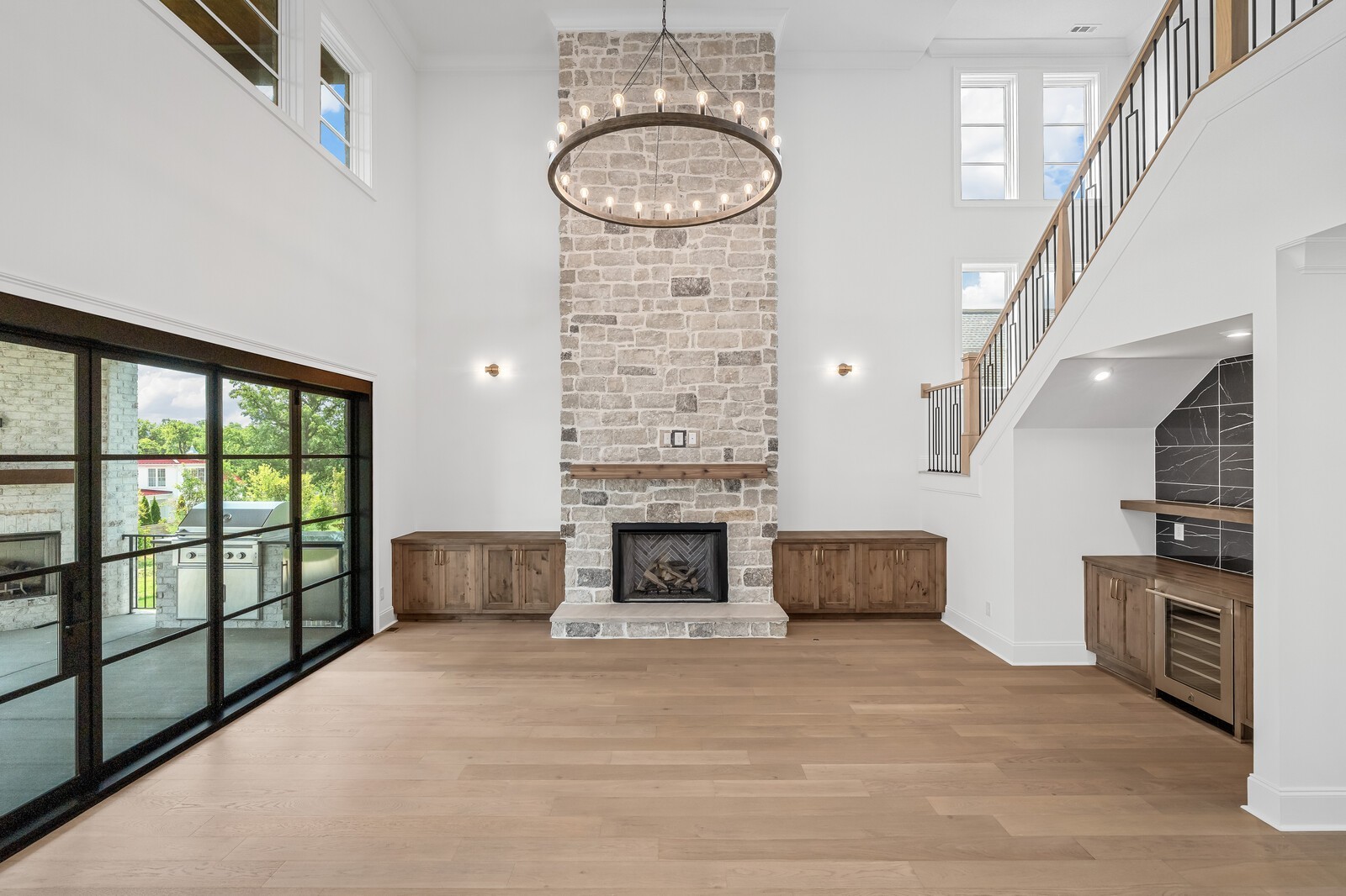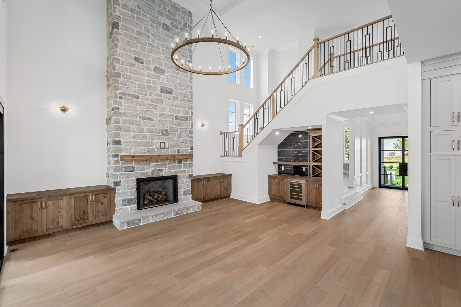 As you enter, you’re greeted by an expansive family room with soaring volume ceilings and elegant custom built-ins, creating a warm yet sophisticated gathering space. The open-concept layout connects seamlessly to a gourmet kitchen with designer appliances and upscale finishes—ideal for entertaining or everyday living.