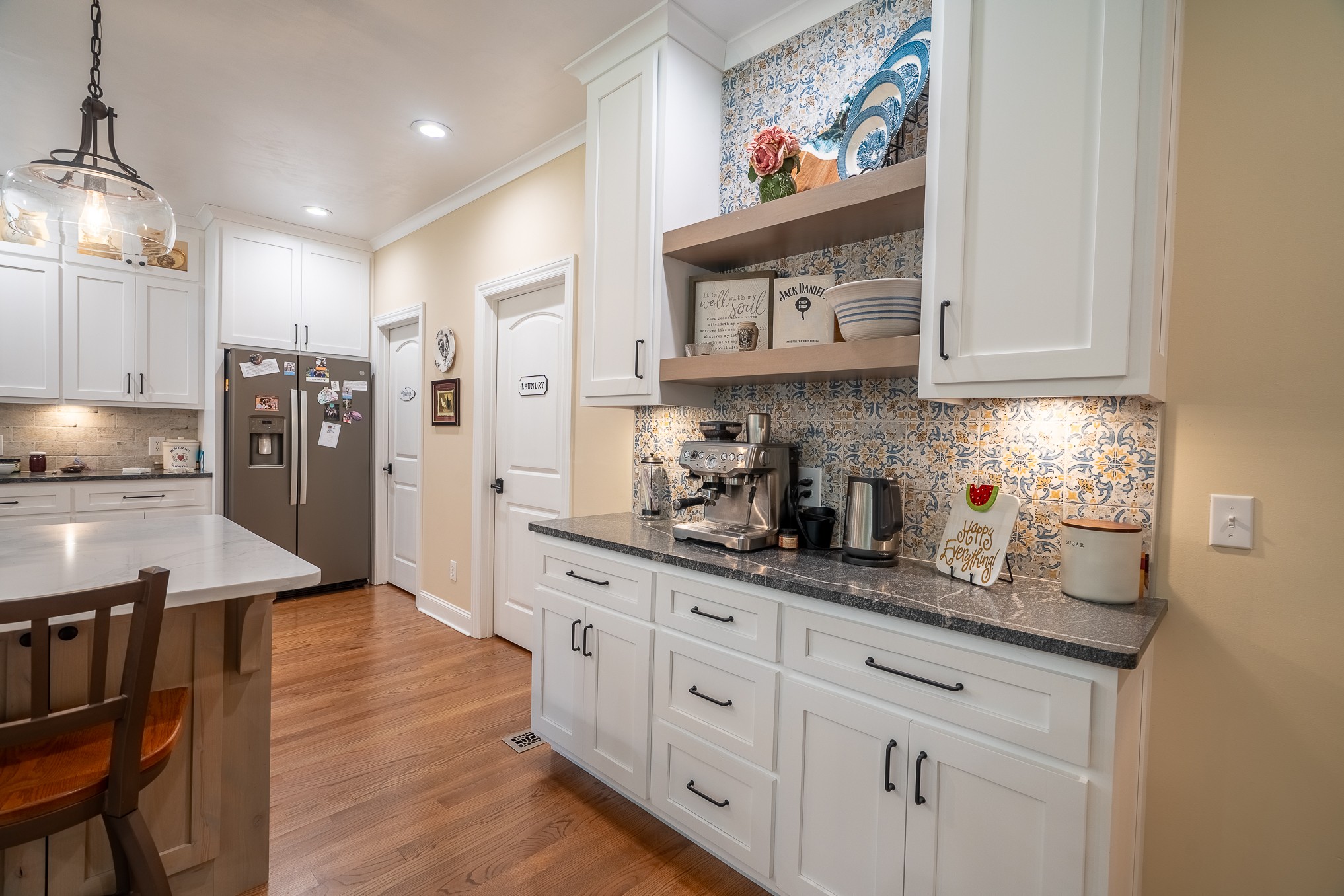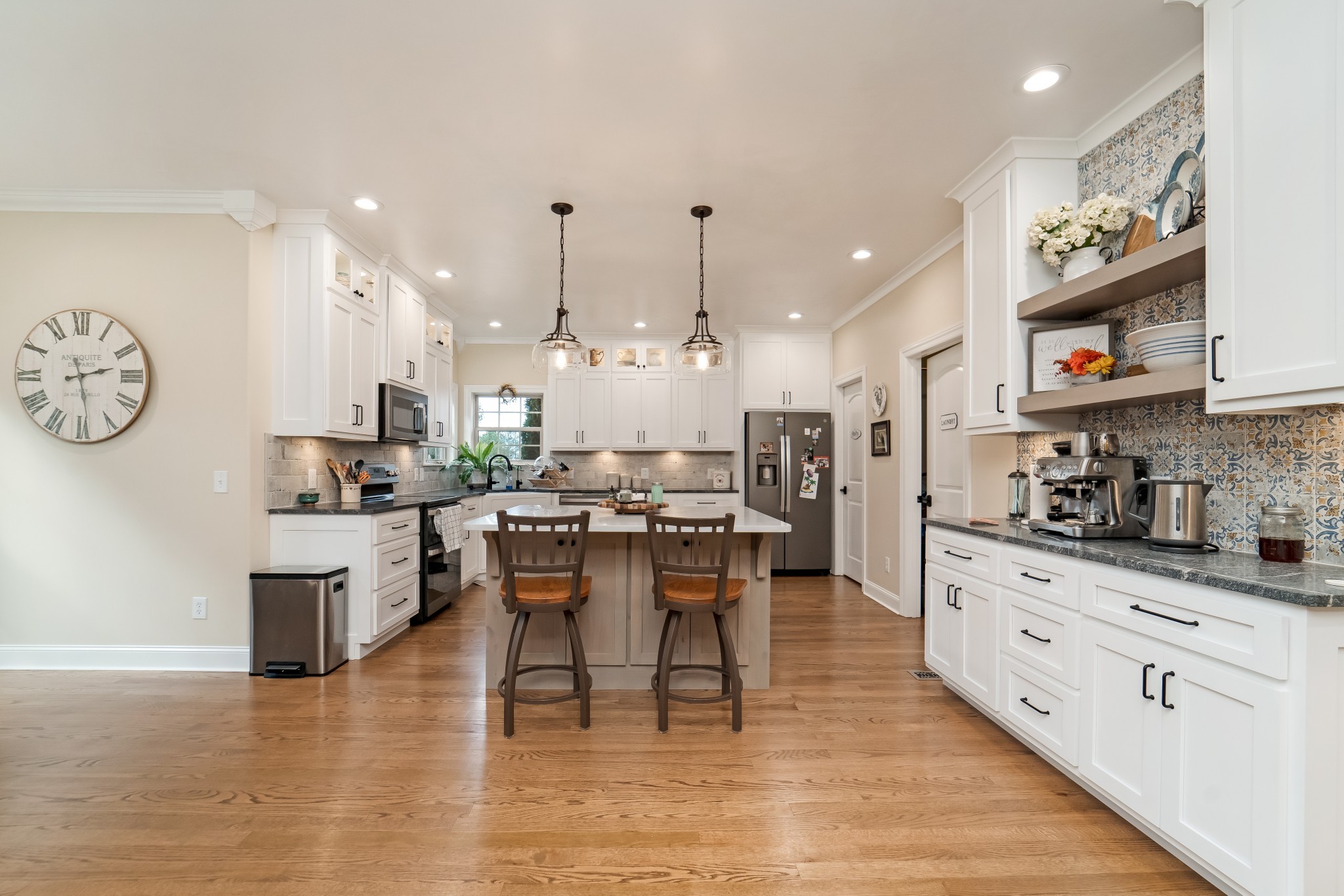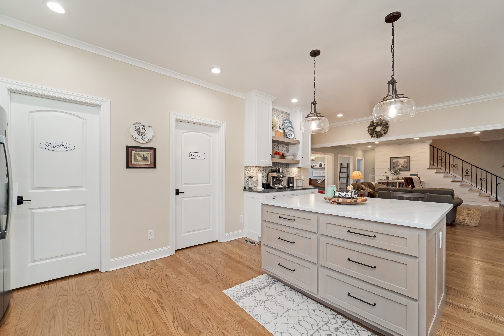 Step through the open entryway into a gorgeous living room featuring a cozy updated gas fireplace and direct access to the formal dining room. The heart of the home is the stunning recently remodeled kitchen, boasting an expansive island, abundant cabinetry, a generous walk-in pantry, and a luxurious blend of quartz and granite countertops. A charming coffee bar adds both function and flair, while a reverse osmosis water filtration system ensures clean, crisp water straight from the tap. Enjoy your morning coffee in the breakfast nook or relax on the screened-in back porch overlooking the peaceful, private backyard.