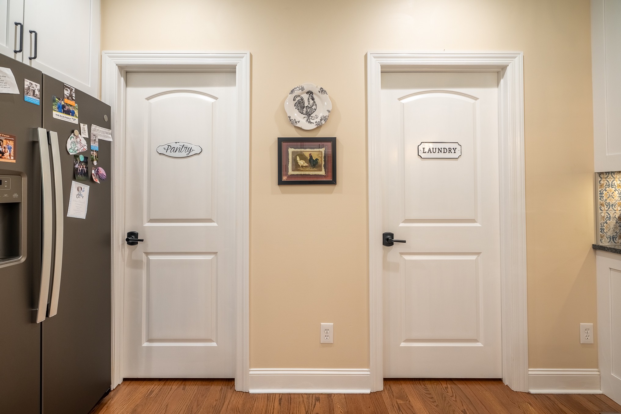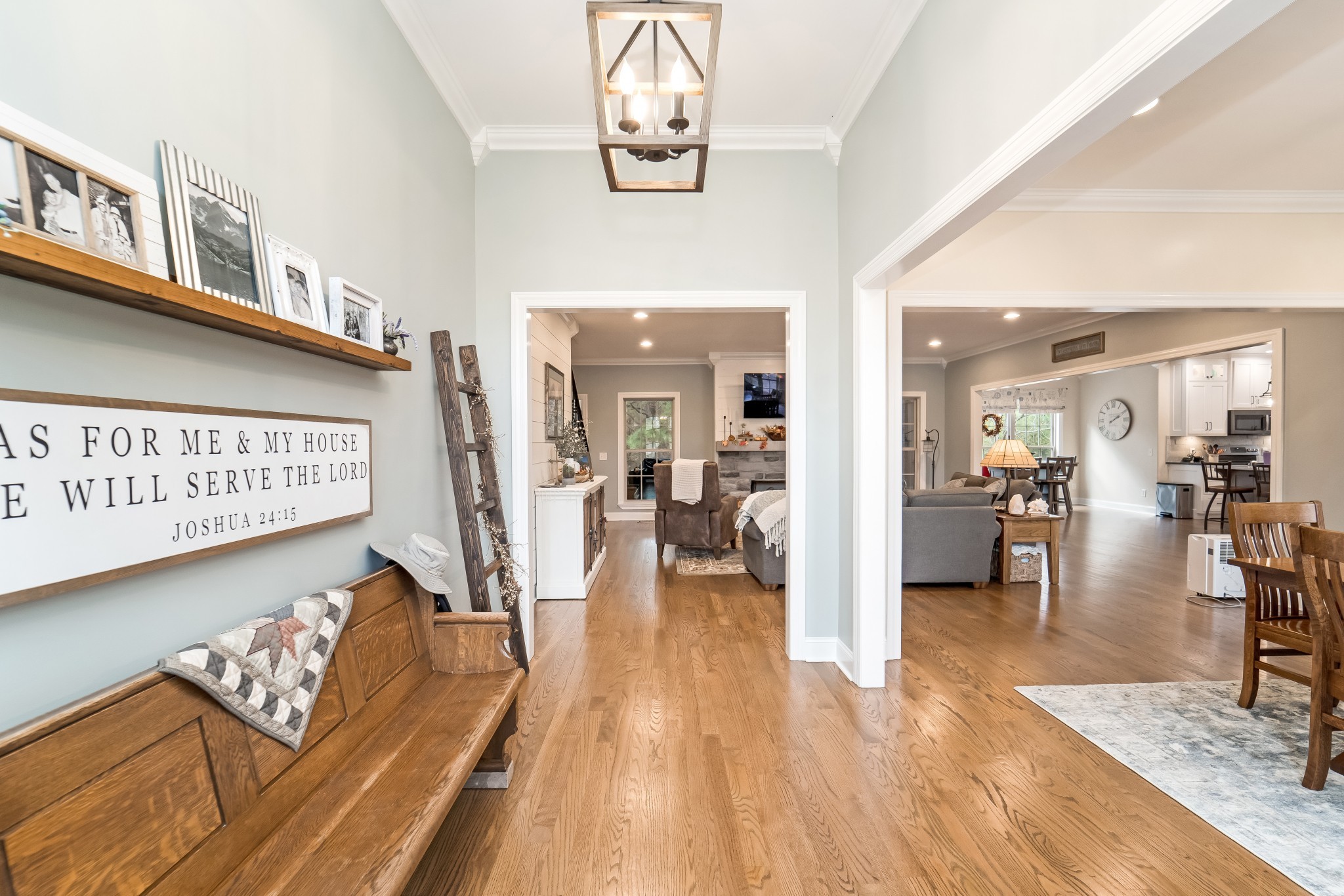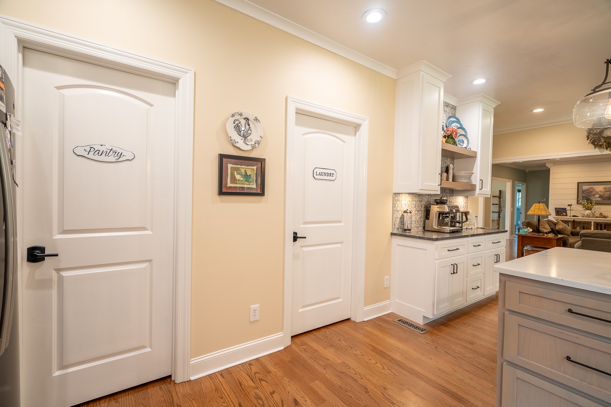 Step through the open entryway into a gorgeous living room featuring a cozy updated gas fireplace and direct access to the formal dining room. The heart of the home is the stunning recently remodeled kitchen, boasting an expansive island, abundant cabinetry, a generous walk-in pantry, and a luxurious blend of quartz and granite countertops. A charming coffee bar adds both function and flair, while a reverse osmosis water filtration system ensures clean, crisp water straight from the tap. Enjoy your morning coffee in the breakfast nook or relax on the screened-in back porch overlooking the peaceful, private backyard.