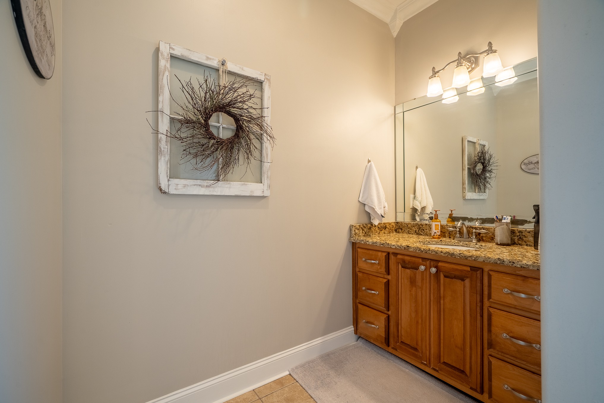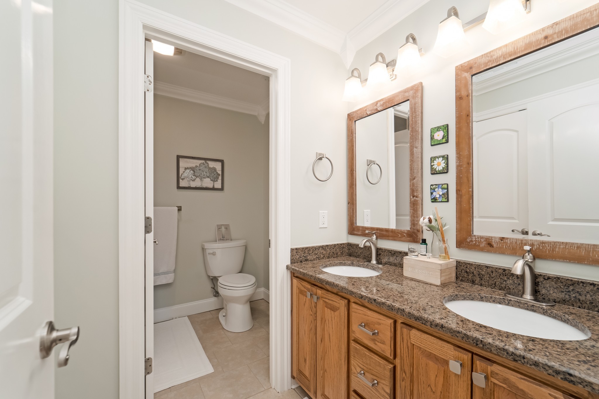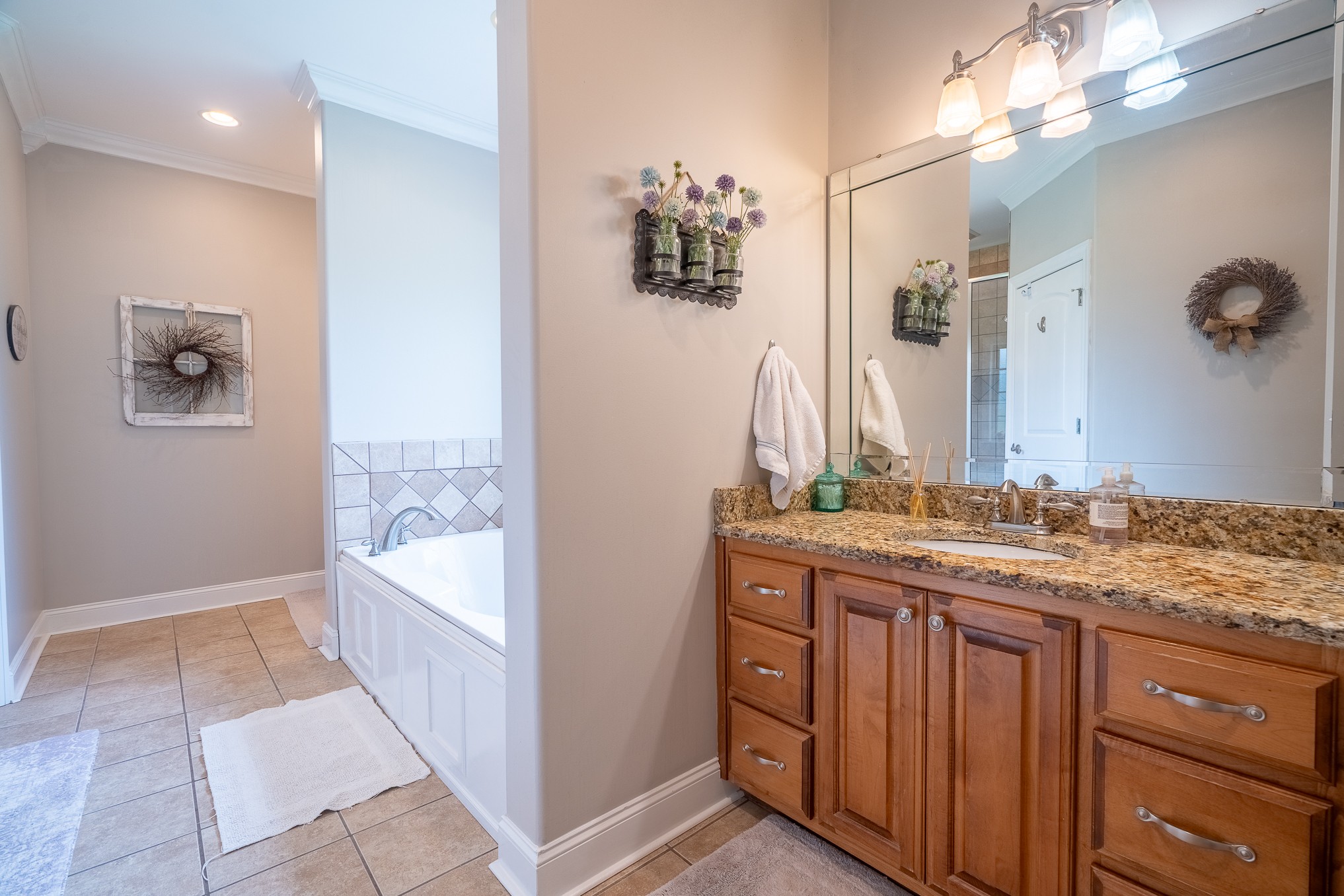 The main-level master suite is a true retreat, complete with a large master bath that includes his and her vanities, a walk-in shower, and a relaxing garden tub. A main floor guest bedroom offers comfort and privacy with a fully renovated en-suite bathroom—perfect for visitors or multi-generational living.
