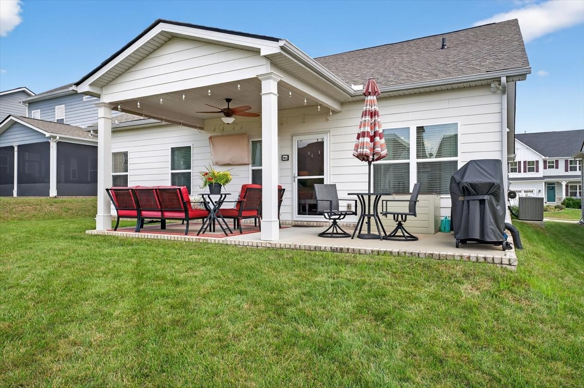 Step outside to enjoy a large back patio that’s part covered, part open, with a pull-down sunscreen, perfect for relaxing or entertaining. For security and convenience, cameras and Ring doorbell remain with the home.