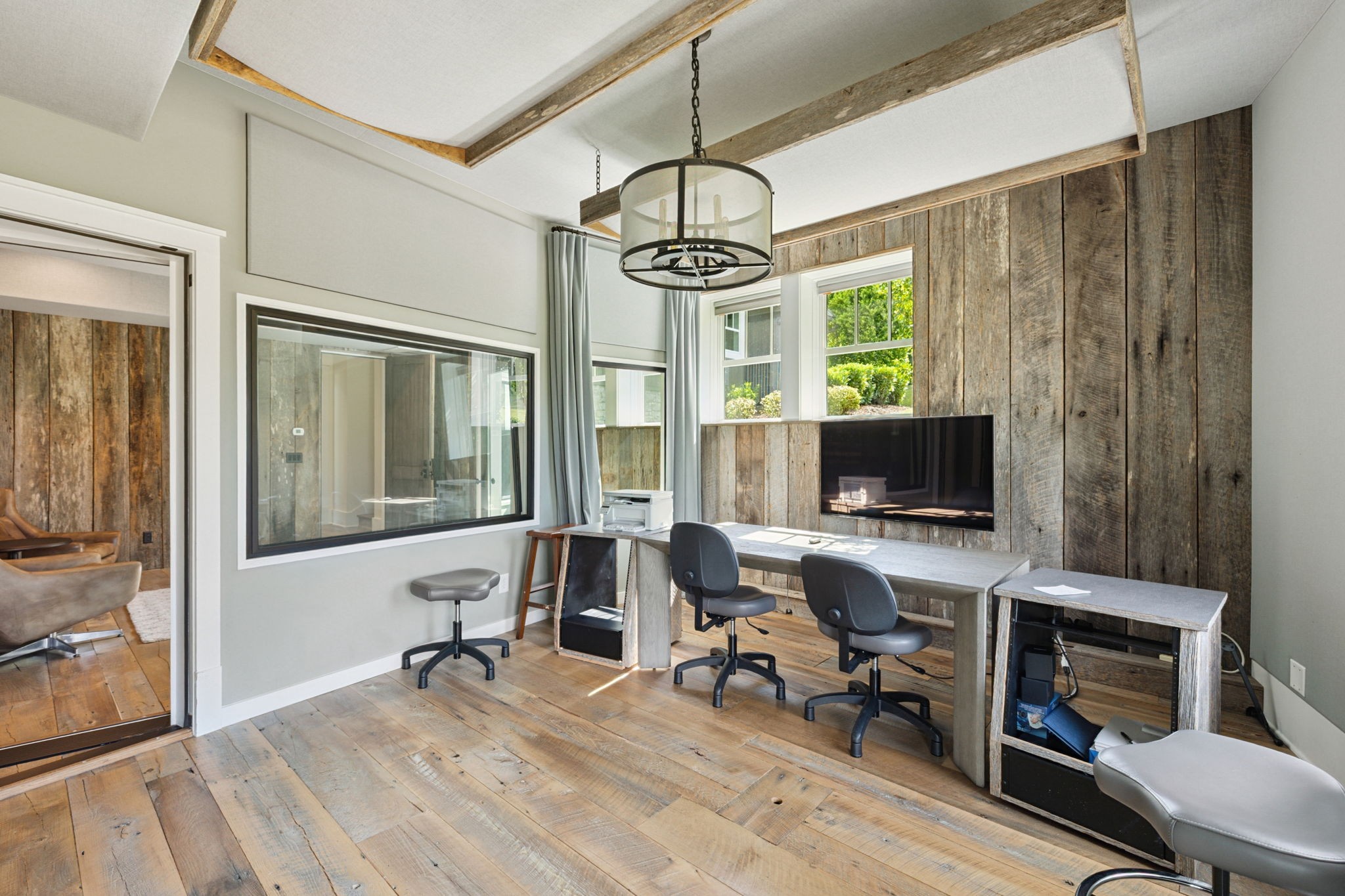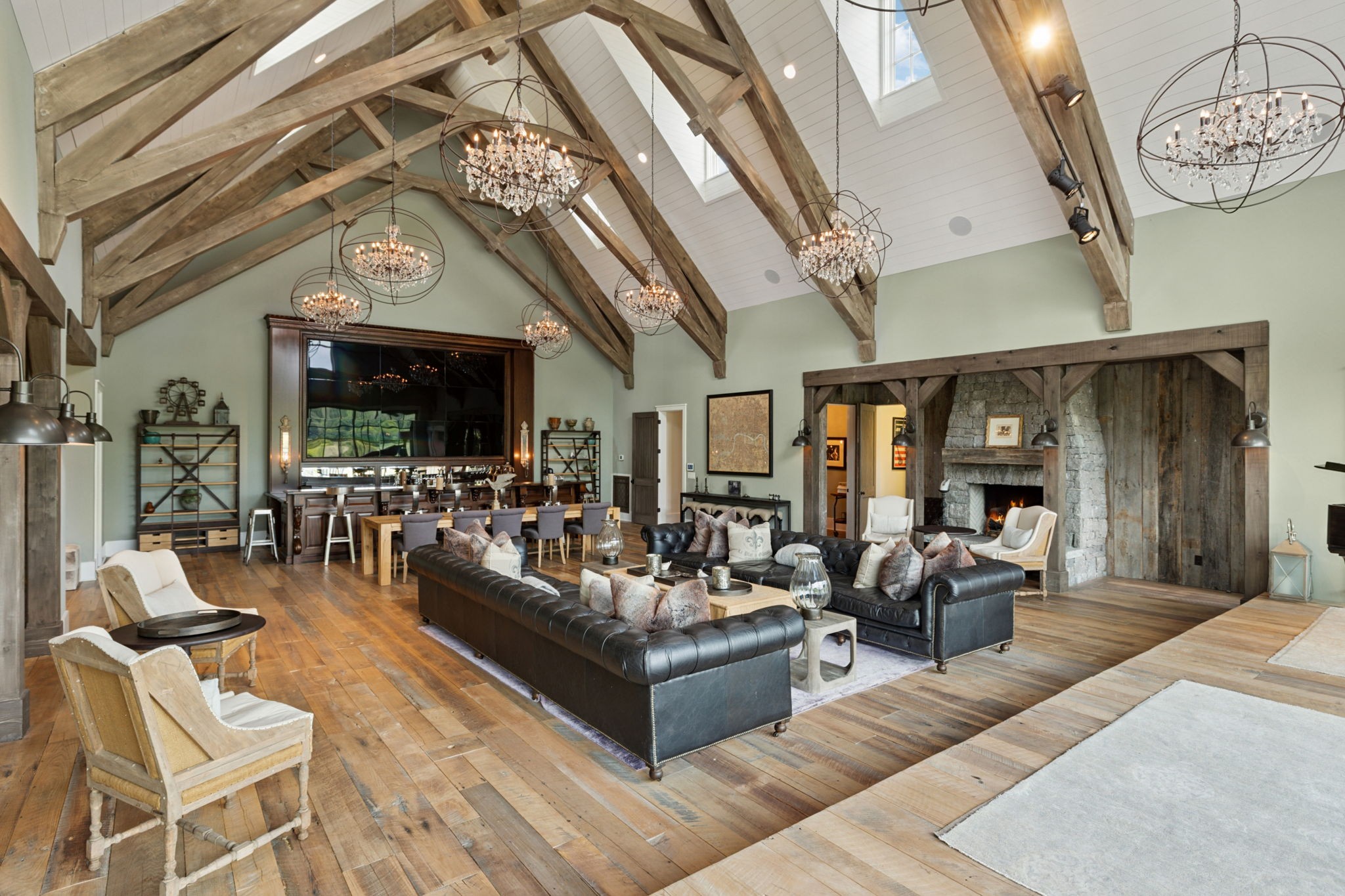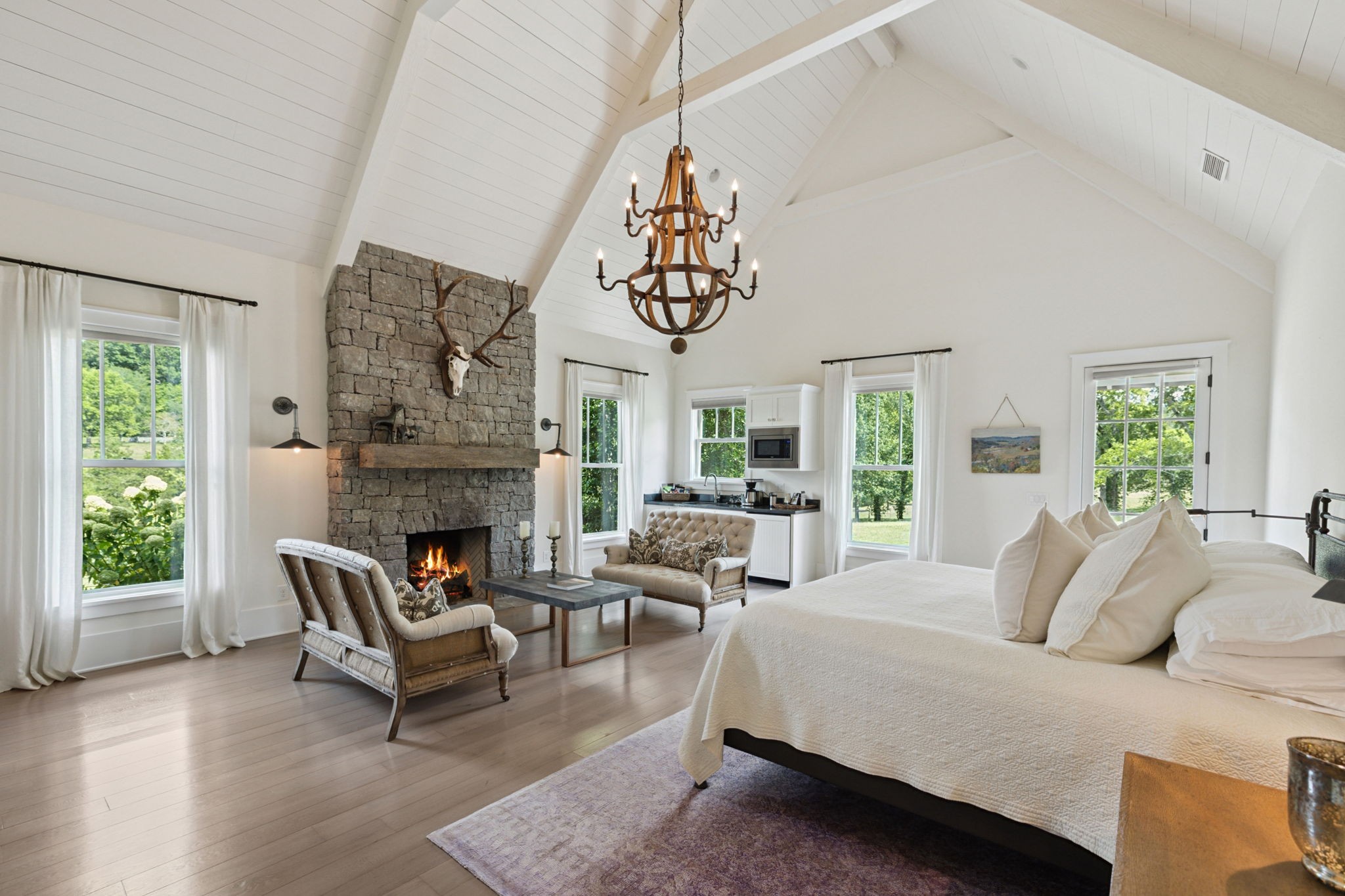 Across the property is the “77” Entertainment Barn, which is nothing short of extraordinary. Designed by architect Eric Stengel, this 5,300 sq. ft. masterpiece combines rustic character with refined luxury. Soaring ceilings frame an open space anchored by a grand imported bar with large video wall, and two stone fireplaces—perfect for both large and intimate gatherings. Two private bedroom suites, each with a fireplace, laundry, and kitchenette, flank the great room, while a game room, full upstairs catering kitchen, gym, bathroom, and oversized 2-car garage provide modern convenience. Adding to its prestige, a Gary Hedden–designed recording studio makes this barn a destination for creativity and entertainment. The “77” is truly one of Leipers Fork’s most remarkable spaces.