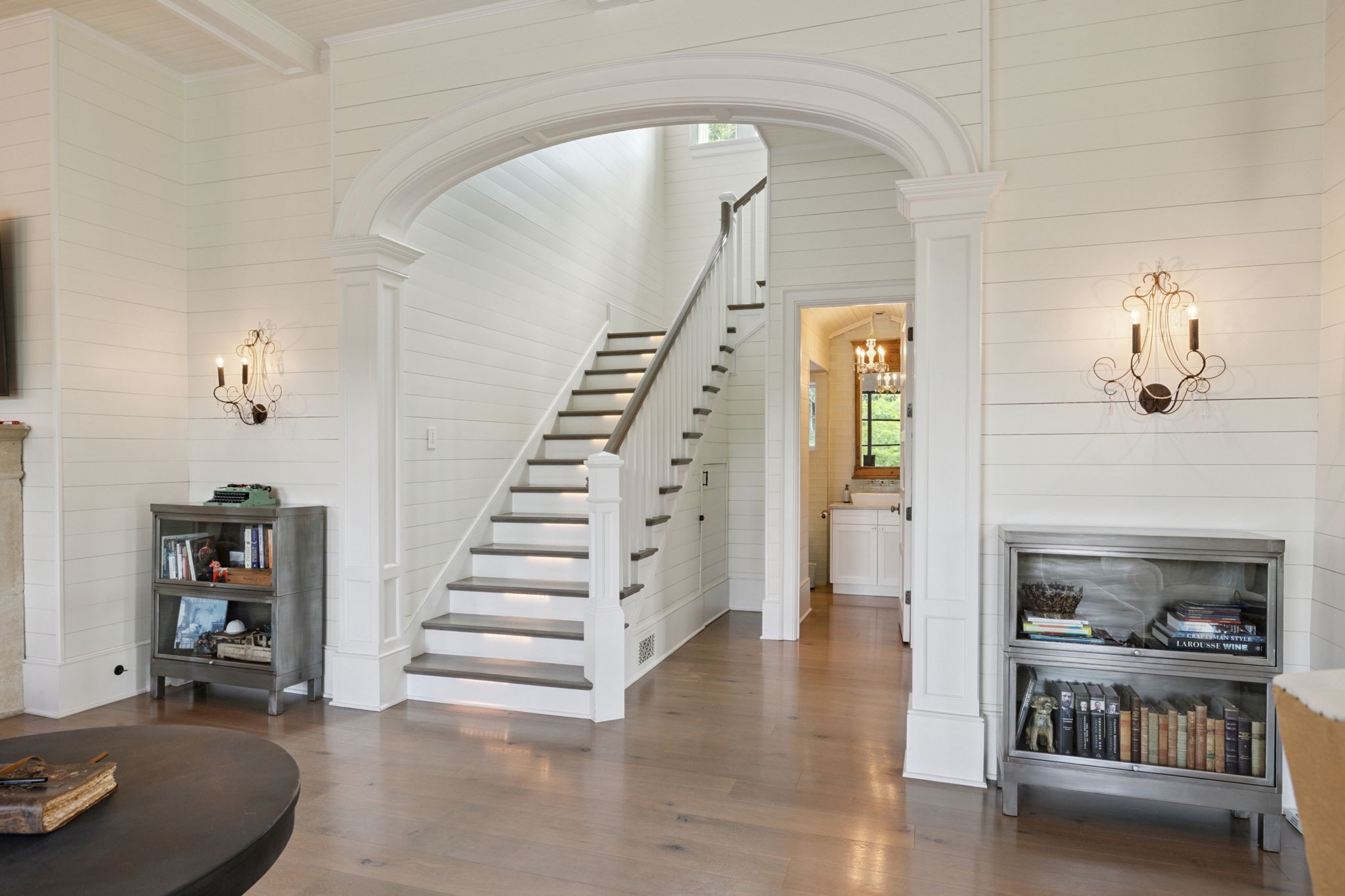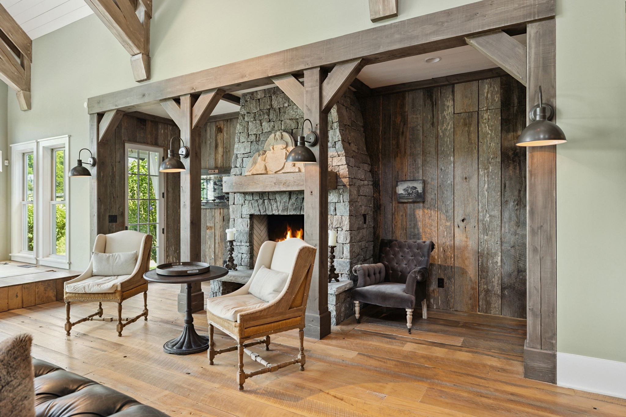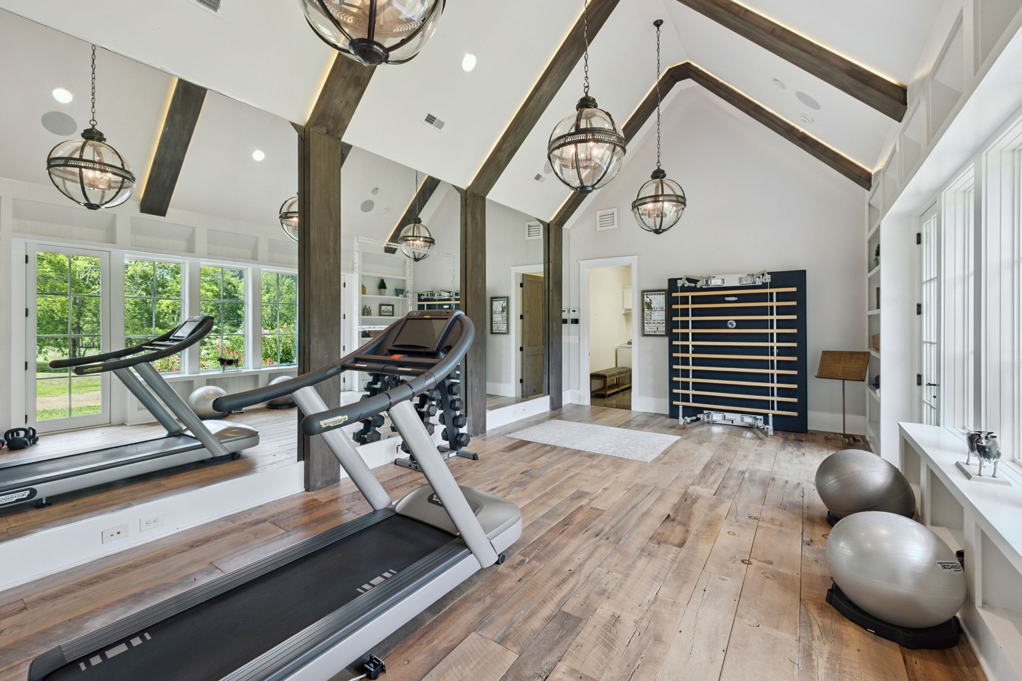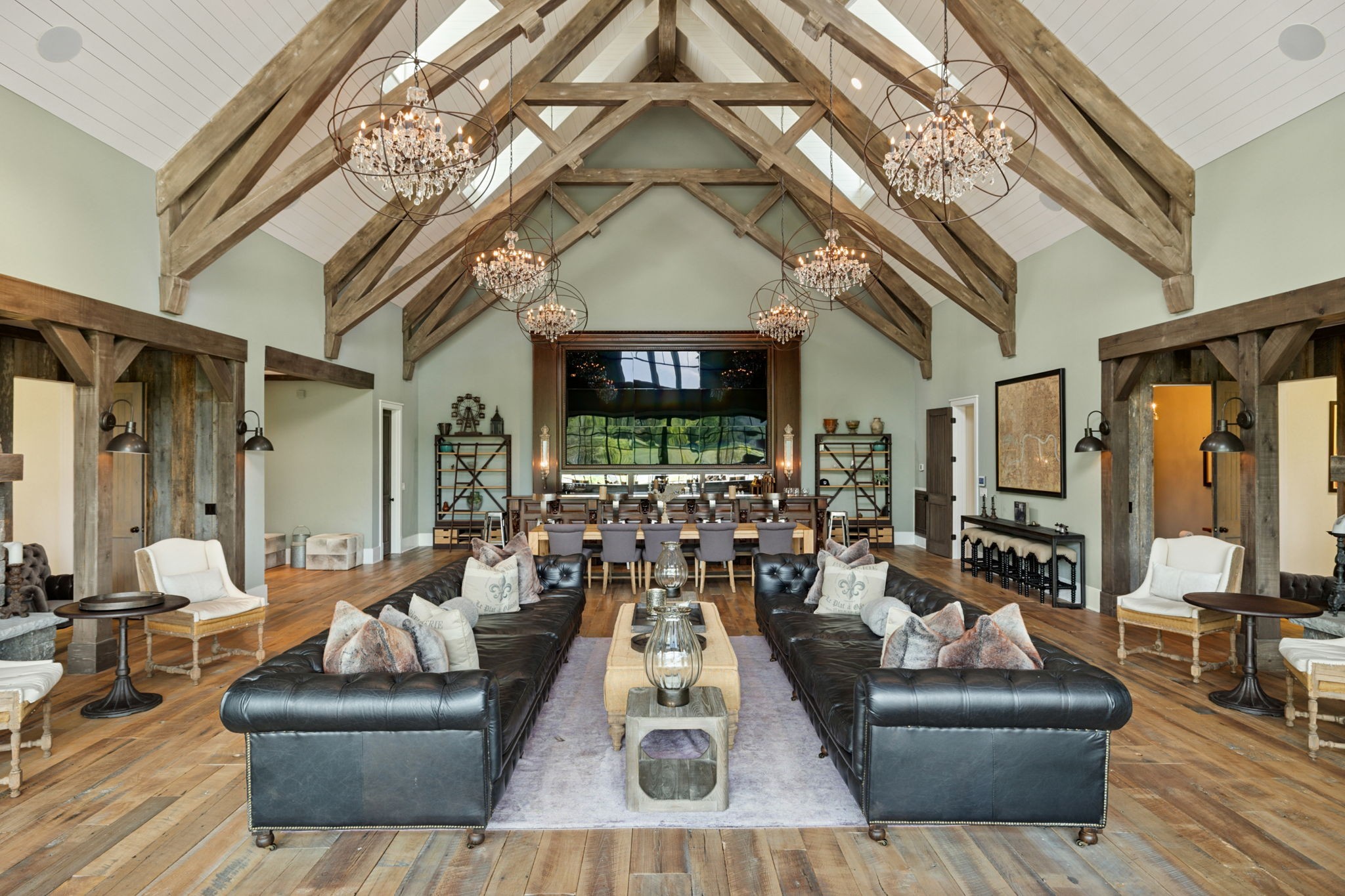 Across the property is the “77” Entertainment Barn, which is nothing short of extraordinary. Designed by architect Eric Stengel, this 5,300 sq. ft. masterpiece combines rustic character with refined luxury. Soaring ceilings frame an open space anchored by a grand imported bar with large video wall, and two stone fireplaces—perfect for both large and intimate gatherings. Two private bedroom suites, each with a fireplace, laundry, and kitchenette, flank the great room, while a game room, full upstairs catering kitchen, gym, bathroom, and oversized 2-car garage provide modern convenience. Adding to its prestige, a Gary Hedden–designed recording studio makes this barn a destination for creativity and entertainment. The “77” is truly one of Leipers Fork’s most remarkable spaces.