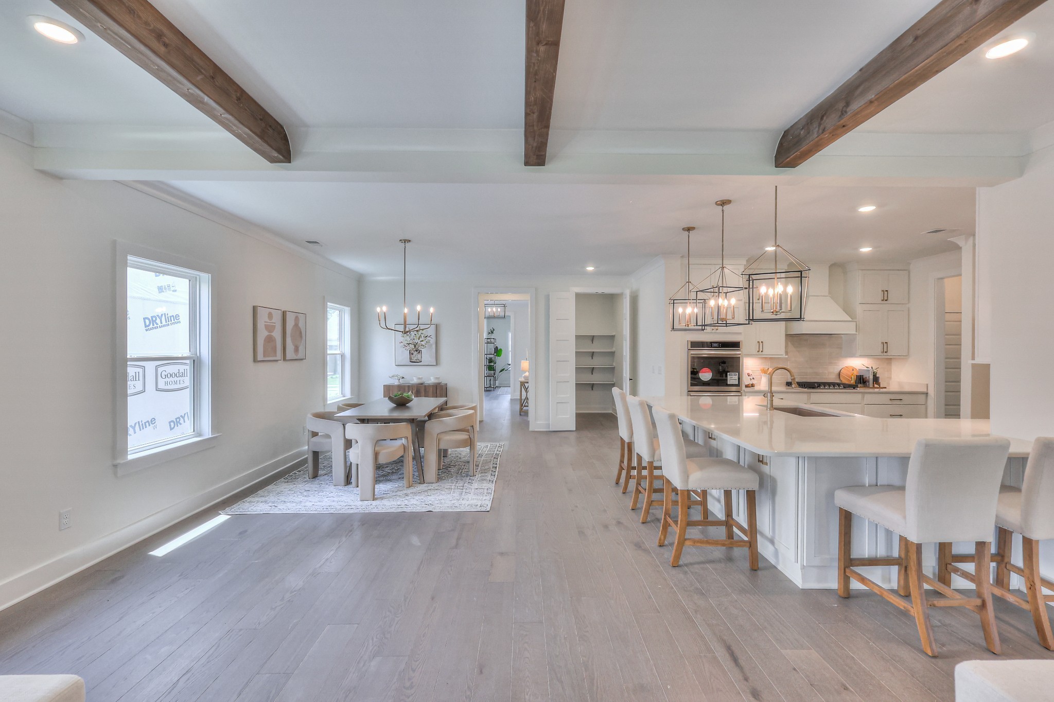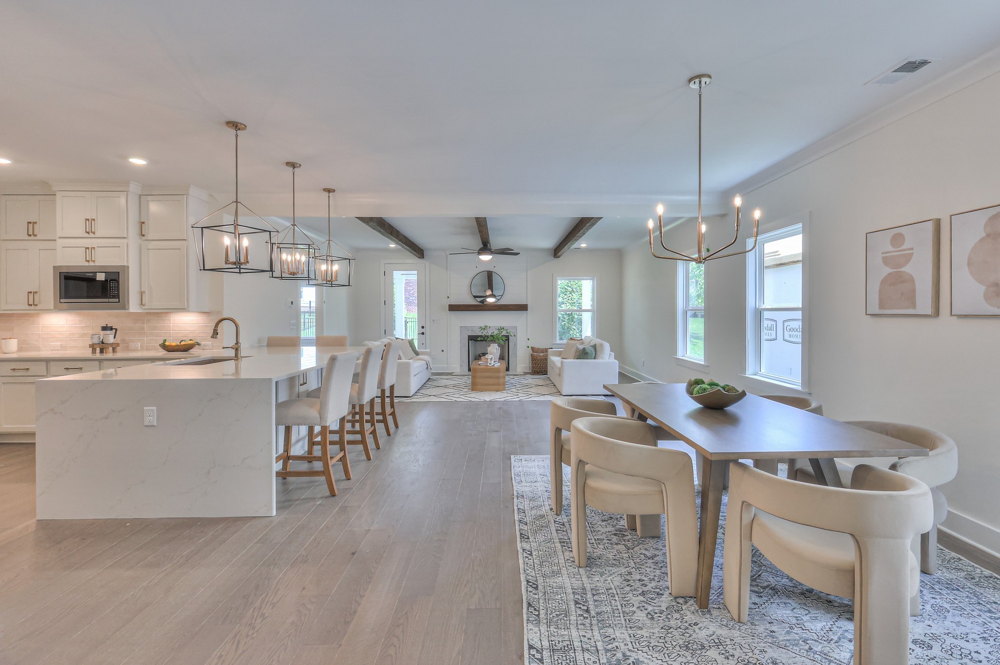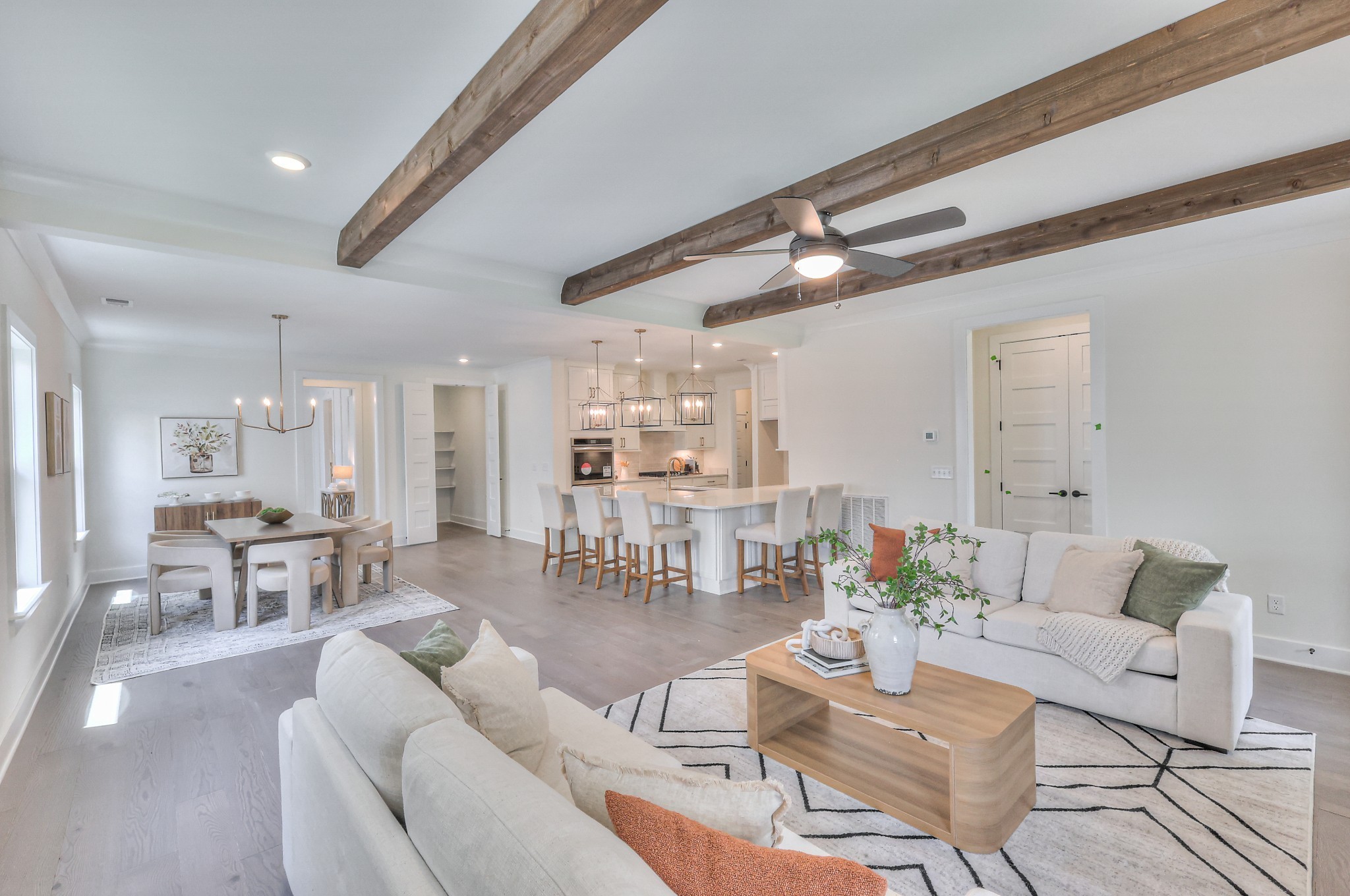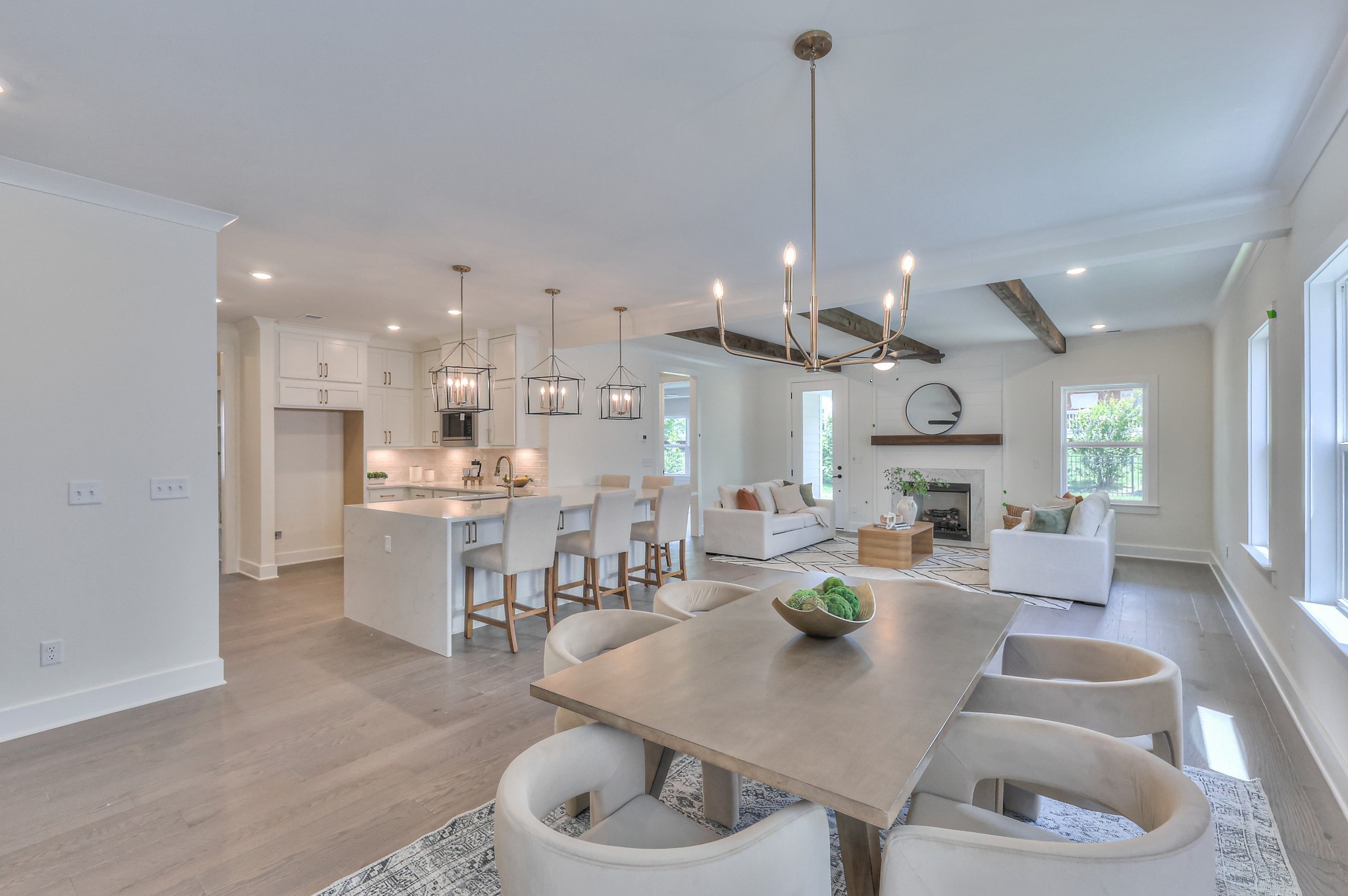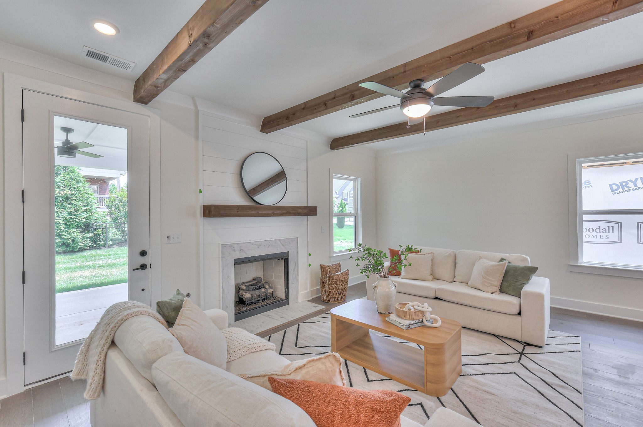 This stunning home features an open concept kitchen that flows seamlessly into the great room, complete with fireplace and wood beam ceiling detail. The main-level primary suite boasts a spa-like bath with a freestanding tub, fully tiled shower, and spacious walk-in closet. A second bedroom with a full bath is also conveniently located on the main floor. Upstairs you'll find 4 additional bedrooms and an oversized bonus room, providing plenty of space for family and guests. Enjoy the rear covered outdoor living area, perfect for gatherings or quiet moments of relaxation!