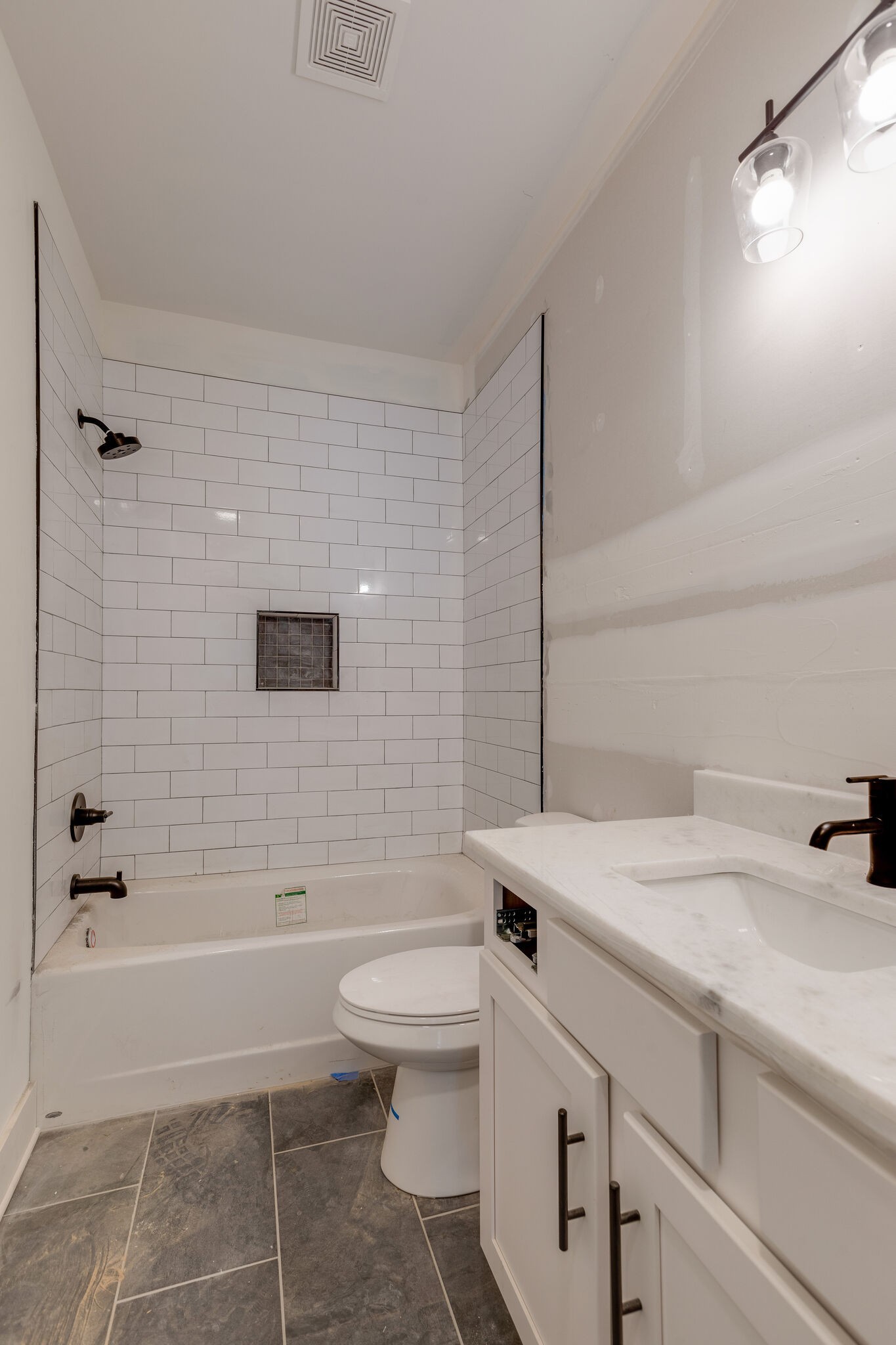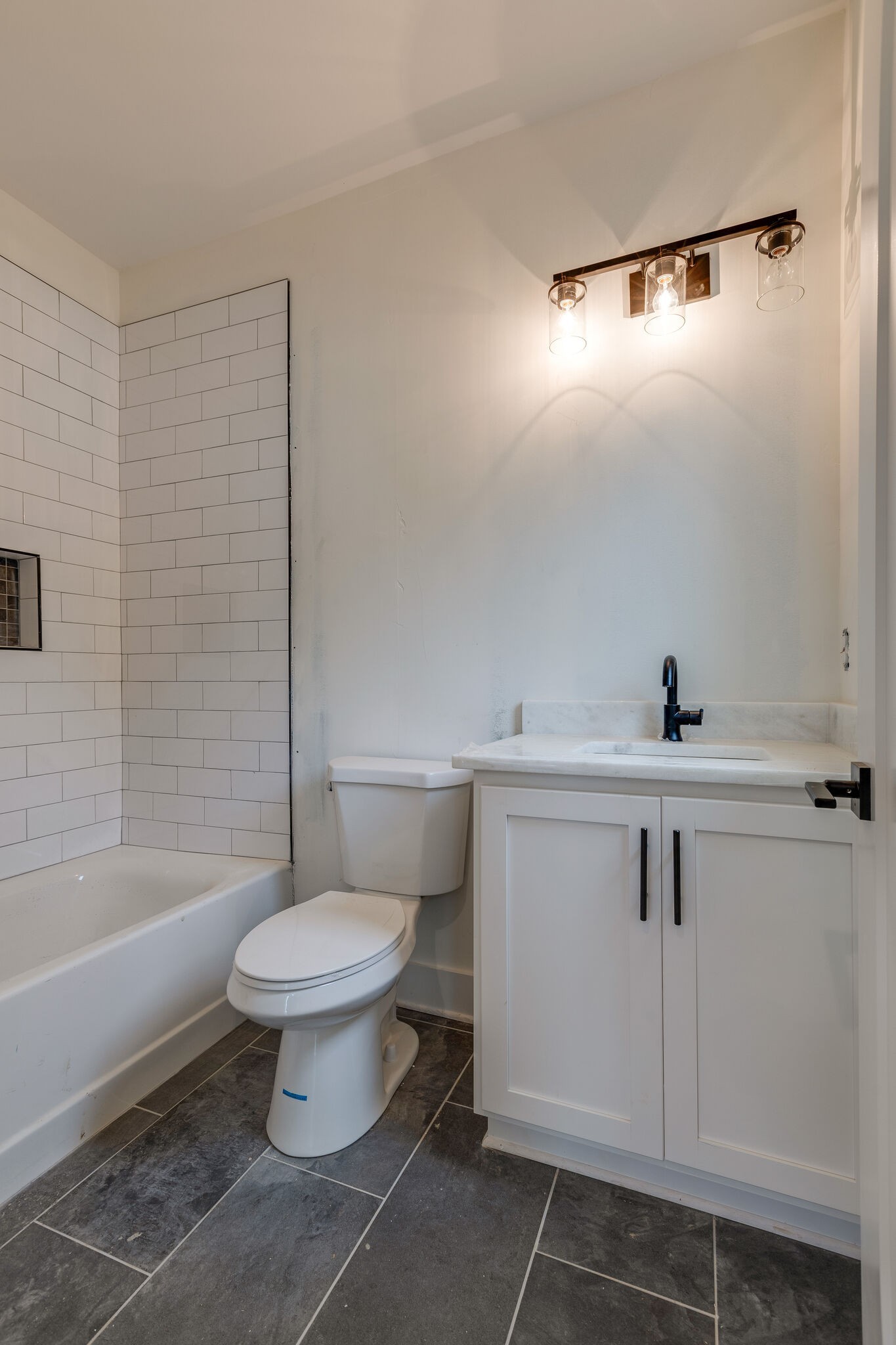 • Modern bathrooms with subway tile showers, black matte fixtures, and ample cabinet space