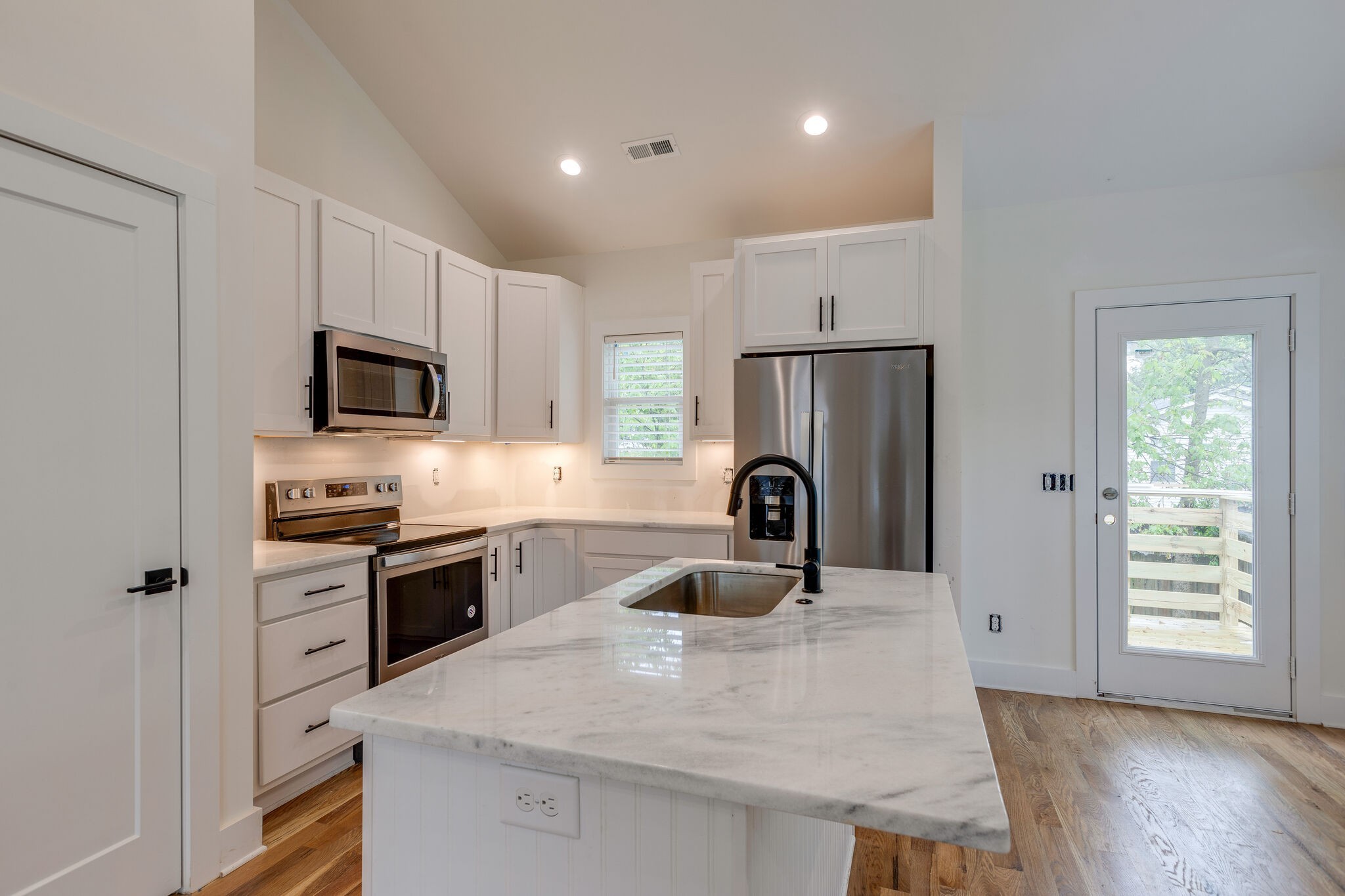 • A sleek open-concept kitchen with stainless steel appliances, quartz countertops, and a large center island