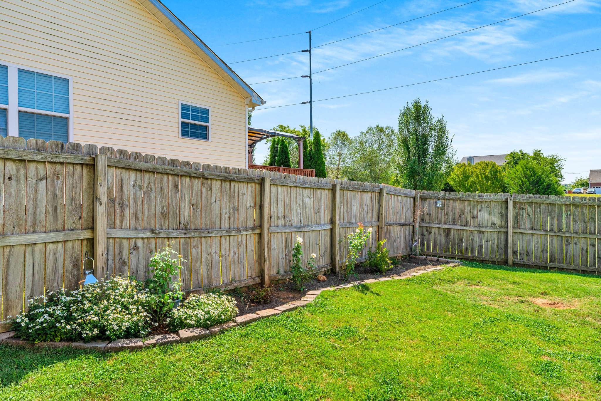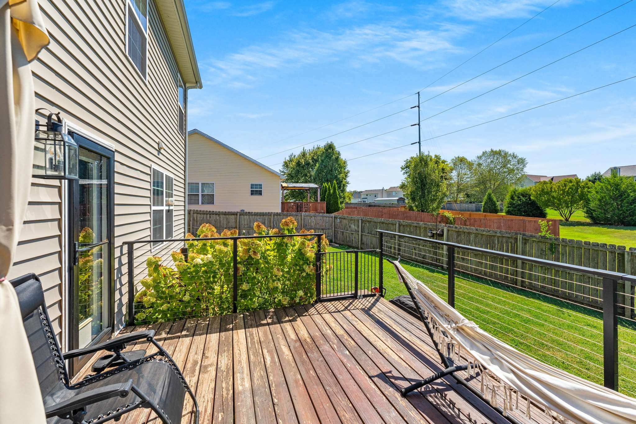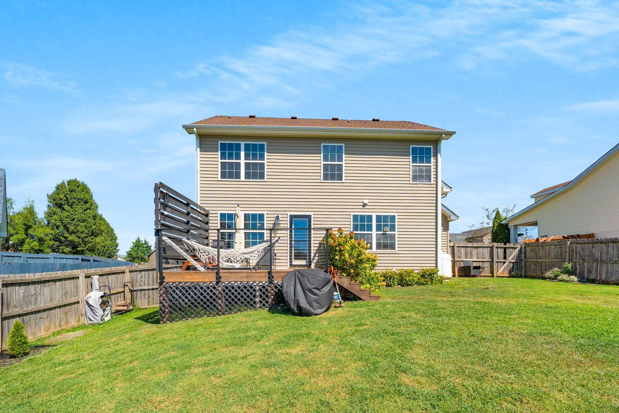 Outside, soak up the beautiful backyard with a deck and pretty flowers, perfect for relaxation or gatherings. The spacious two-car garage comes with chic built-ins and a bar area, providing versatile space.