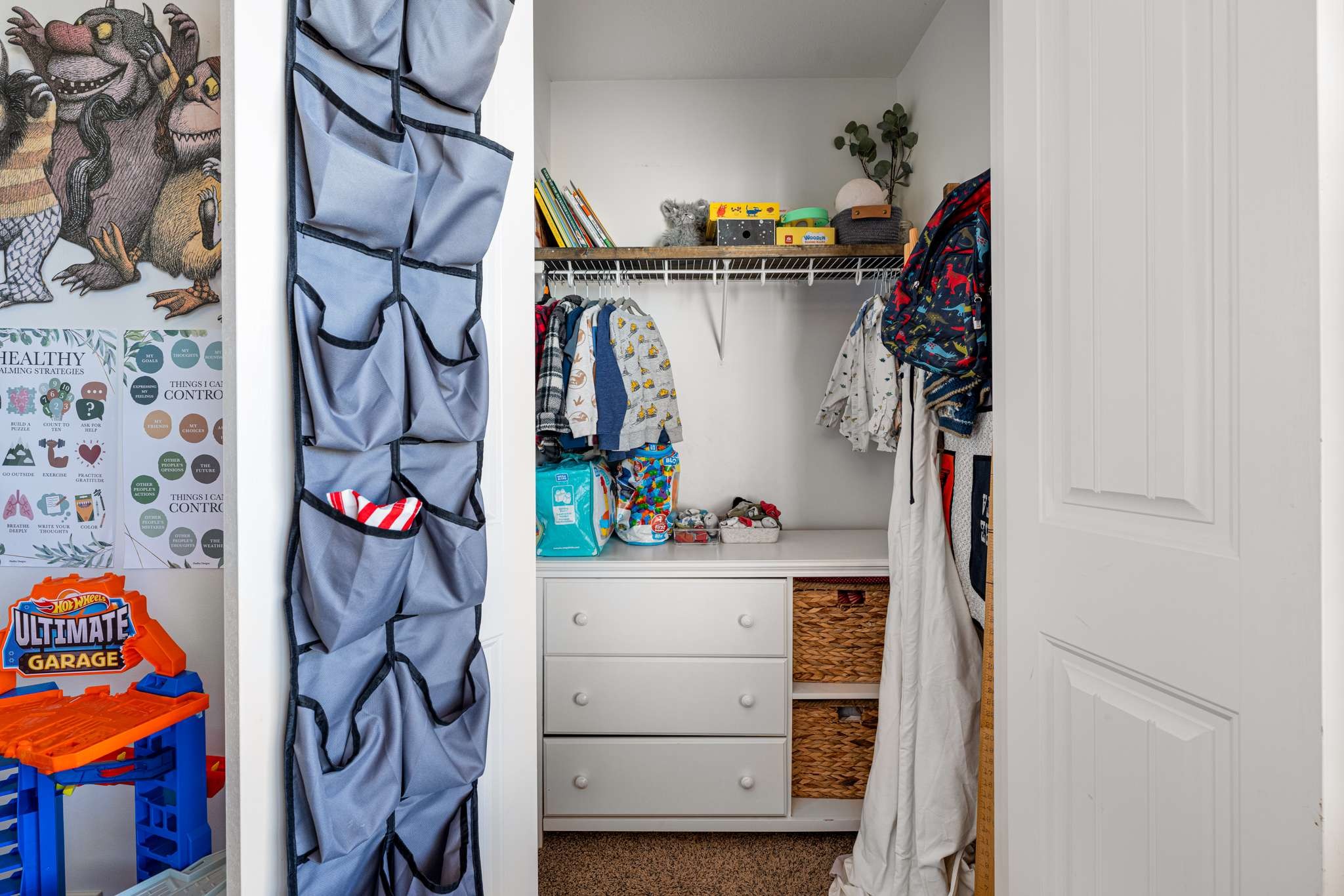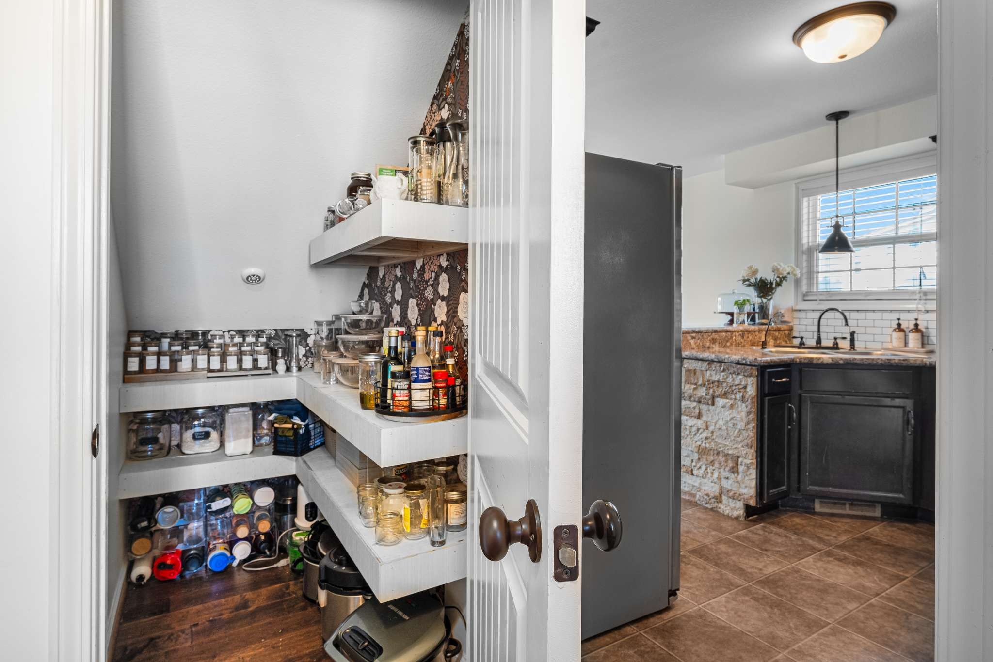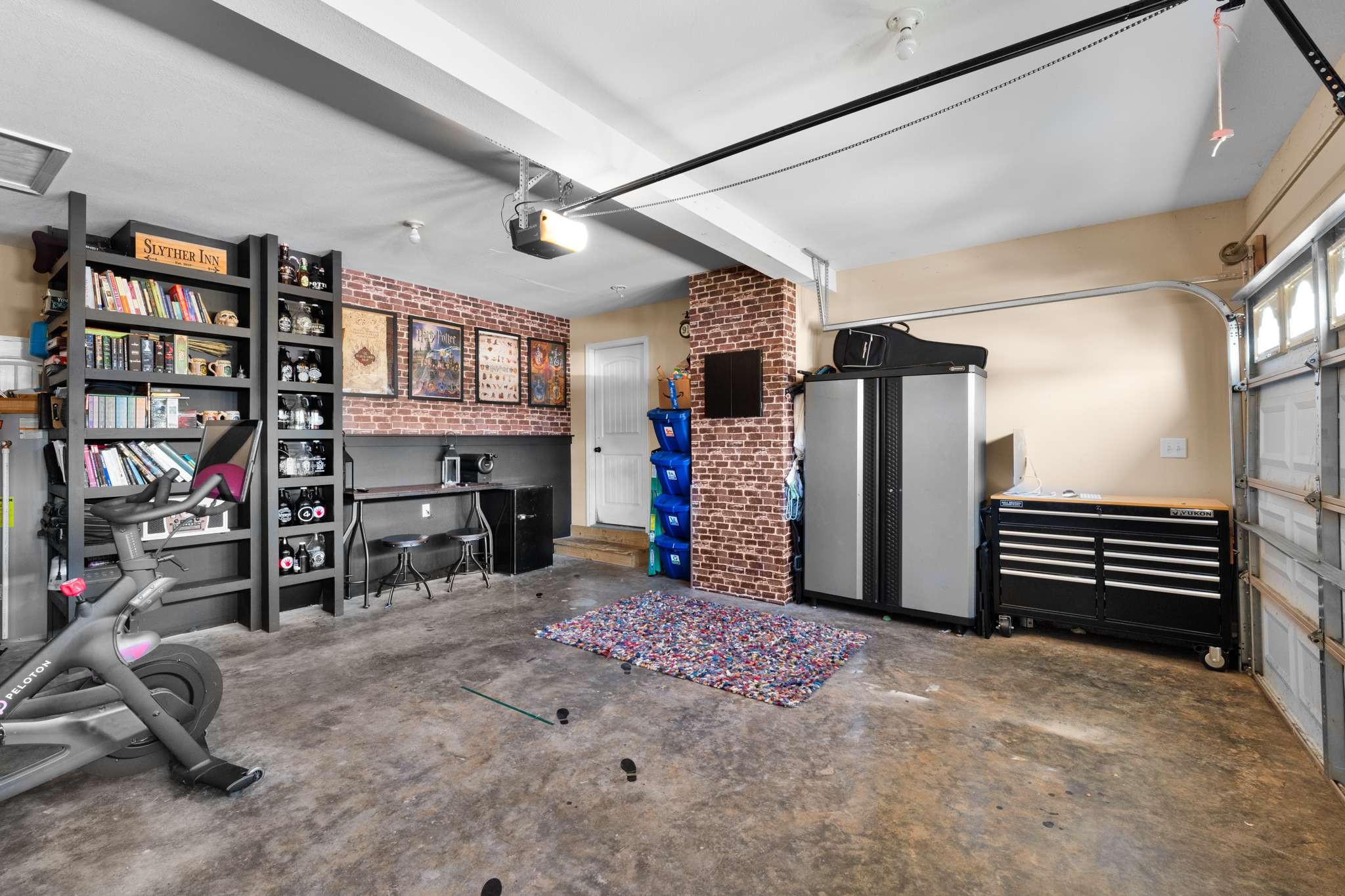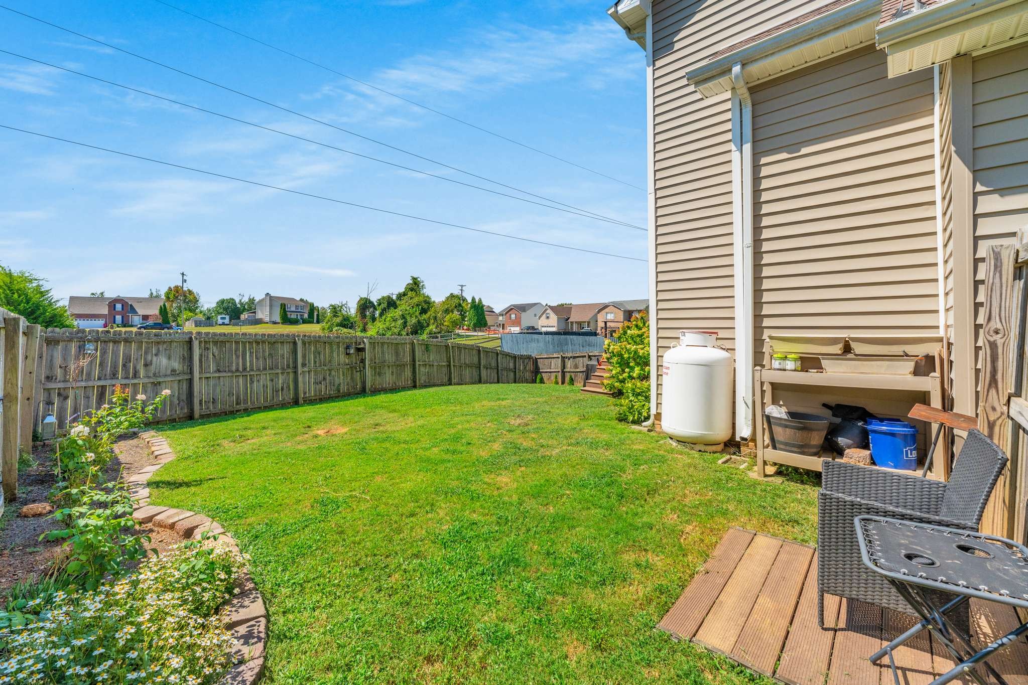 Outside, soak up the beautiful backyard with a deck and pretty flowers, perfect for relaxation or gatherings. The spacious two-car garage comes with chic built-ins and a bar area, providing versatile space.