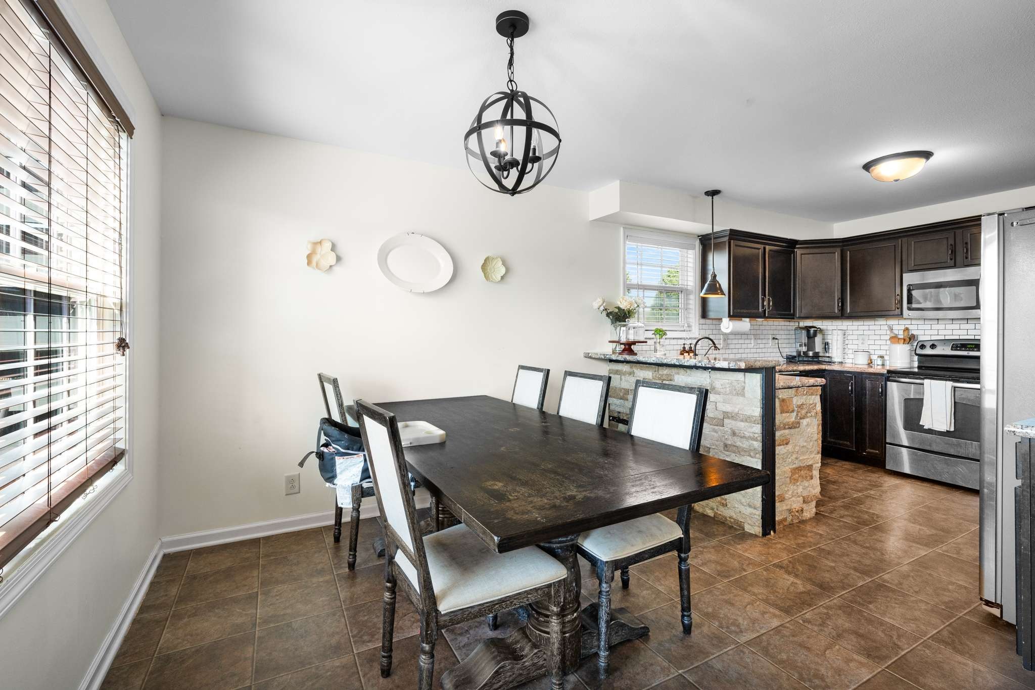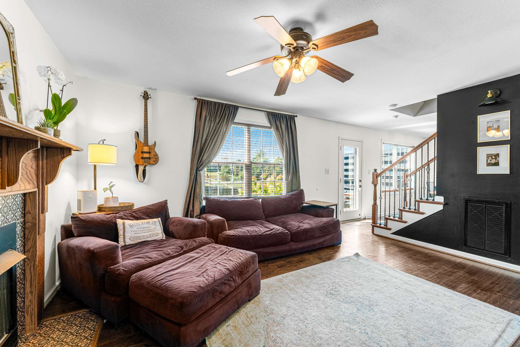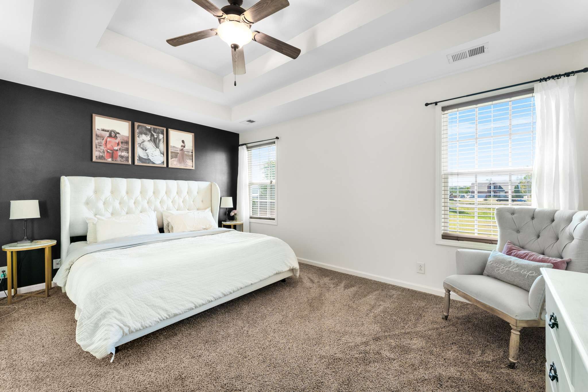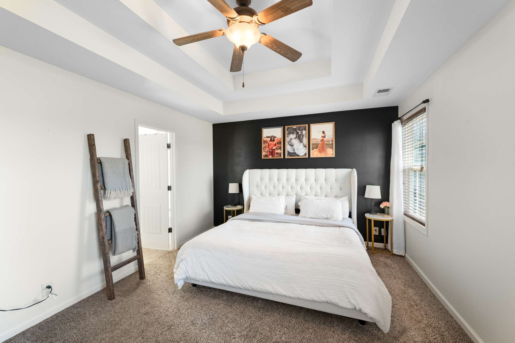 Enjoy a smart layout featuring an inviting living room, dining area, and kitchen downstairs, and three cozy bedrooms upstairs. The primary bedroom impresses with a tall, double trey ceiling, while the home is enhanced by cute accent walls and stylish wallpaper. The plush carpet upstairs is in excellent condition.