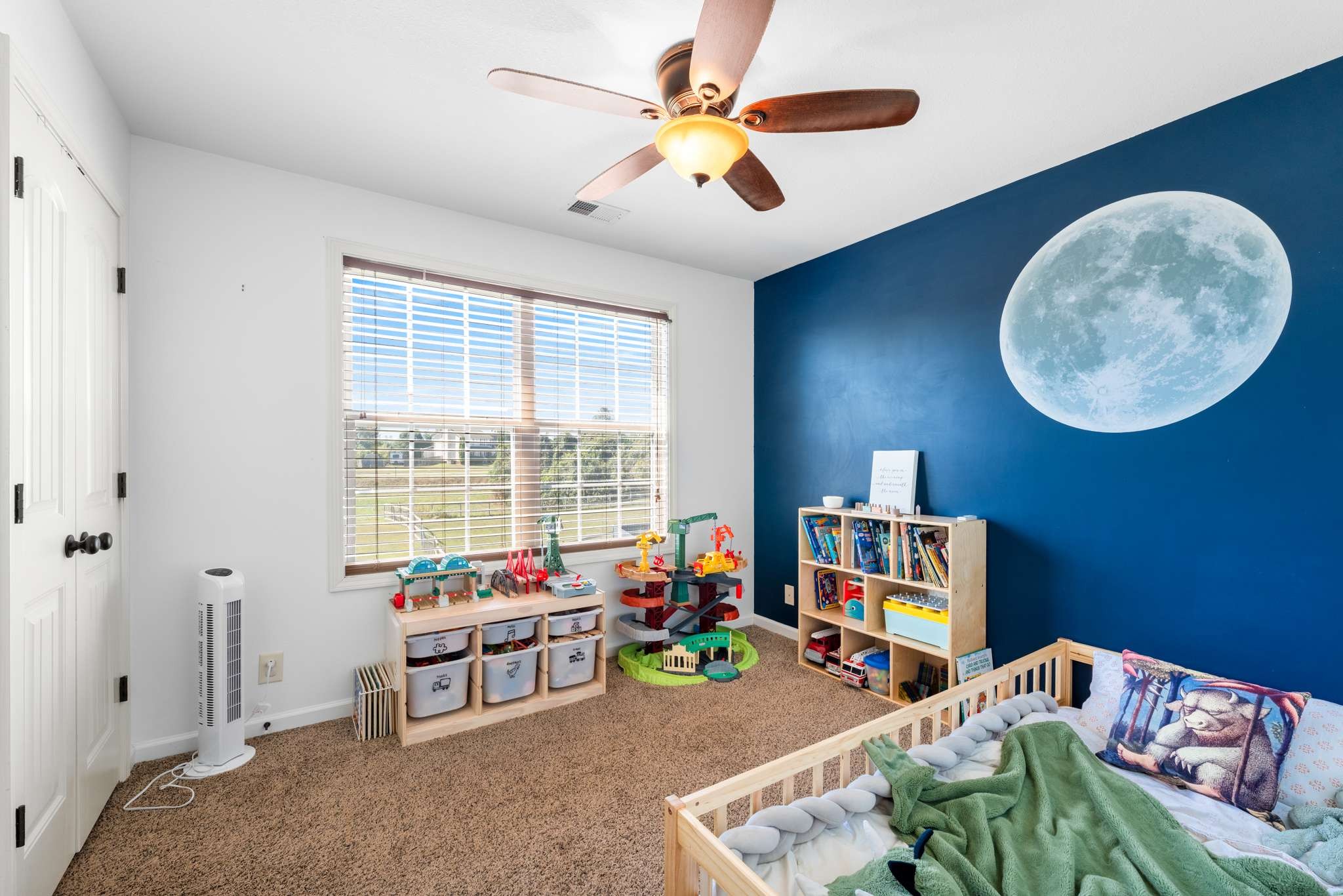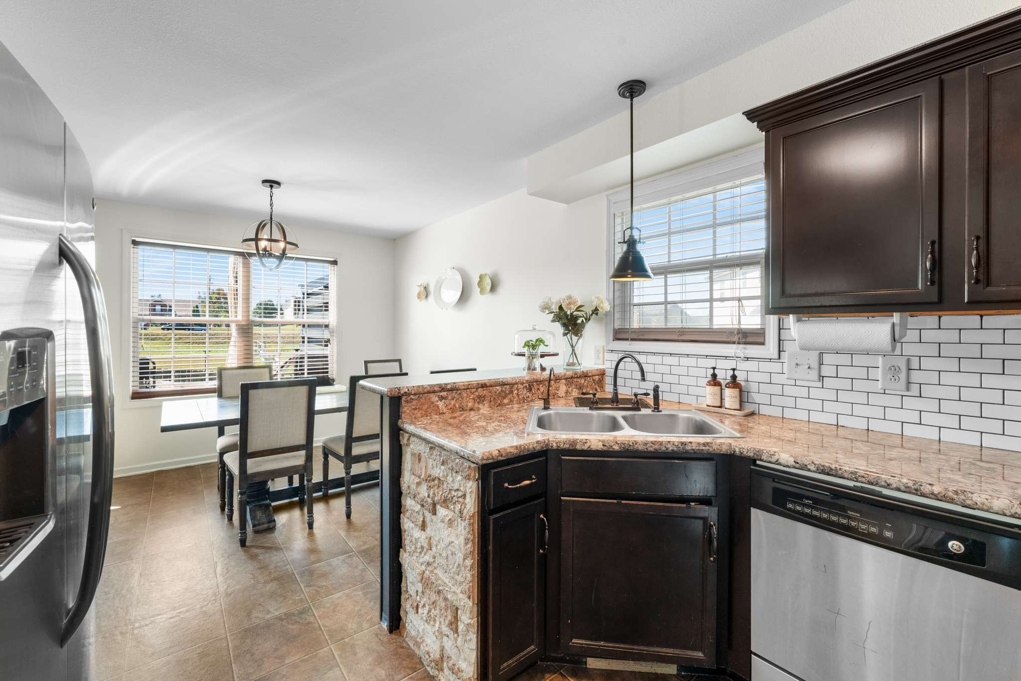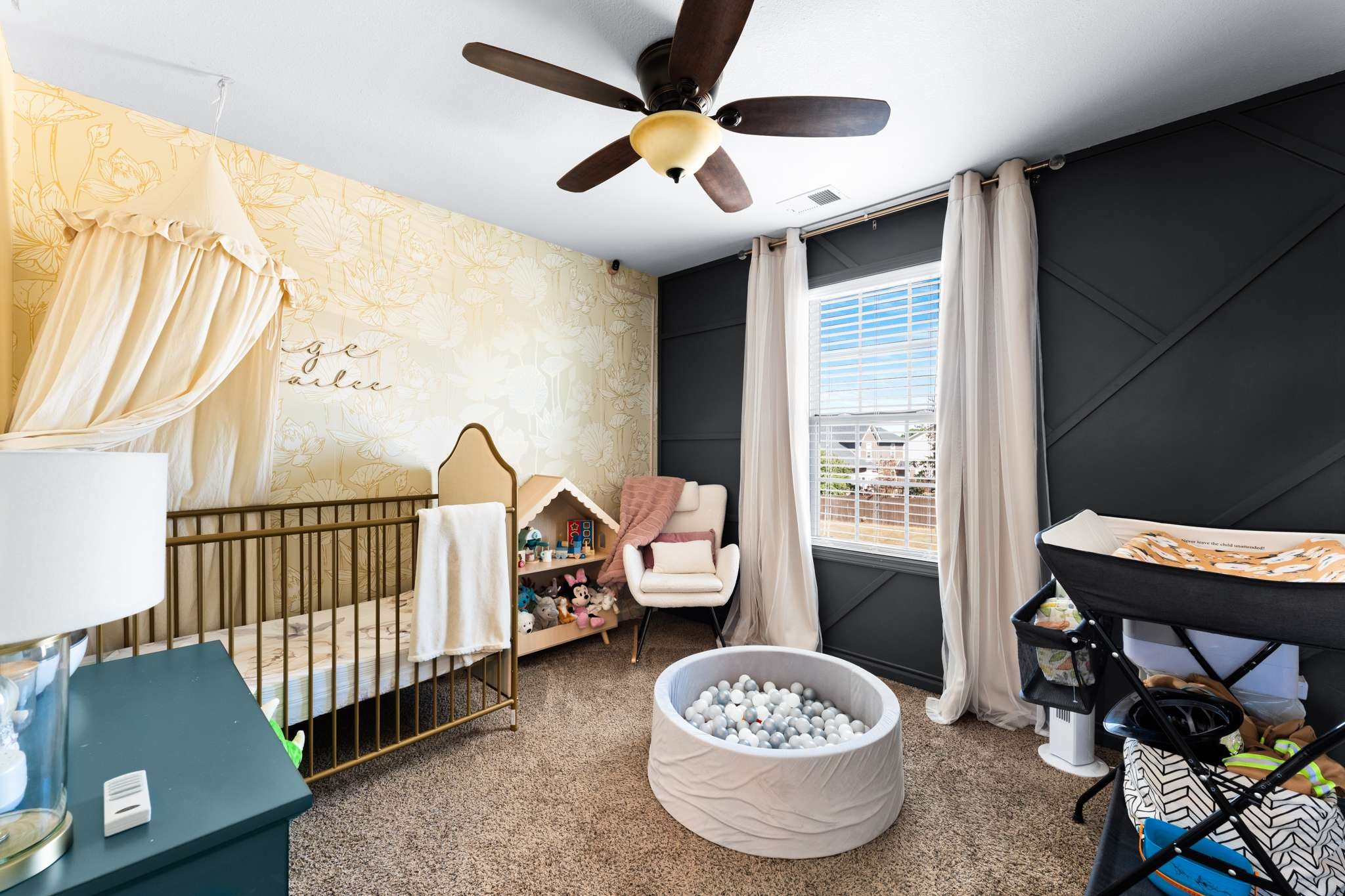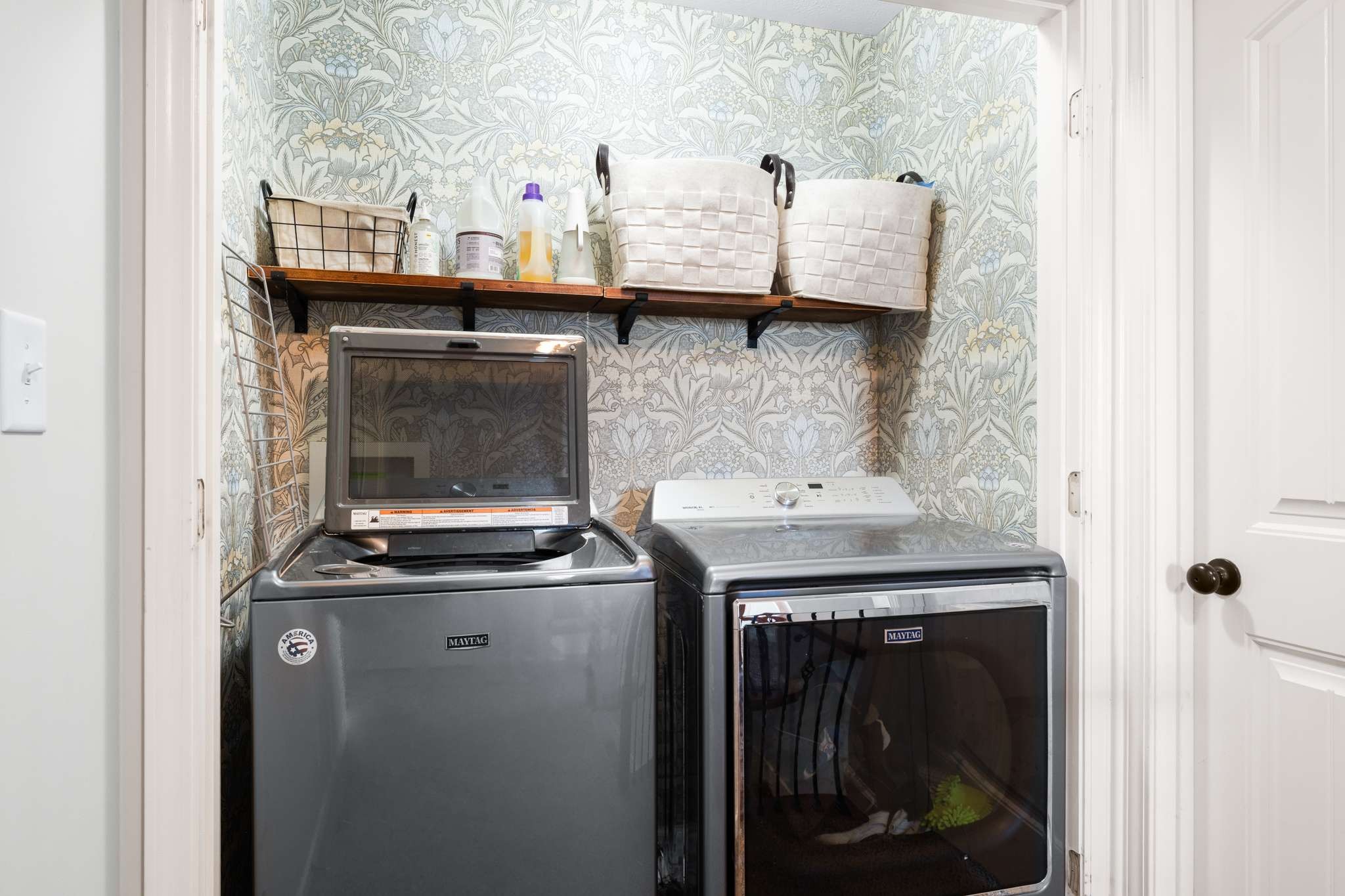 Enjoy a smart layout featuring an inviting living room, dining area, and kitchen downstairs, and three cozy bedrooms upstairs. The primary bedroom impresses with a tall, double trey ceiling, while the home is enhanced by cute accent walls and stylish wallpaper. The plush carpet upstairs is in excellent condition.