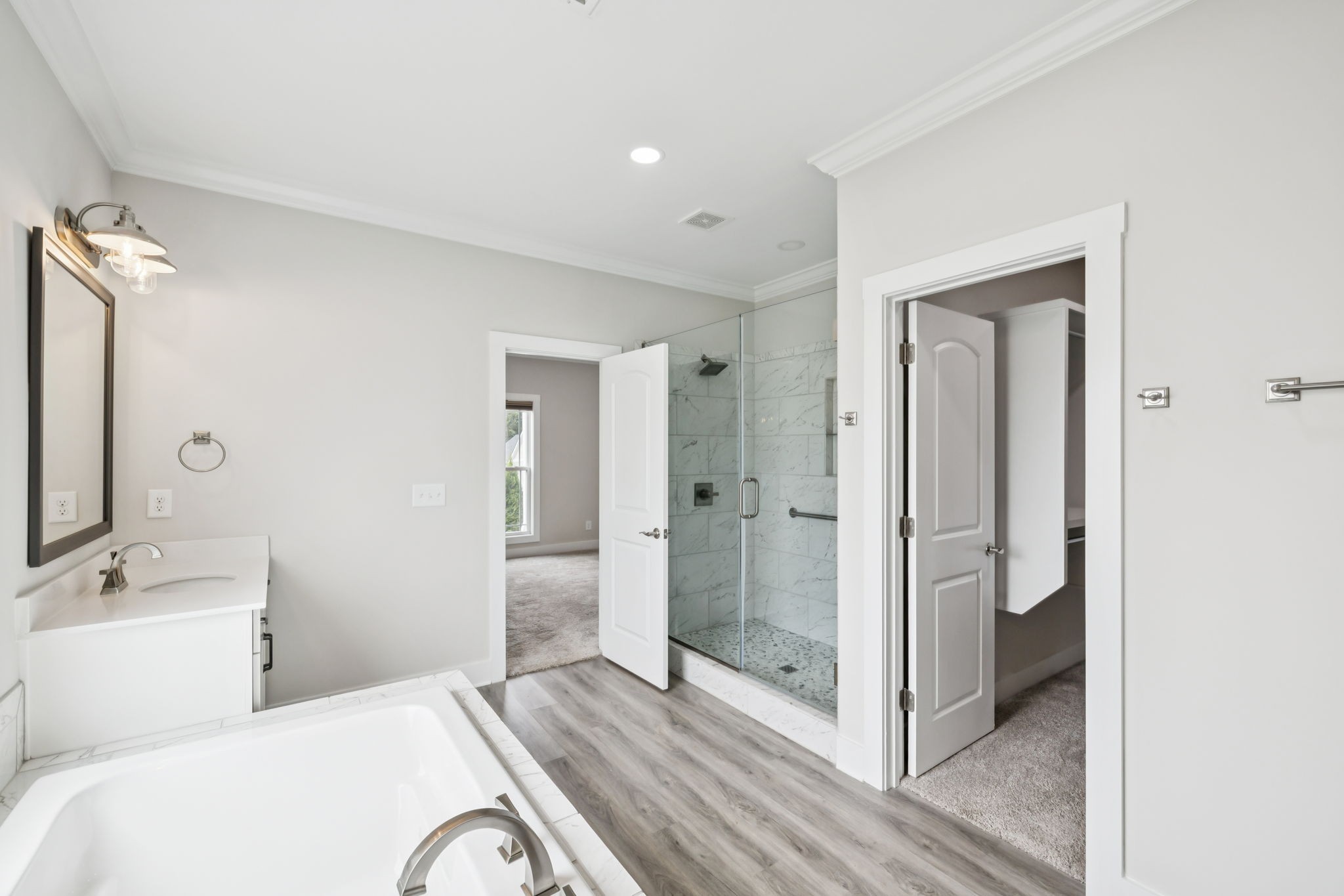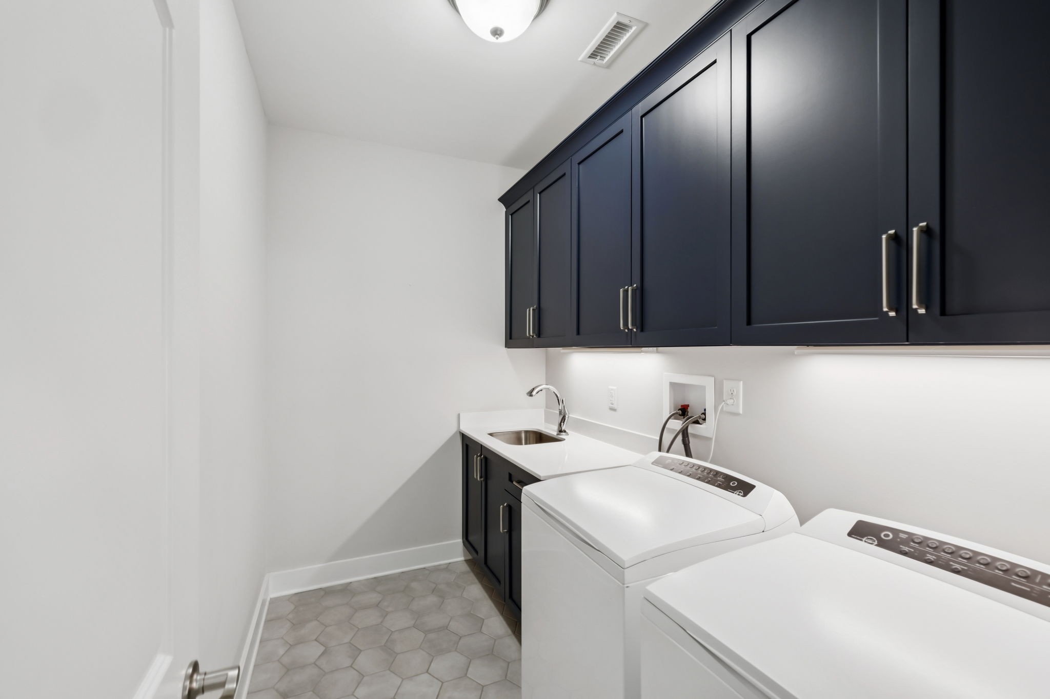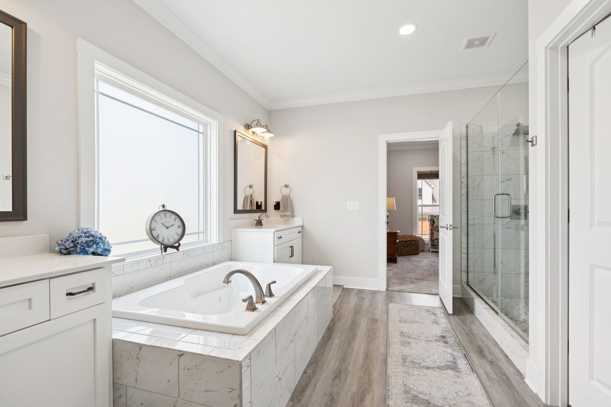 The kitchen flows beautifully into the living space with an island perfect for bar seating, high end counters and custom cabinetry. Closets and storage are everywhere, and the unfinished attic is just begging to become your dream theater room, playroom, or bonus suite. Add in the two car garage with a separate golf cart bay, and getting around the neighborhood is a breeze.