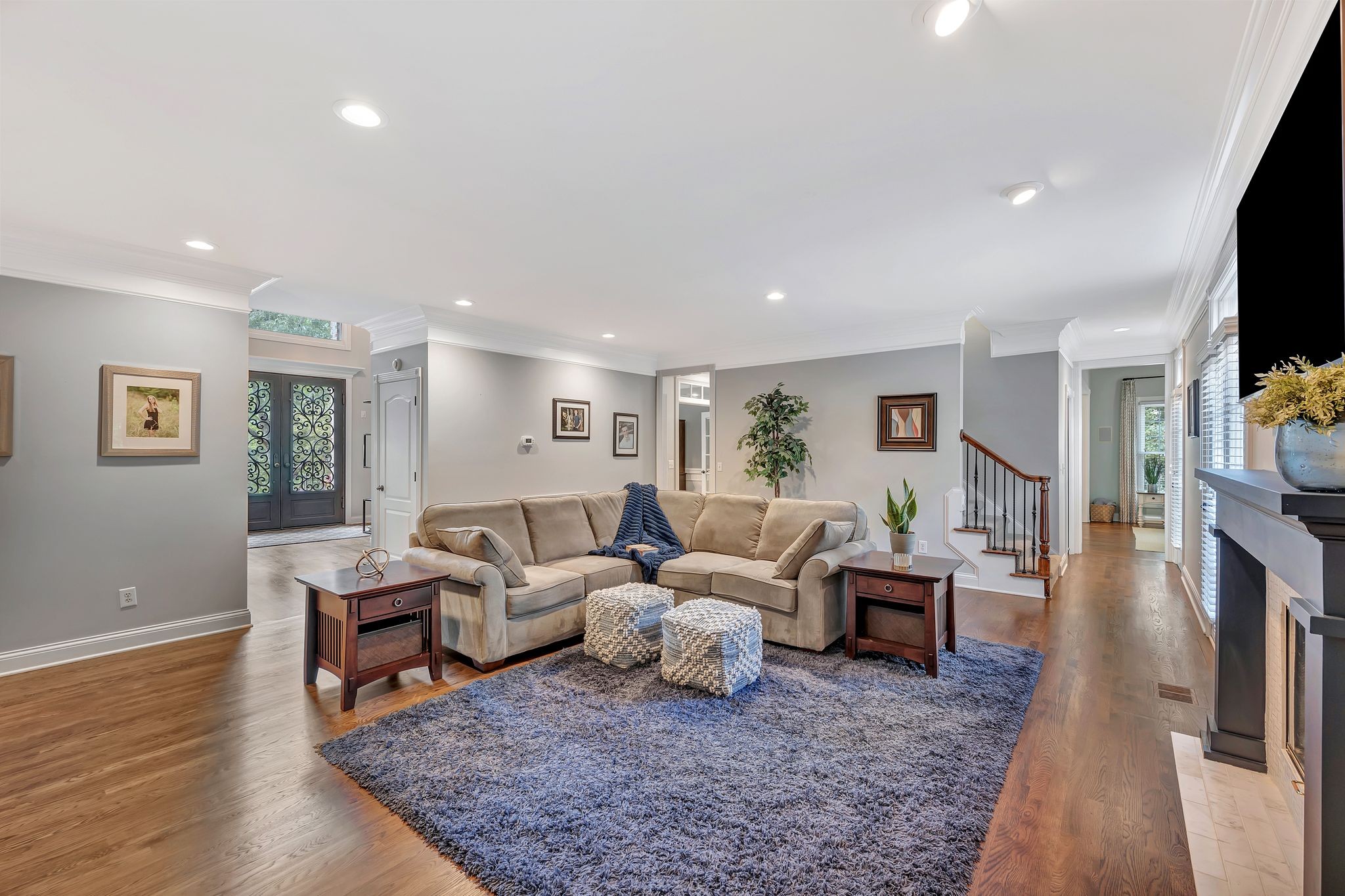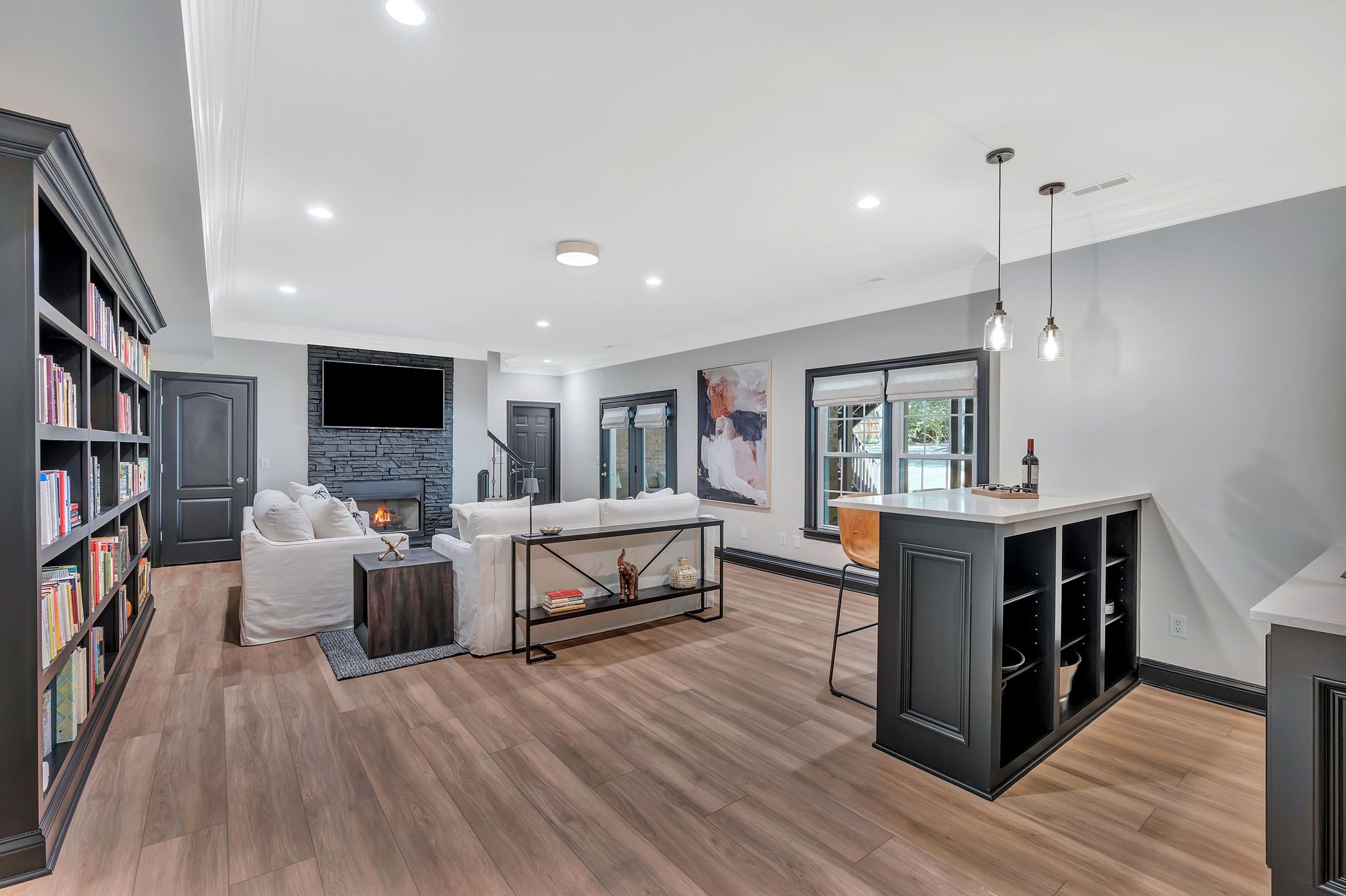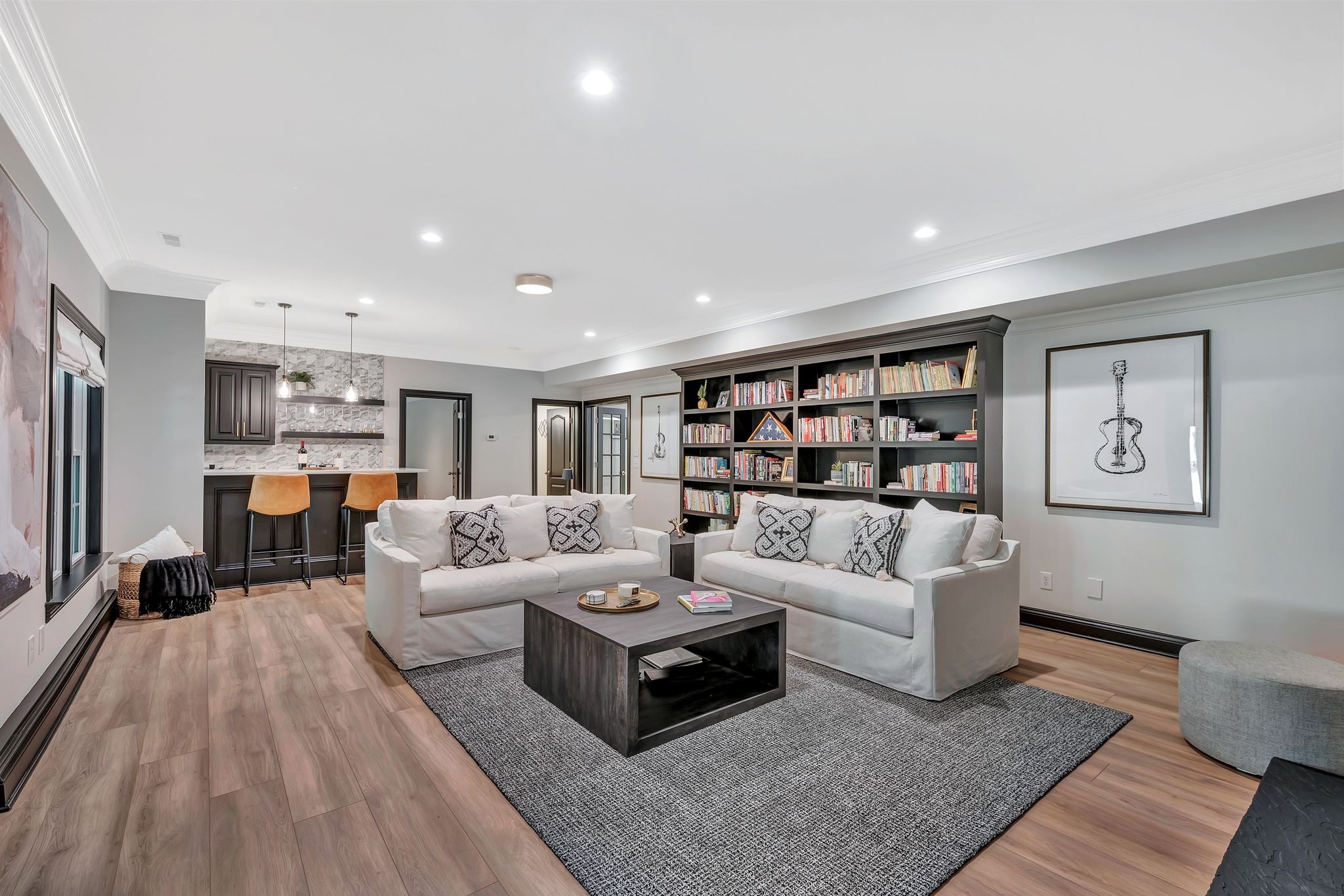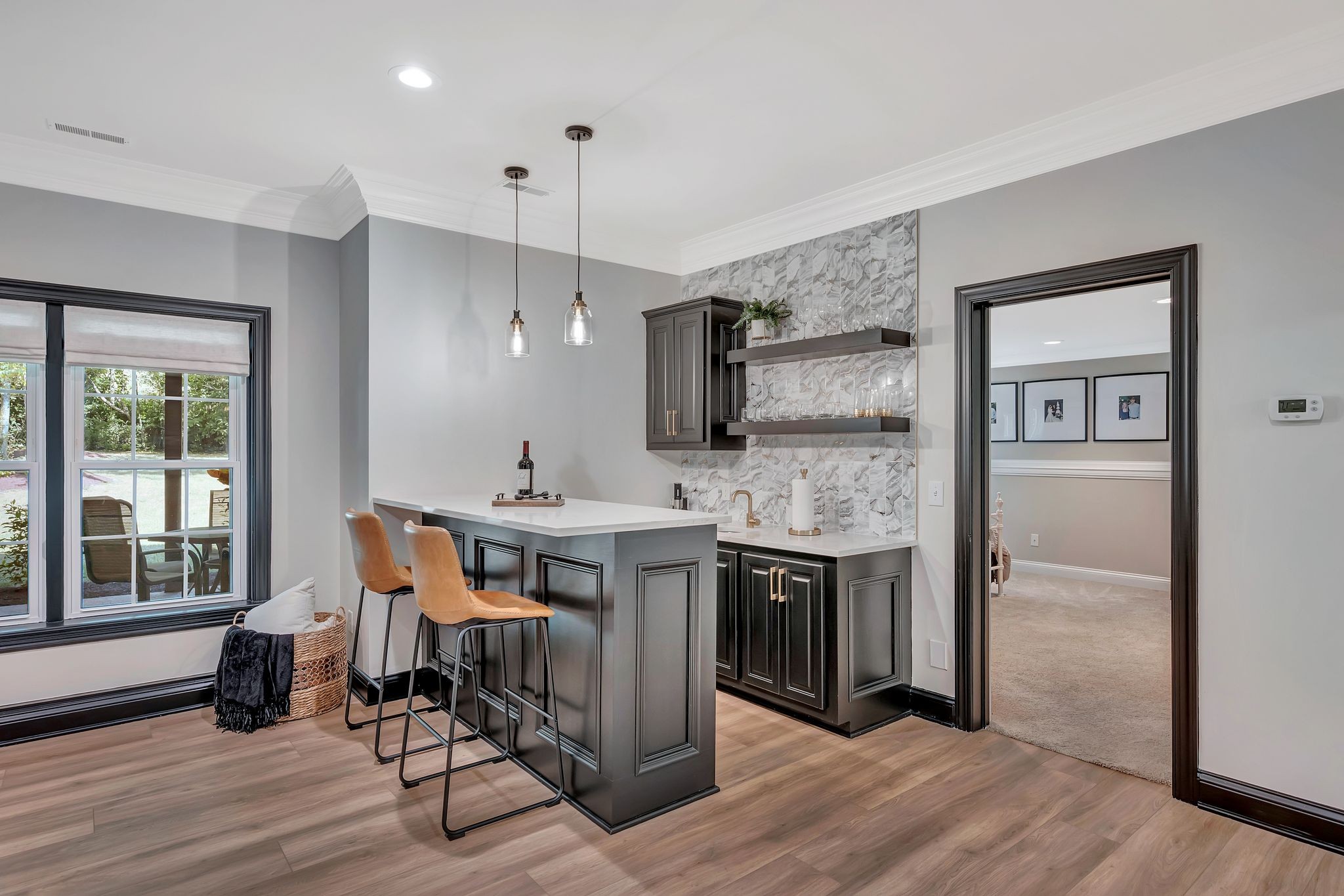 On the fully finished lower level, enjoy a stylish entertaining area with a custom wet bar, a full nanny/in-law suite, and a spacious workout/flex room. The 3.5-car garage includes epoxy floors and extra storage, perfect for all your needs.