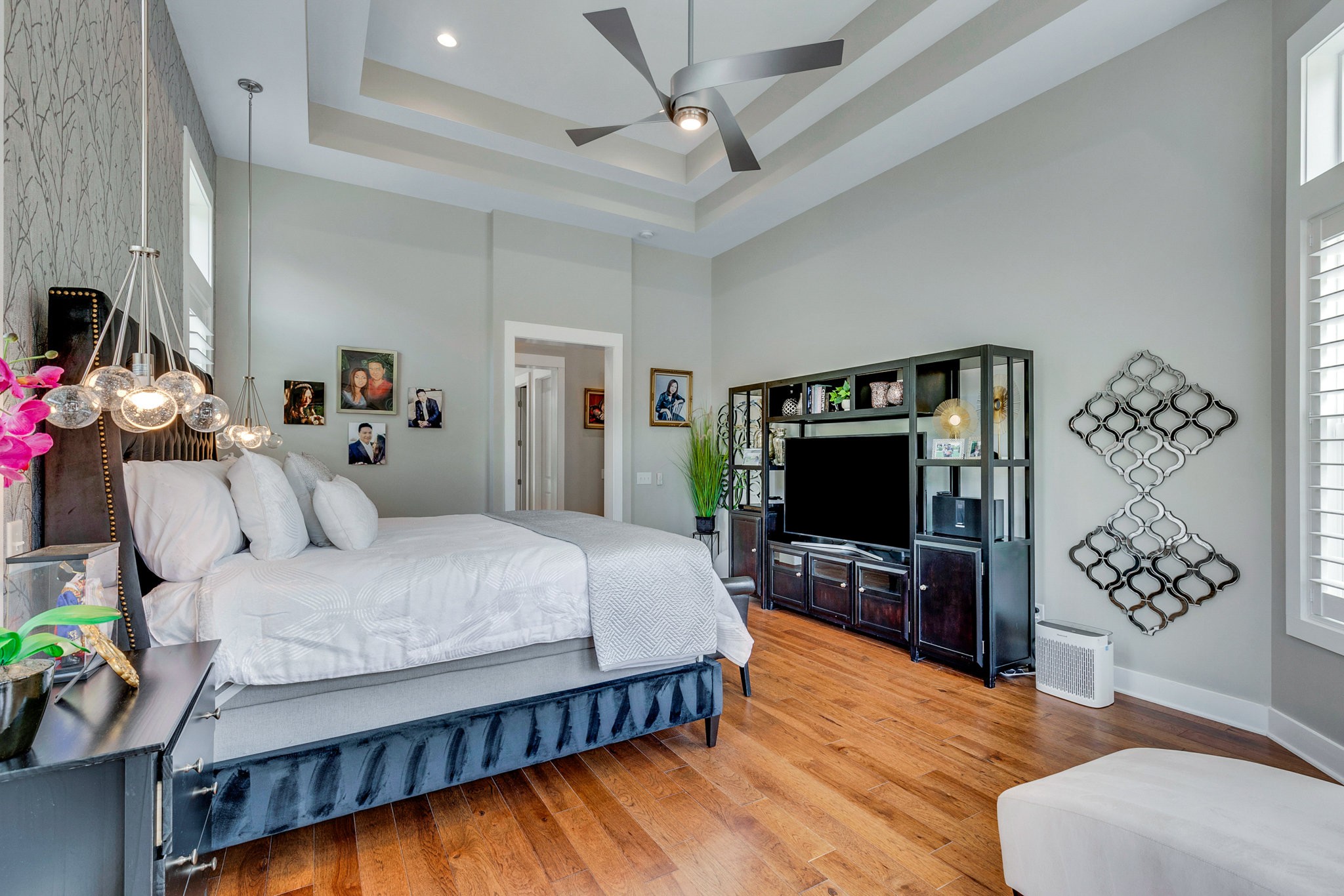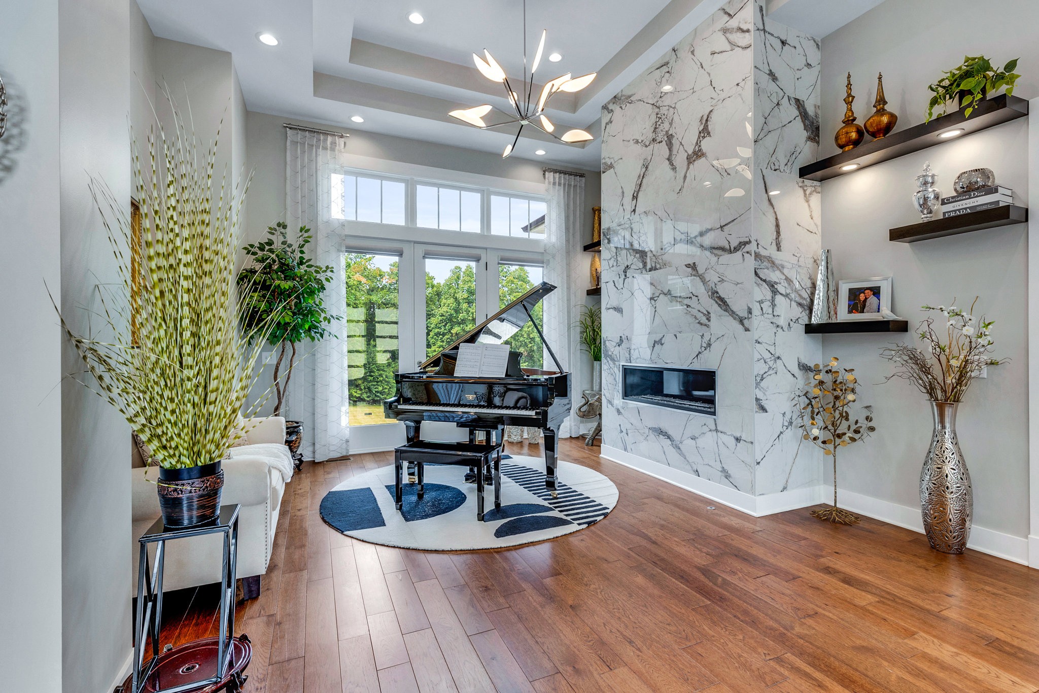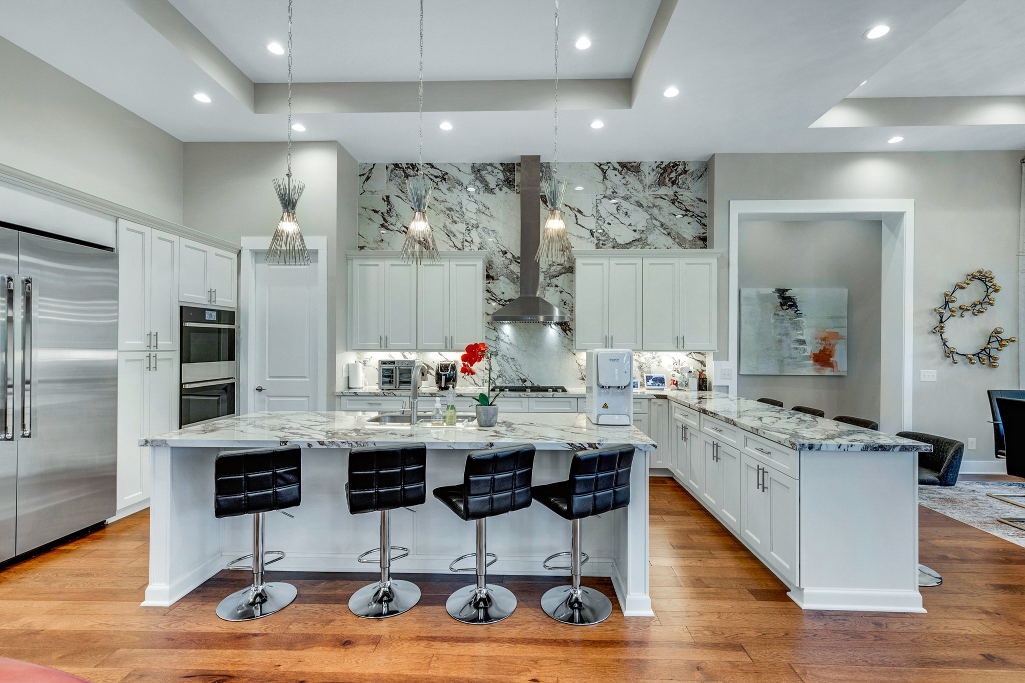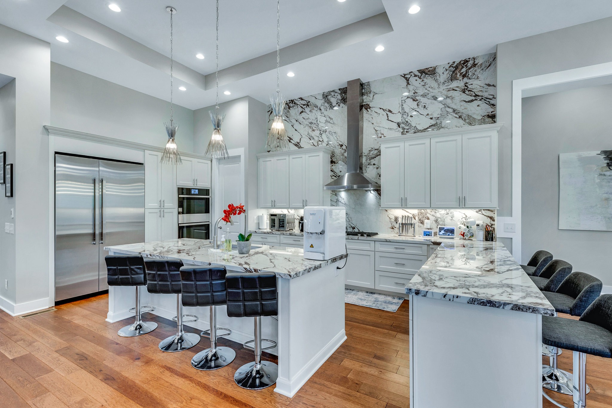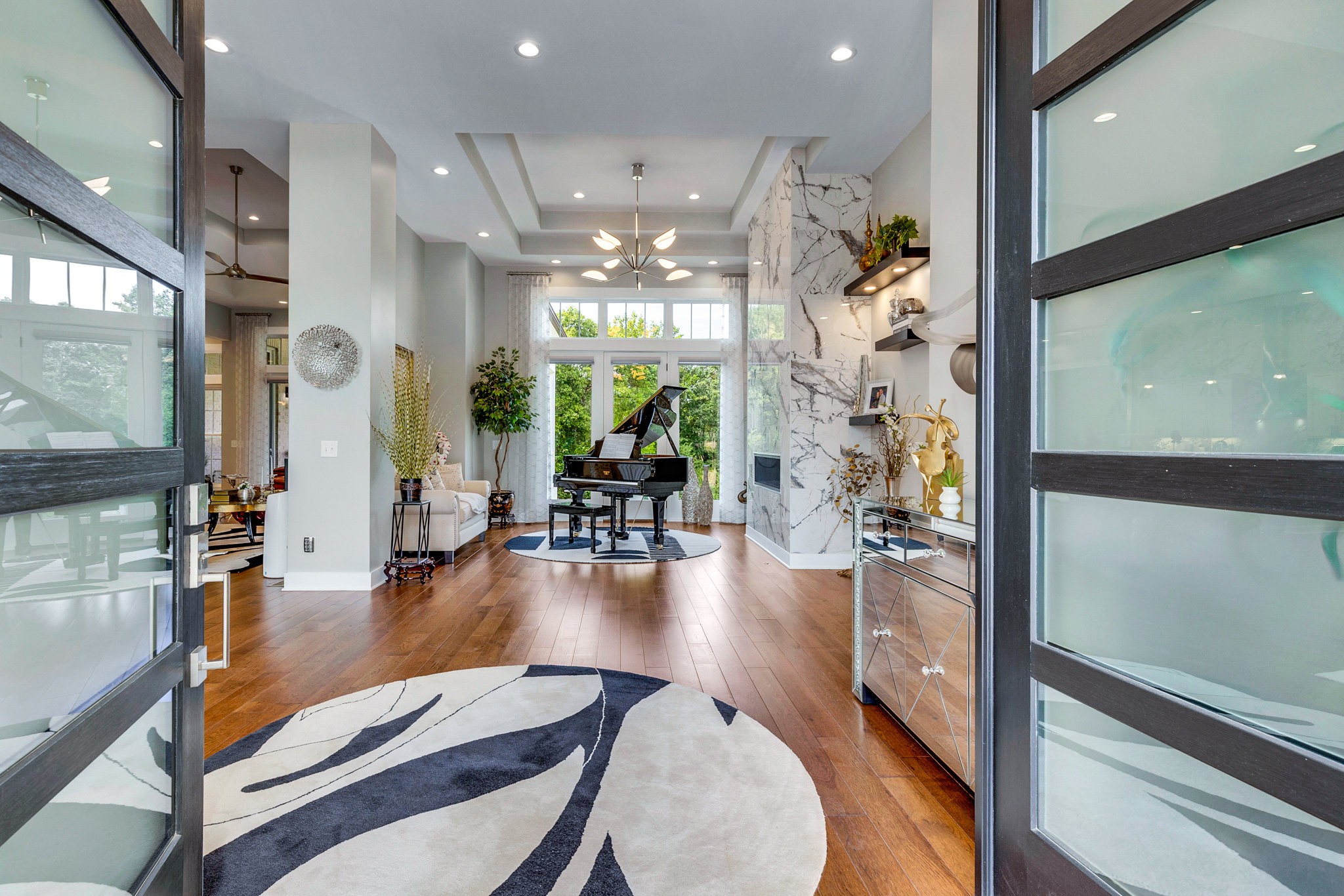 The gourmet kitchen is equipped with top-of-the-line Jenn-Air stainless steel appliances, an oversized island, a peninsula for additional seating and prep space, and a massive walk-in pantry with plenty of built-in shelving. Additional upgrades include a built-in under-counter drink fridge, hardwood floors throughout, upgraded chandeliers, a gas fireplace in the piano room, and a built-in dog shower in the laundry room.