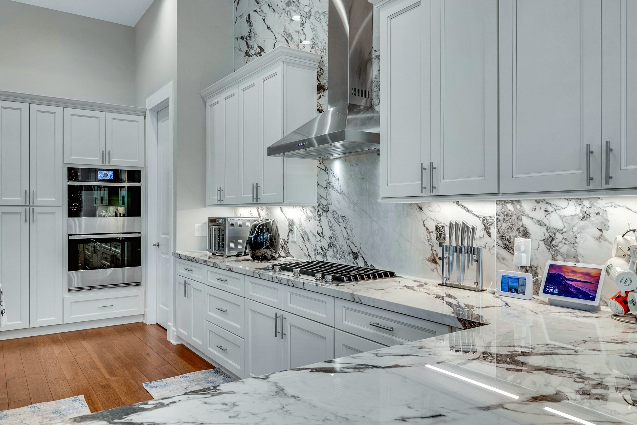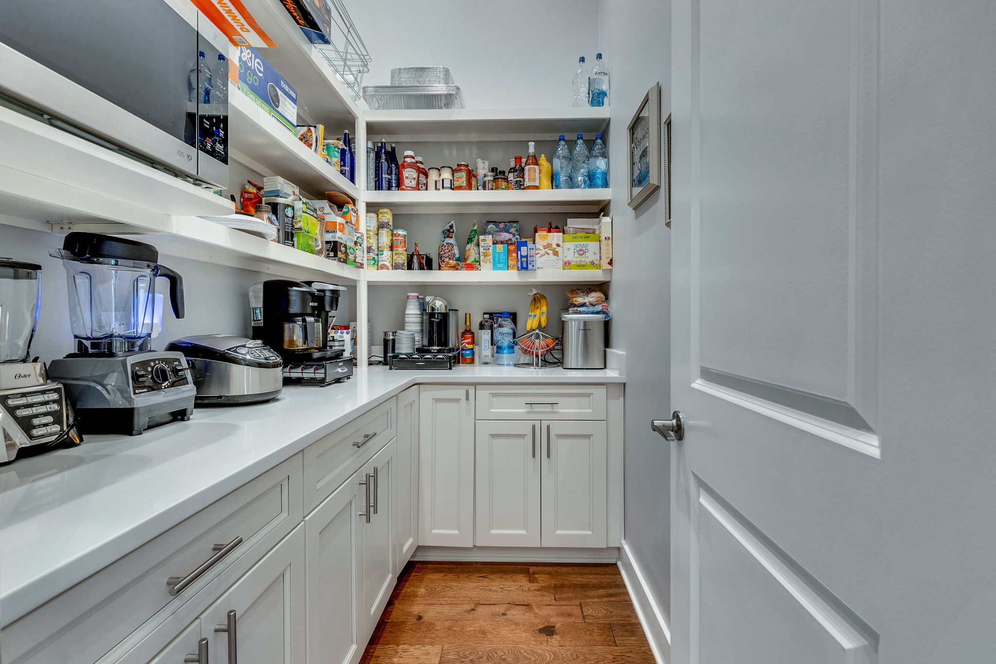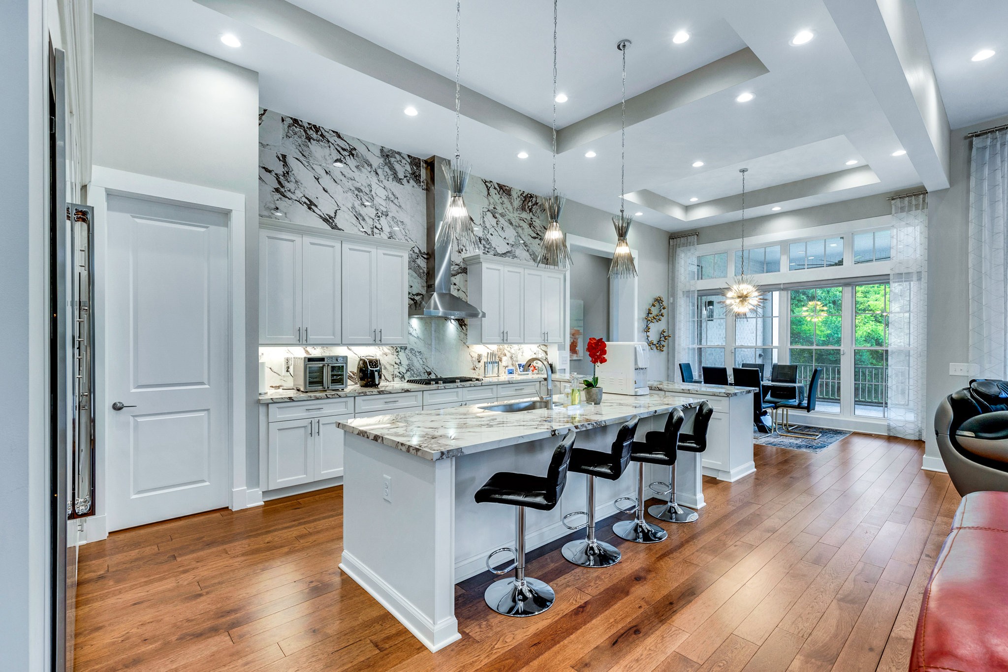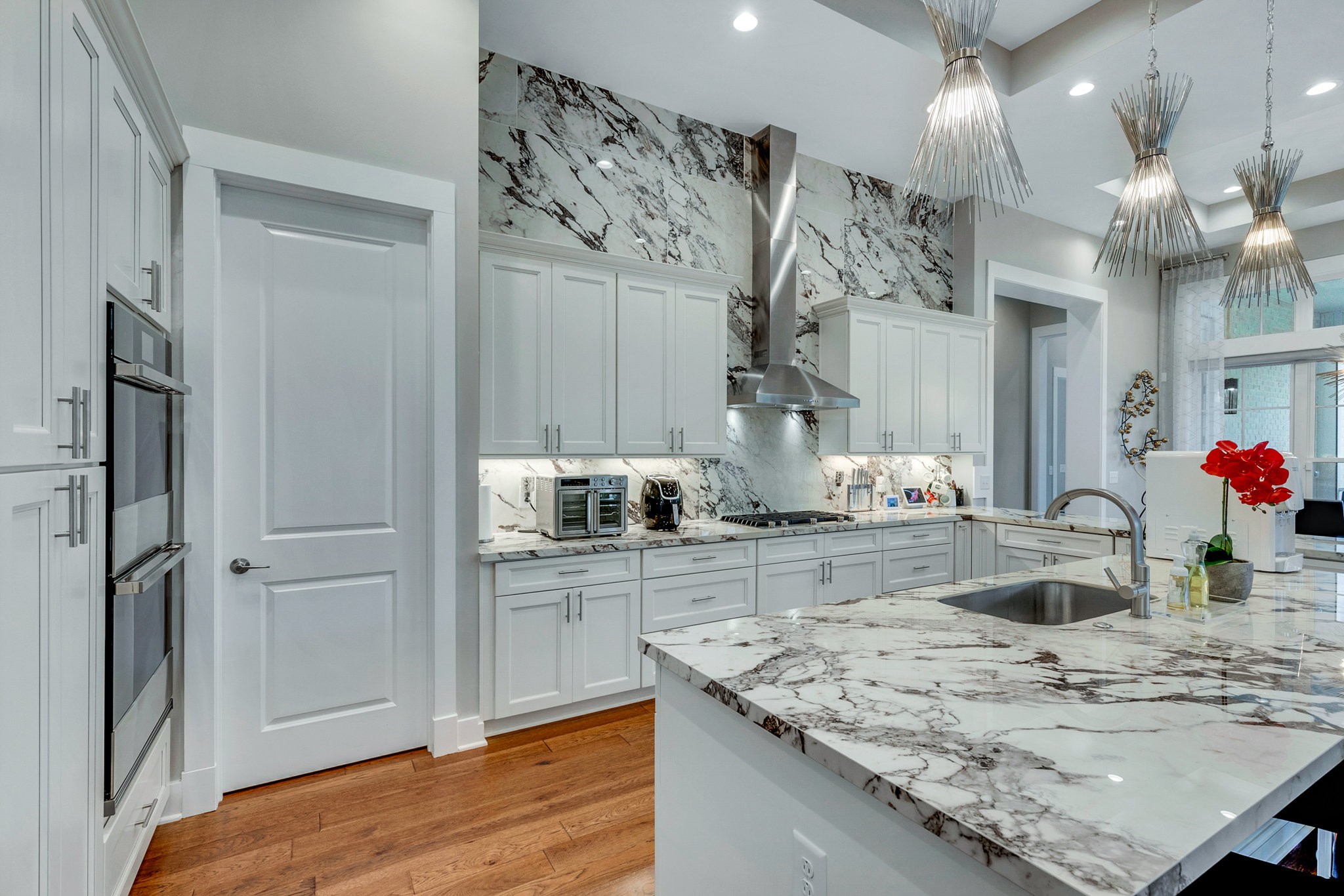 The gourmet kitchen is equipped with top-of-the-line Jenn-Air stainless steel appliances, an oversized island, a peninsula for additional seating and prep space, and a massive walk-in pantry with plenty of built-in shelving. Additional upgrades include a built-in under-counter drink fridge, hardwood floors throughout, upgraded chandeliers, a gas fireplace in the piano room, and a built-in dog shower in the laundry room.