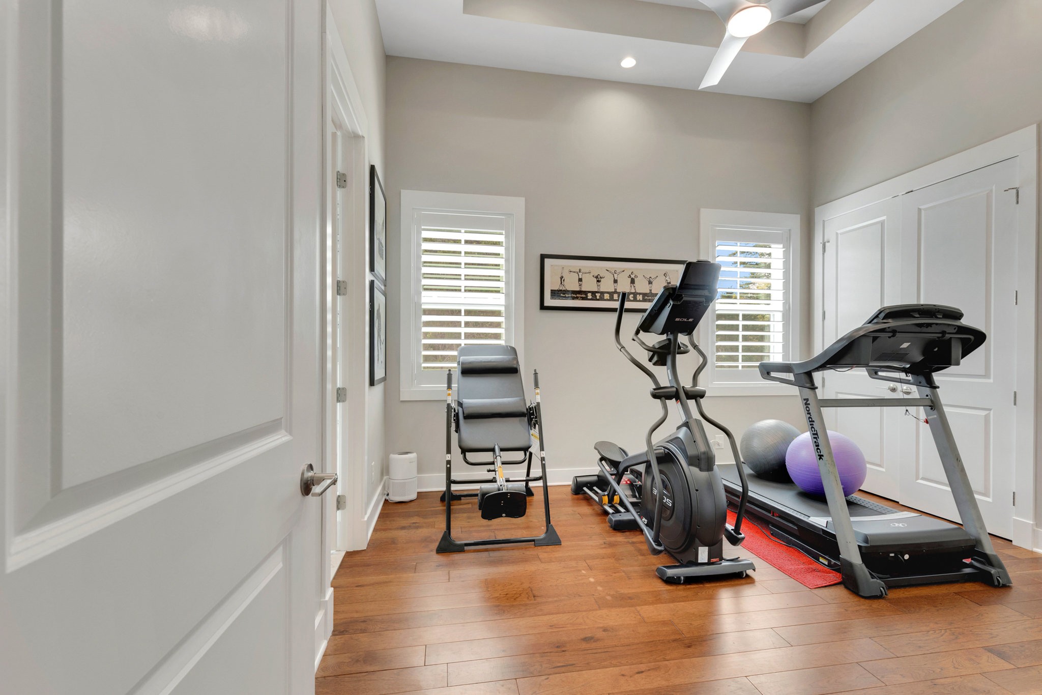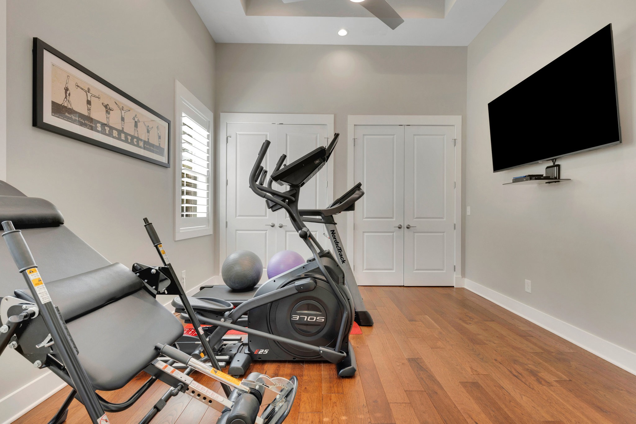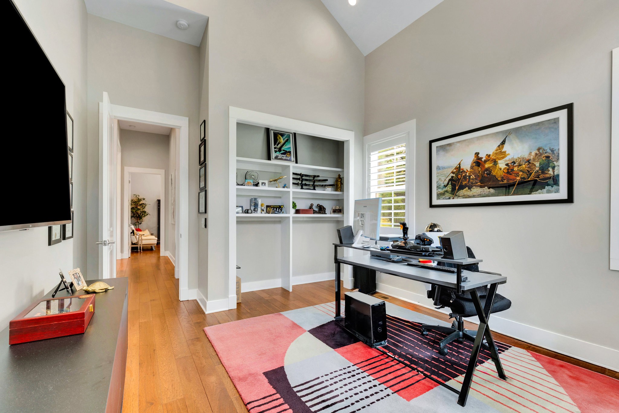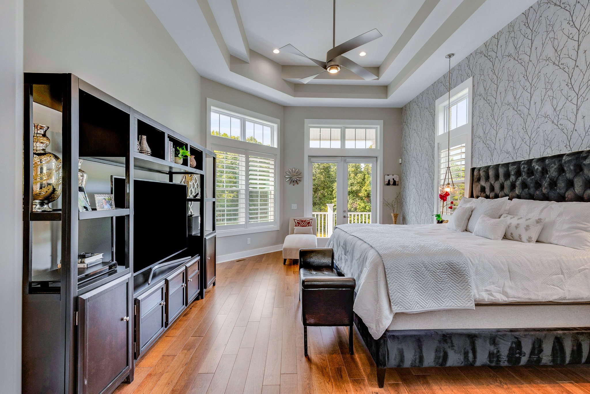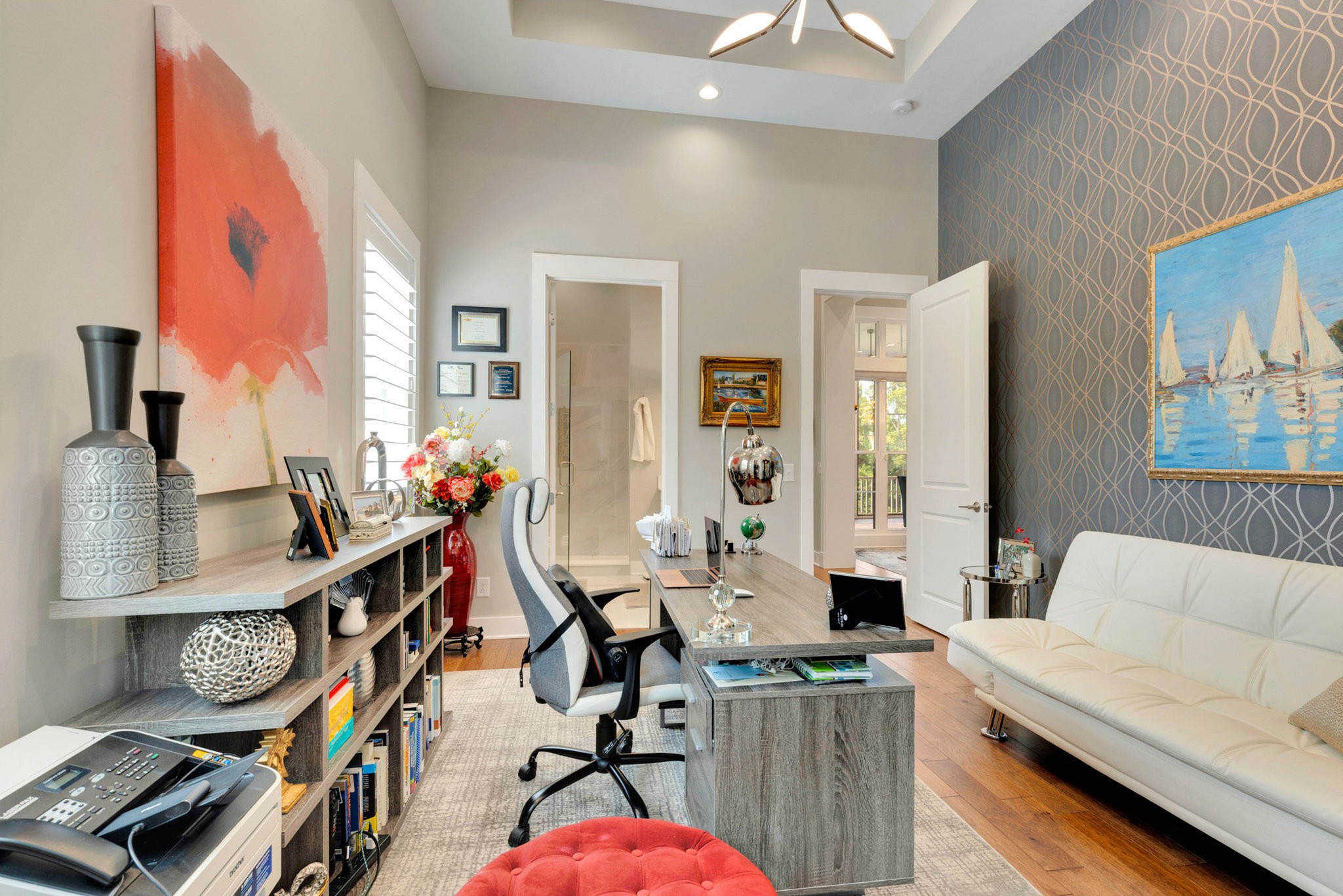 The gourmet kitchen is equipped with top-of-the-line Jenn-Air stainless steel appliances, an oversized island, a peninsula for additional seating and prep space, and a massive walk-in pantry with plenty of built-in shelving. Additional upgrades include a built-in under-counter drink fridge, hardwood floors throughout, upgraded chandeliers, a gas fireplace in the piano room, and a built-in dog shower in the laundry room.