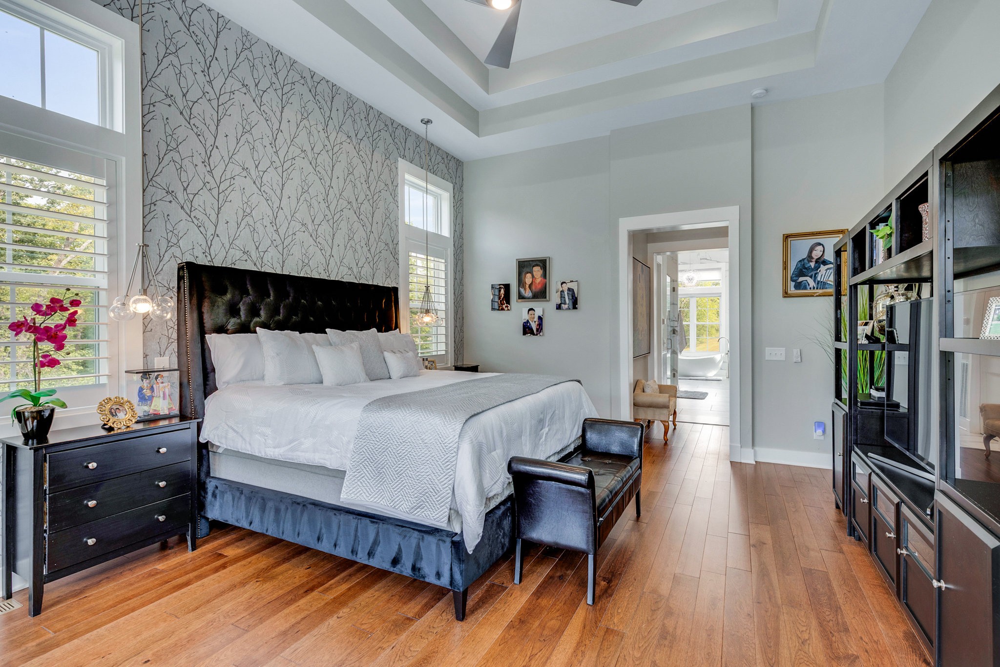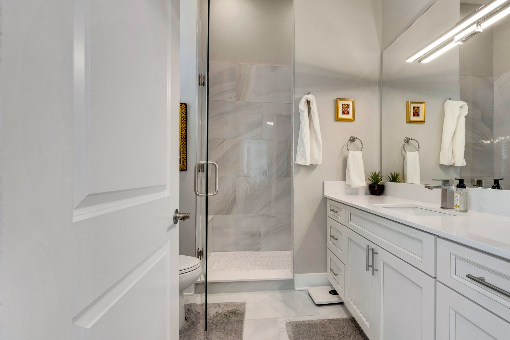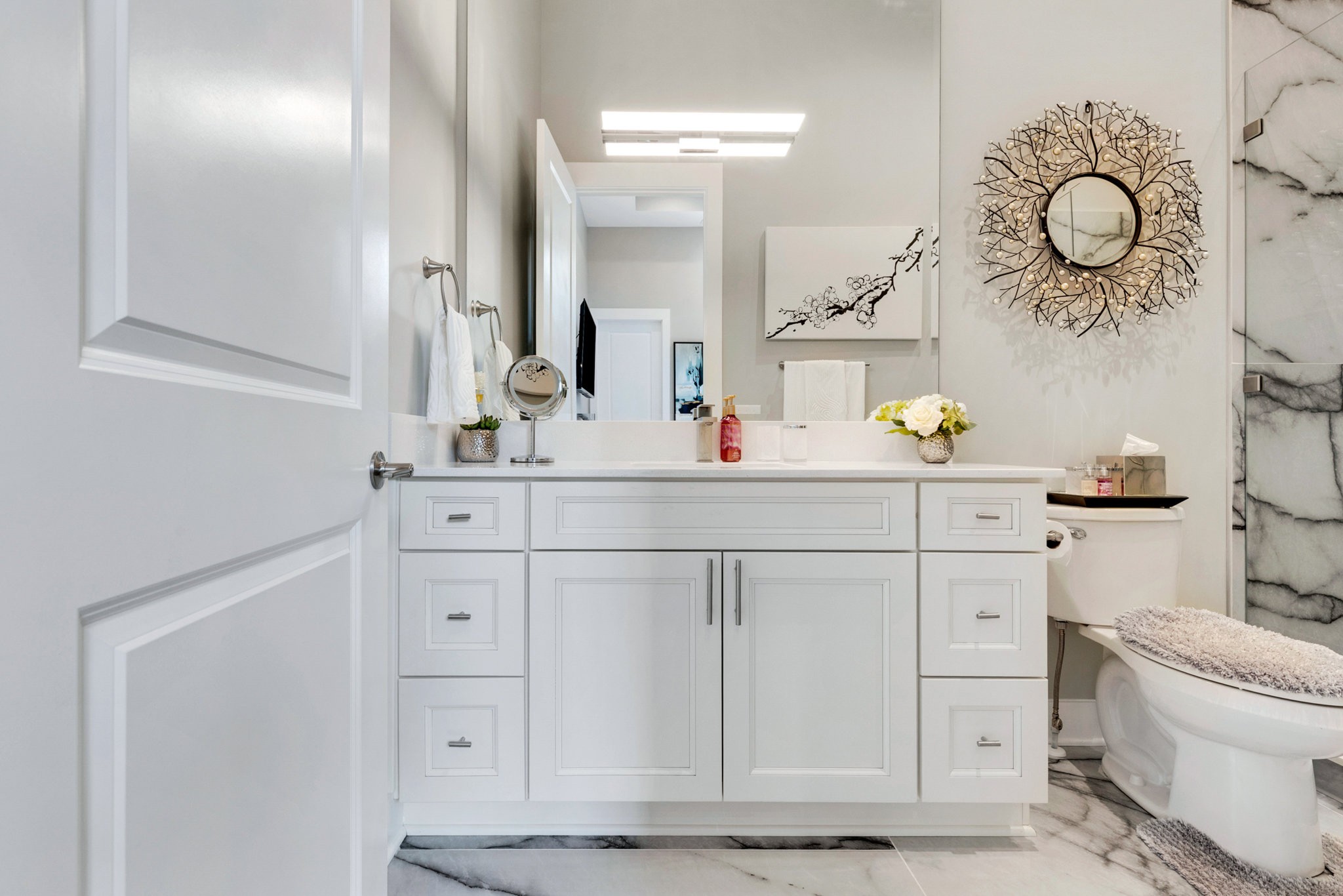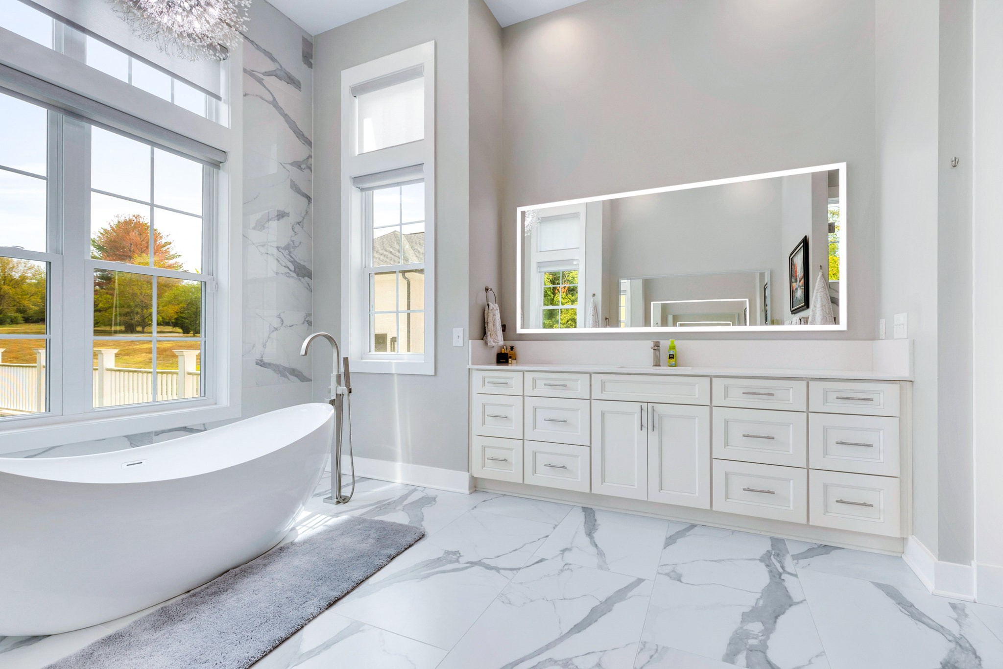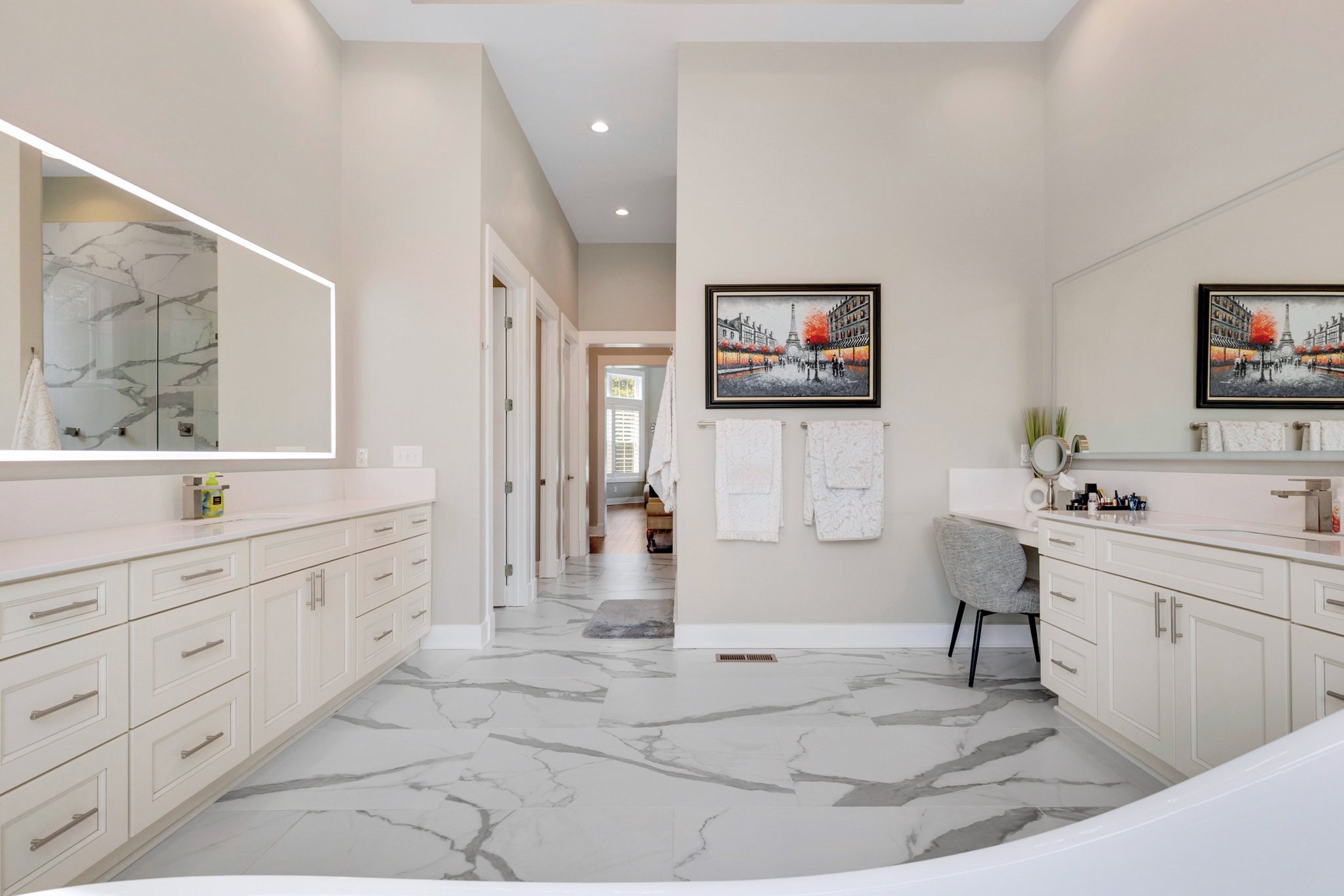 The spa-like primary suite is a retreat of its own with a freestanding soaking tub, dual water closets (his & hers), oversized framed LED mirrors, and a shower boasting 10 heads including a waterfall fixture.