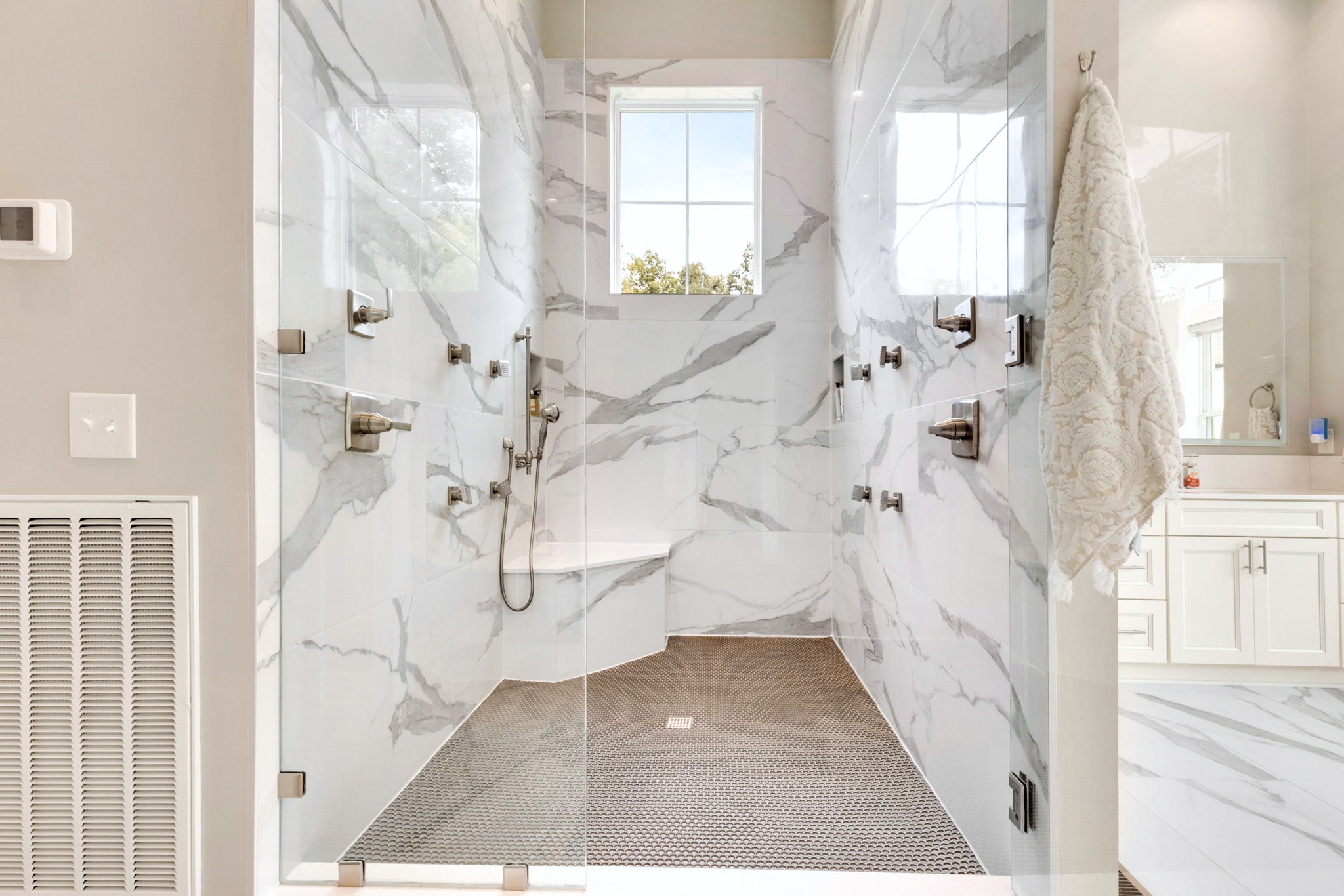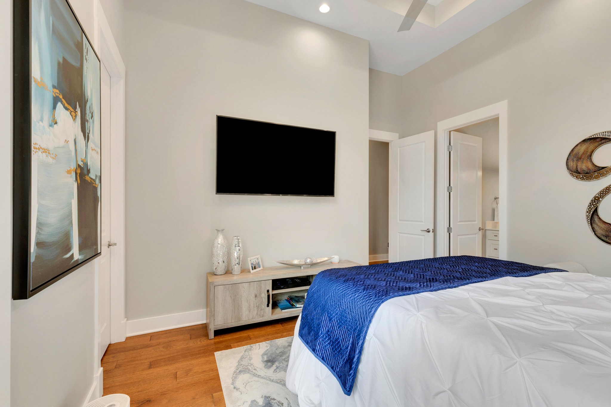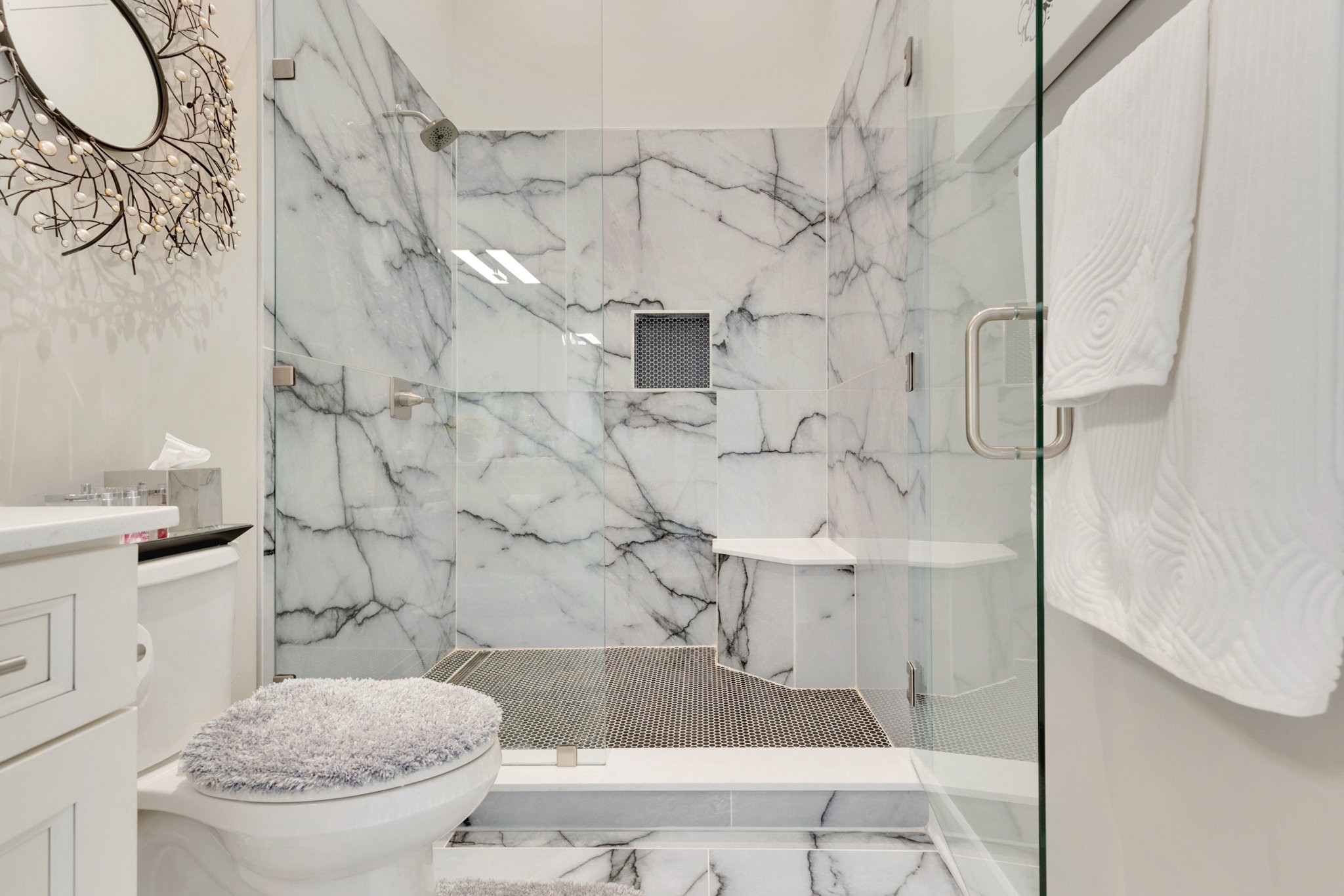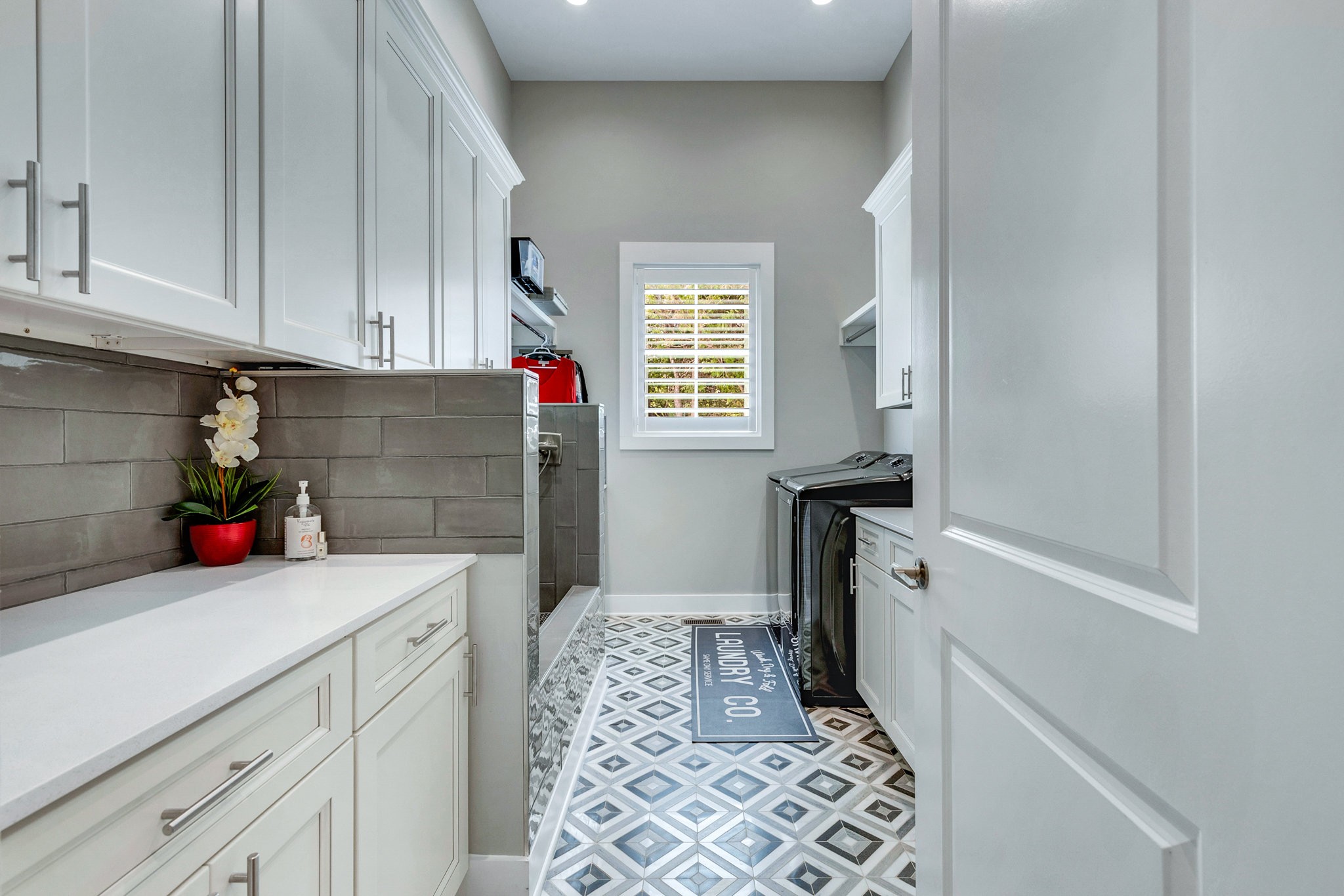The spa-like primary suite is a retreat of its own with a freestanding soaking tub, dual water closets (his & hers), oversized framed LED mirrors, and a shower boasting 10 heads including a waterfall fixture.